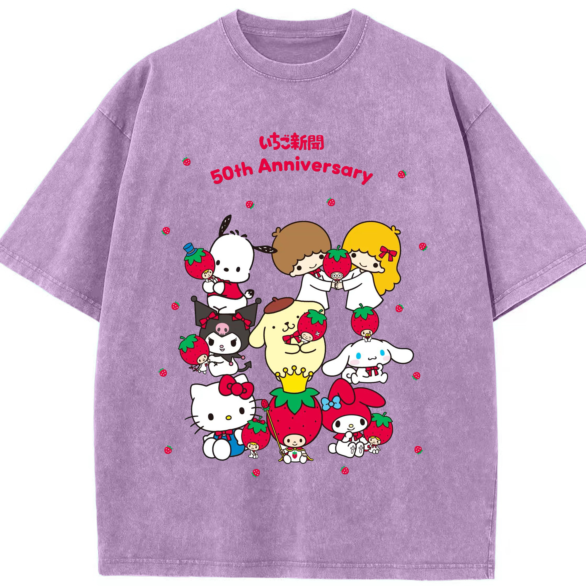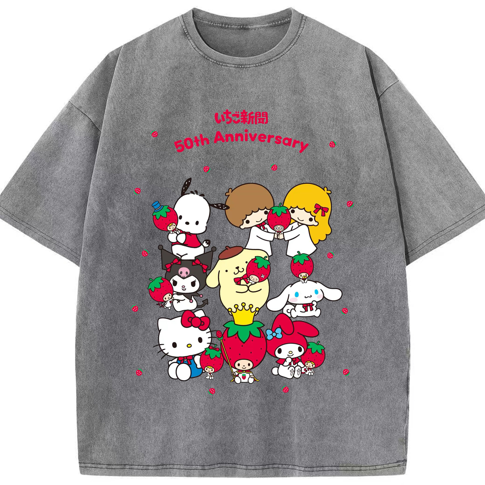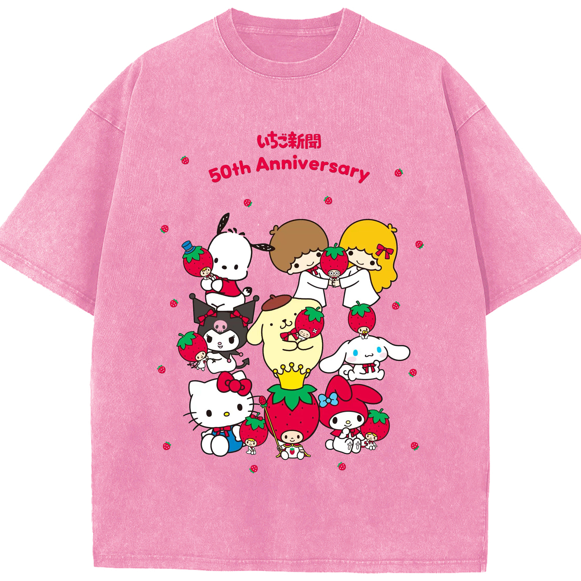 いちごサンリオ - 綿100% ヴィンテージ風 半袖Tシャツ ・ 背面プリント ・ 柔らか肌触り ・ 通気性 快適 ・ スポーツ カジュアル 外出用