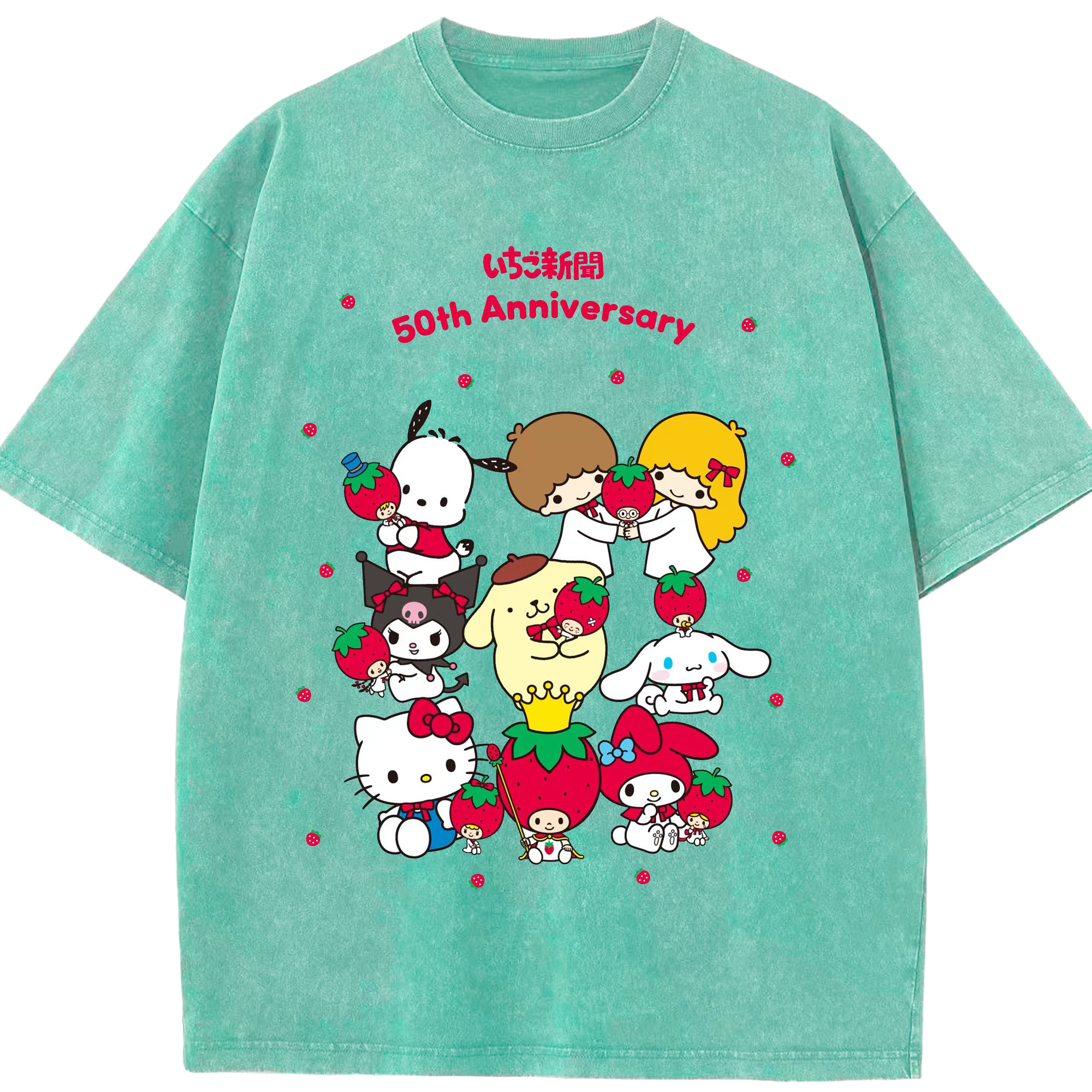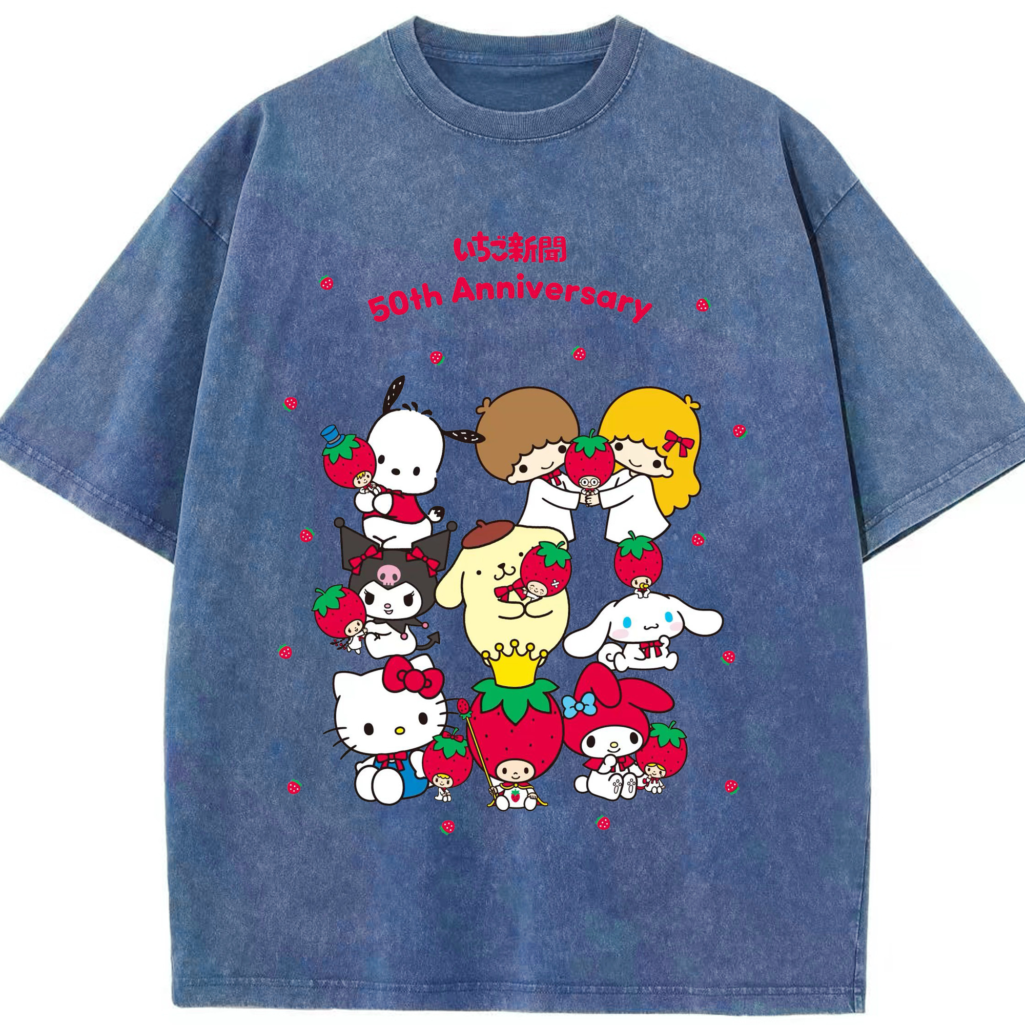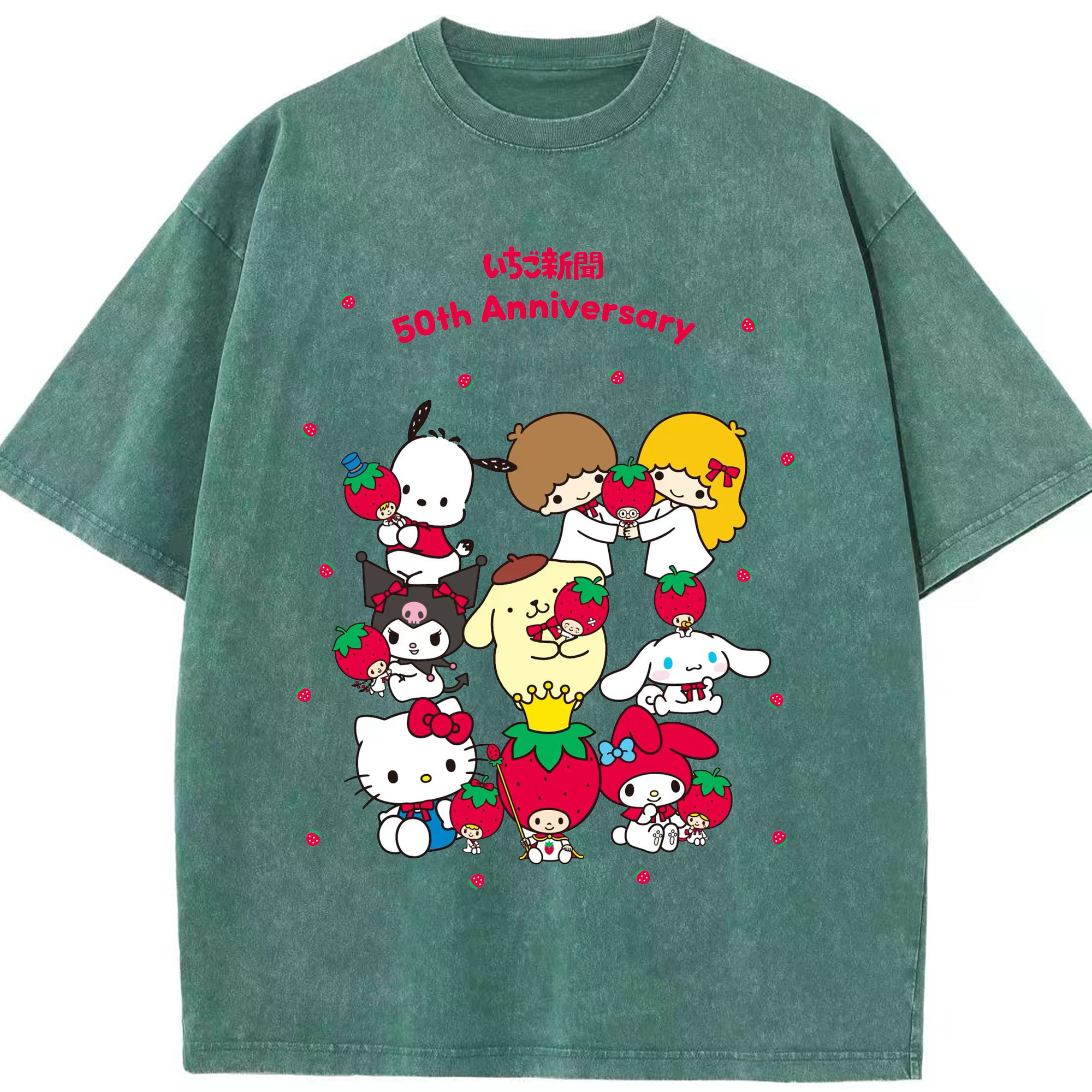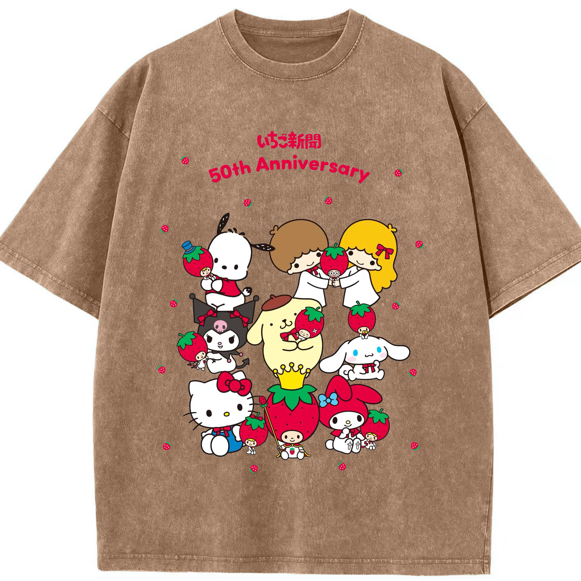 いちごサンリオ - 綿100% ヴィンテージ風 半袖Tシャツ ・ 背面プリント ・ 柔らか肌触り ・ 通気性 快適 ・ スポーツ カジュアル 外出用
