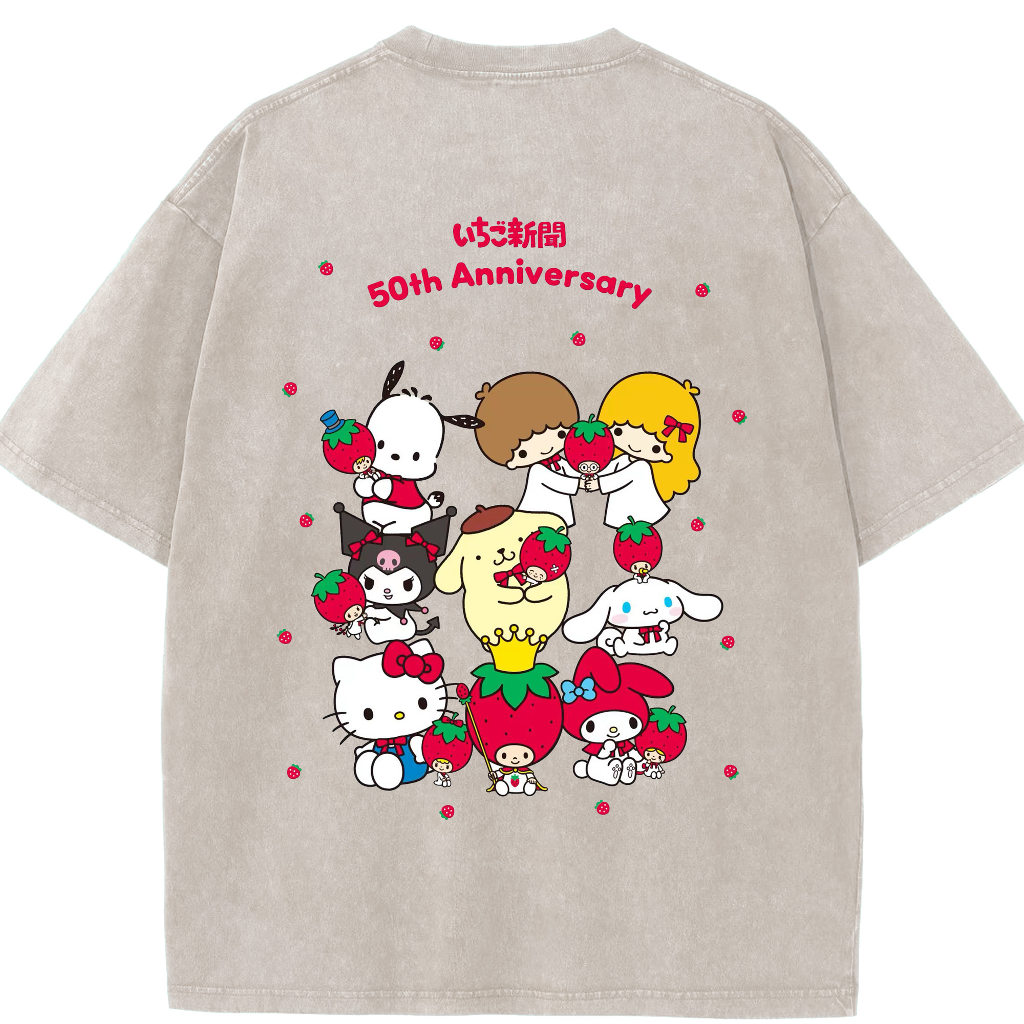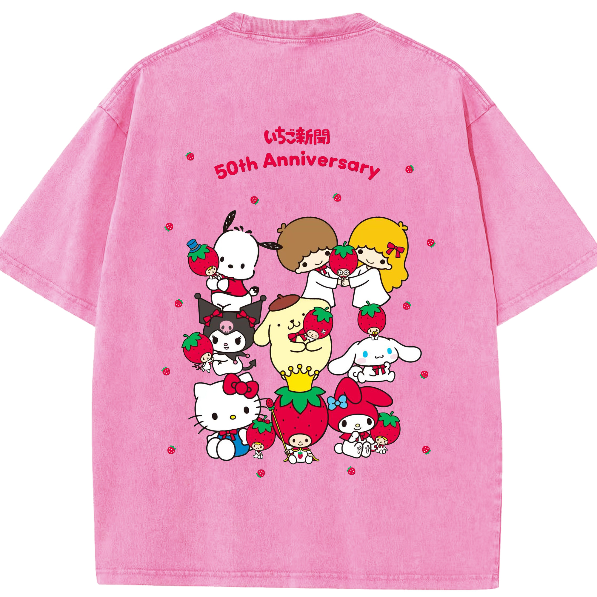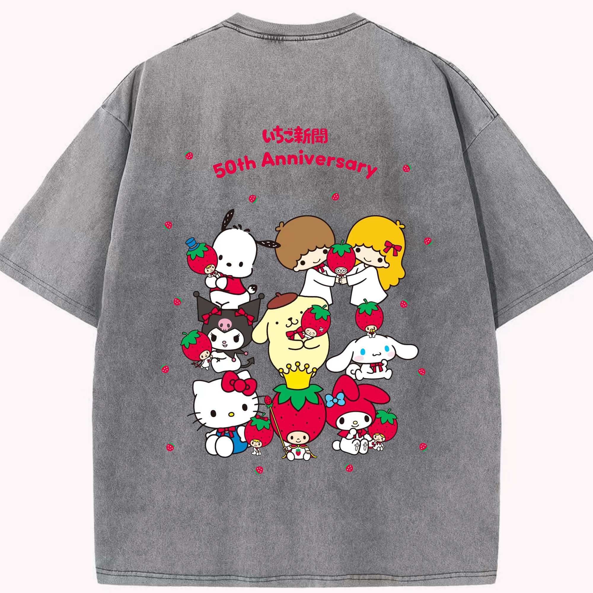いちごサンリオ - 綿100% ヴィンテージ風 半袖Tシャツ ・ フロントプリント ・ 柔らか肌触り ・ 通気性 快適 ・ スポーツ カジュアル 外出用