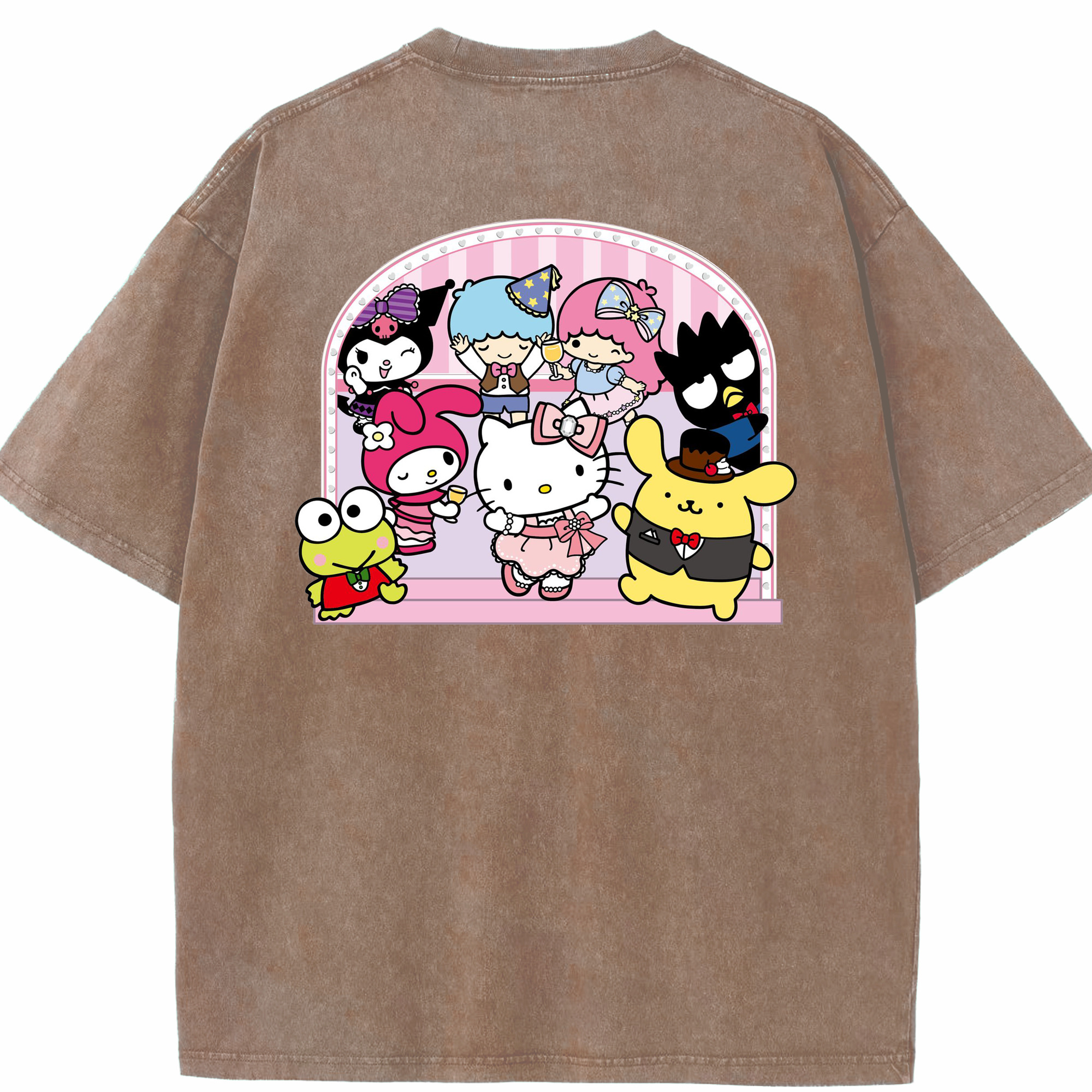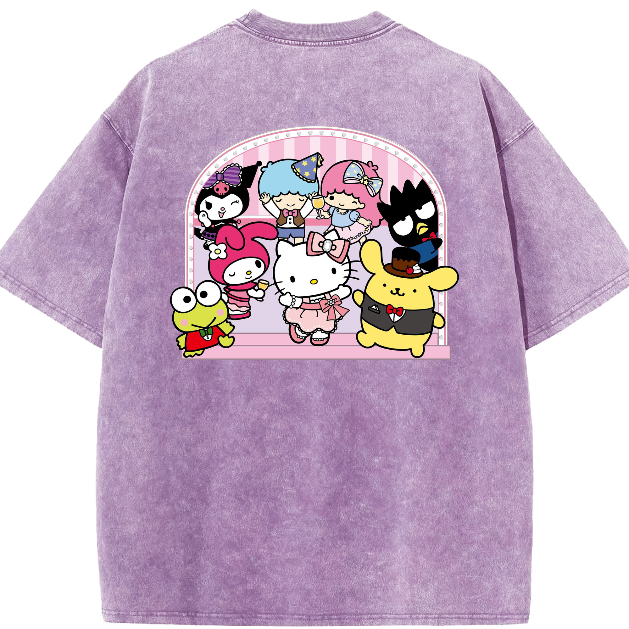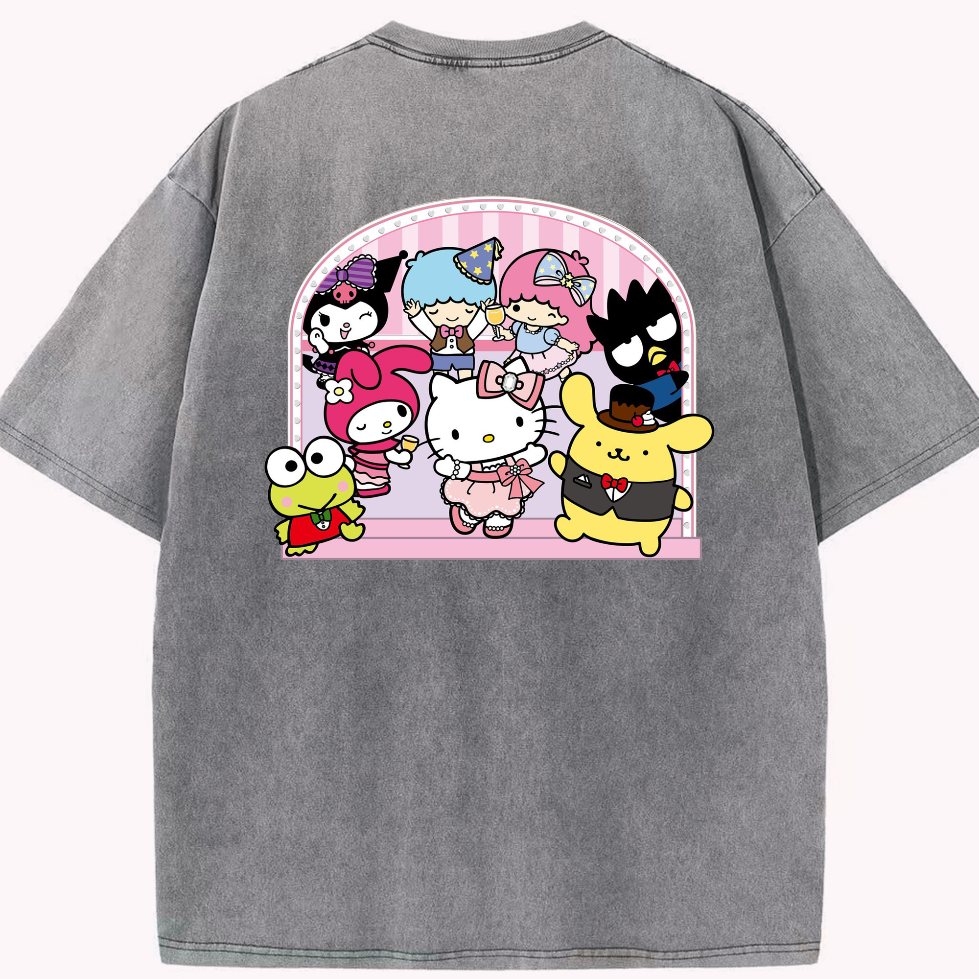 スタイリッシュでクール!サンリオファミリー - 綿100% ヴィンテージ風 半袖Tシャツ ・ 背面プリント ・ 柔らか肌触り ・ 通気性 快適 ・ スポーツ カジュアル 外出用
