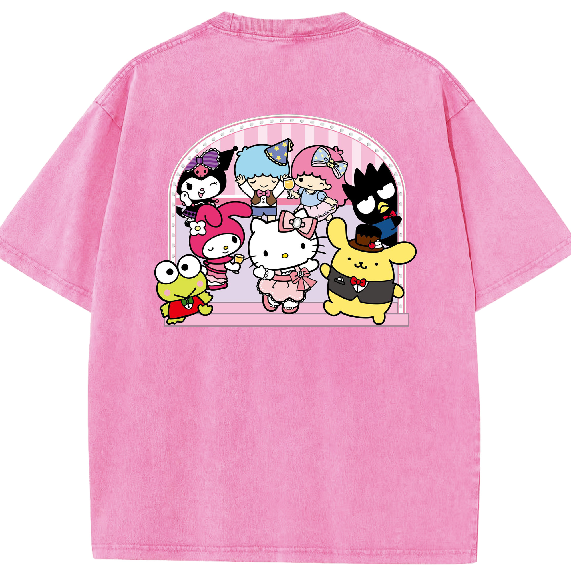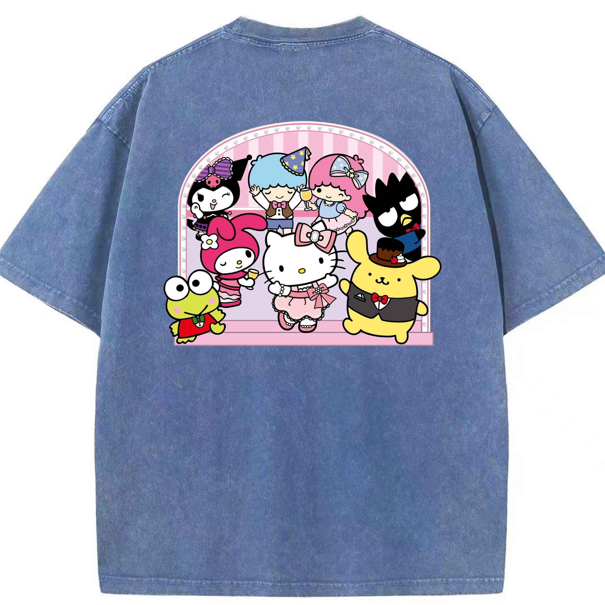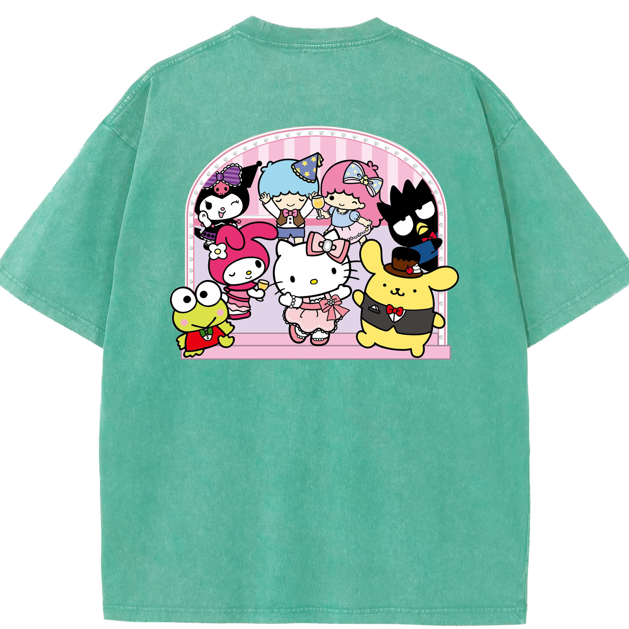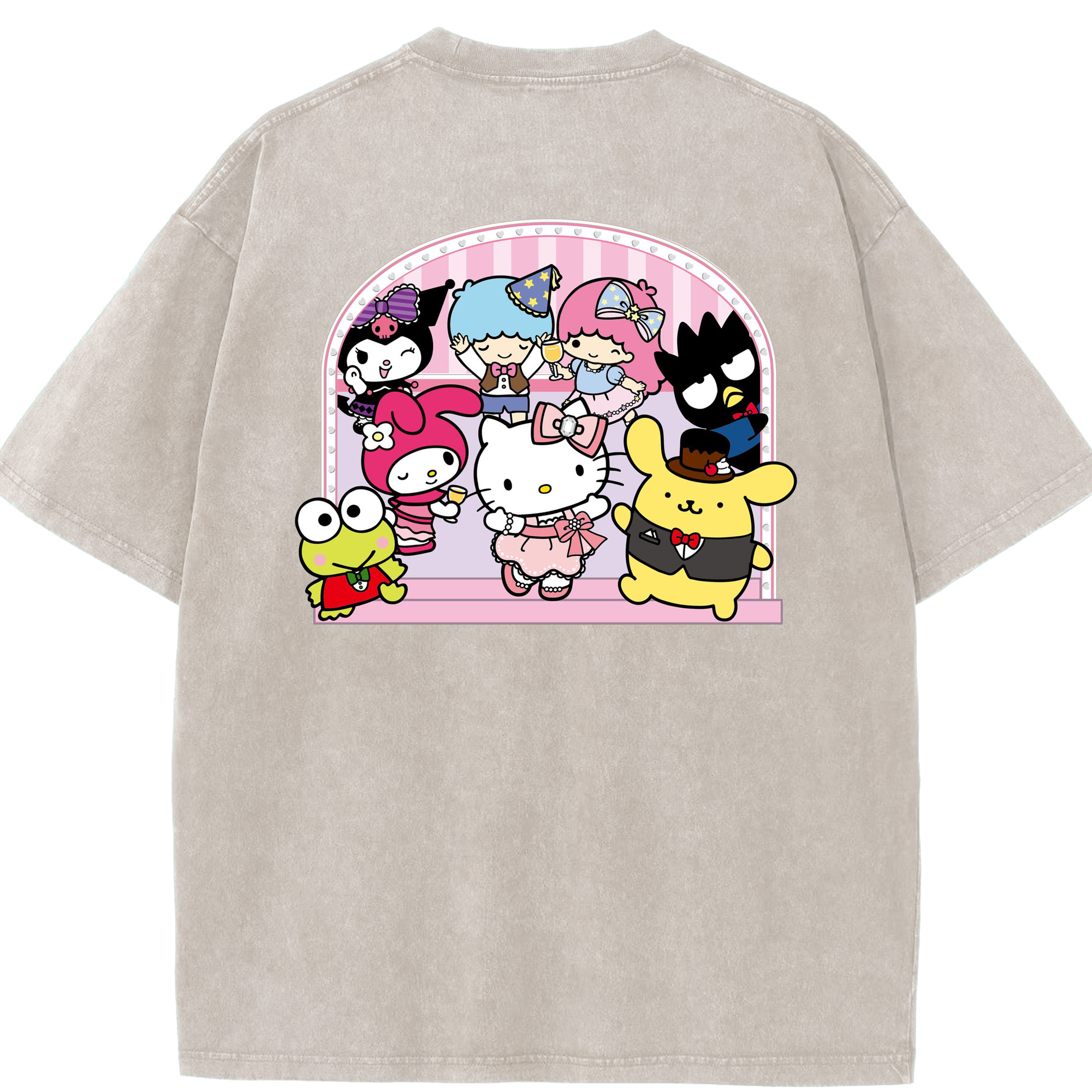 スタイリッシュでクール!サンリオファミリー - 綿100% ヴィンテージ風 半袖Tシャツ ・ 背面プリント ・ 柔らか肌触り ・ 通気性 快適 ・ スポーツ カジュアル 外出用