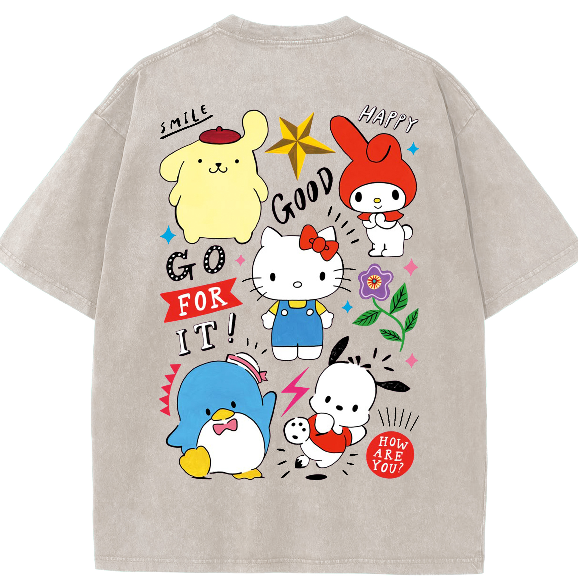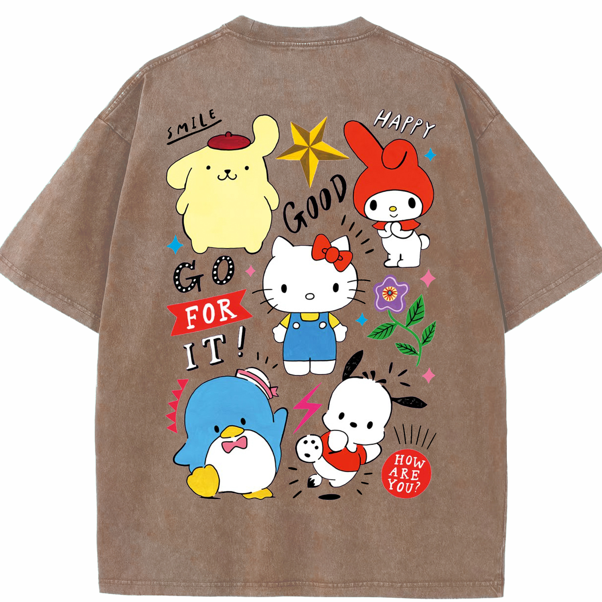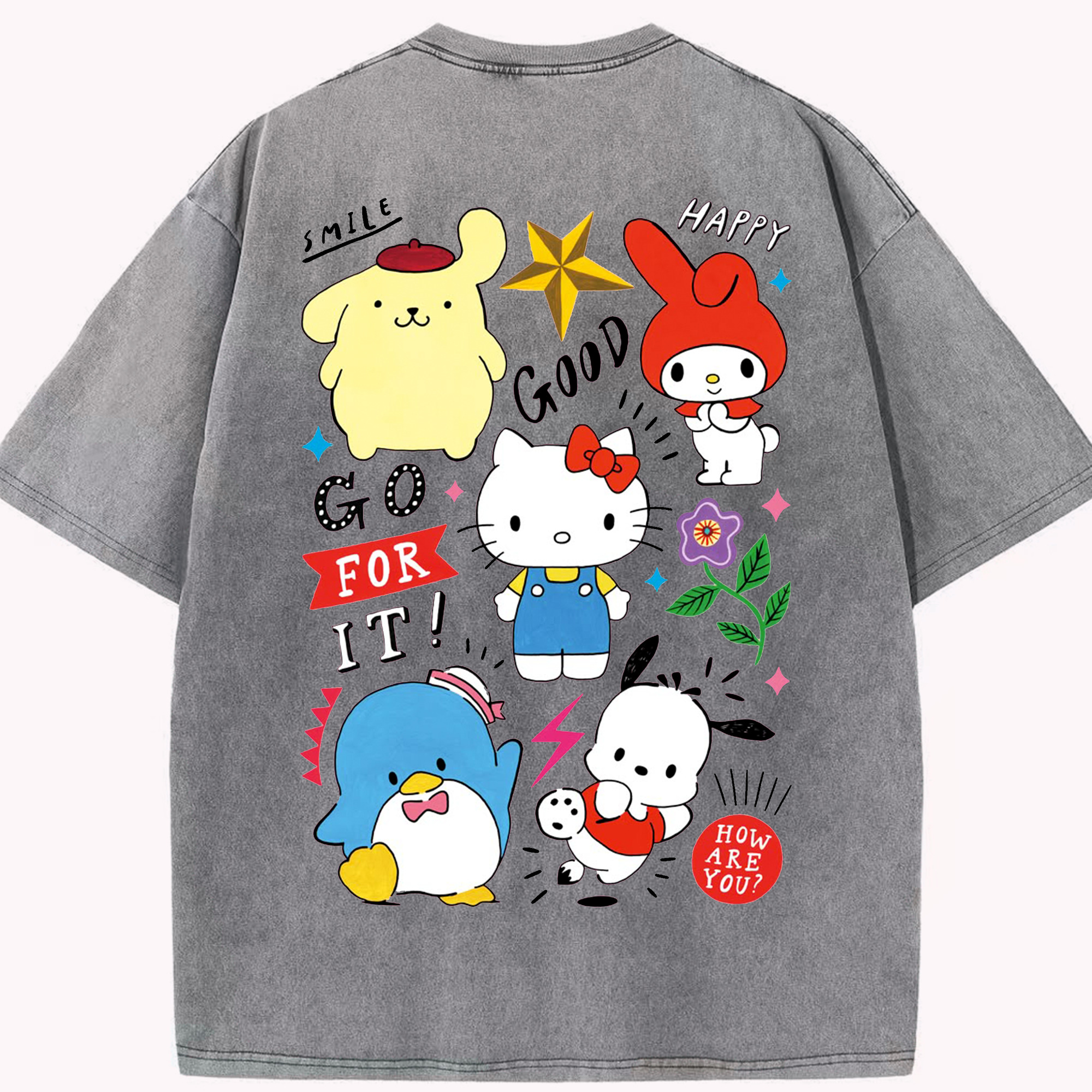 おもしろサンリオ - 綿100% ヴィンテージ風 半袖Tシャツ ・ フロントプリント ・ 柔らか肌触り ・ 通気性 快適 ・ スポーツ カジュアル 外出用