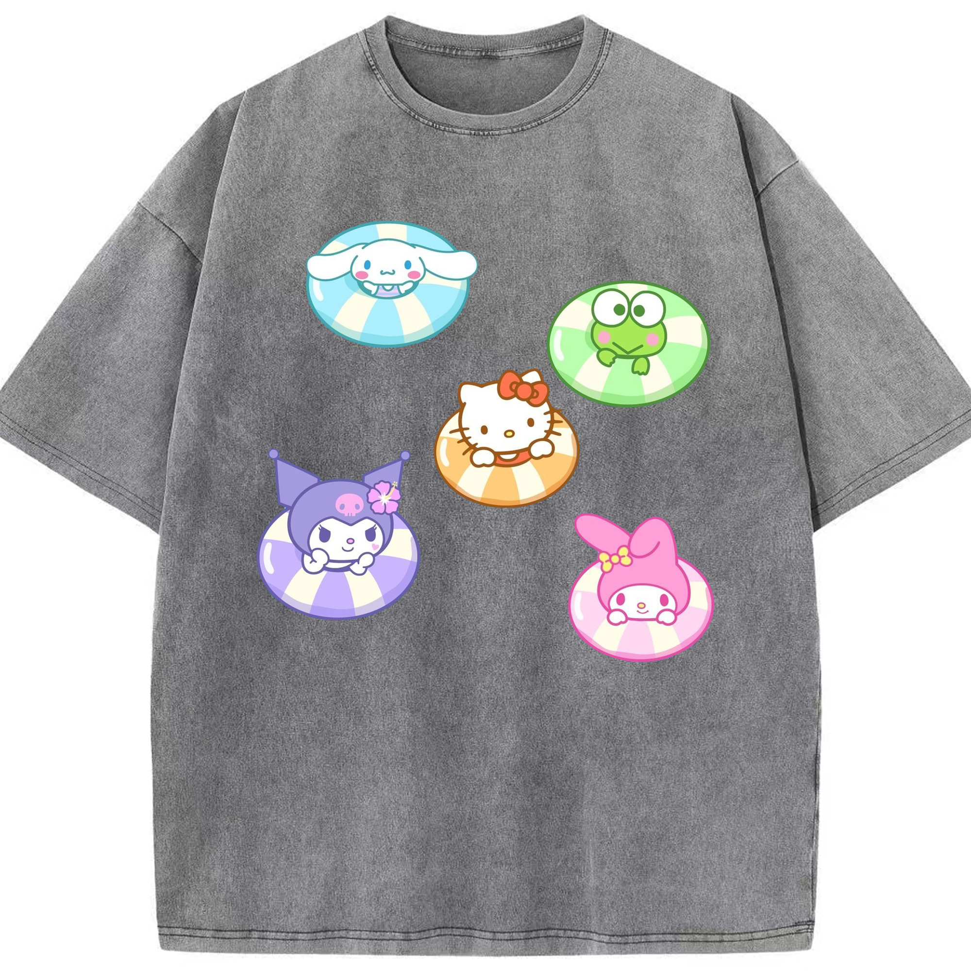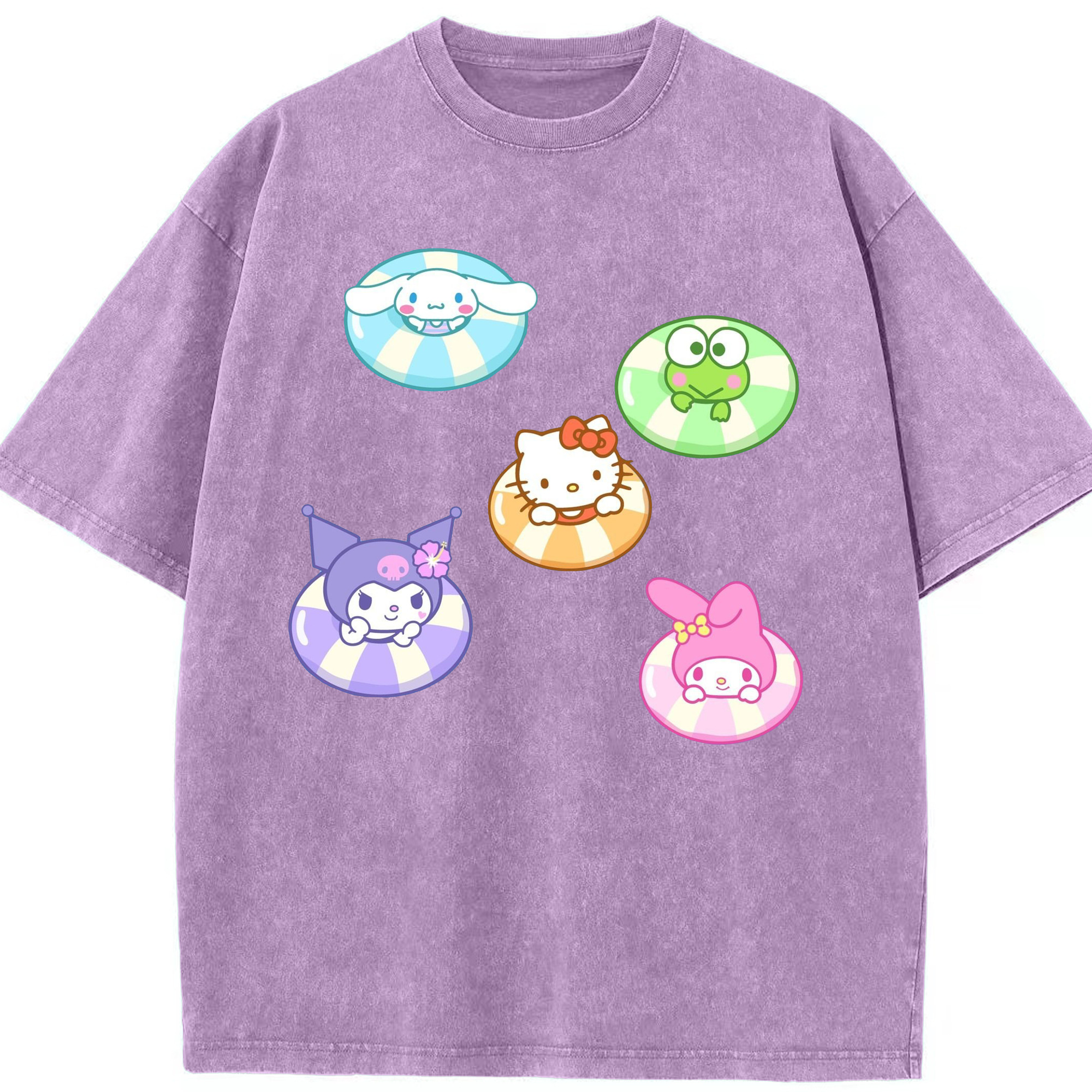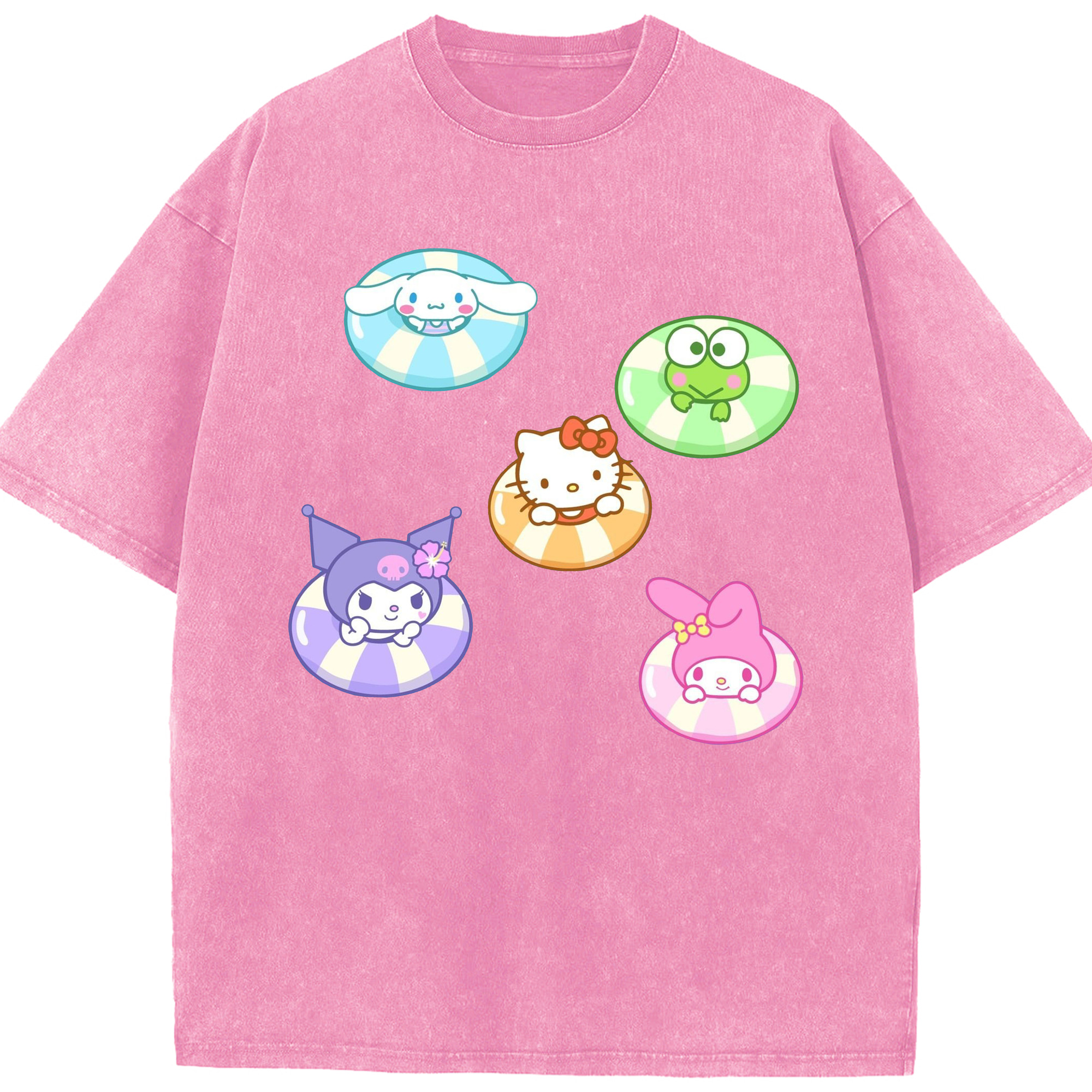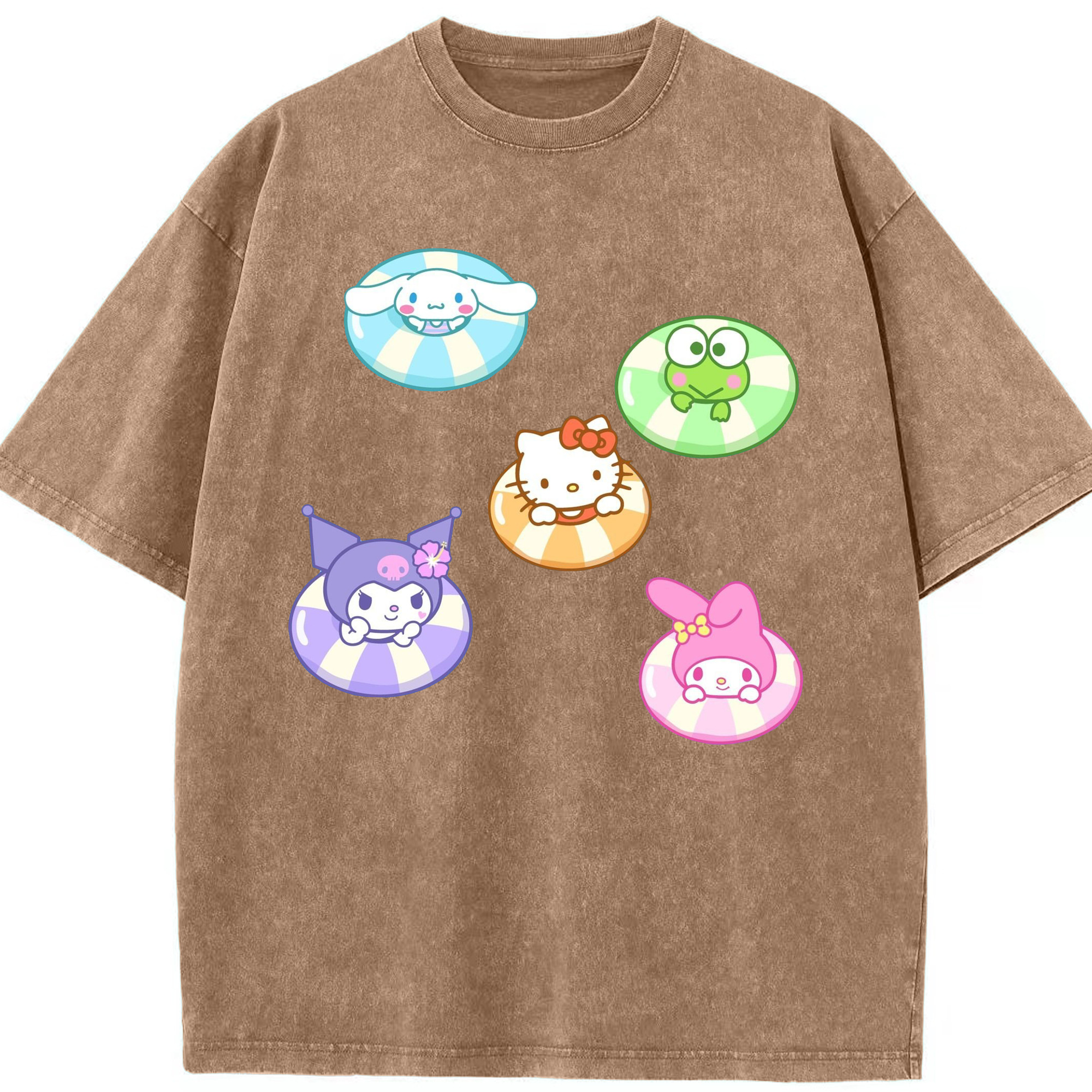 サンリオファミリー - 綿100% ヴィンテージ風 半袖Tシャツ ・ フロントプリント ・ 柔らか肌触り ・ 通気性 快適 ・ スポーツ カジュアル 外出用