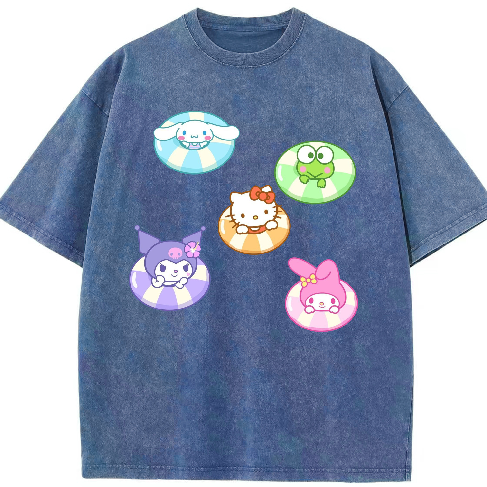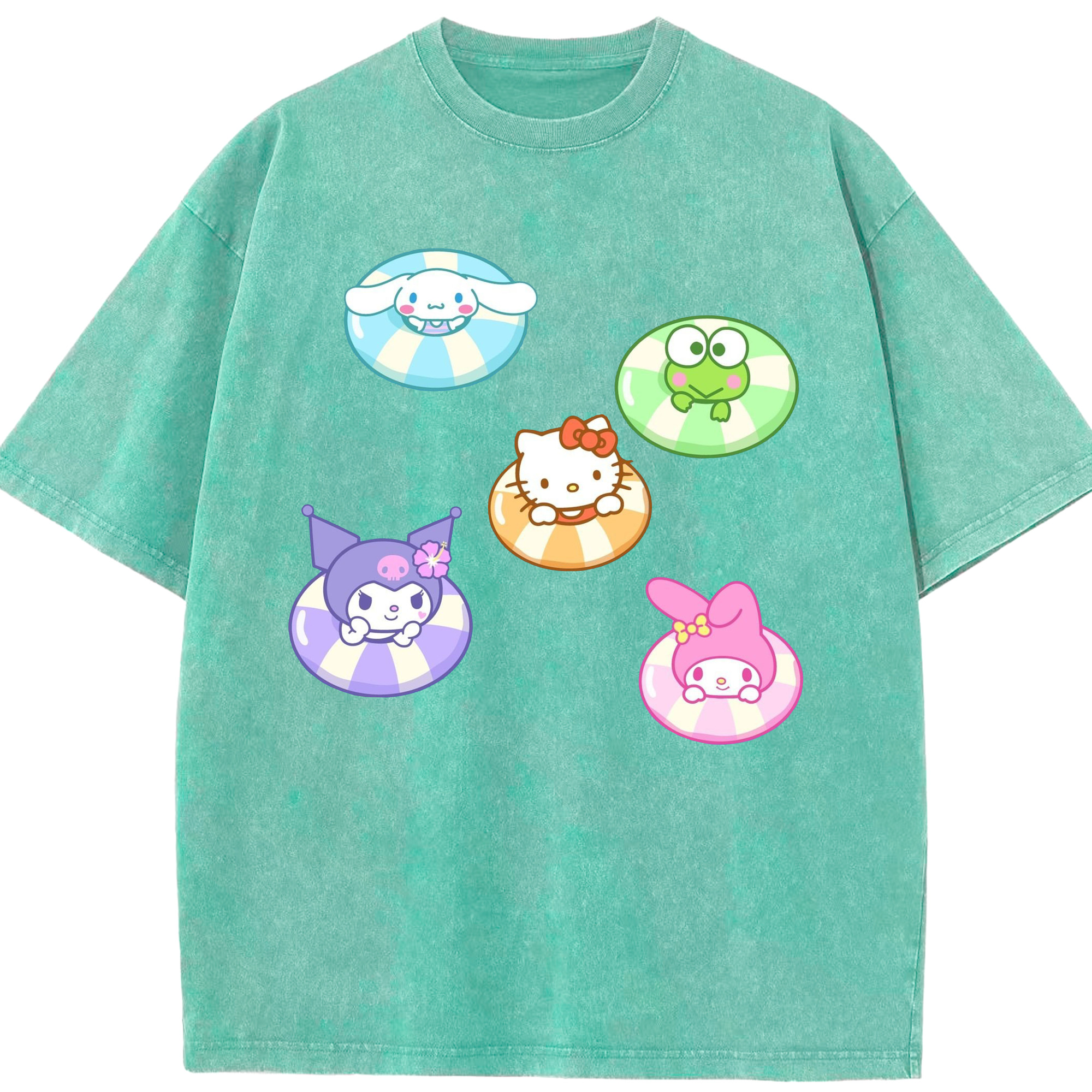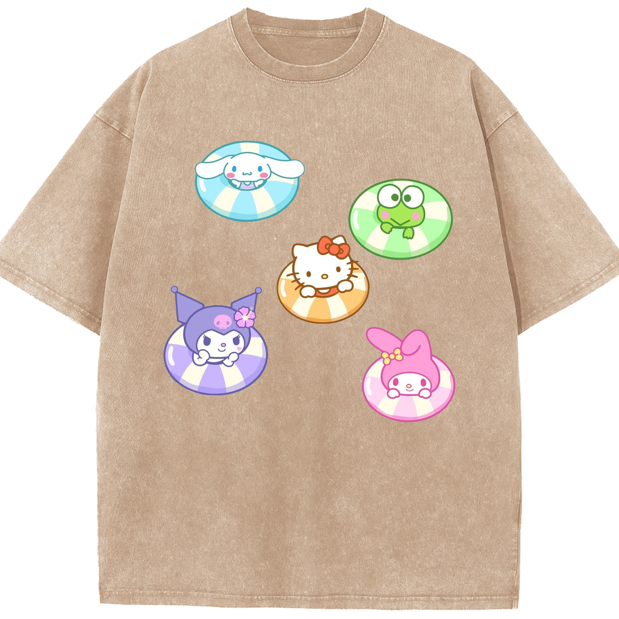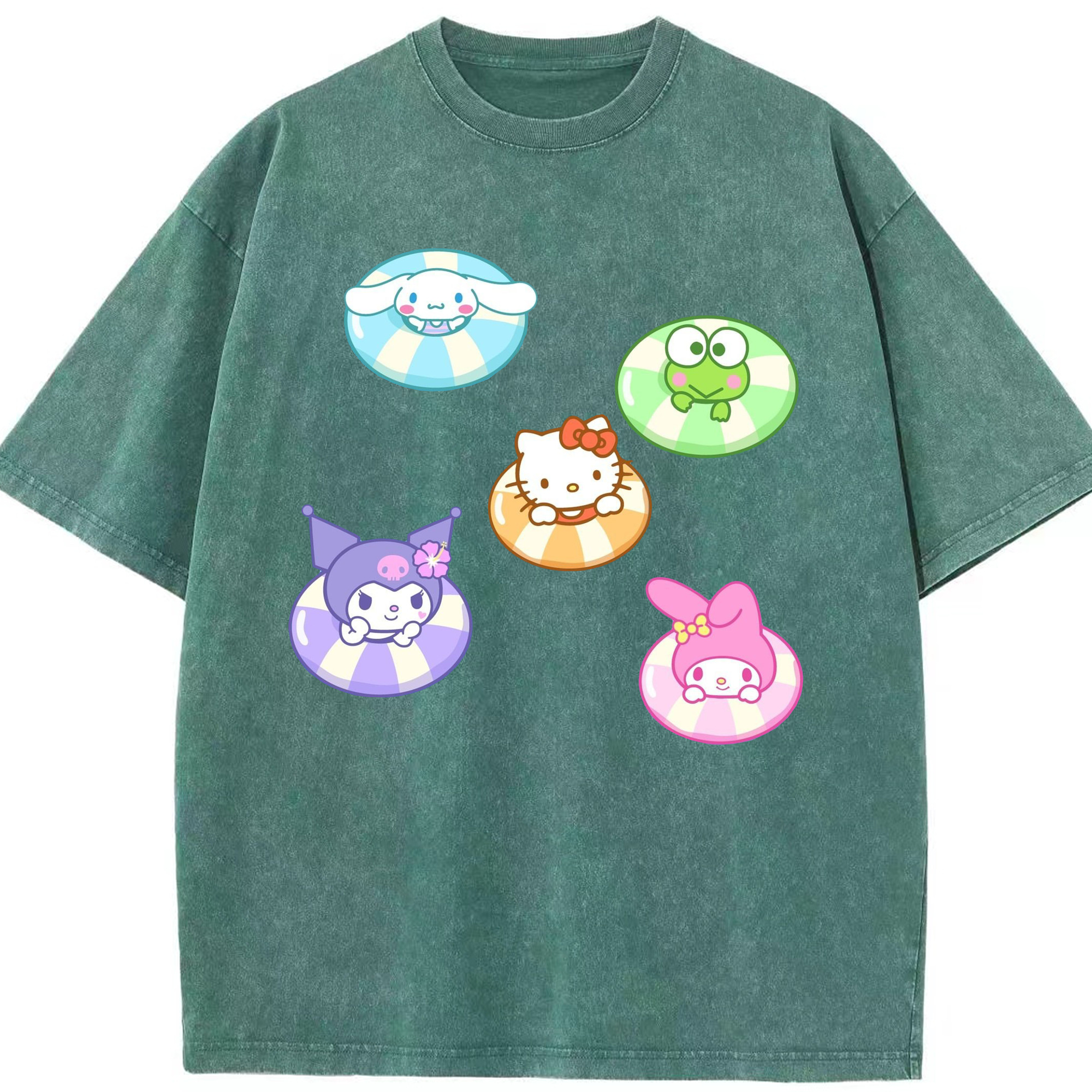 サンリオファミリー - 綿100% ヴィンテージ風 半袖Tシャツ ・ フロントプリント ・ 柔らか肌触り ・ 通気性 快適 ・ スポーツ カジュアル 外出用
