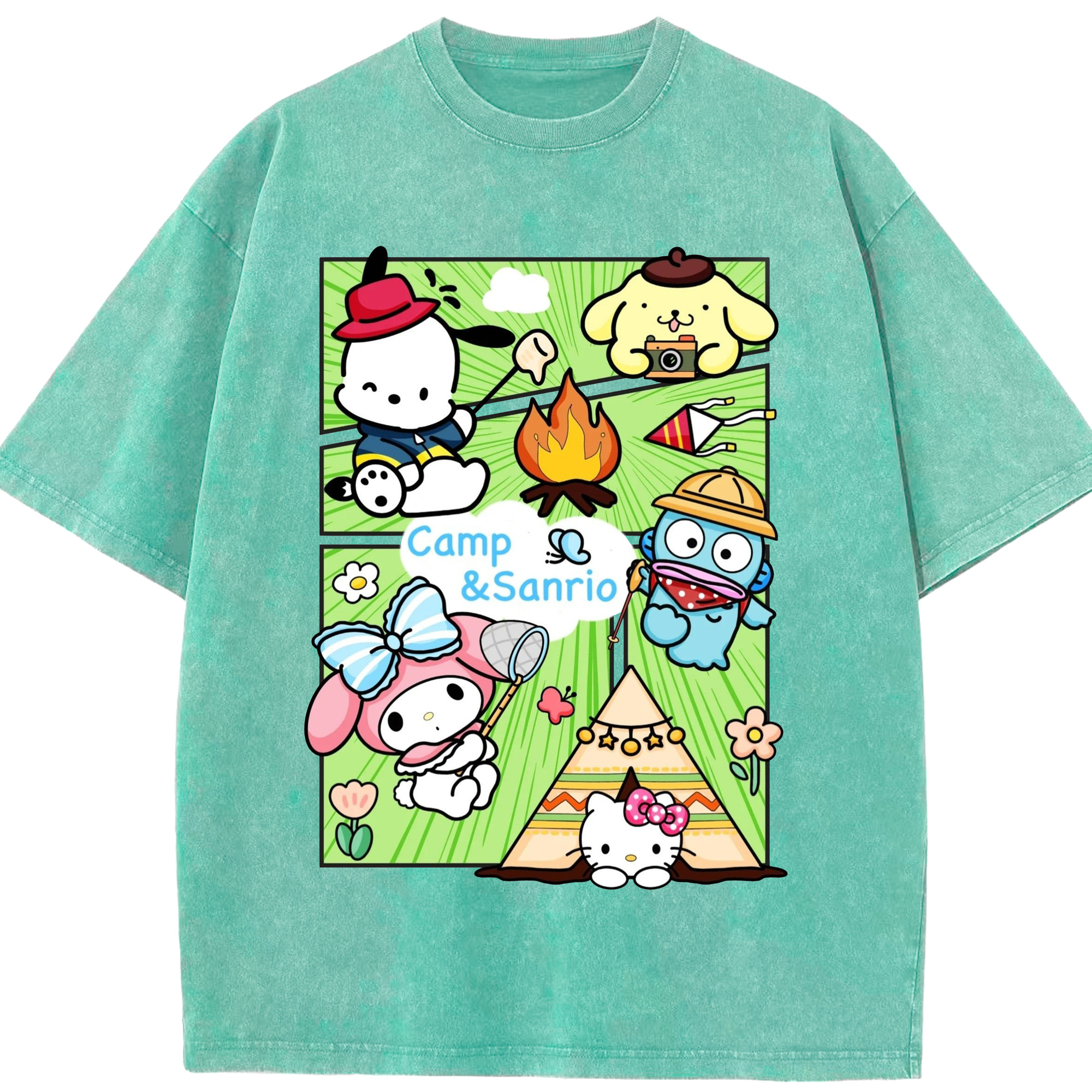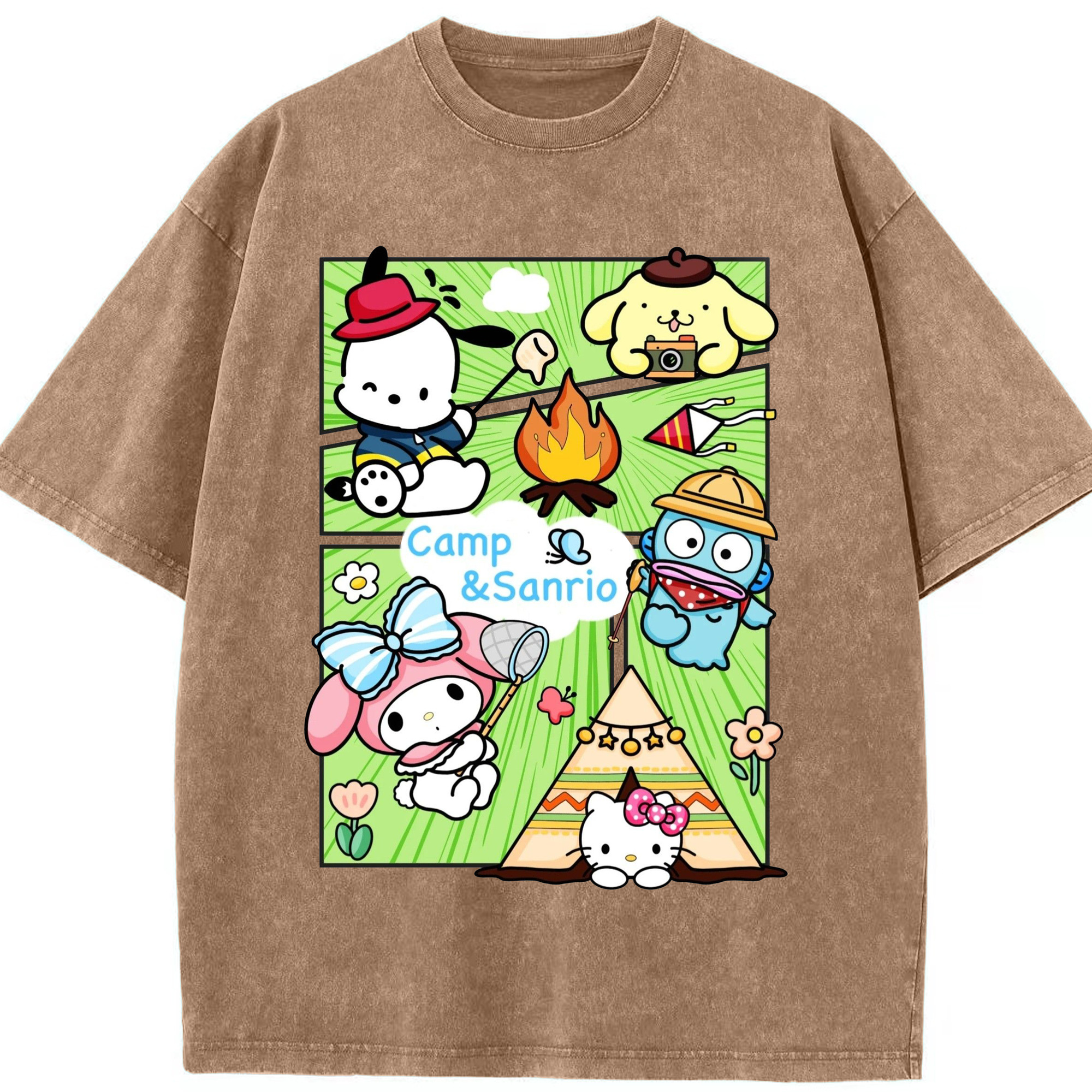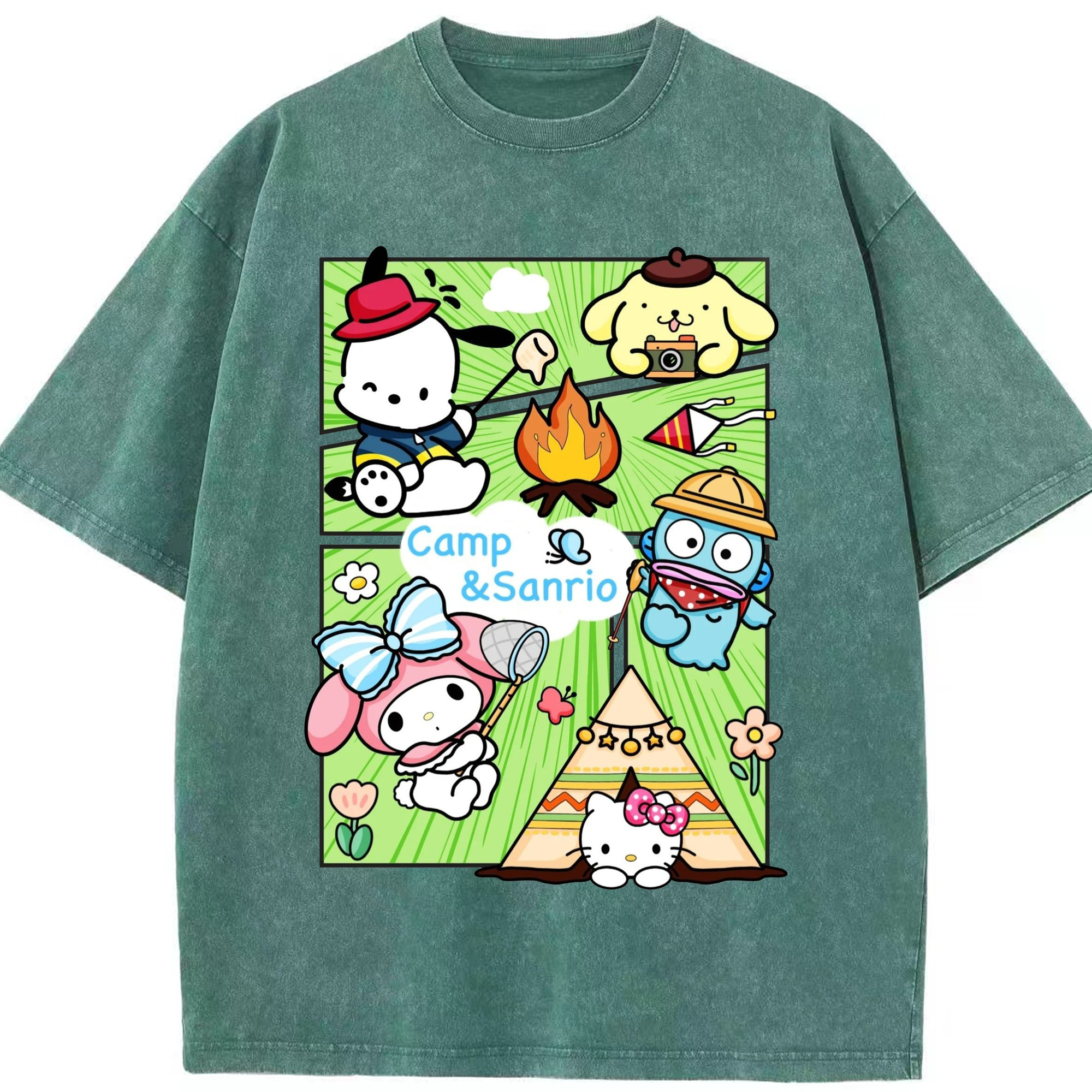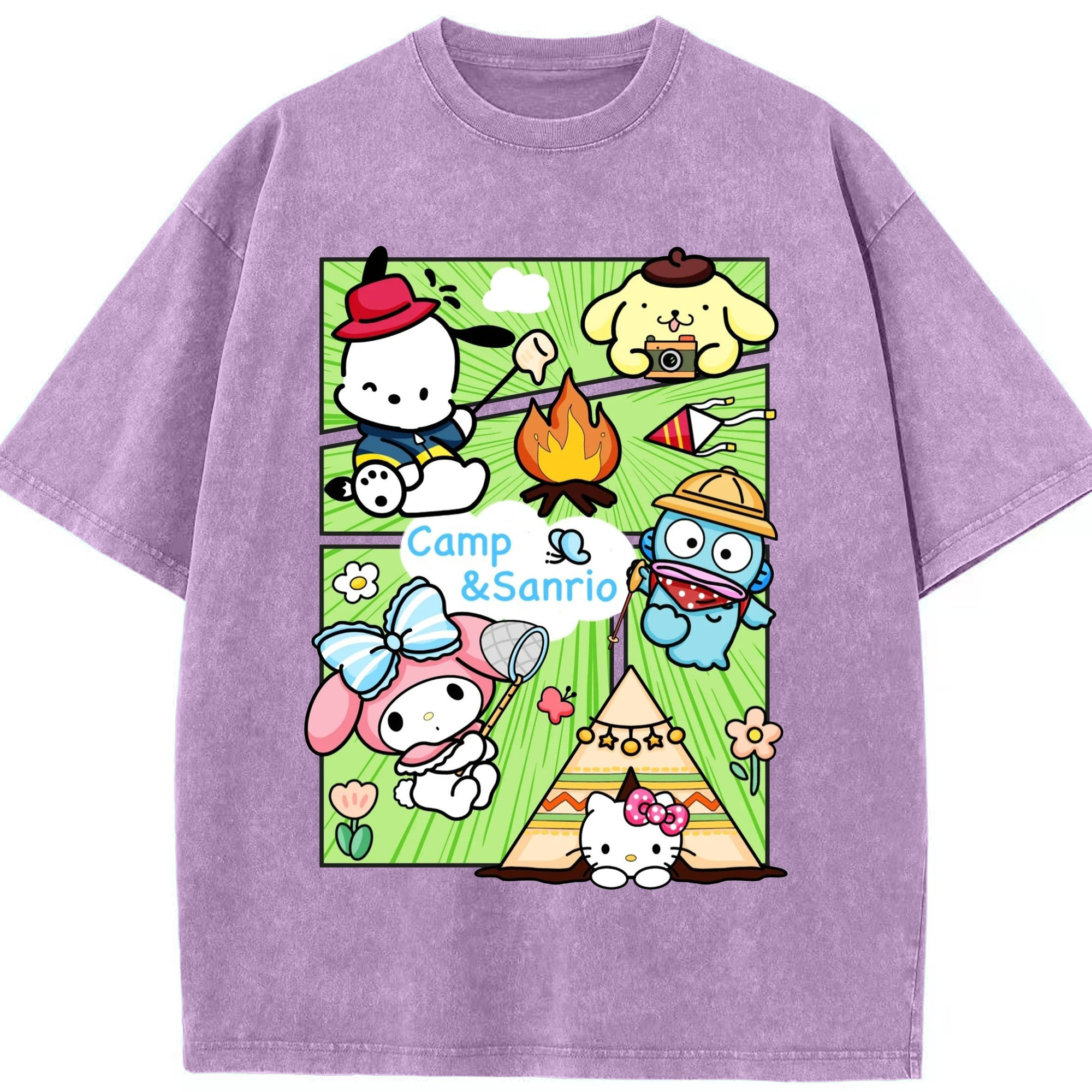 とってもかわいいサンリオファミリー - 綿100% ヴィンテージ風 半袖Tシャツ ・ フロントプリント ・ 柔らか肌触り ・ 通気性 快適 ・ スポーツ カジュアル 外出用