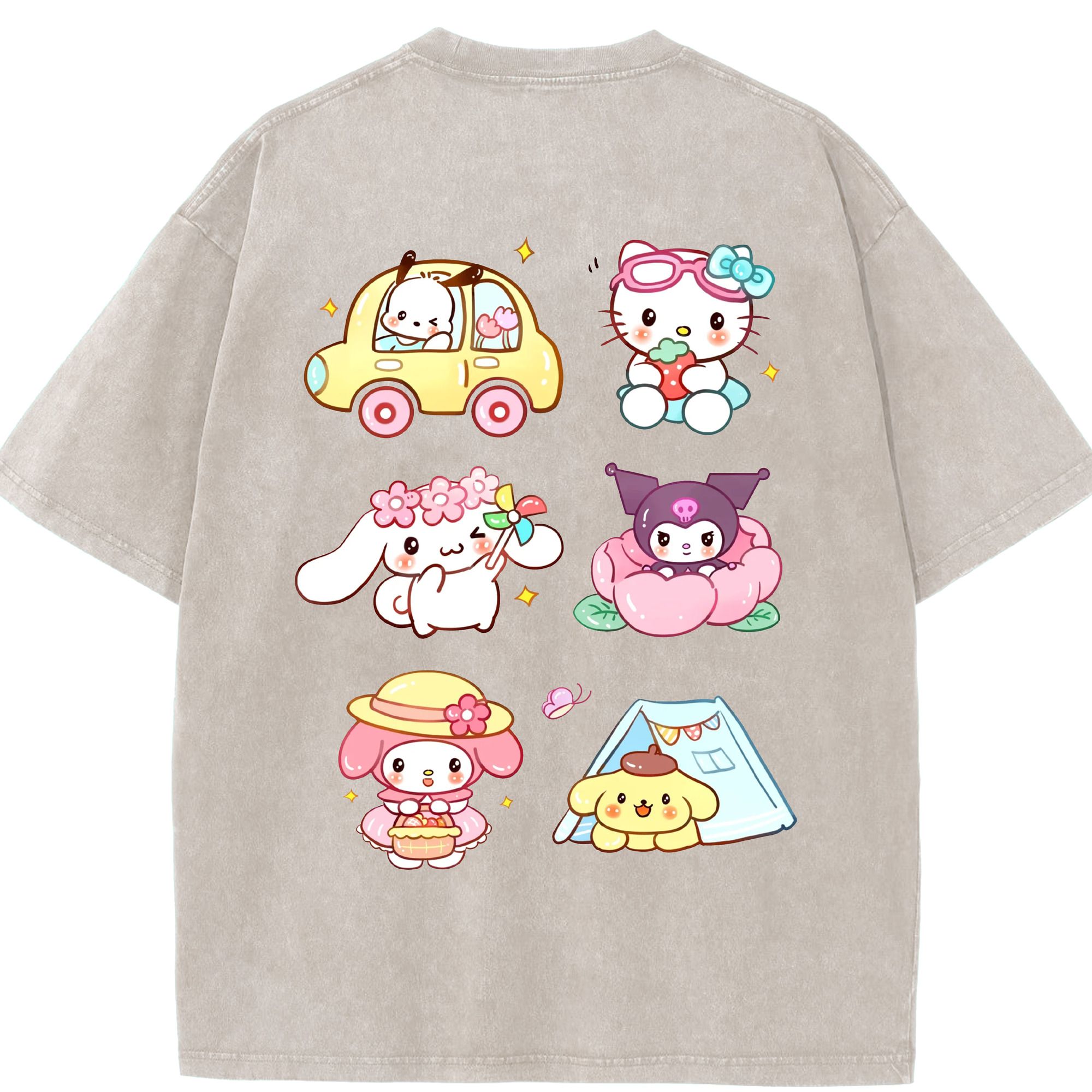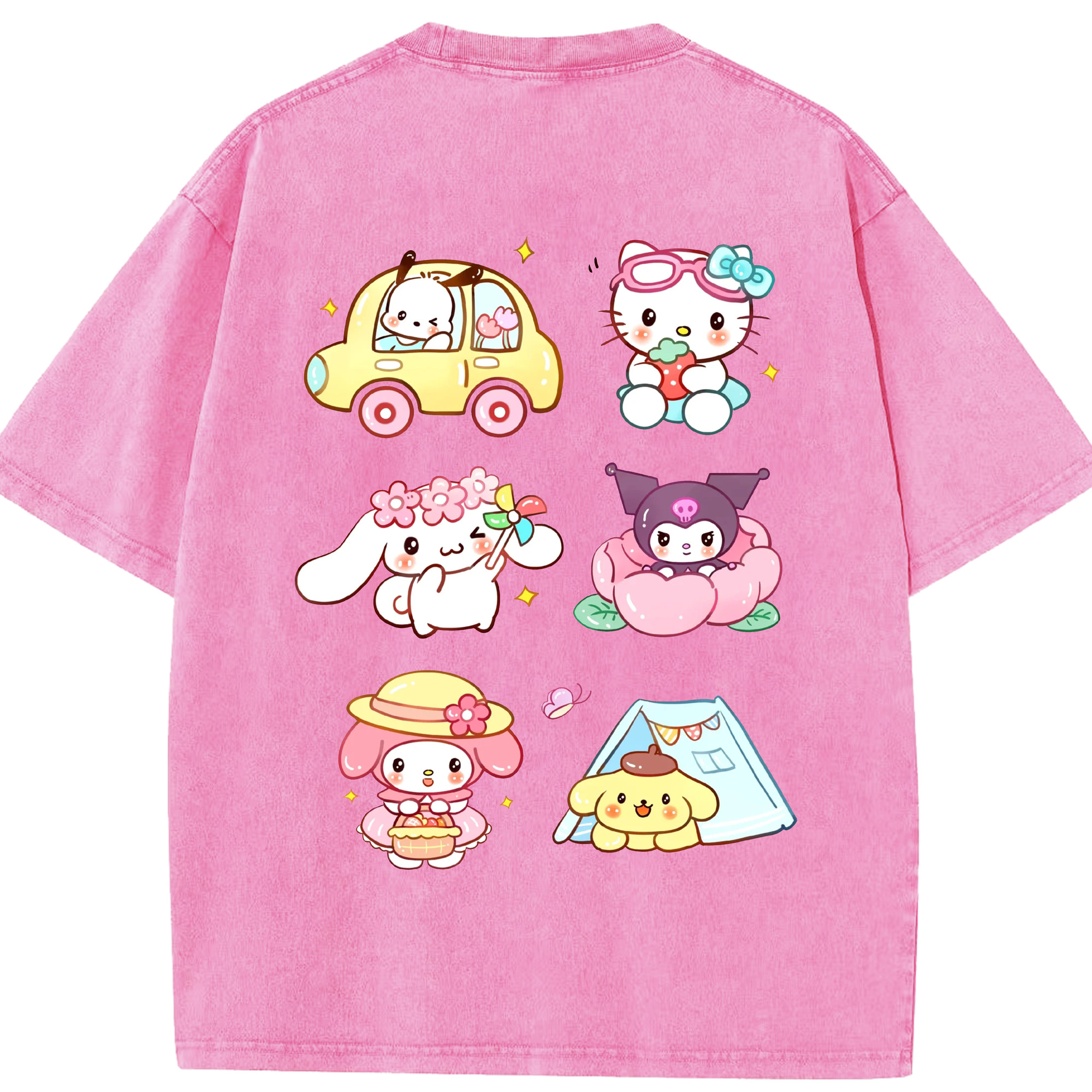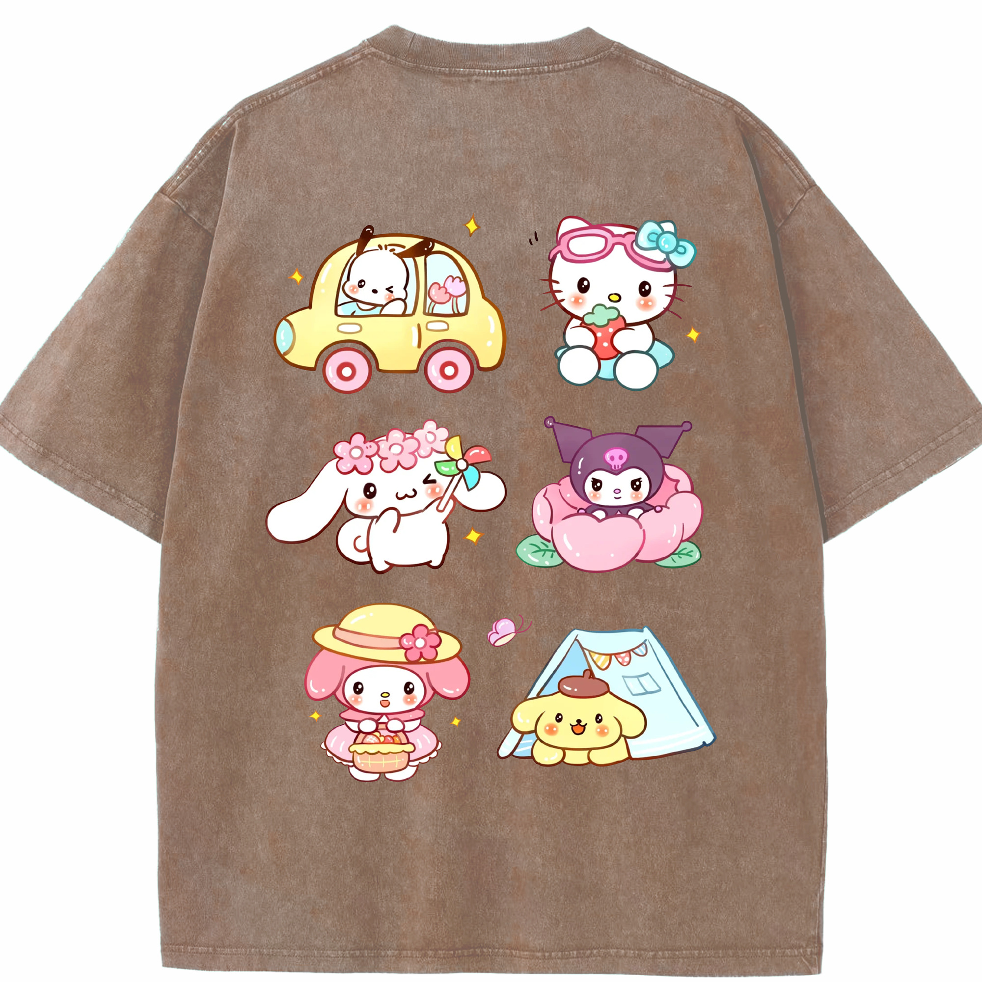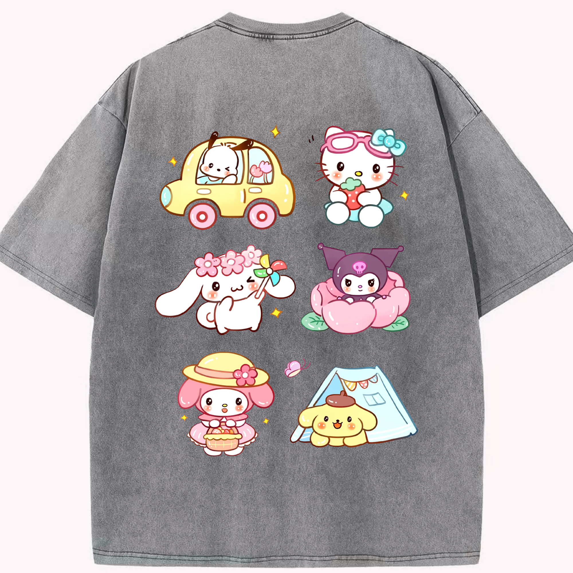 サンリオファミリー 2025年新作 - 綿100% ヴィンテージ風 半袖Tシャツ ・ 背面プリント ・ 柔らか肌触り ・ 通気性 快適 ・ スポーツ カジュアル 外出用