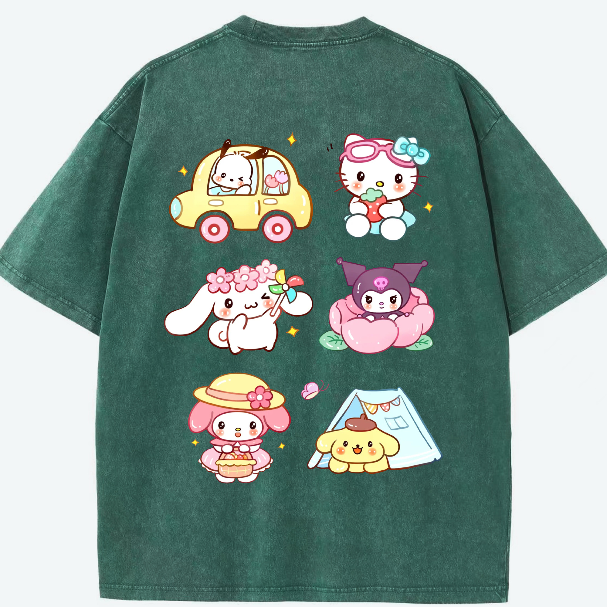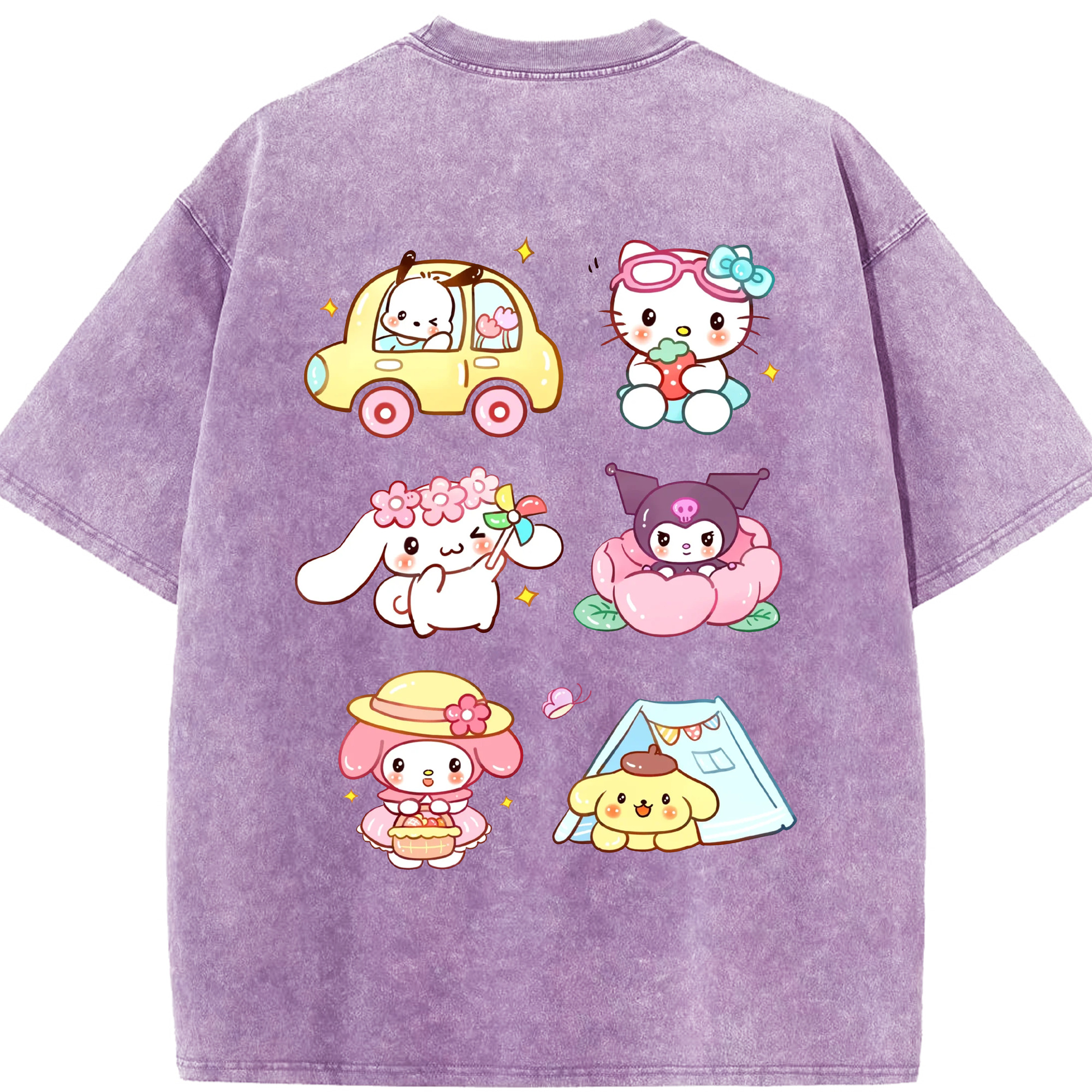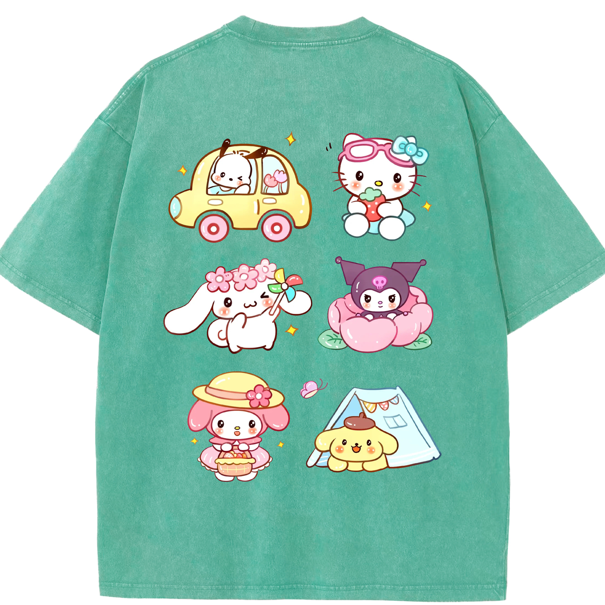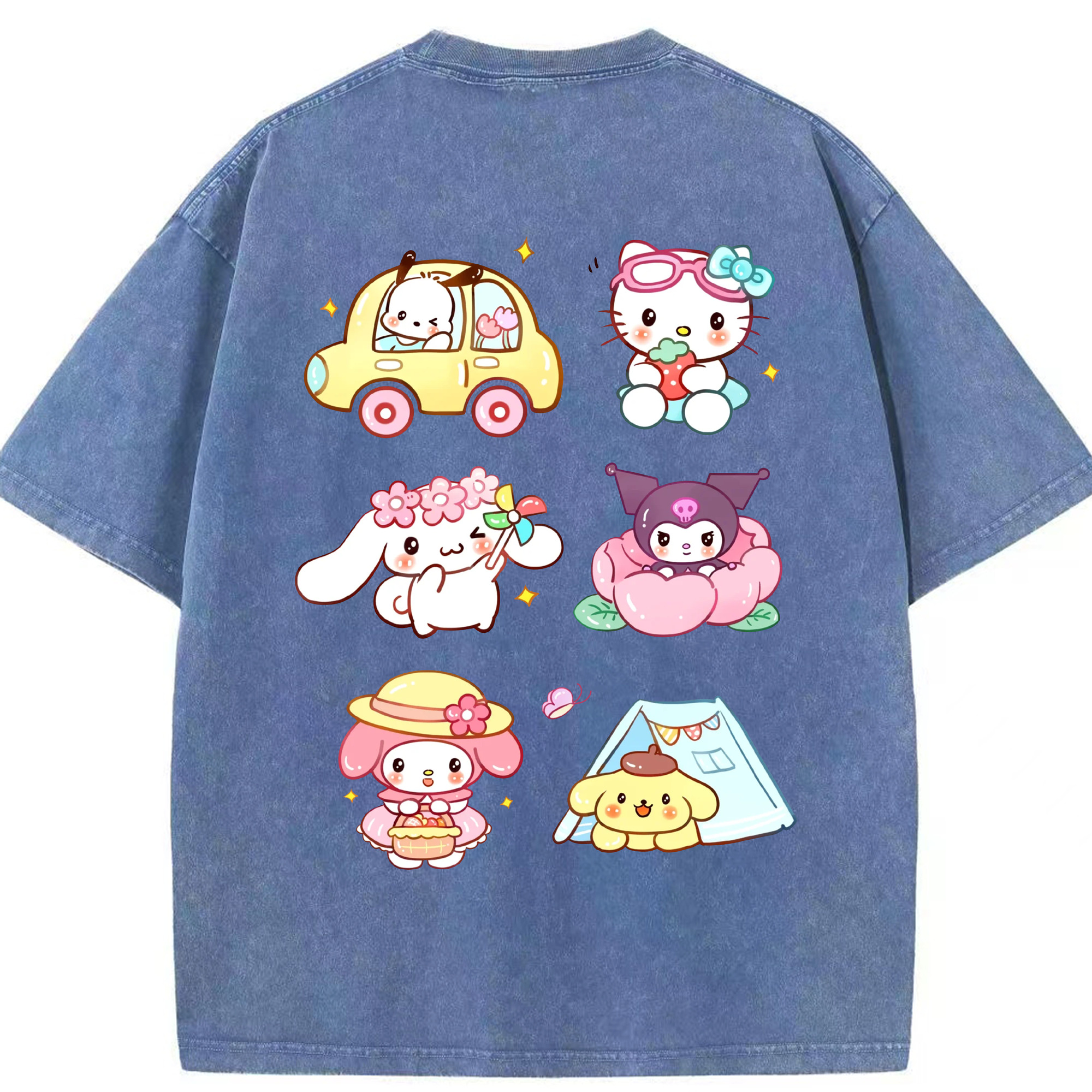 サンリオファミリー 2025年新作 - 綿100% ヴィンテージ風 半袖Tシャツ ・ 背面プリント ・ 柔らか肌触り ・ 通気性 快適 ・ スポーツ カジュアル 外出用