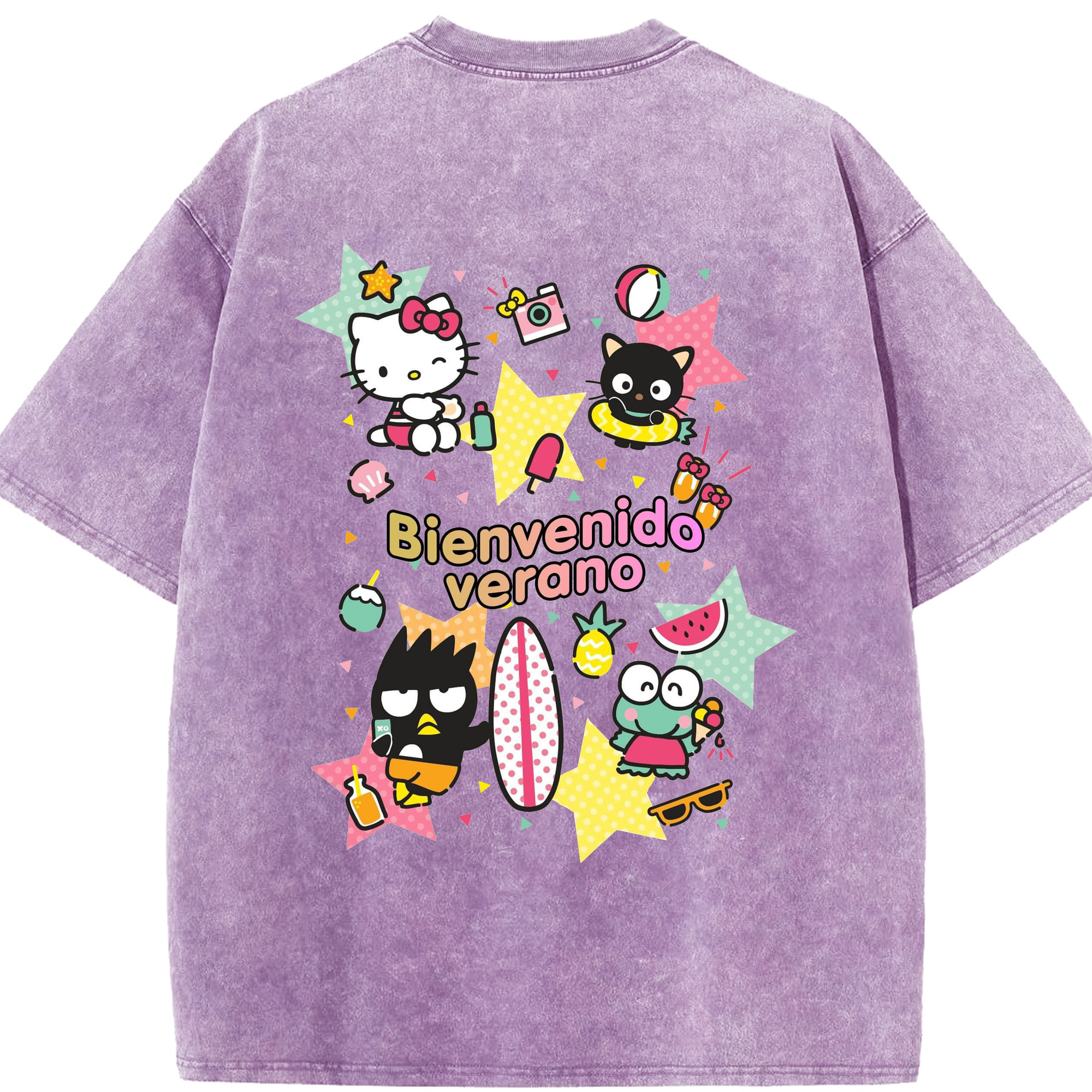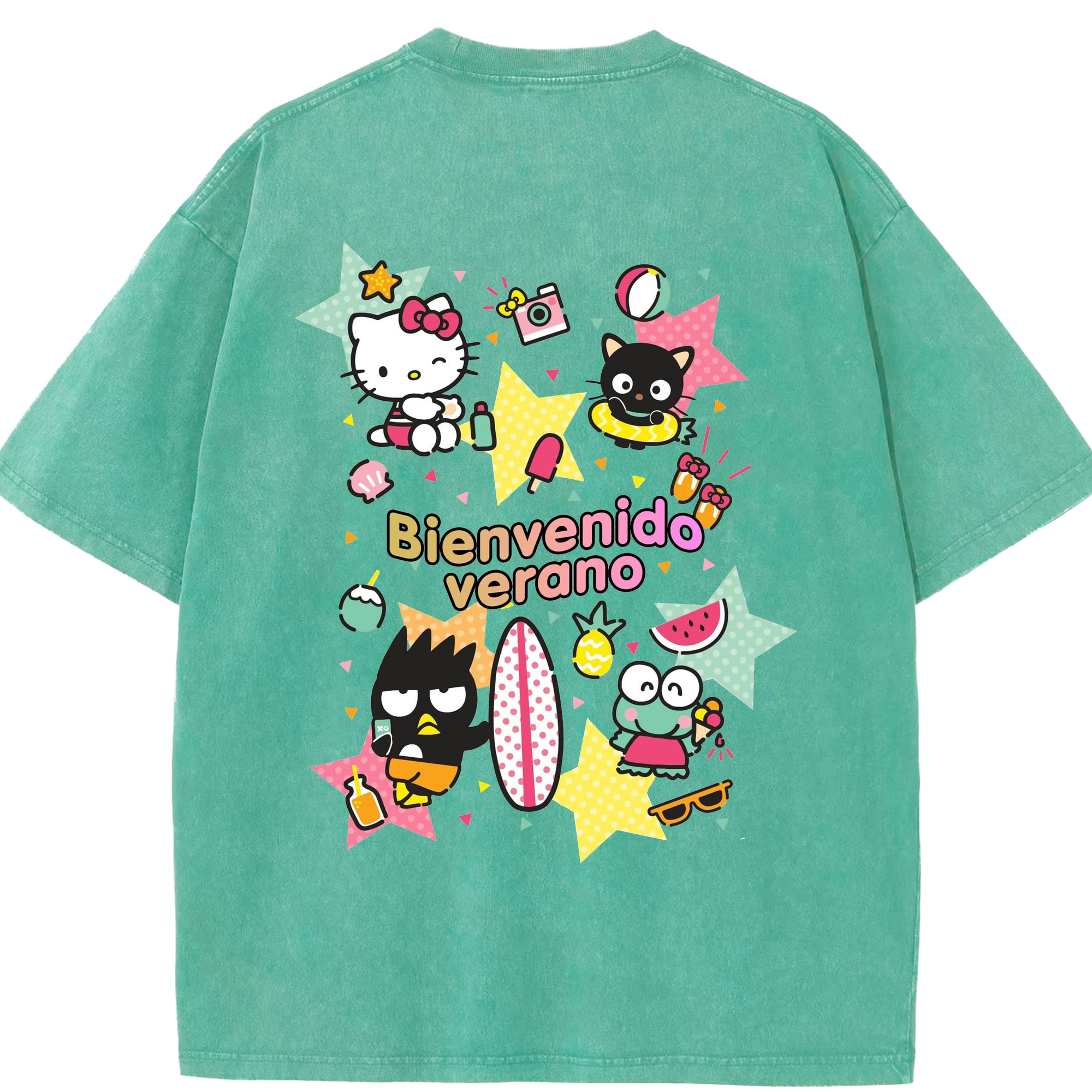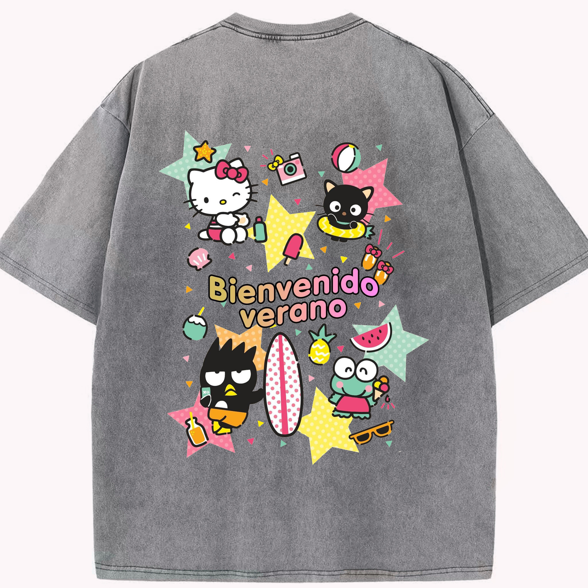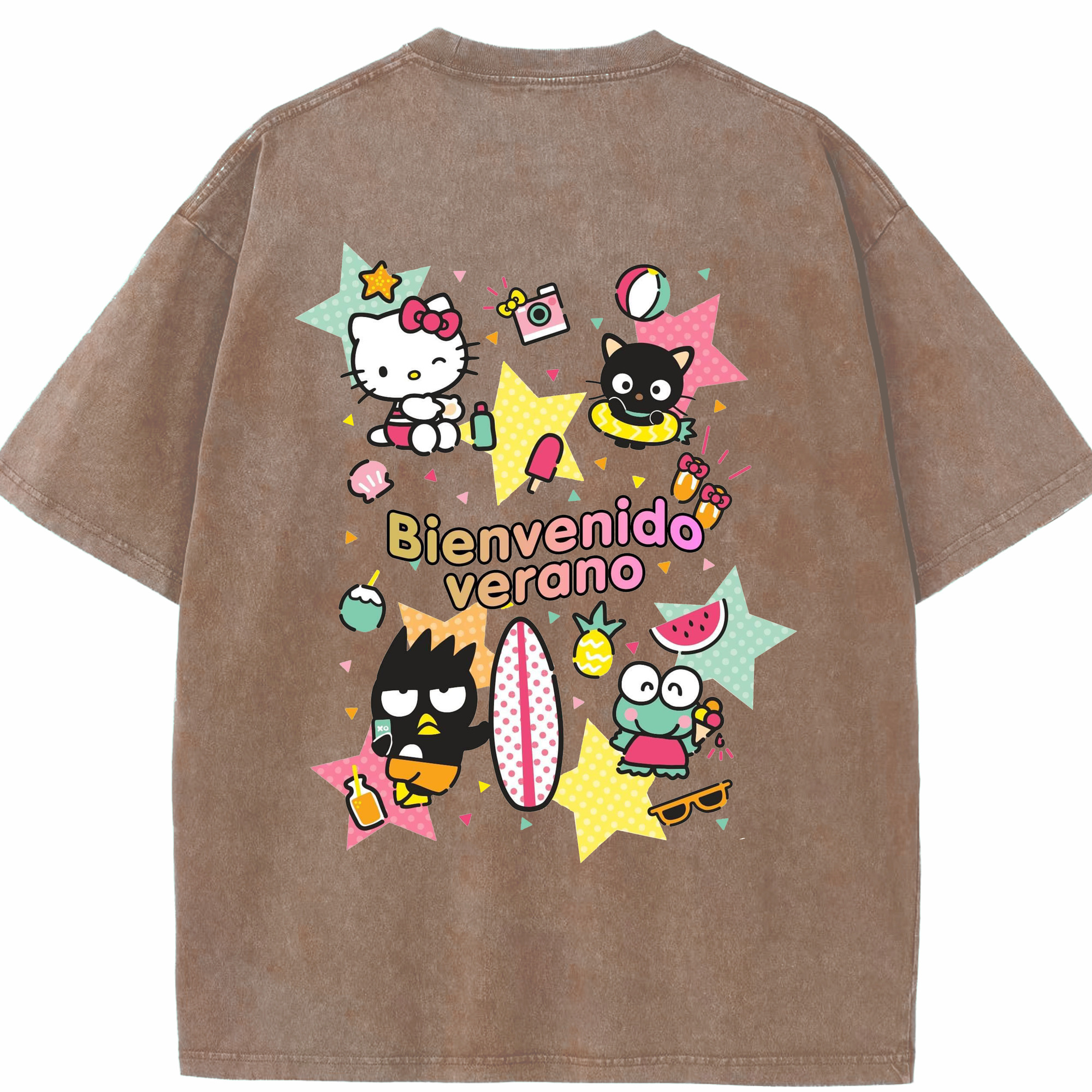 サンリオファミリー - 綿100% ヴィンテージ風 半袖Tシャツ ・ 背面プリント ・ 柔らか肌触り ・ 通気性 快適 ・ スポーツ カジュアル 外出用