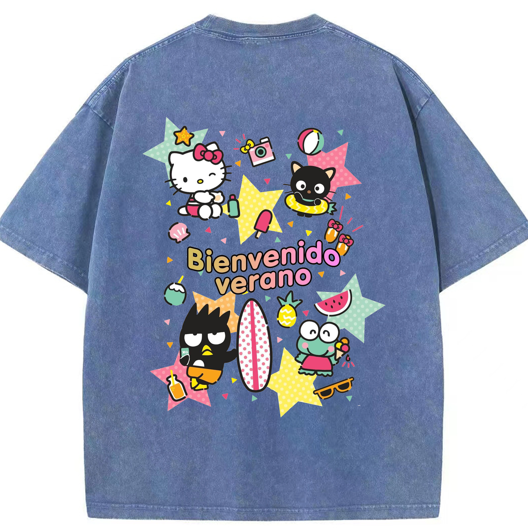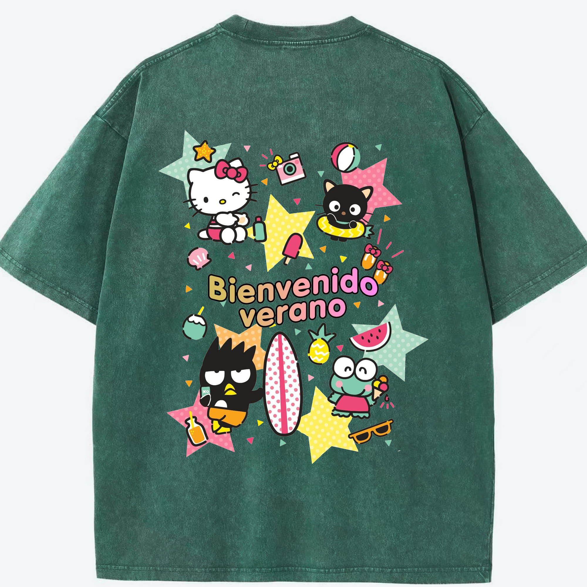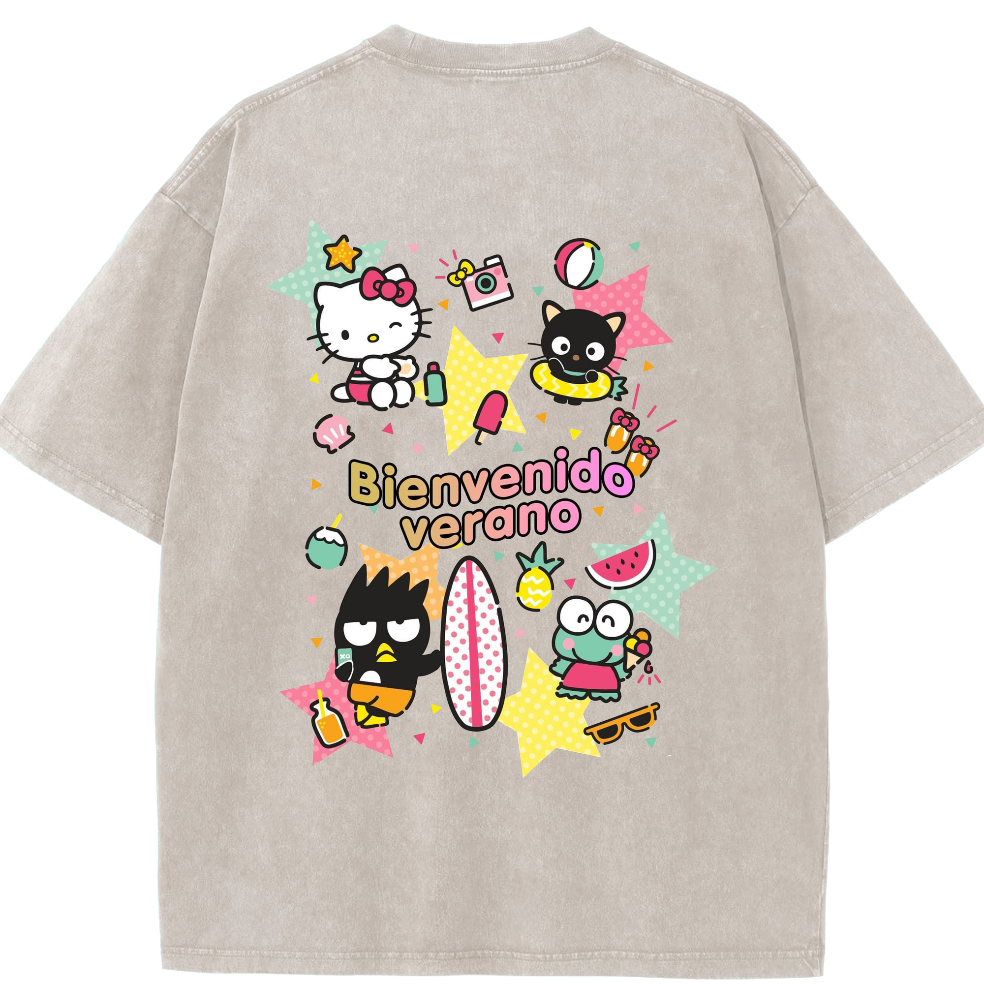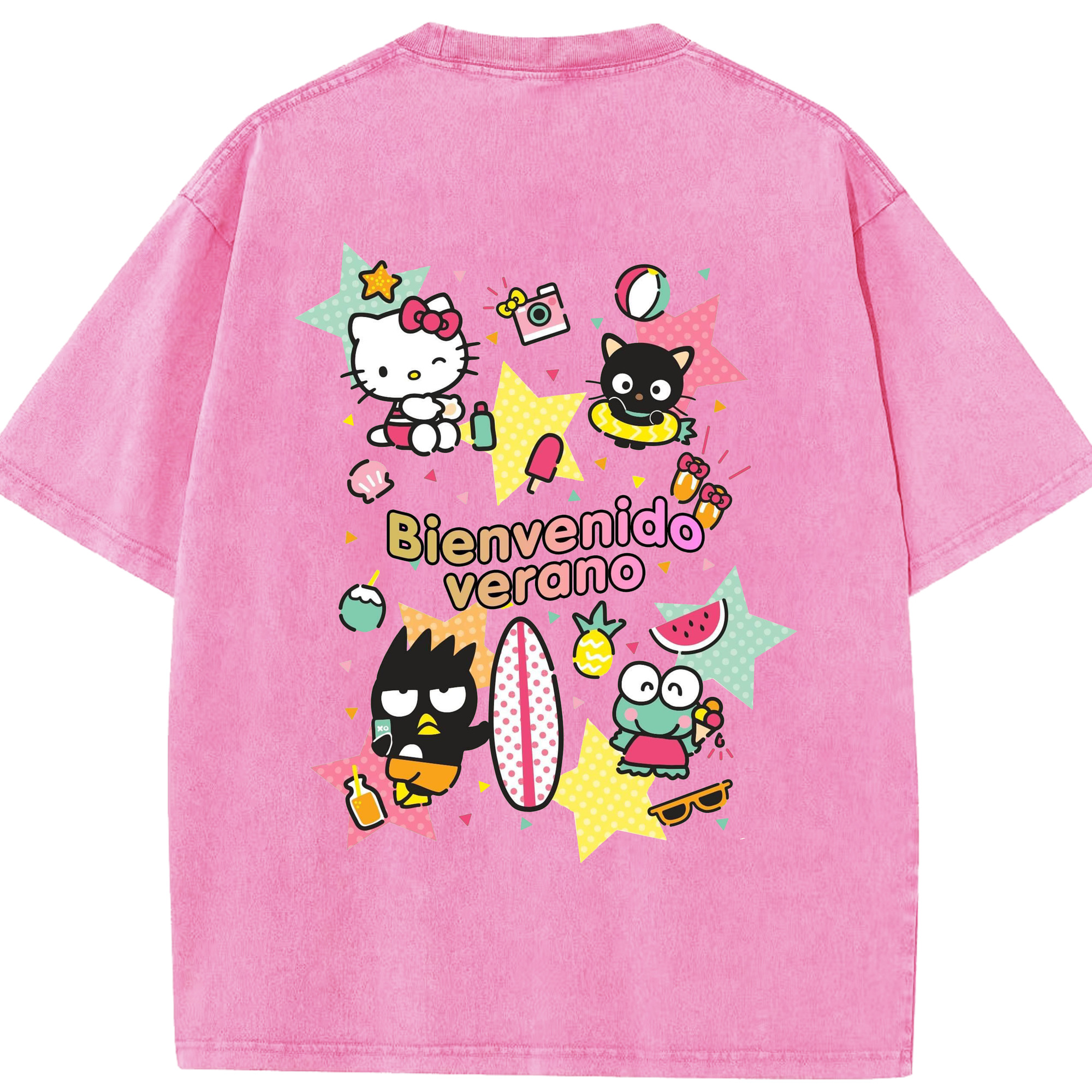 サンリオファミリー - 綿100% ヴィンテージ風 半袖Tシャツ ・ 背面プリント ・ 柔らか肌触り ・ 通気性 快適 ・ スポーツ カジュアル 外出用