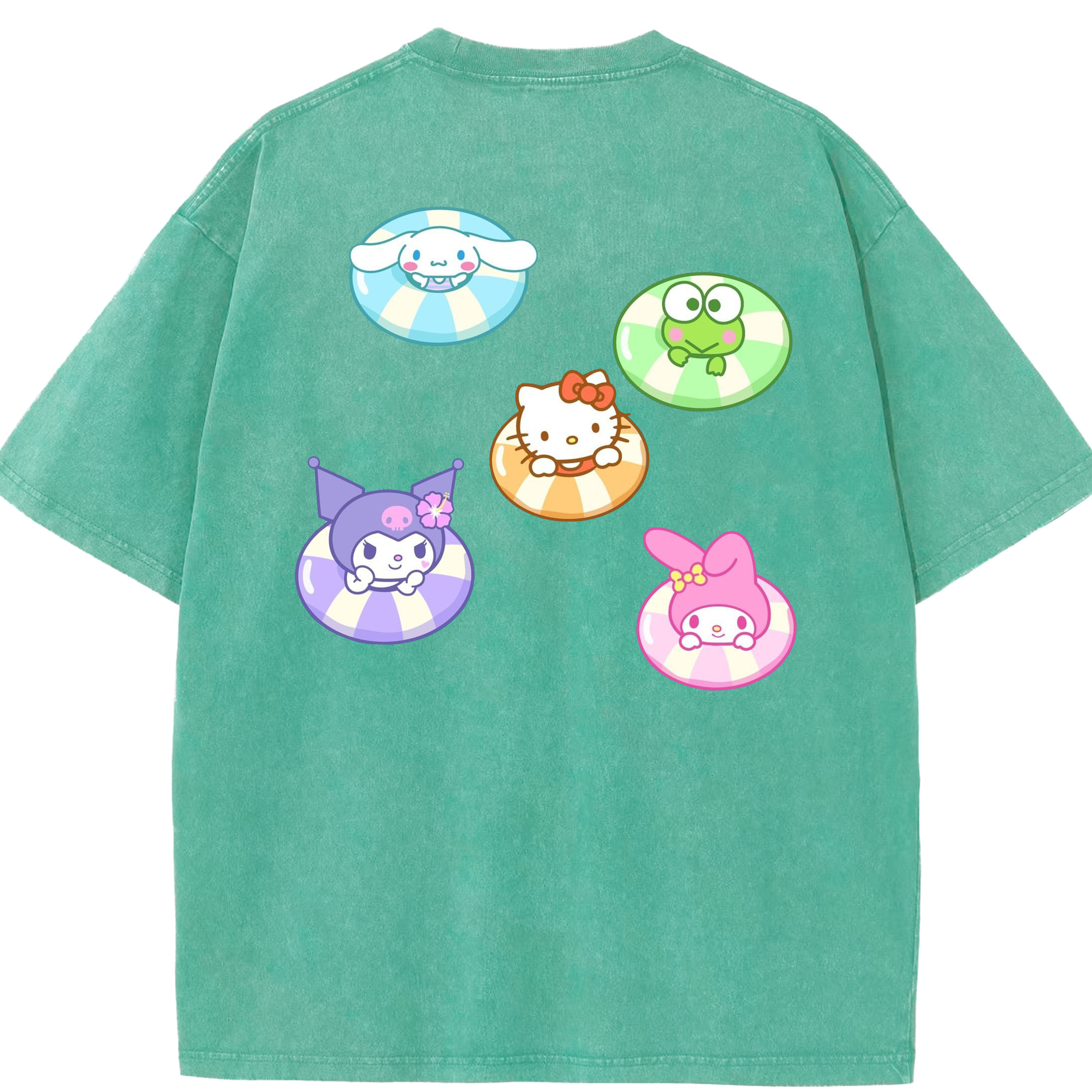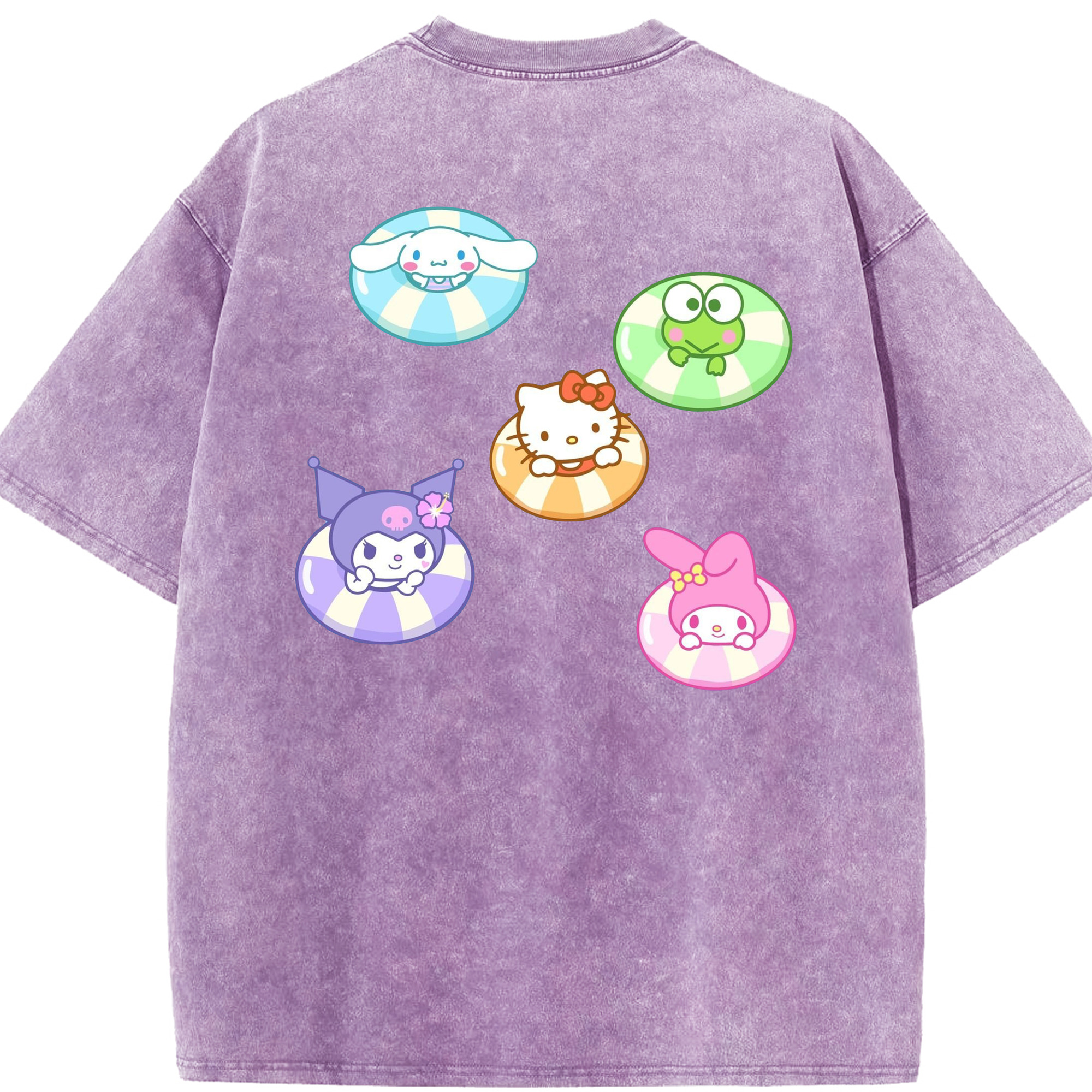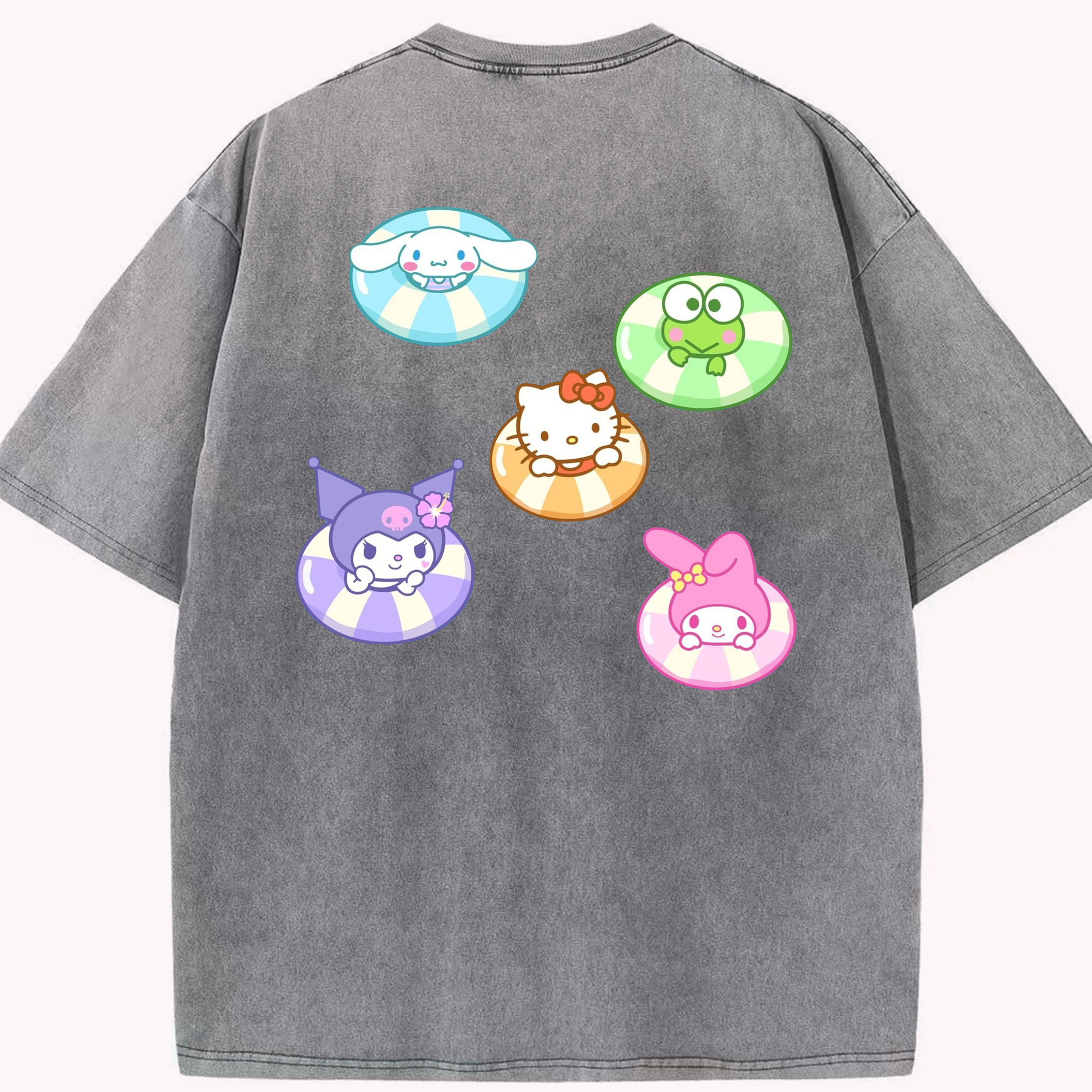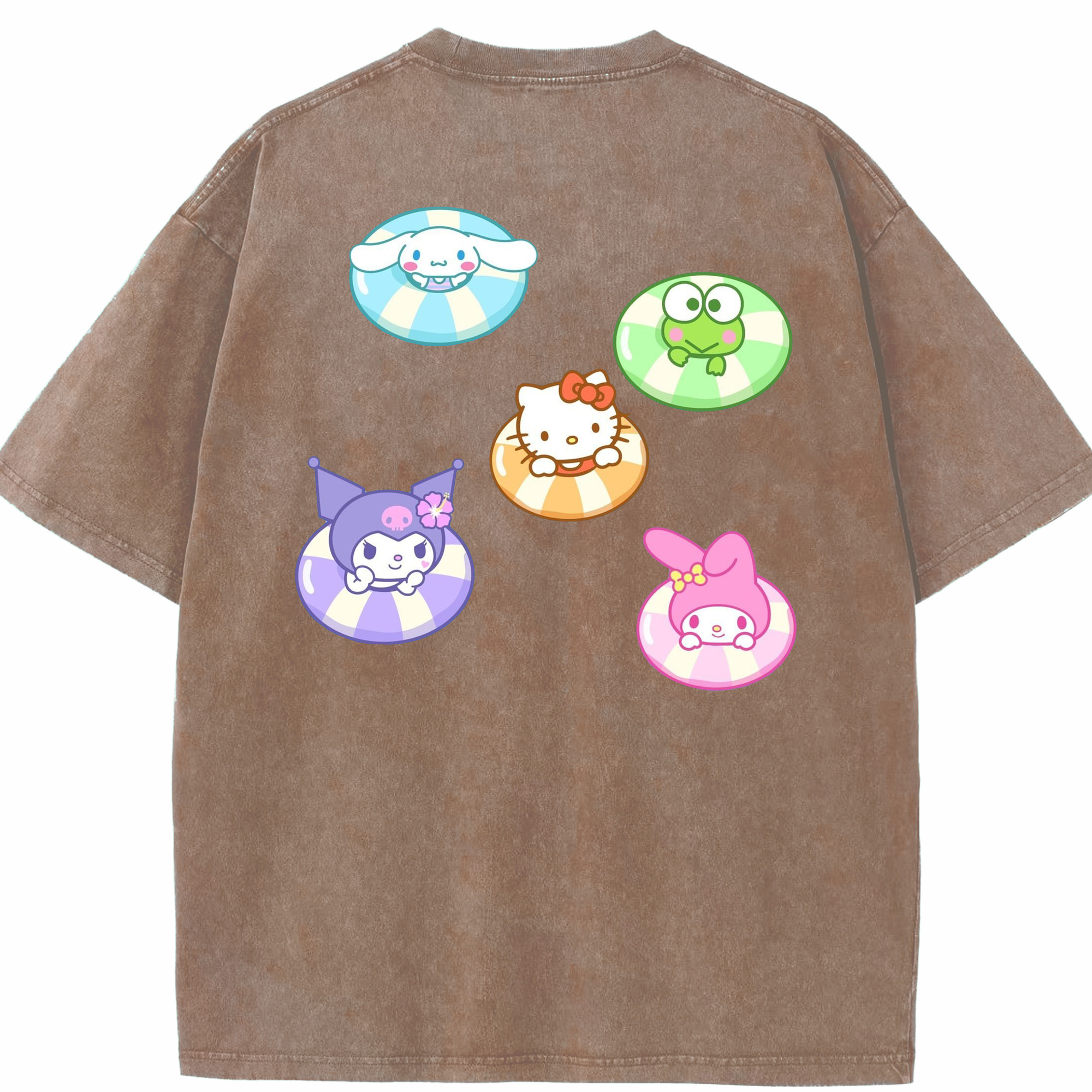 サンリオファミリー - 綿100% ヴィンテージ風 半袖Tシャツ ・ 背面プリント ・ 柔らか肌触り ・ 通気性 快適 ・ スポーツ カジュアル 外出用