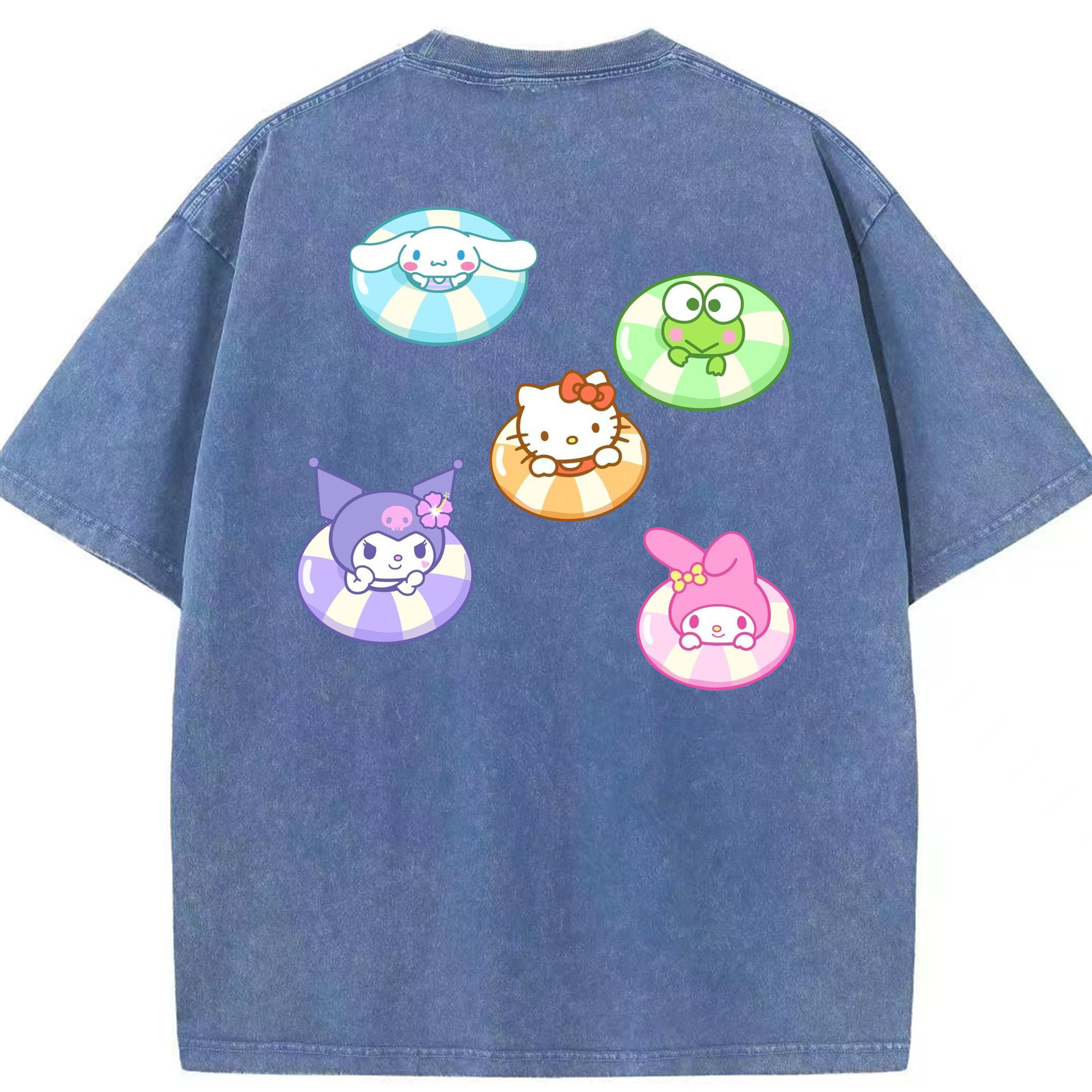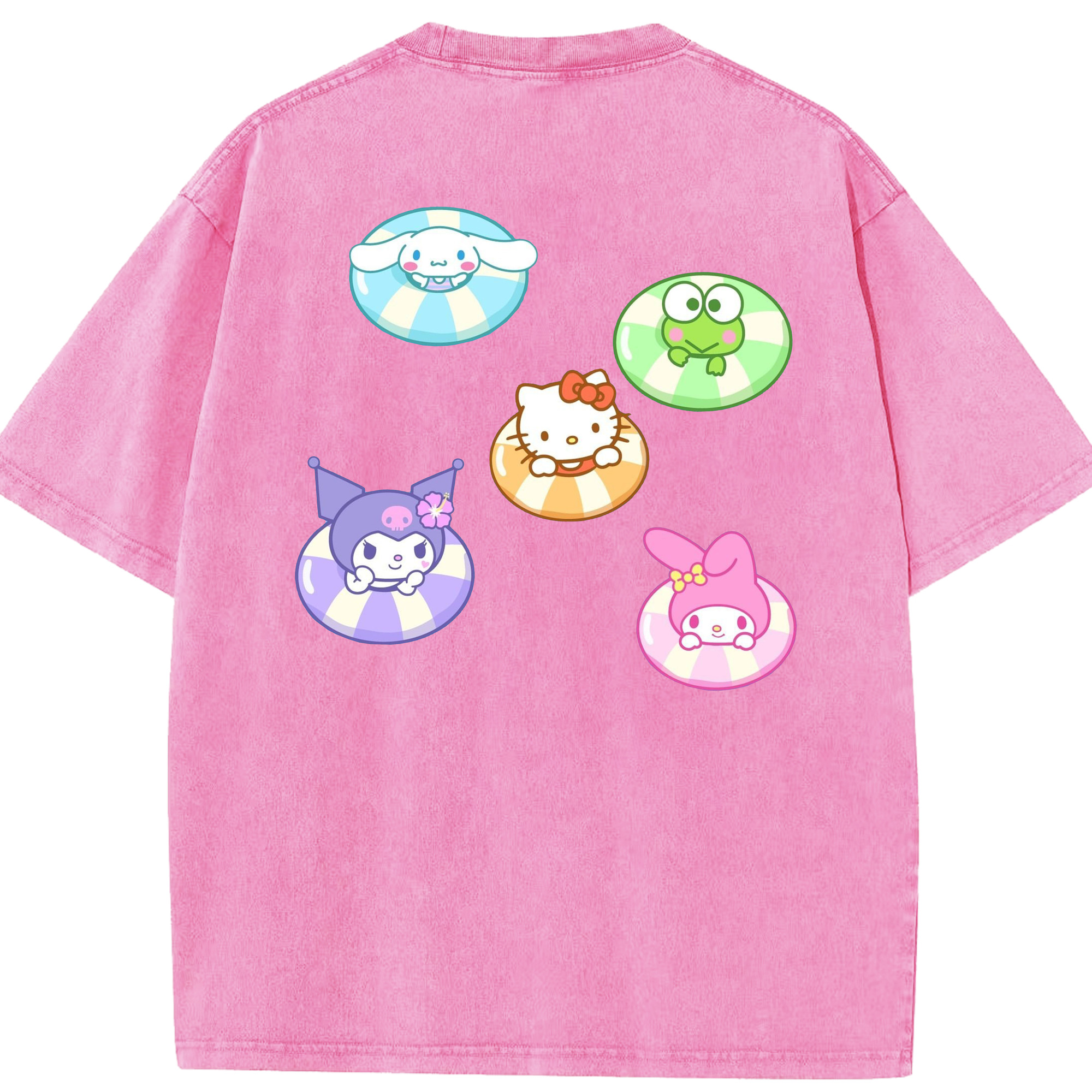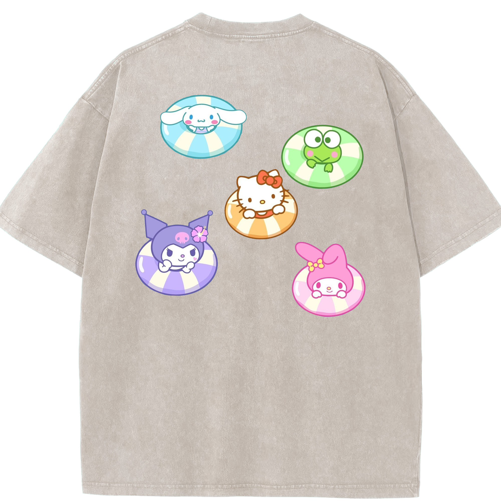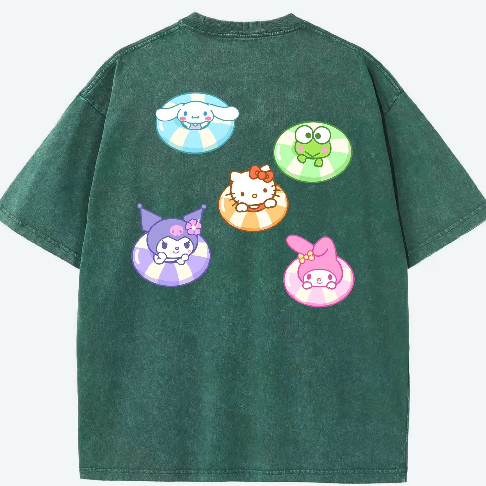 サンリオファミリー - 綿100% ヴィンテージ風 半袖Tシャツ ・ 背面プリント ・ 柔らか肌触り ・ 通気性 快適 ・ スポーツ カジュアル 外出用