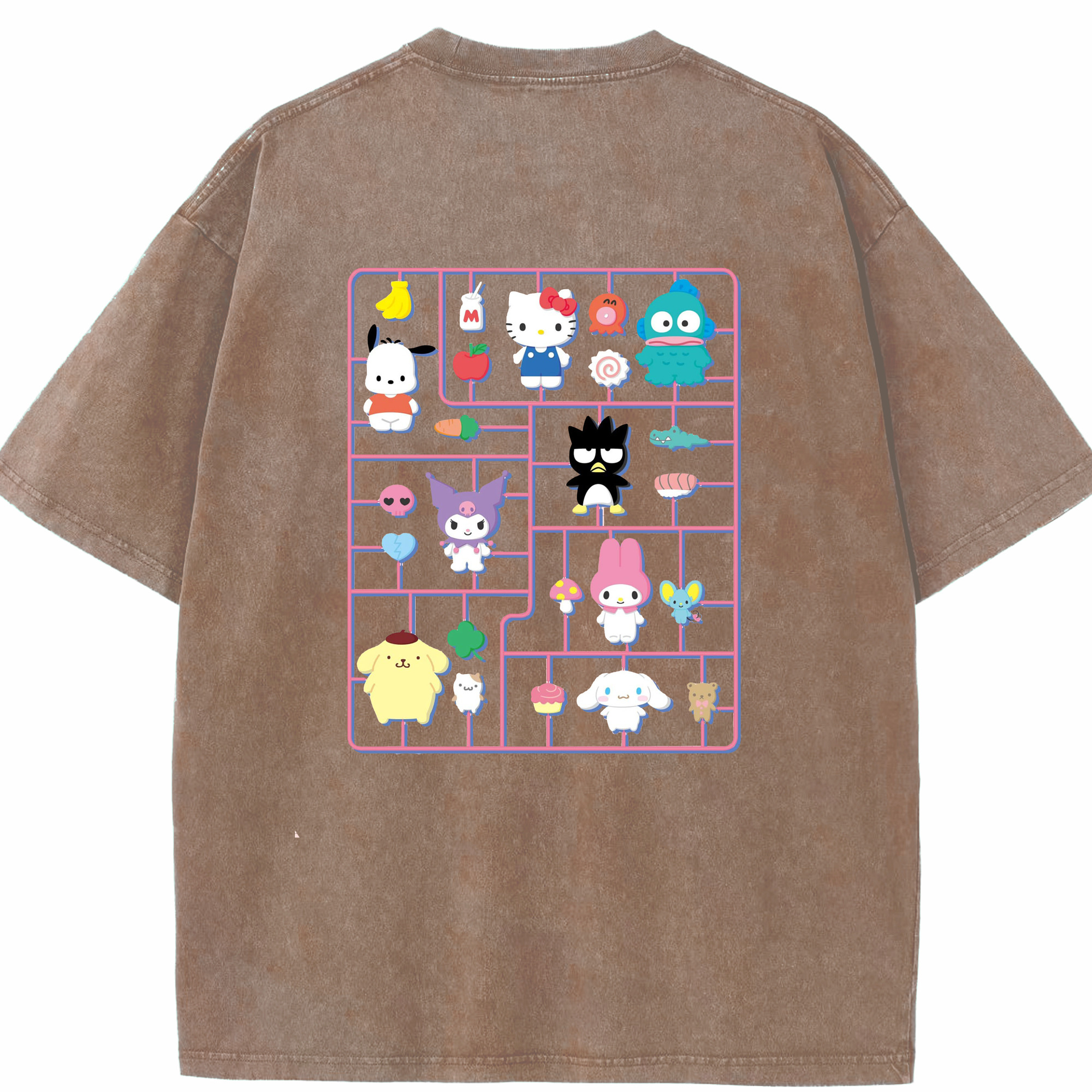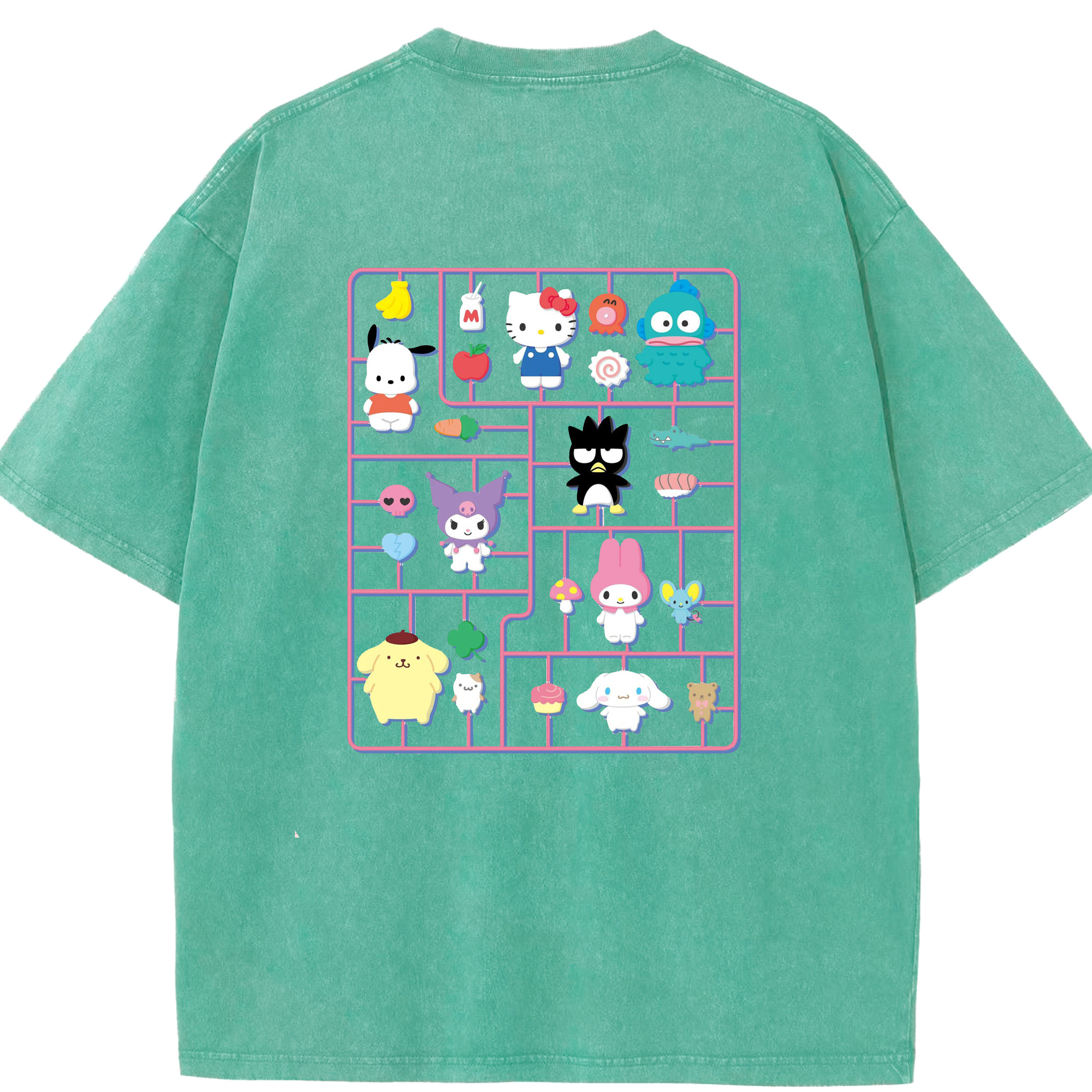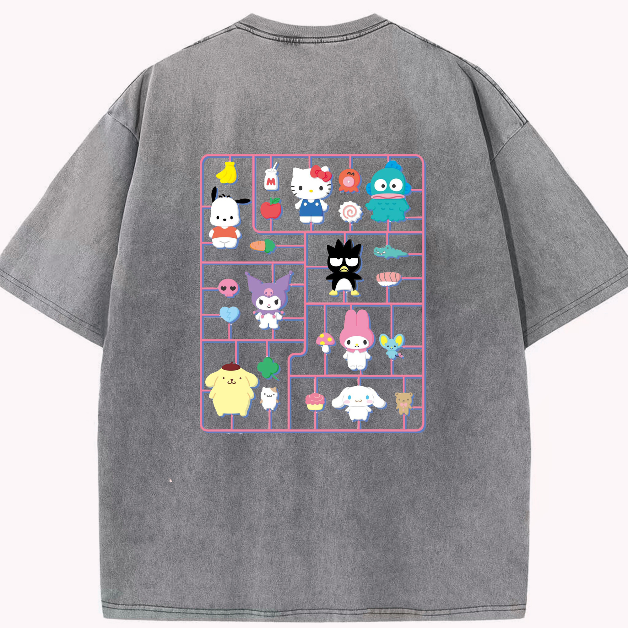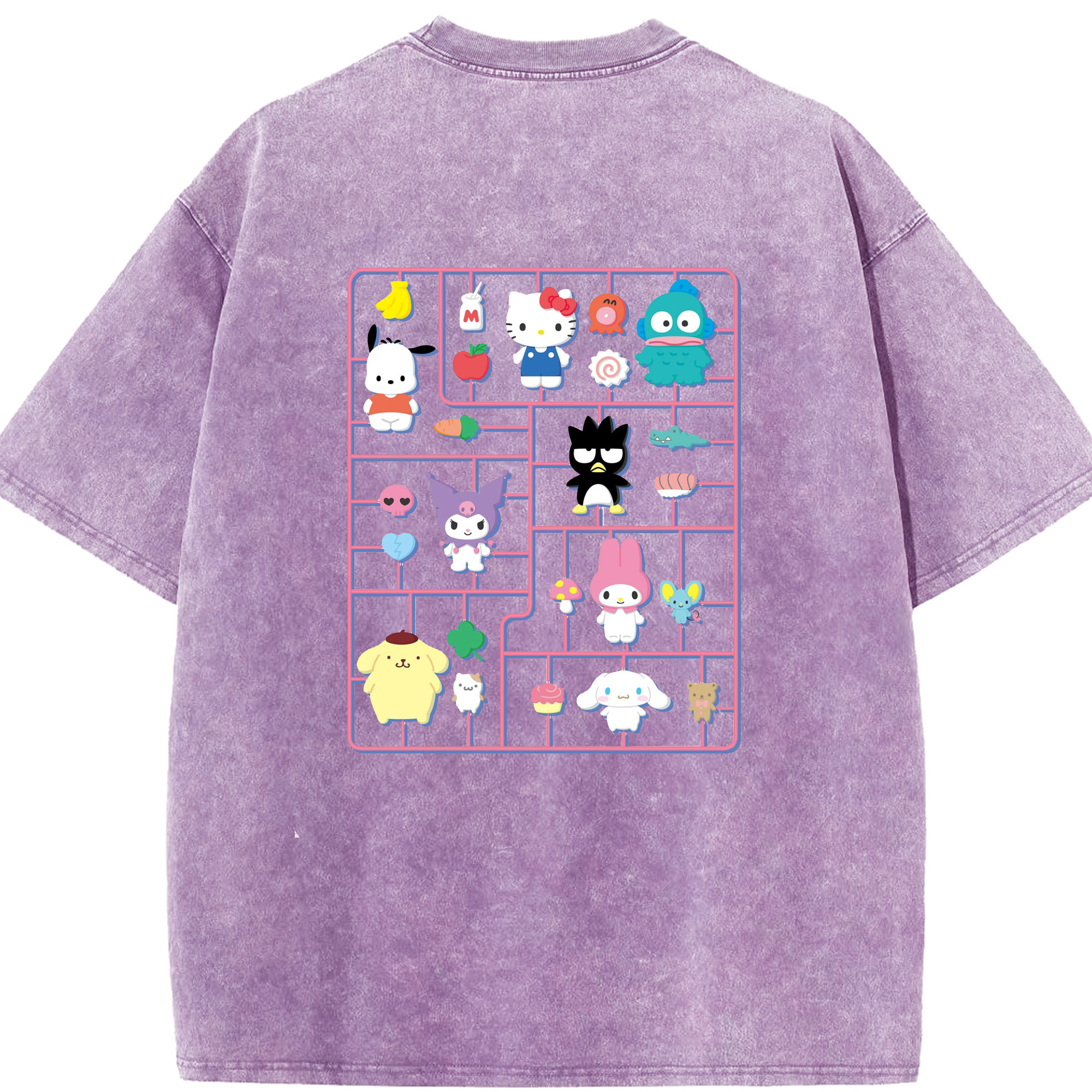 とってもかわいいサンリオファミリー - 綿100% ヴィンテージ風 半袖Tシャツ ・ 背面プリント ・ 柔らか肌触り ・ 通気性 快適 ・ スポーツ カジュアル 外出用