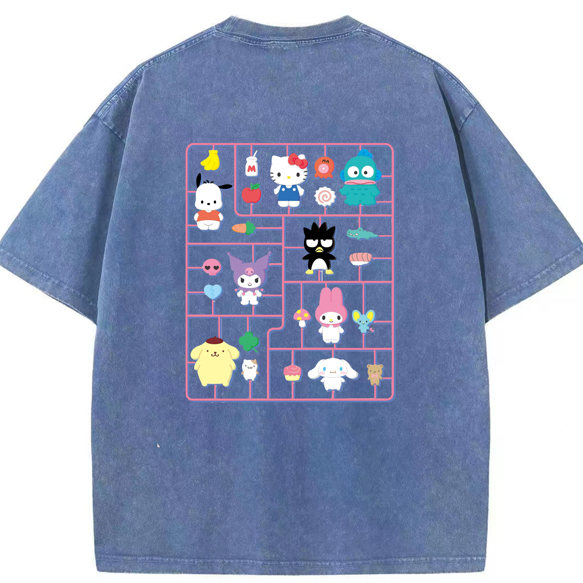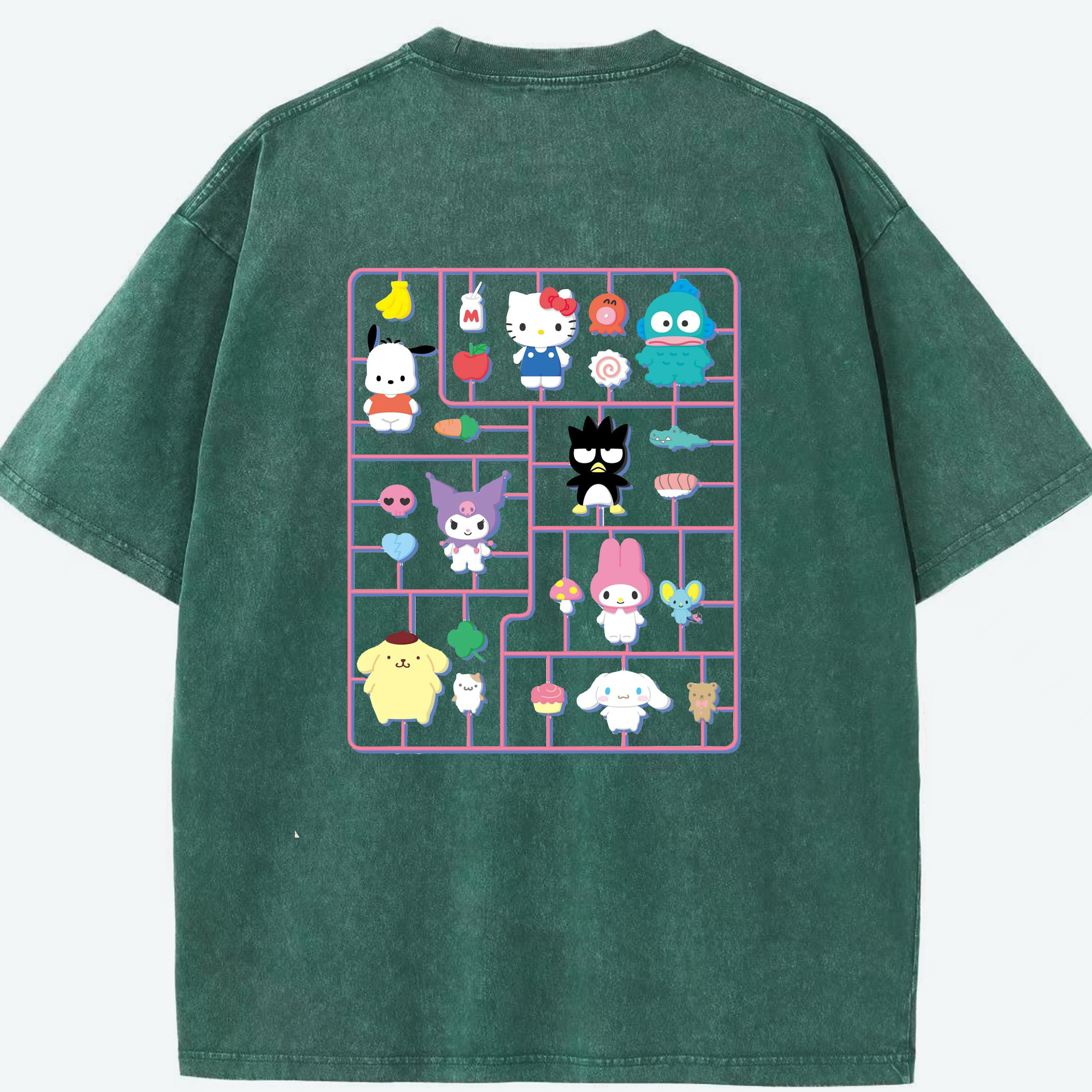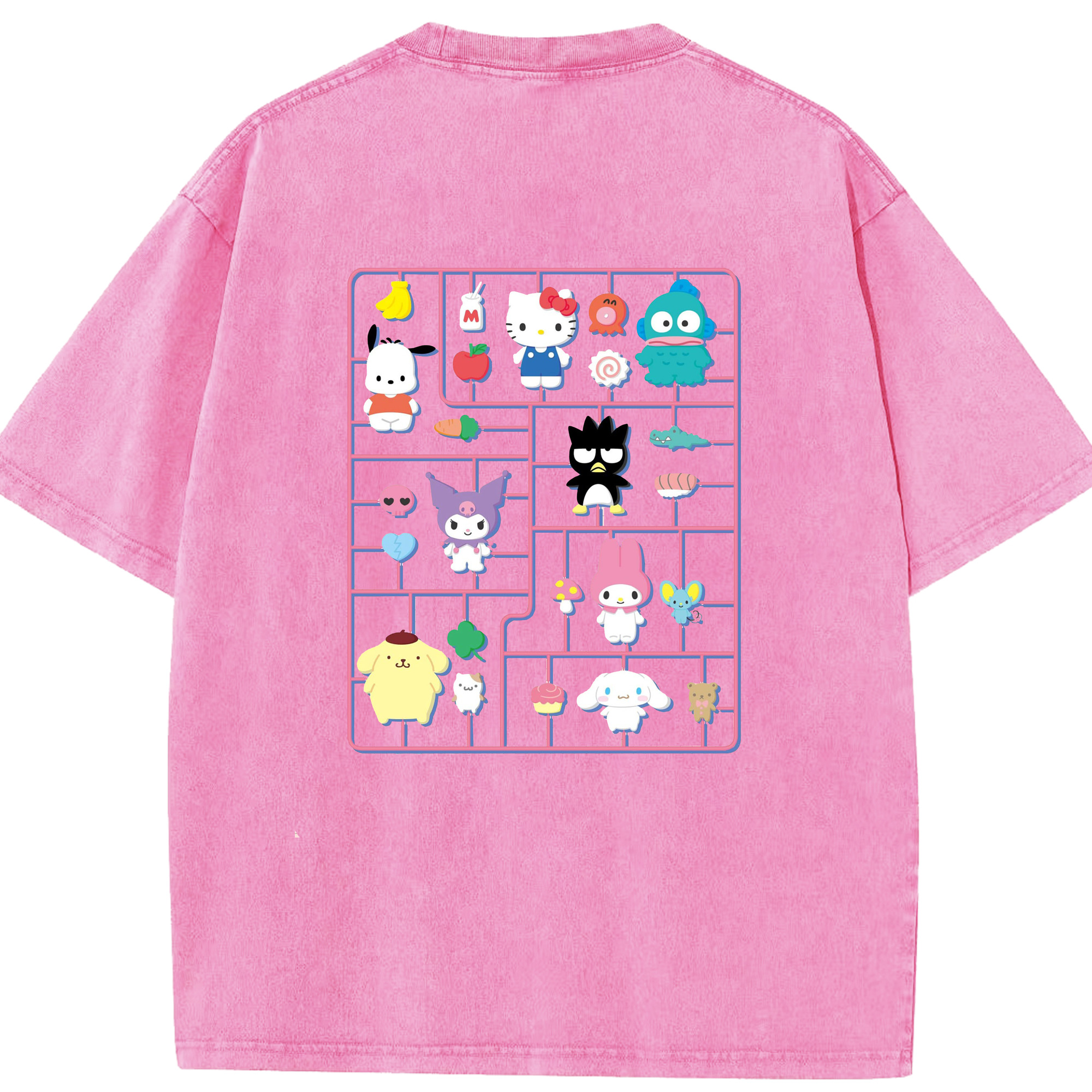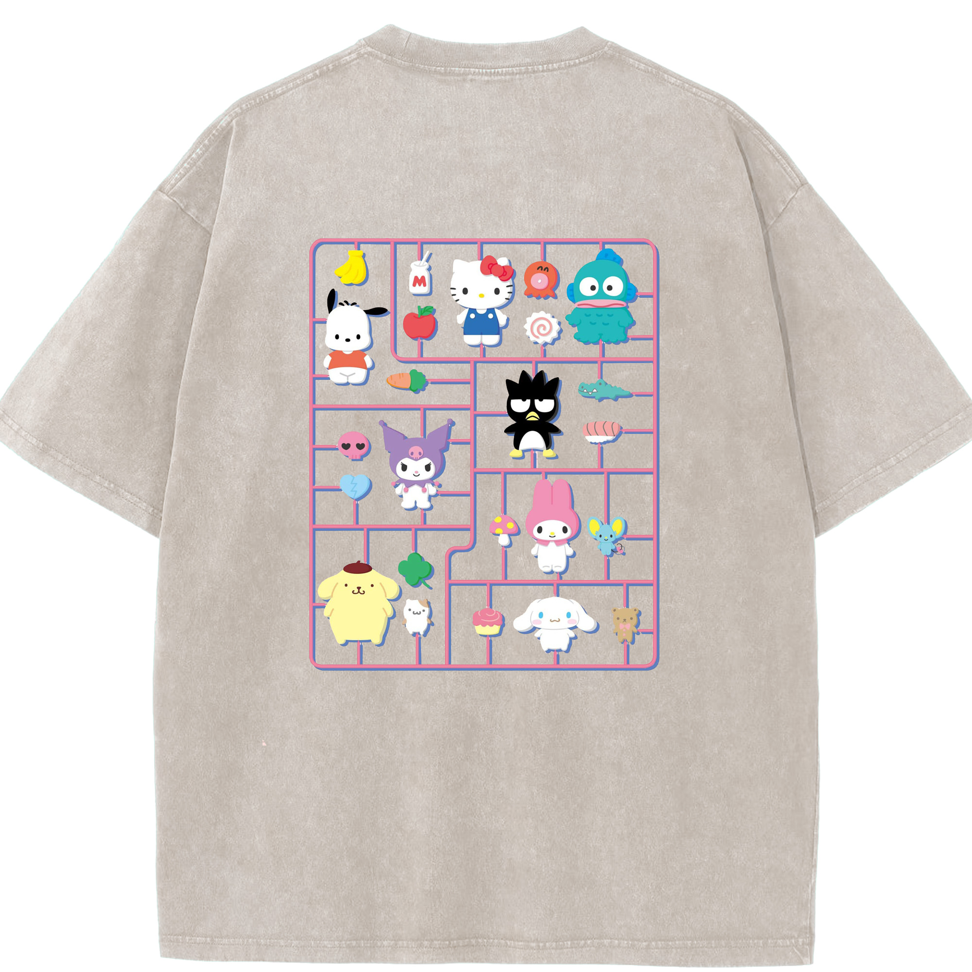 とってもかわいいサンリオファミリー - 綿100% ヴィンテージ風 半袖Tシャツ ・ 背面プリント ・ 柔らか肌触り ・ 通気性 快適 ・ スポーツ カジュアル 外出用