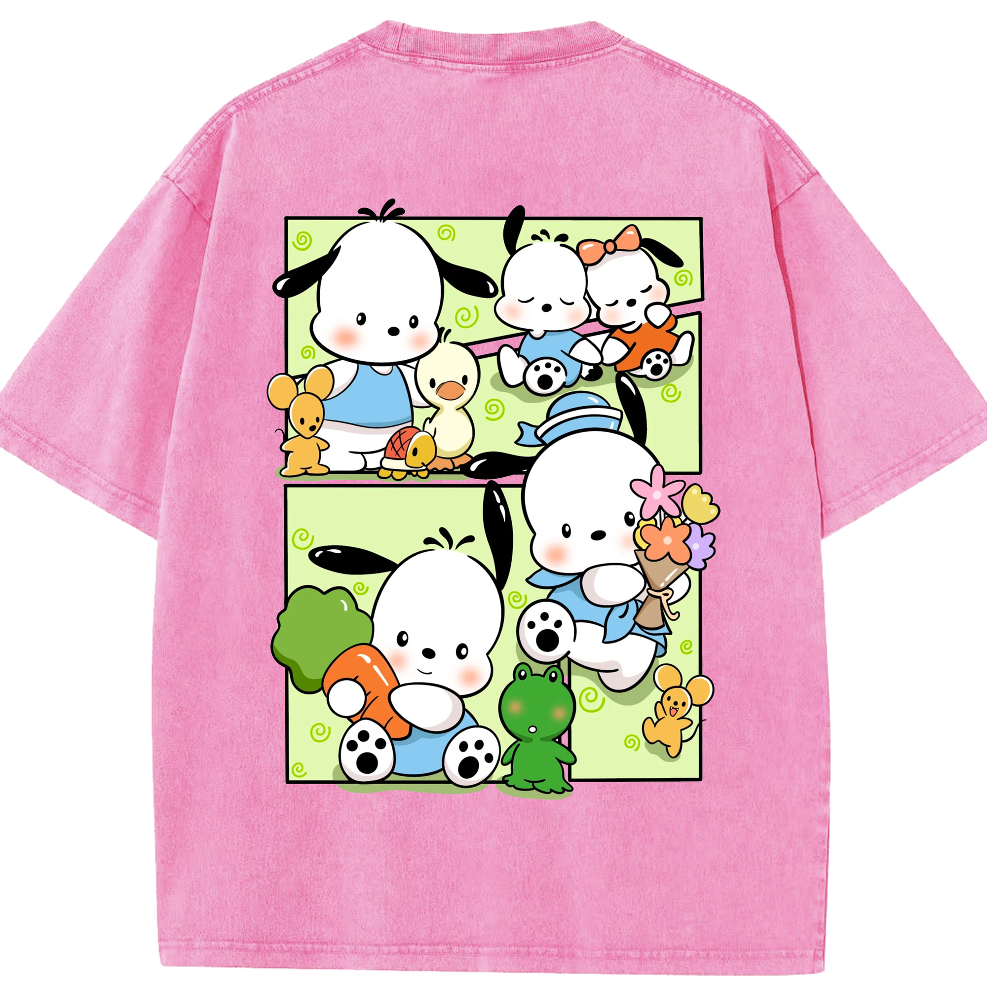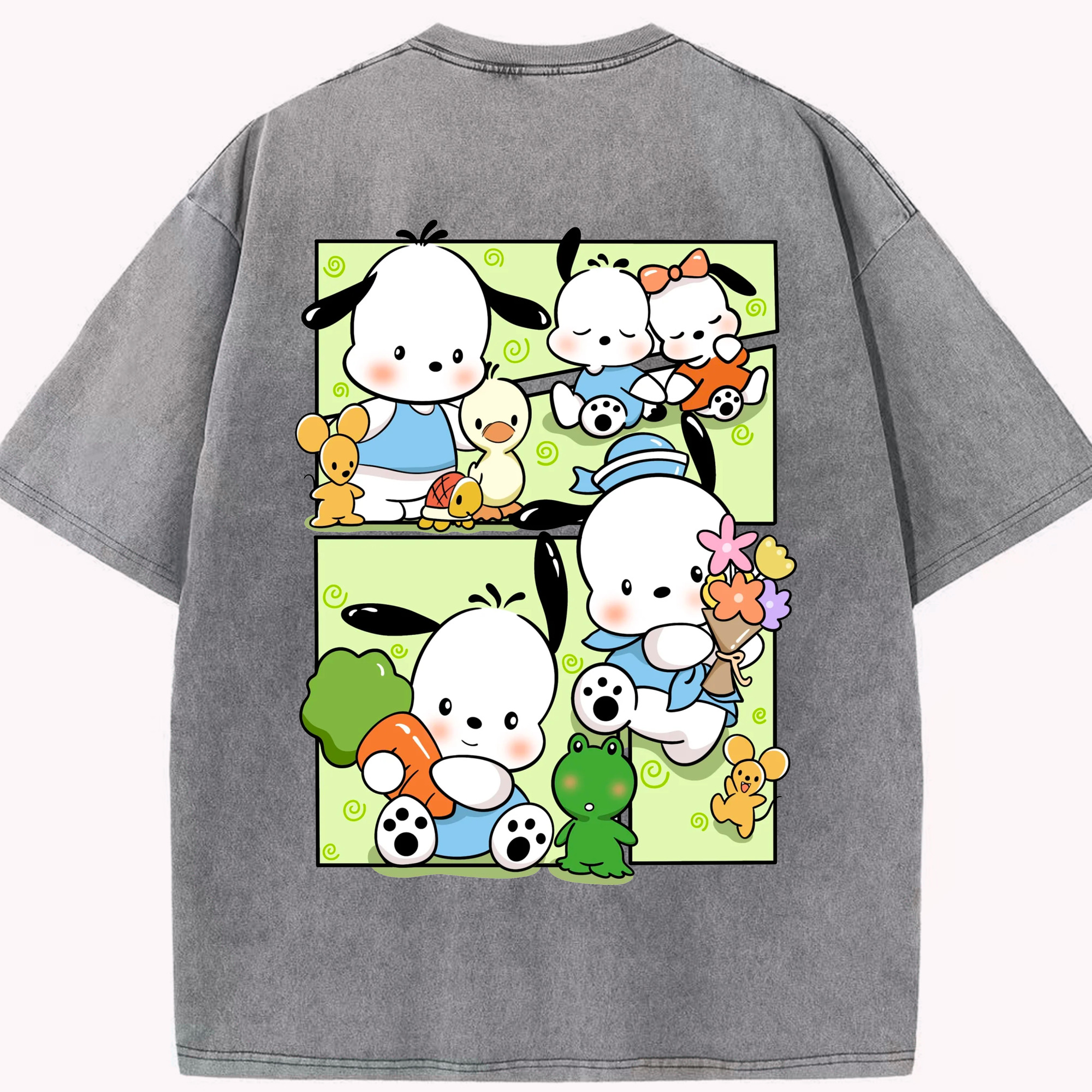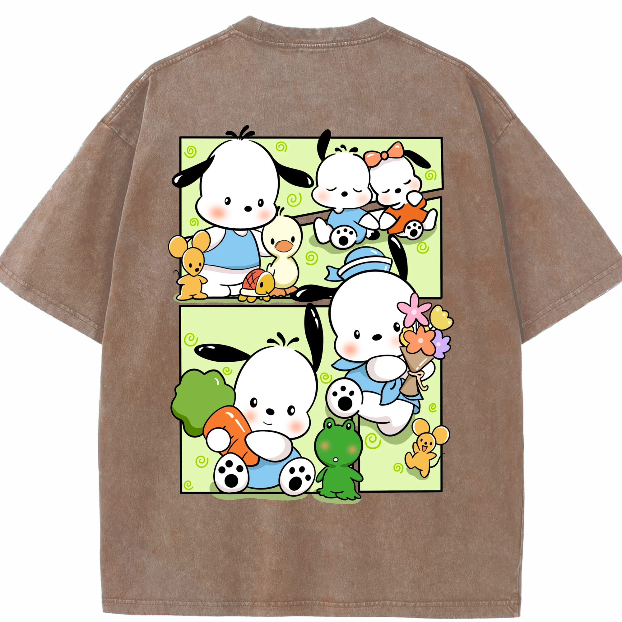 サンリオファミリー - 綿100% ヴィンテージ風 半袖Tシャツ ・ 背面プリント ・ 柔らか肌触り ・ 通気性 快適 ・ スポーツ カジュアル 外出用