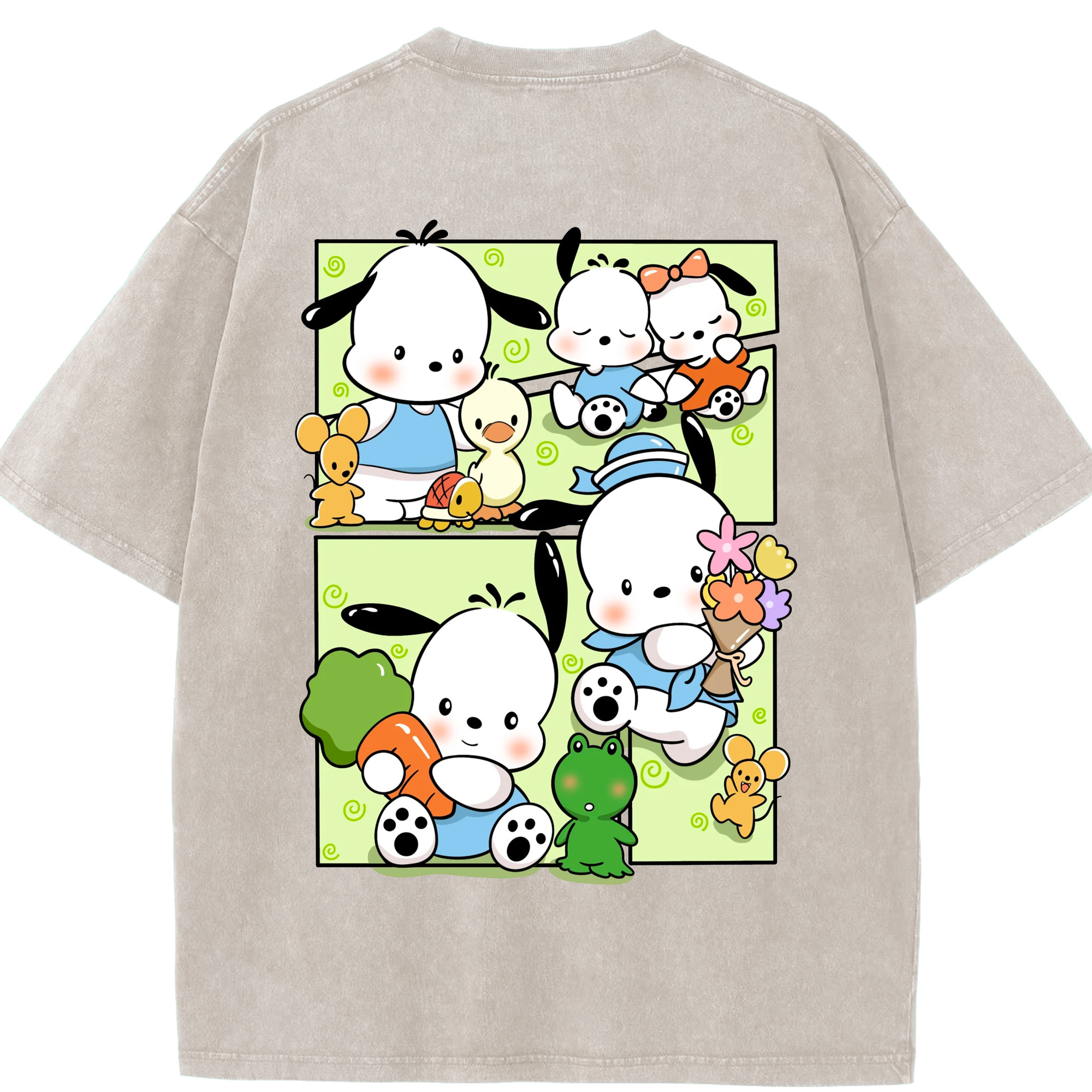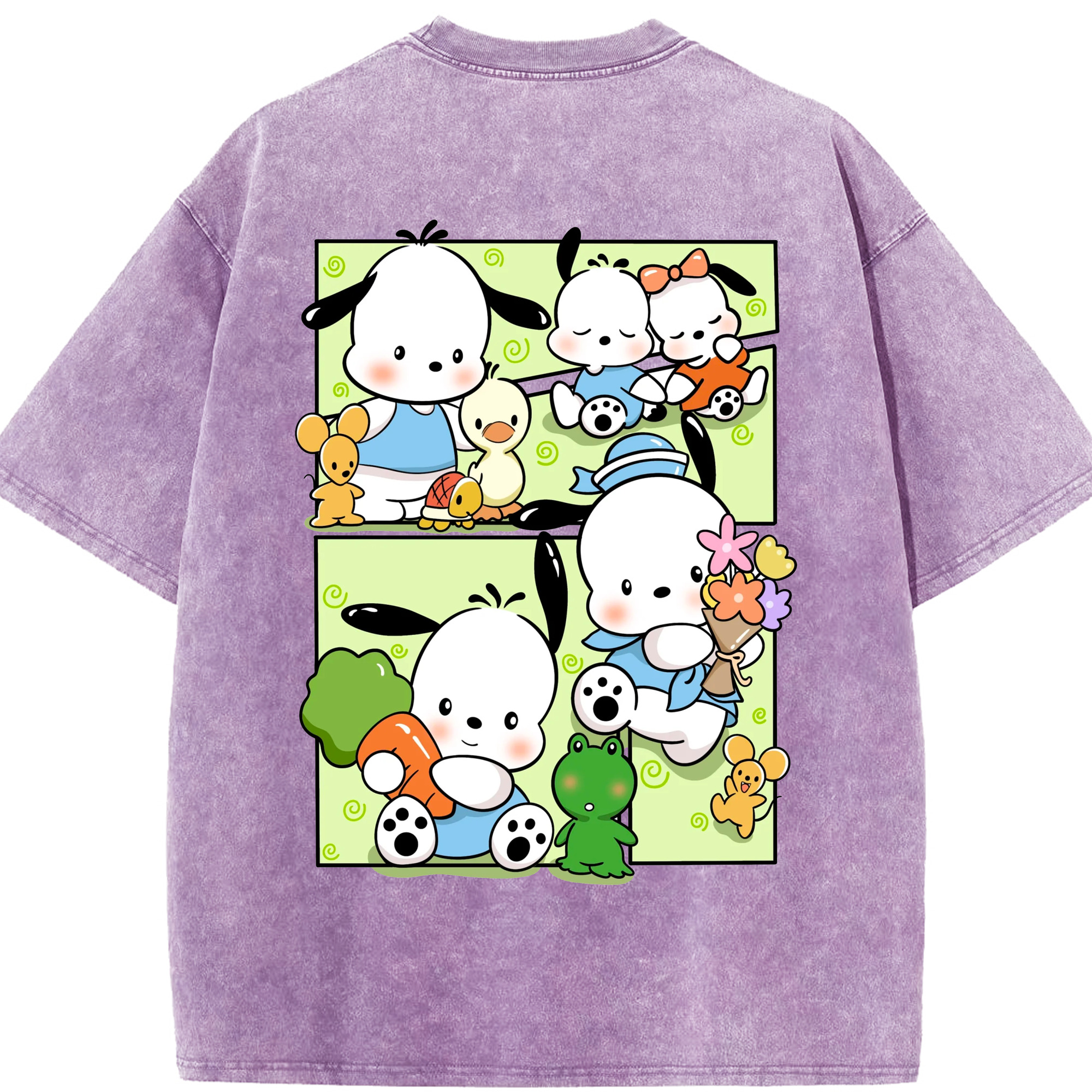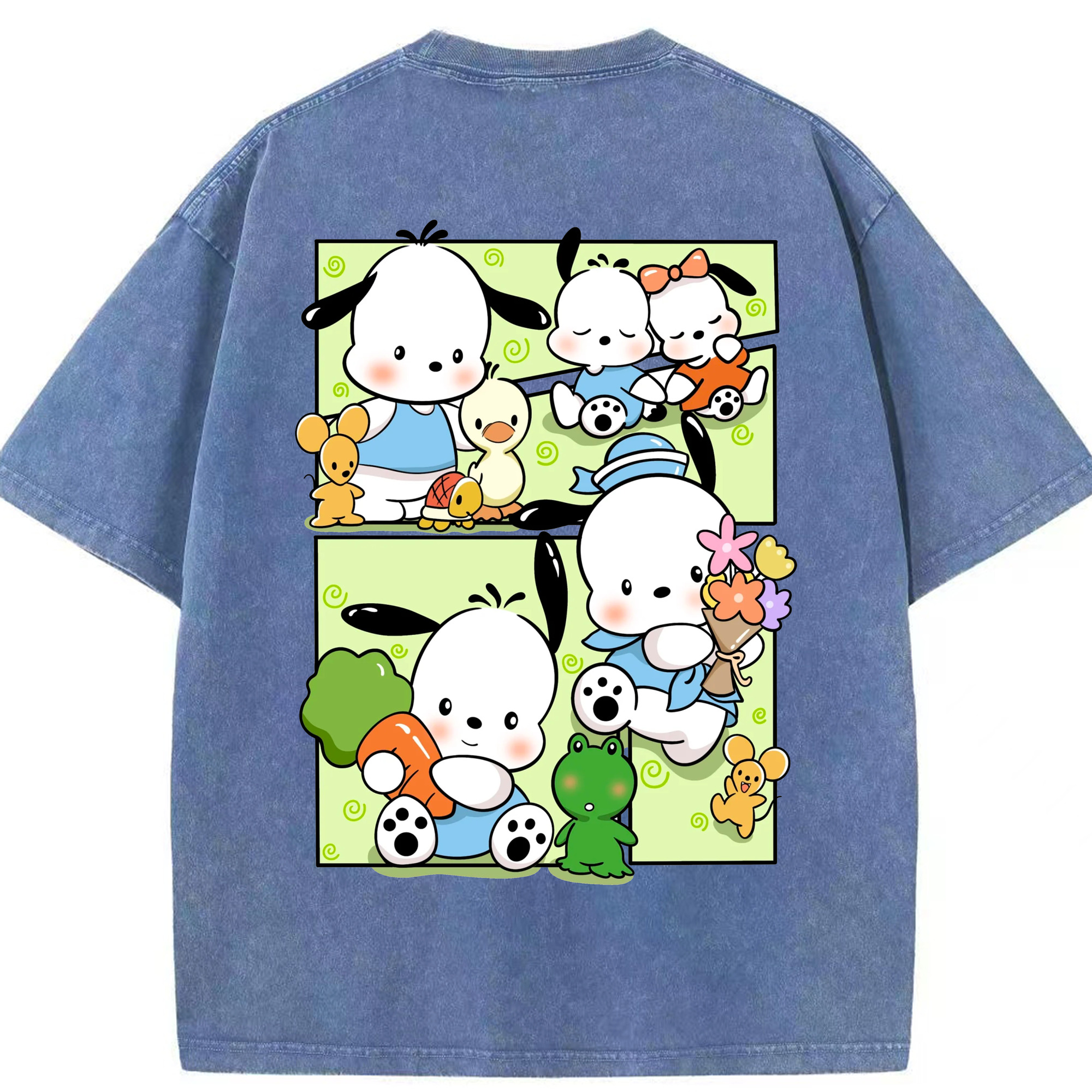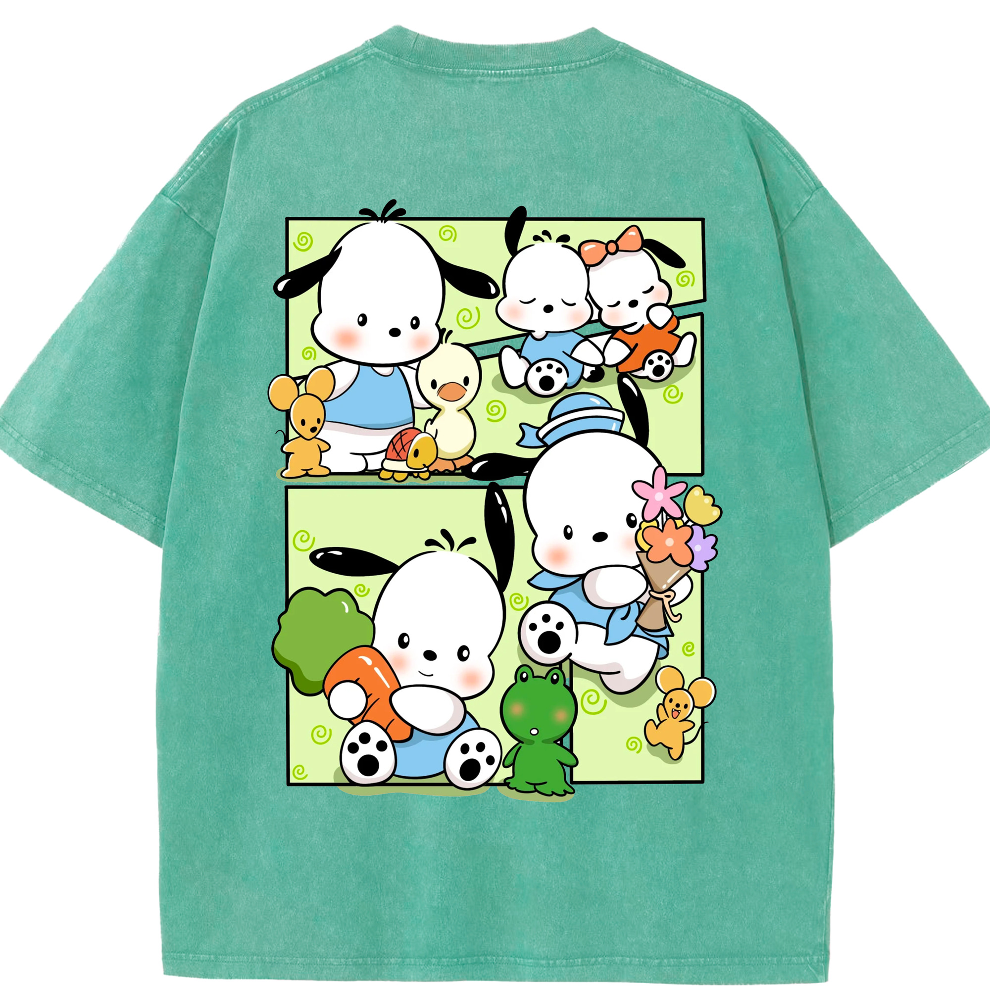 サンリオファミリー - 綿100% ヴィンテージ風 半袖Tシャツ ・ 背面プリント ・ 柔らか肌触り ・ 通気性 快適 ・ スポーツ カジュアル 外出用