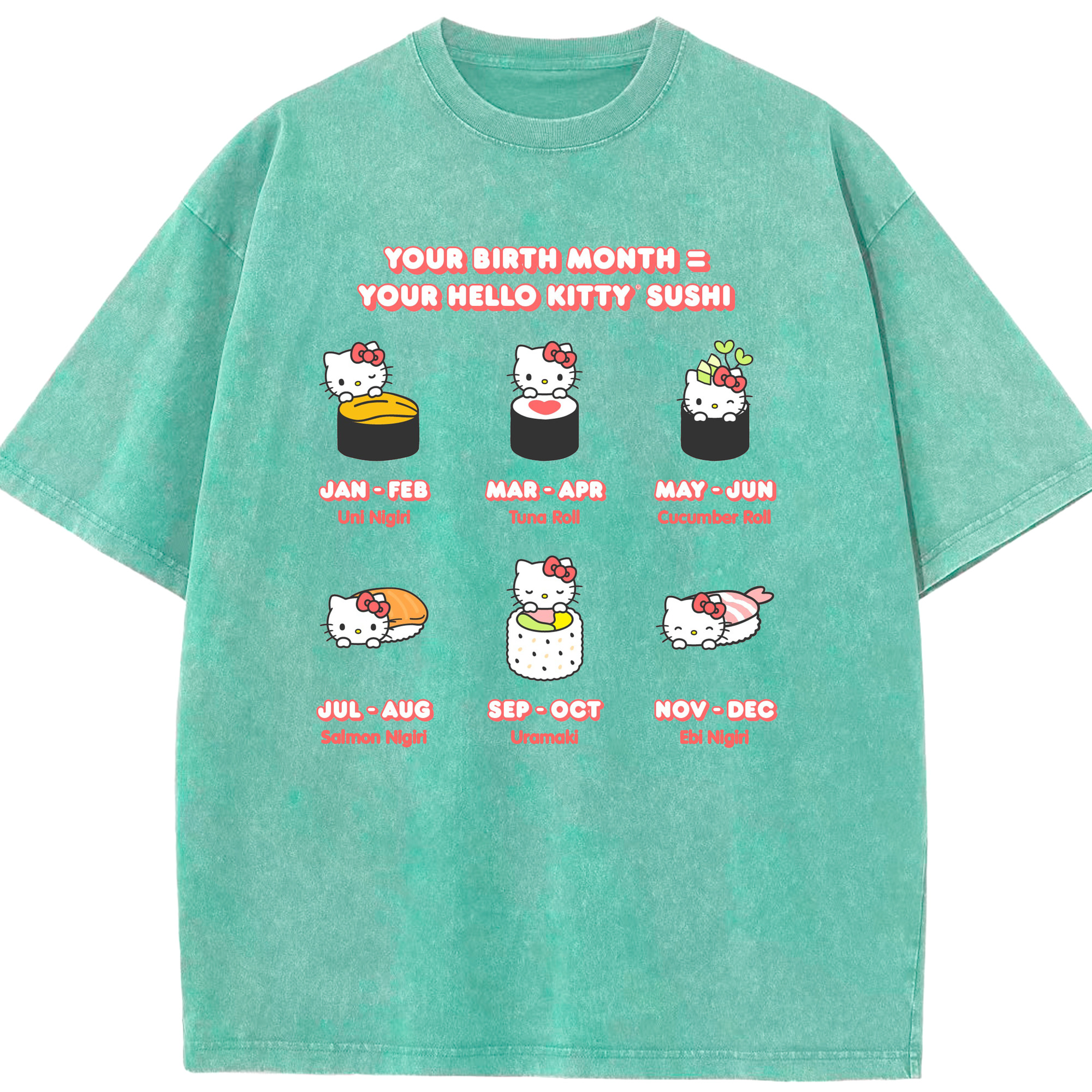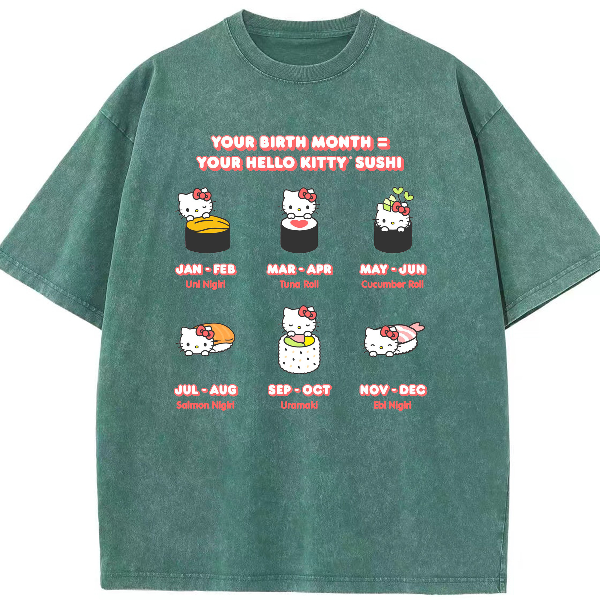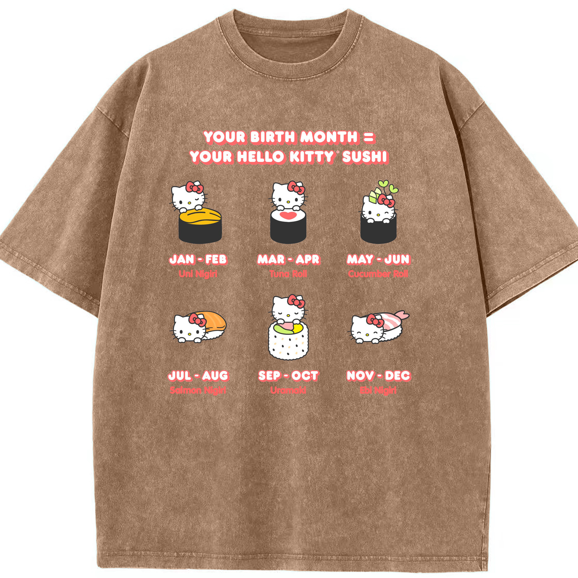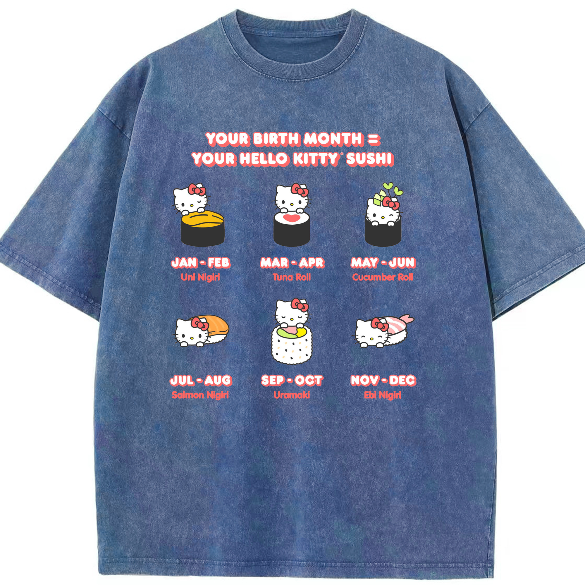 お寿司になったハローキティ - 綿100% ヴィンテージ風 半袖Tシャツ ・ 背面プリント ・ 柔らか肌触り ・ 通気性 快適 ・ スポーツ カジュアル 外出用