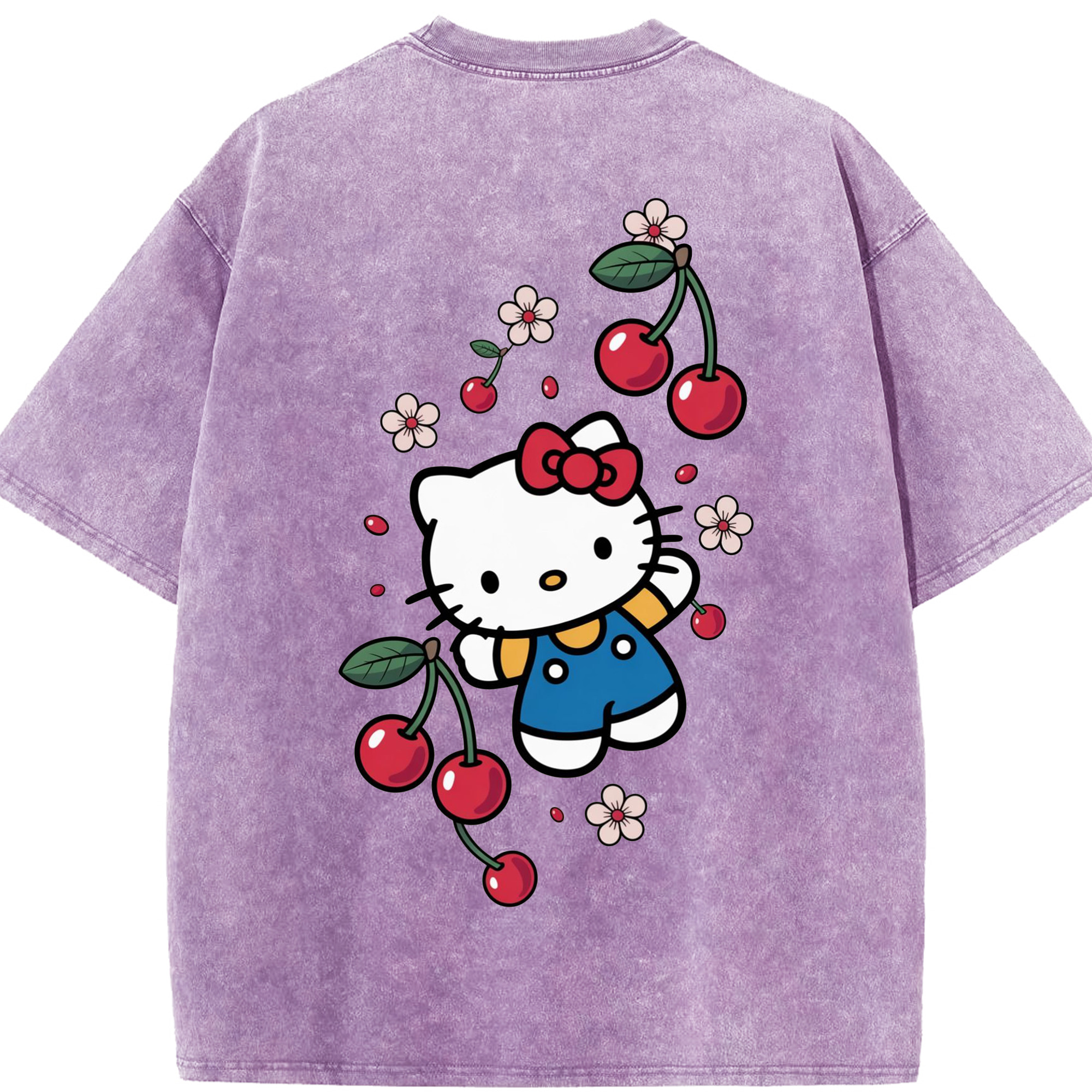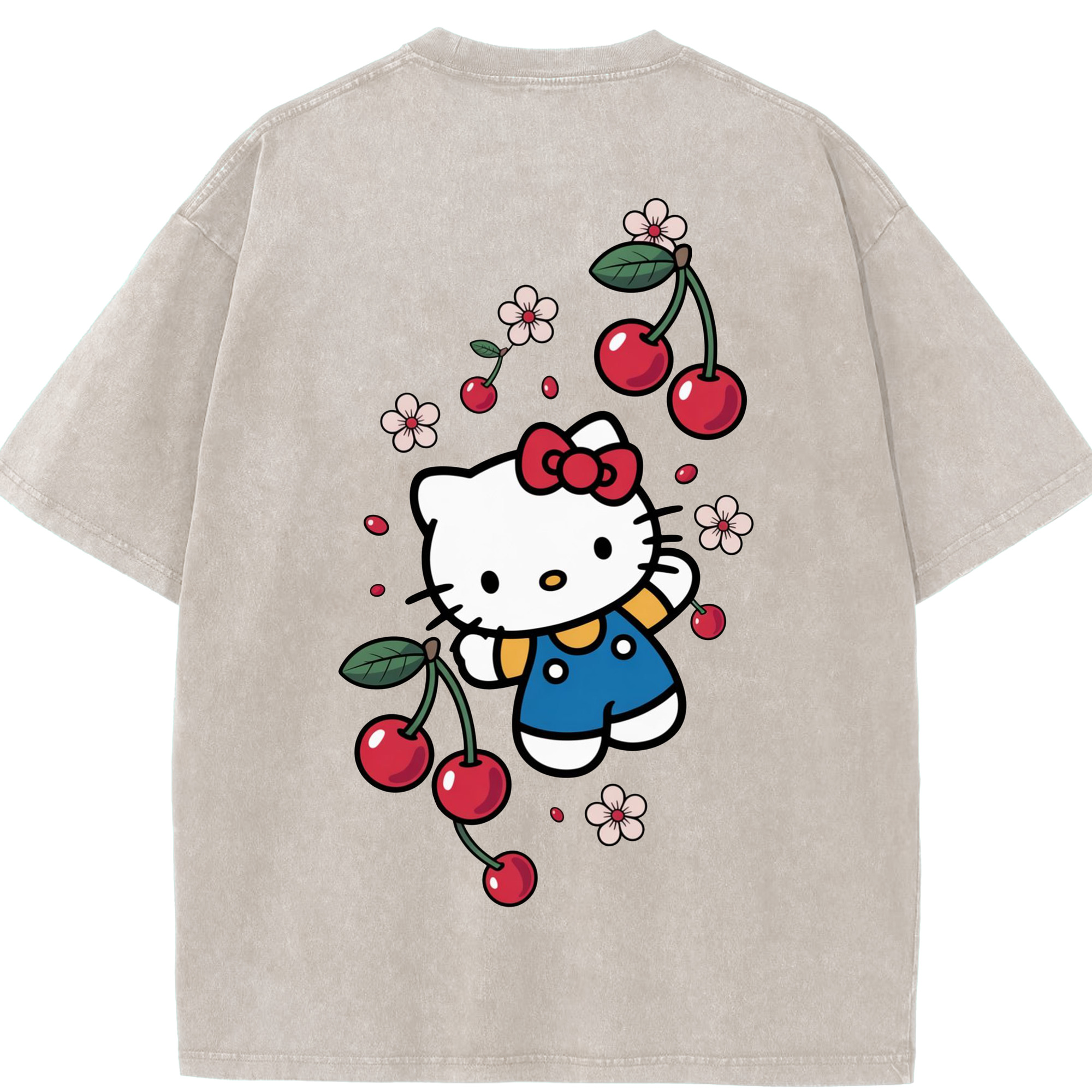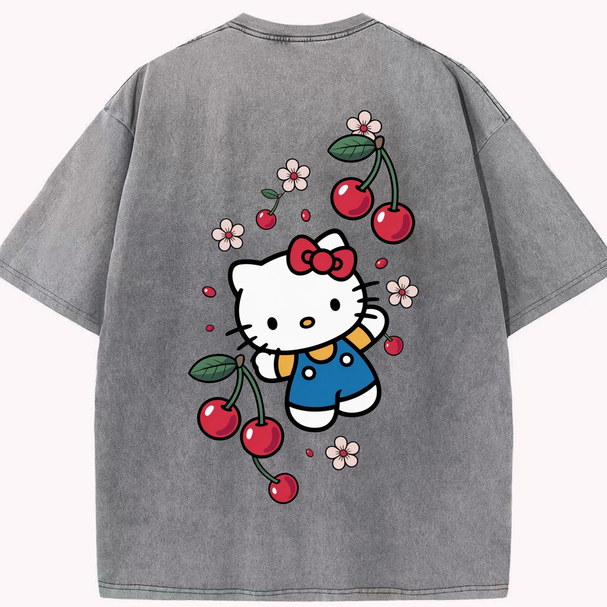 さくらんぼモチーフのハローキティ - 綿100% ヴィンテージ風 半袖Tシャツ ・ フロントプリント ・ 柔らか肌触り ・ 通気性 快適 ・ スポーツ カジュアル 外出用