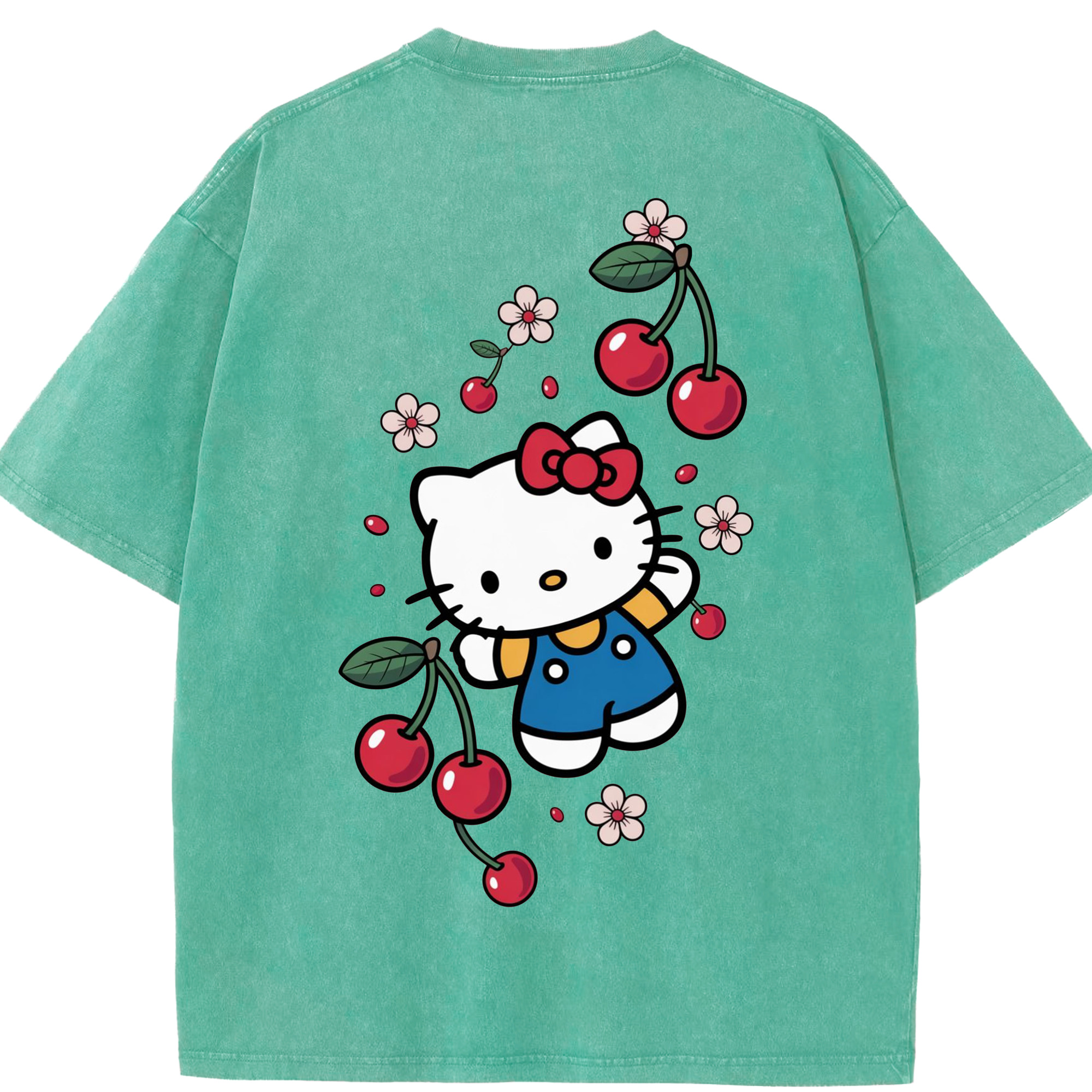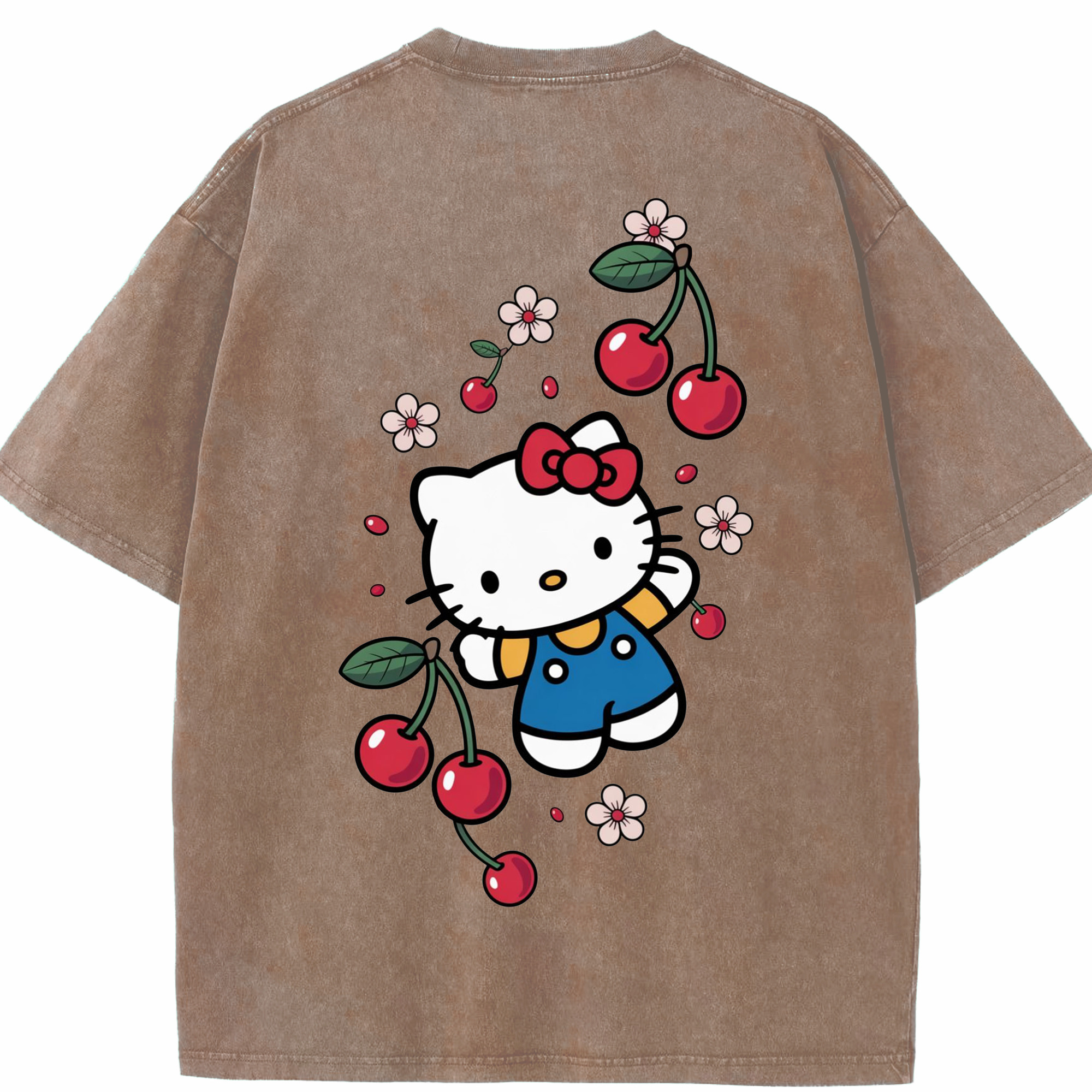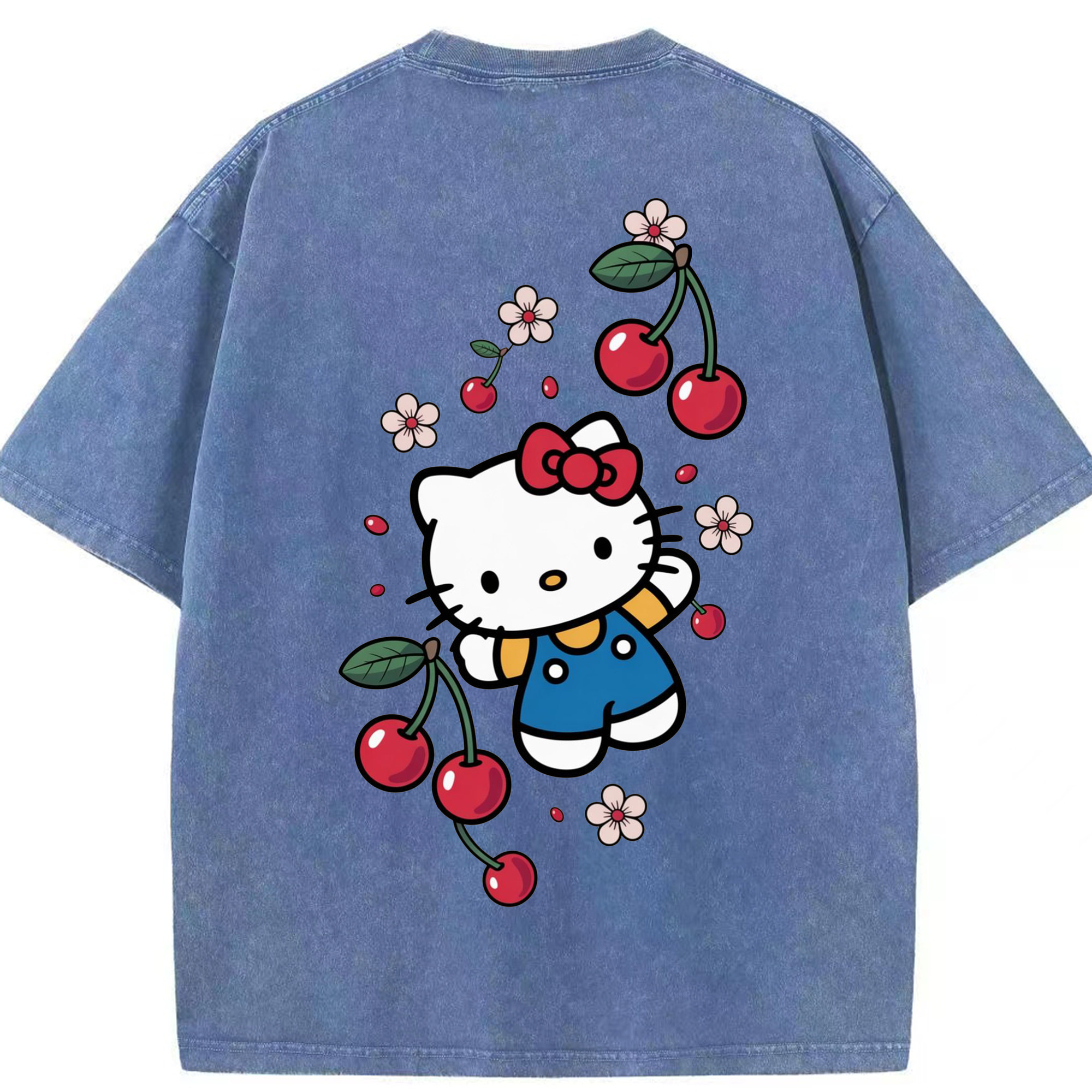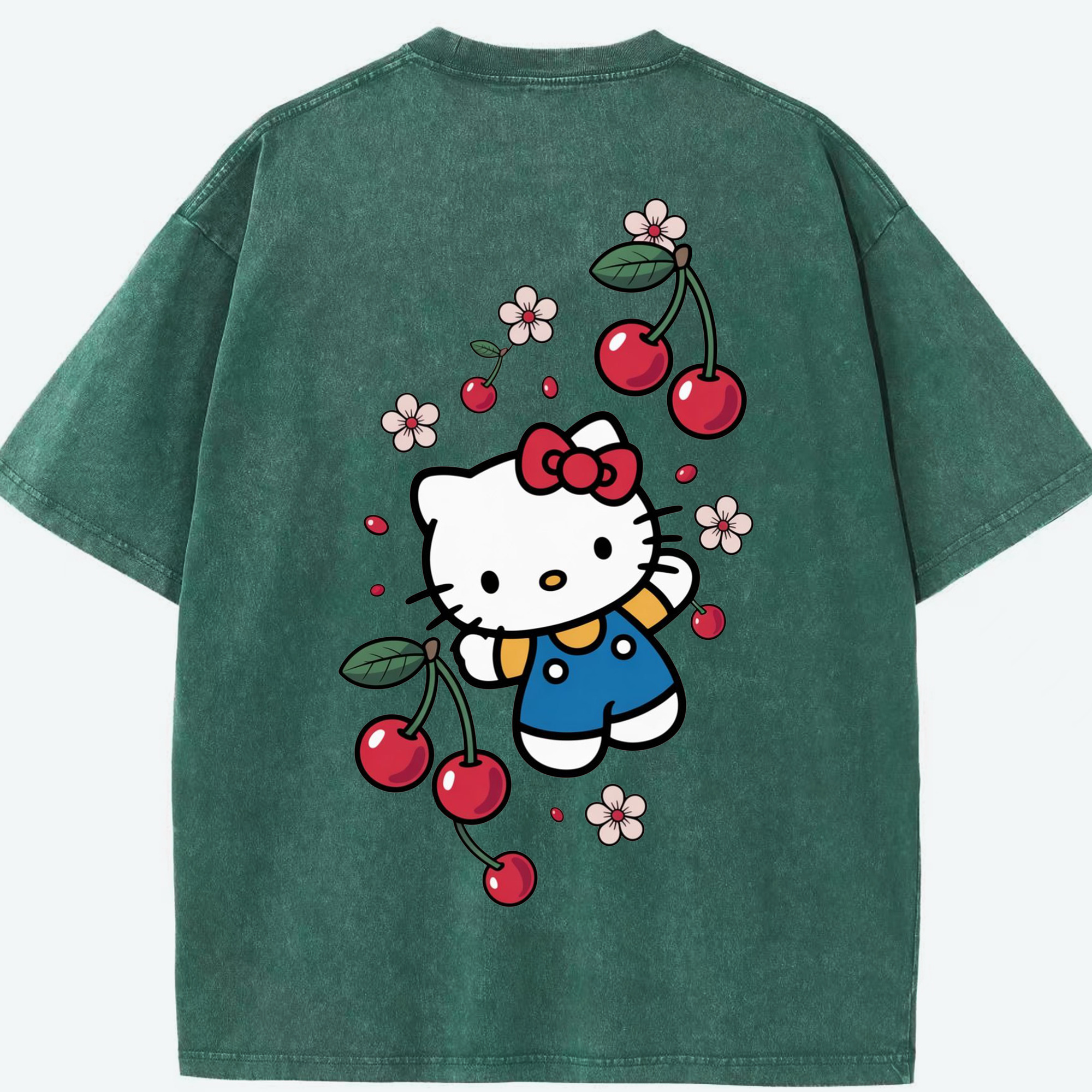 さくらんぼモチーフのハローキティ - 綿100% ヴィンテージ風 半袖Tシャツ ・ フロントプリント ・ 柔らか肌触り ・ 通気性 快適 ・ スポーツ カジュアル 外出用