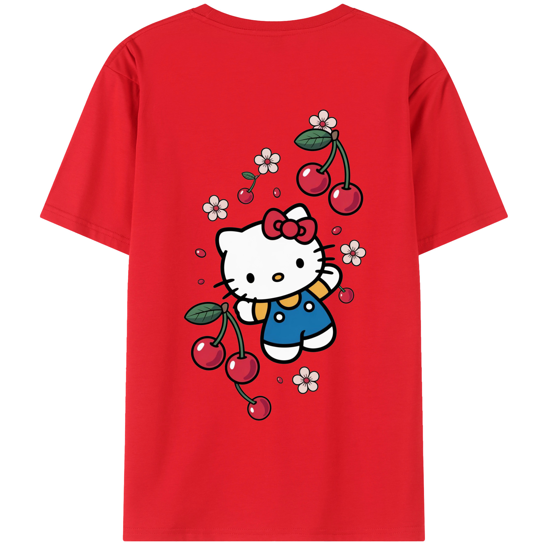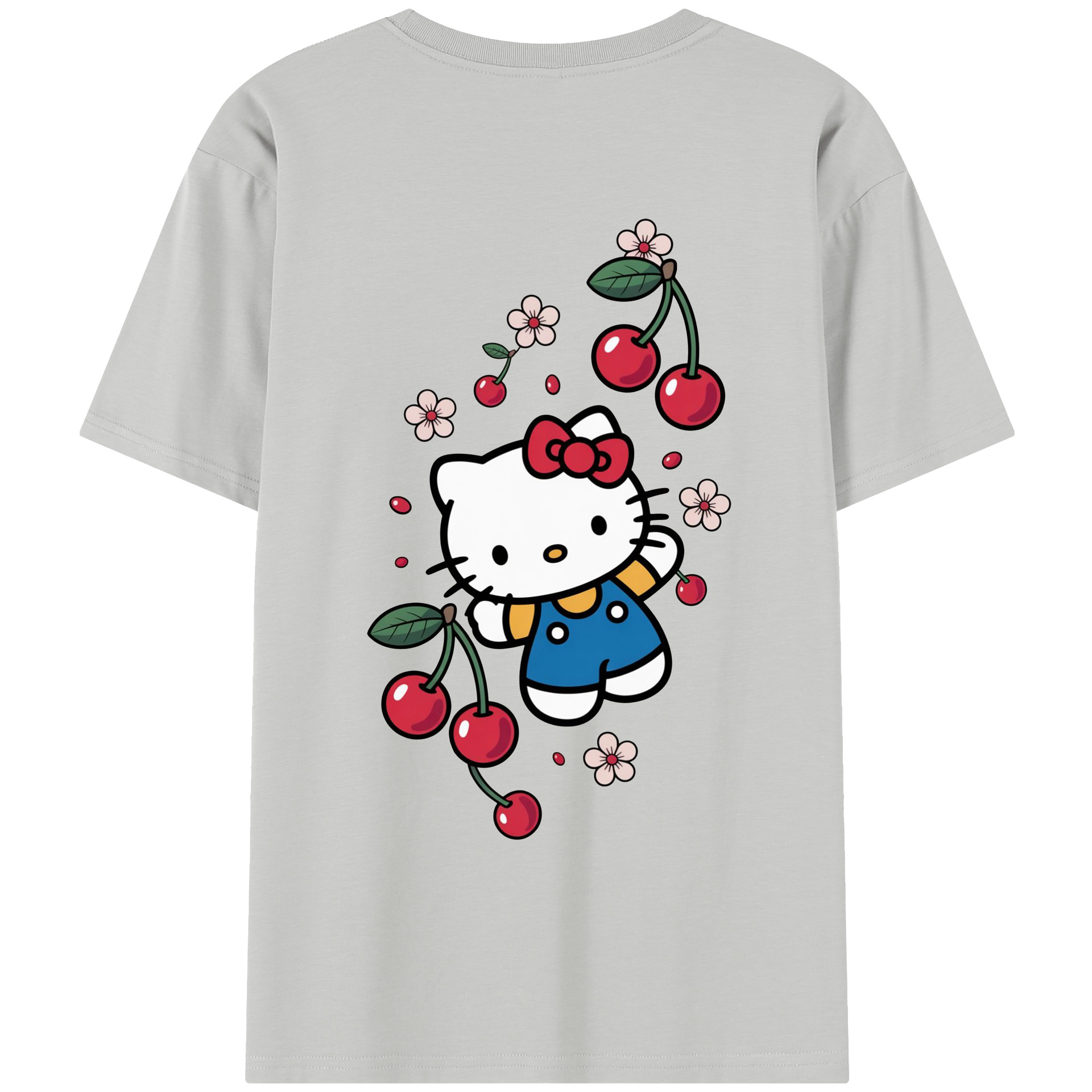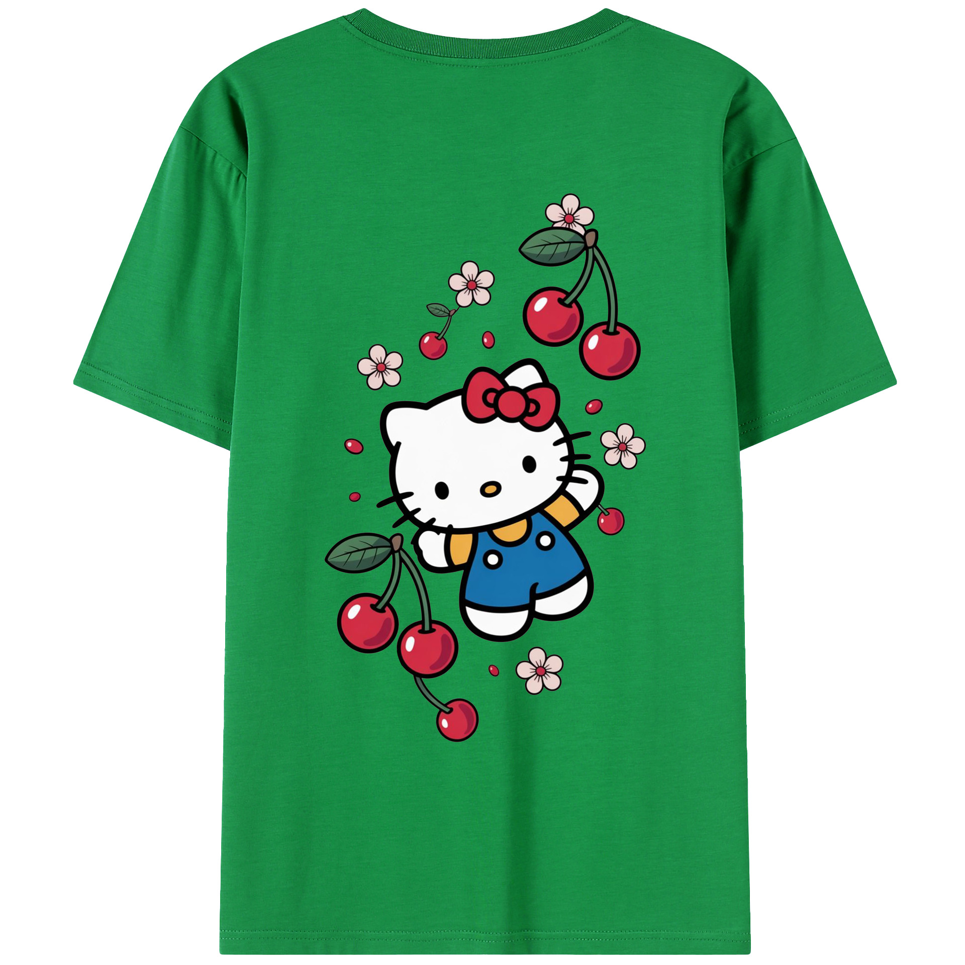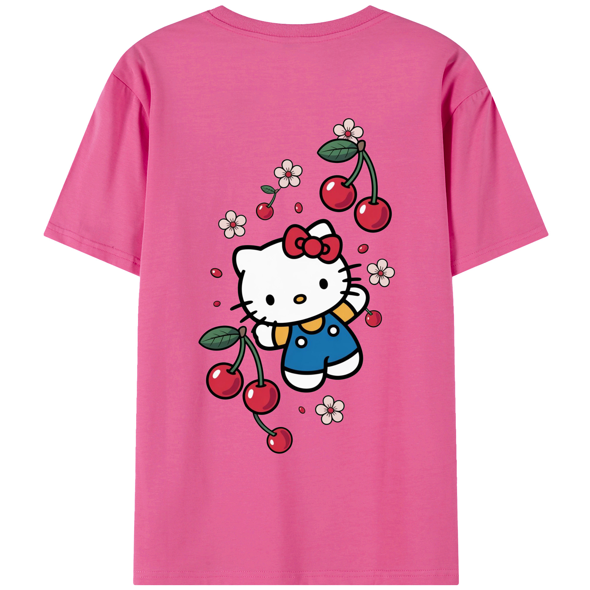 さくらんぼモチーフのハローキティ - 綿100% ヴィンテージ風 半袖Tシャツ ・ 背面プリント ・ 柔らか肌触り ・ 通気性 快適 ・ スポーツ カジュアル 外出用