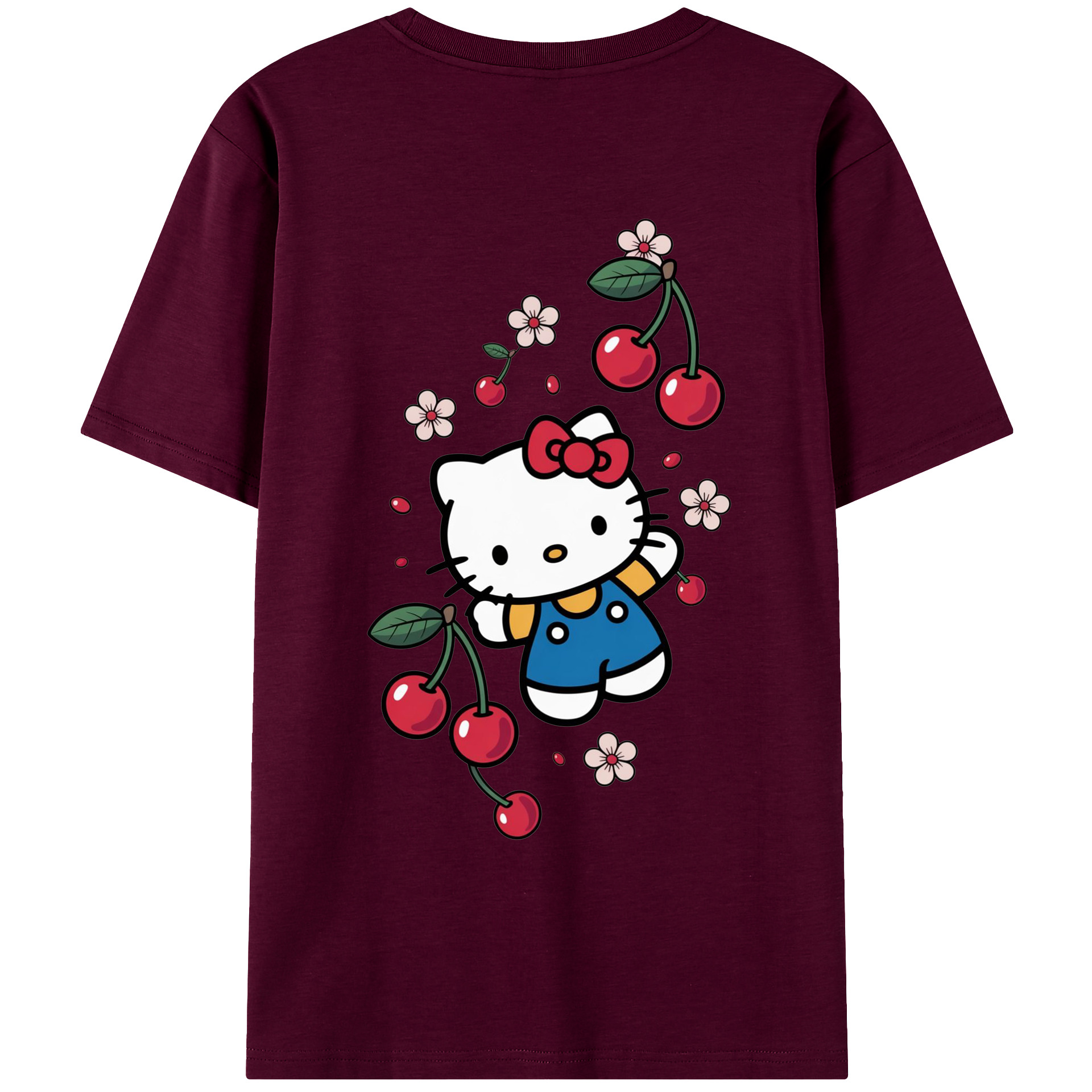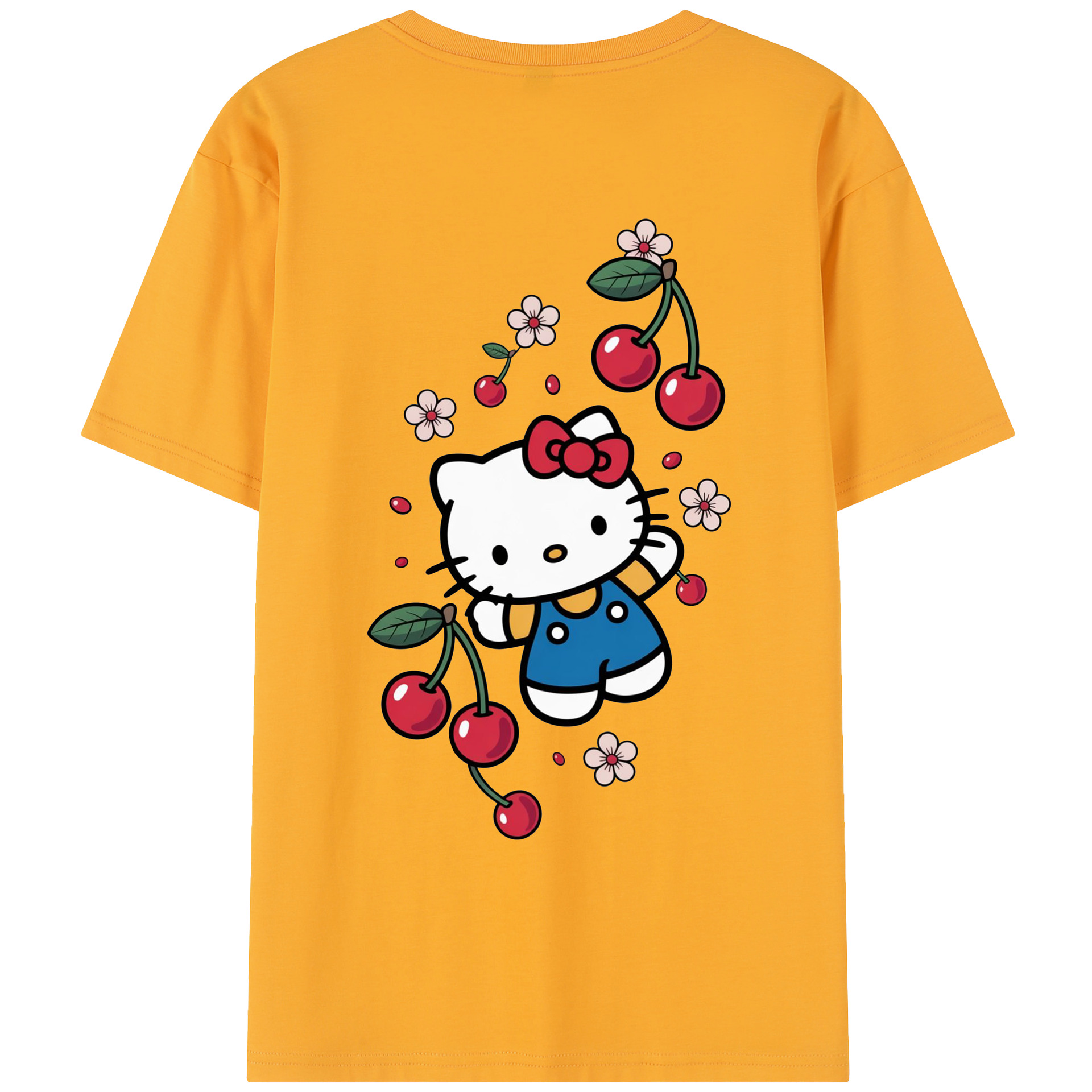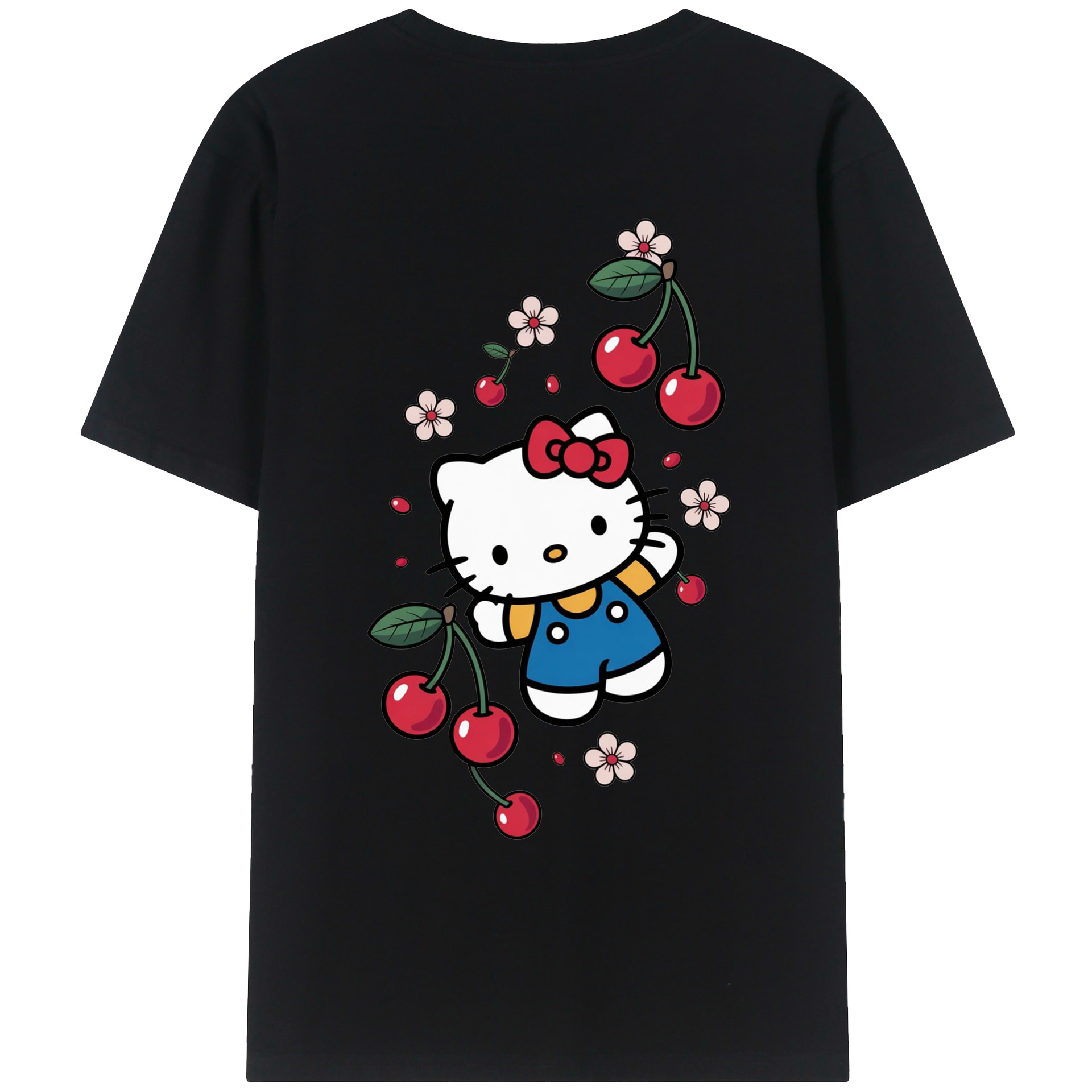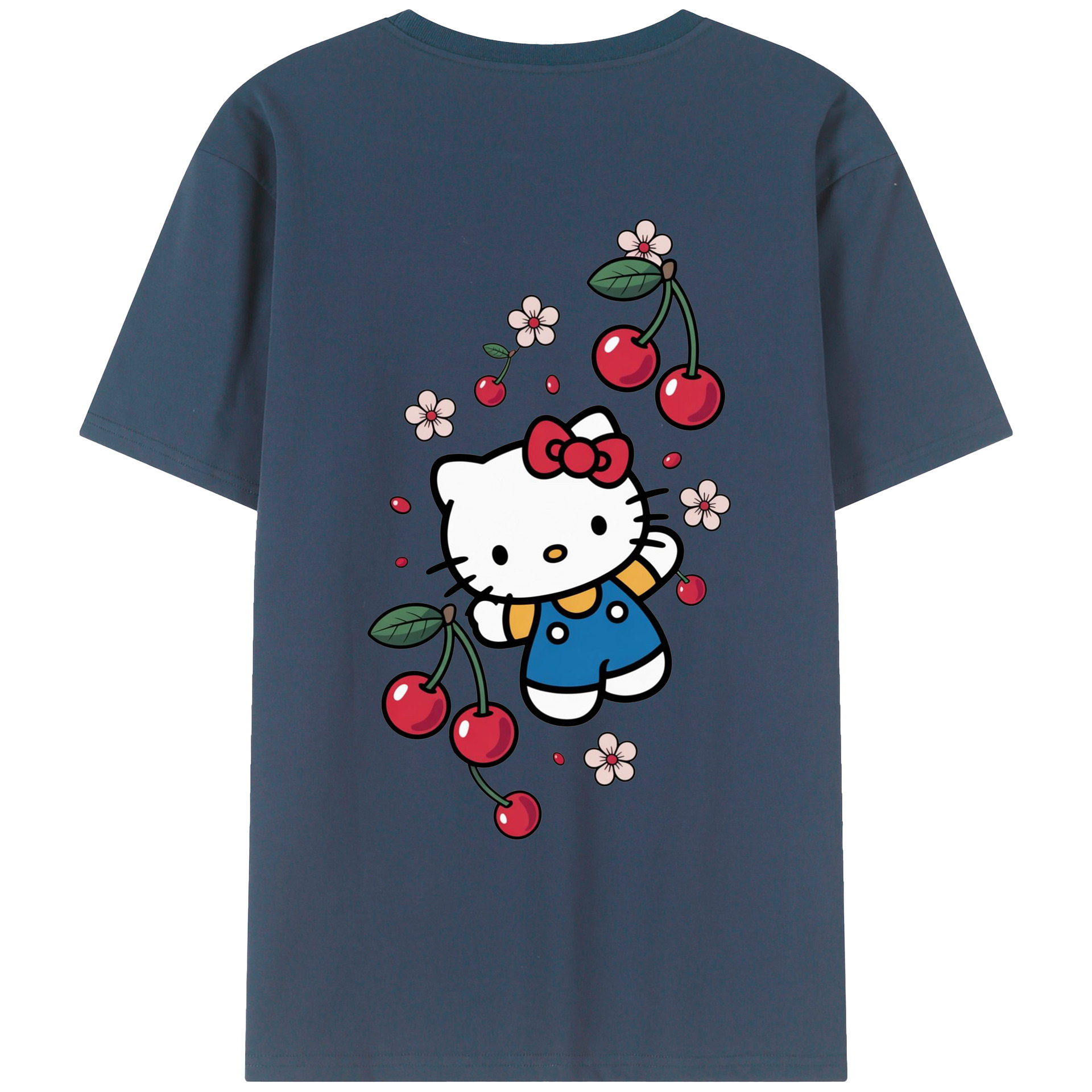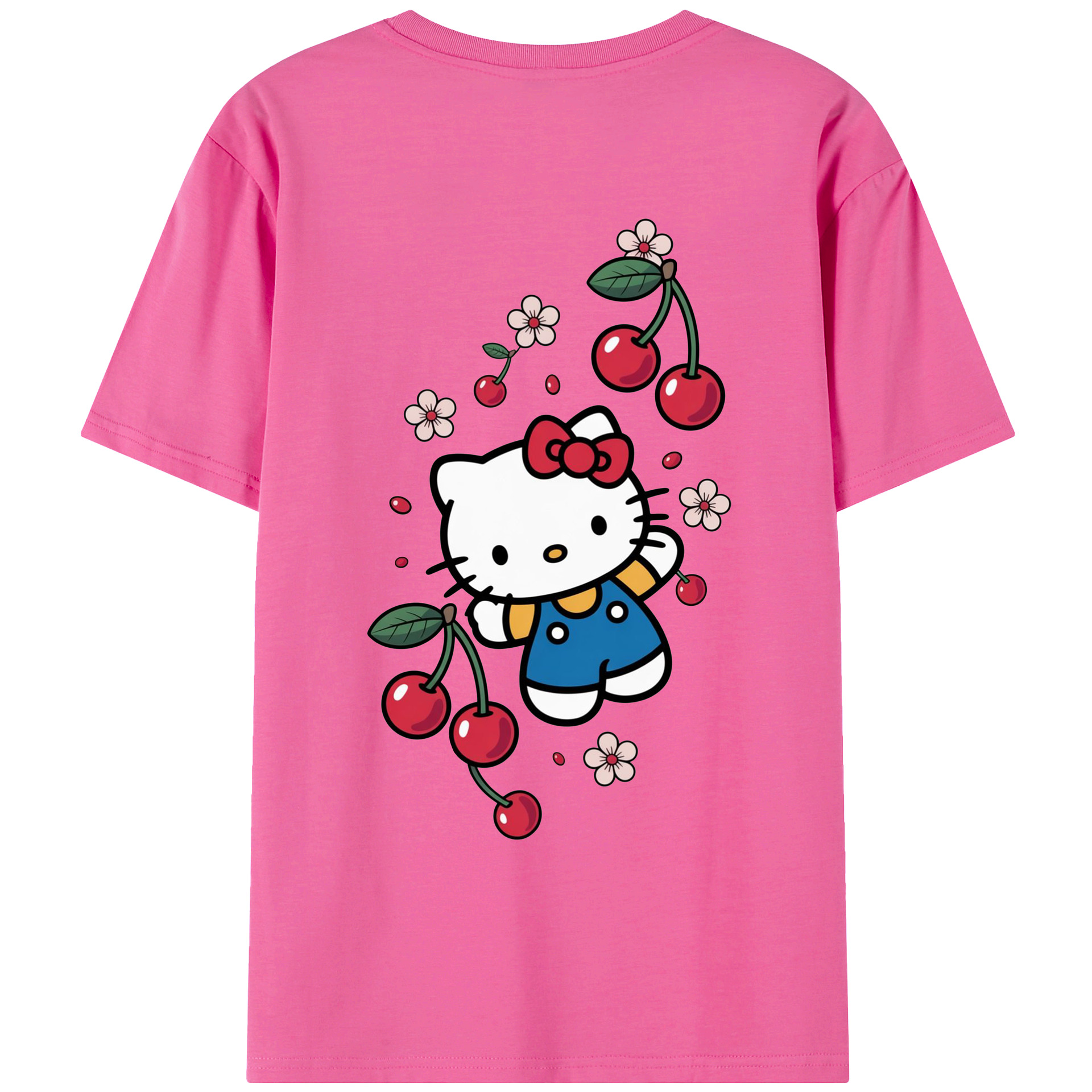 さくらんぼモチーフのハローキティ - 綿100% ヴィンテージ風 半袖Tシャツ ・ 背面プリント ・ 柔らか肌触り ・ 通気性 快適 ・ スポーツ カジュアル 外出用