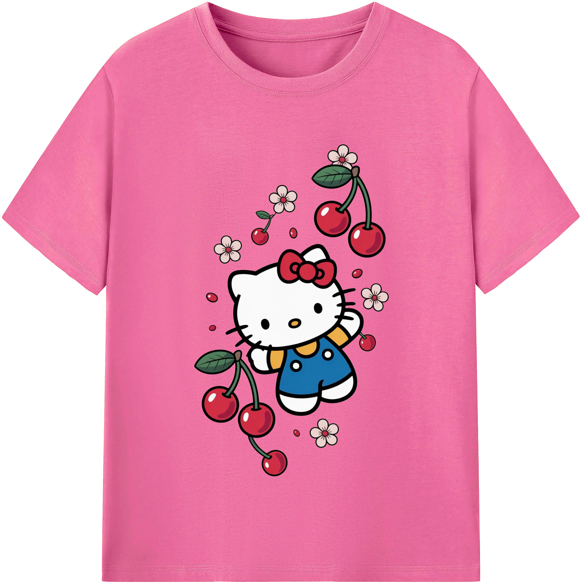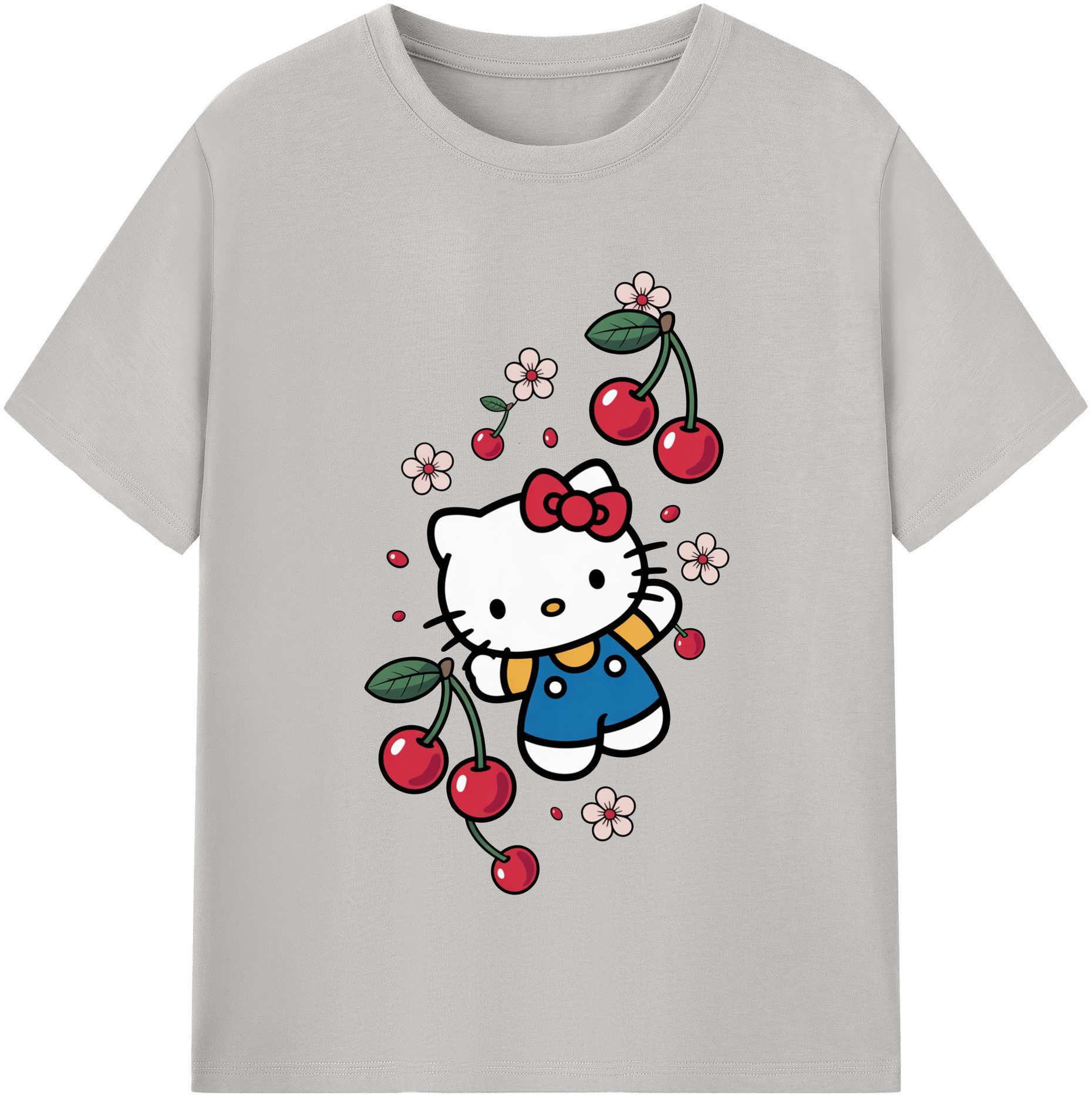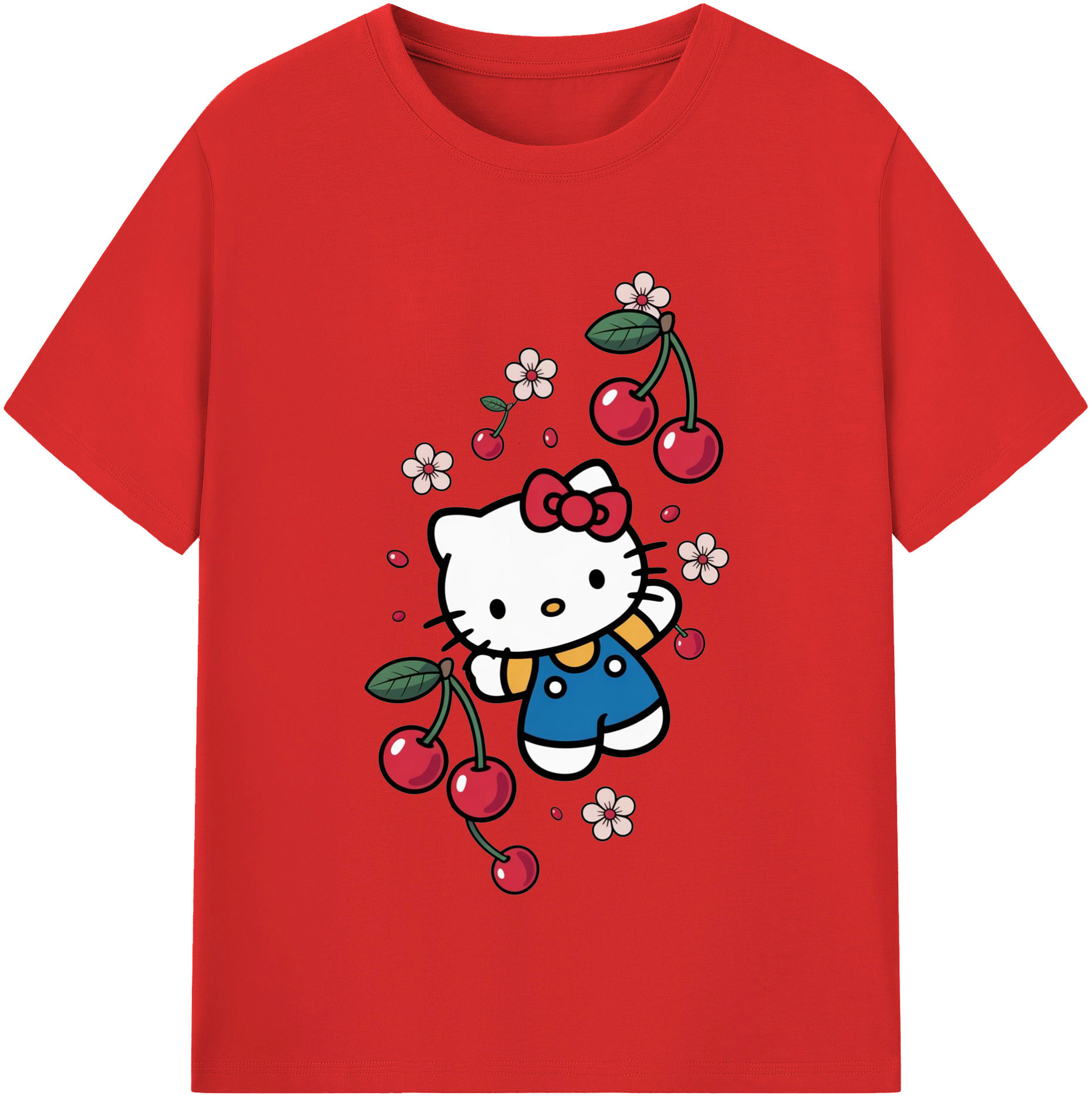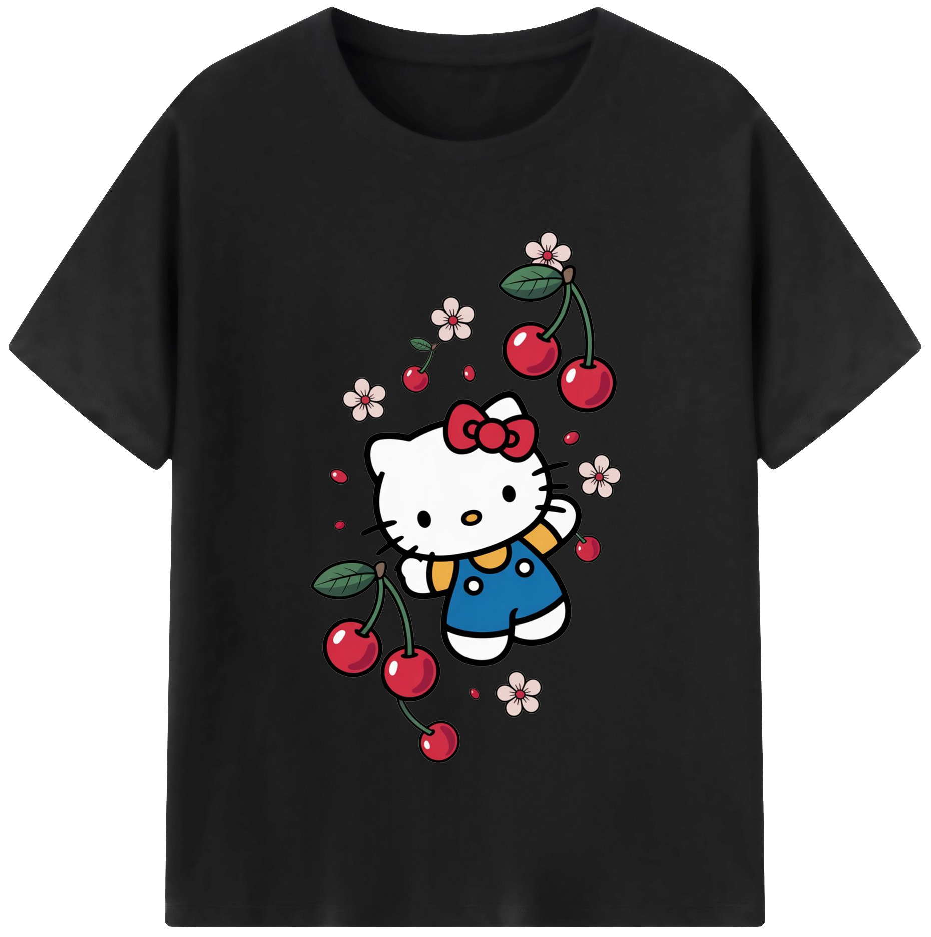 さくらんぼモチーフのハローキティ - レディースカジュアルプリントTシャツ ・ 綿100% ・ クルーネック ・ フロントプリント ・ 柔らかく快適 ・ フィットネス カジュアル 旅行用