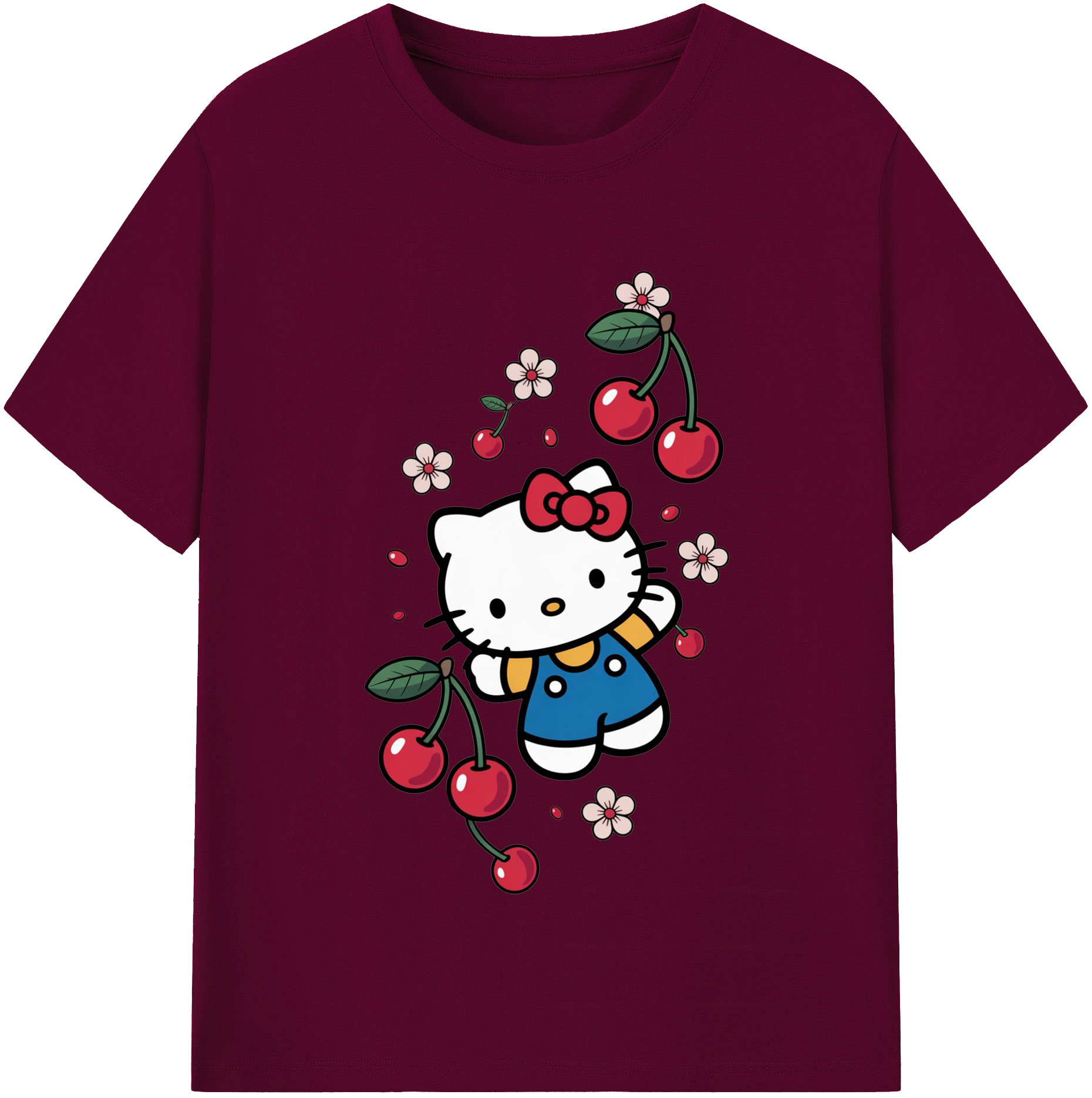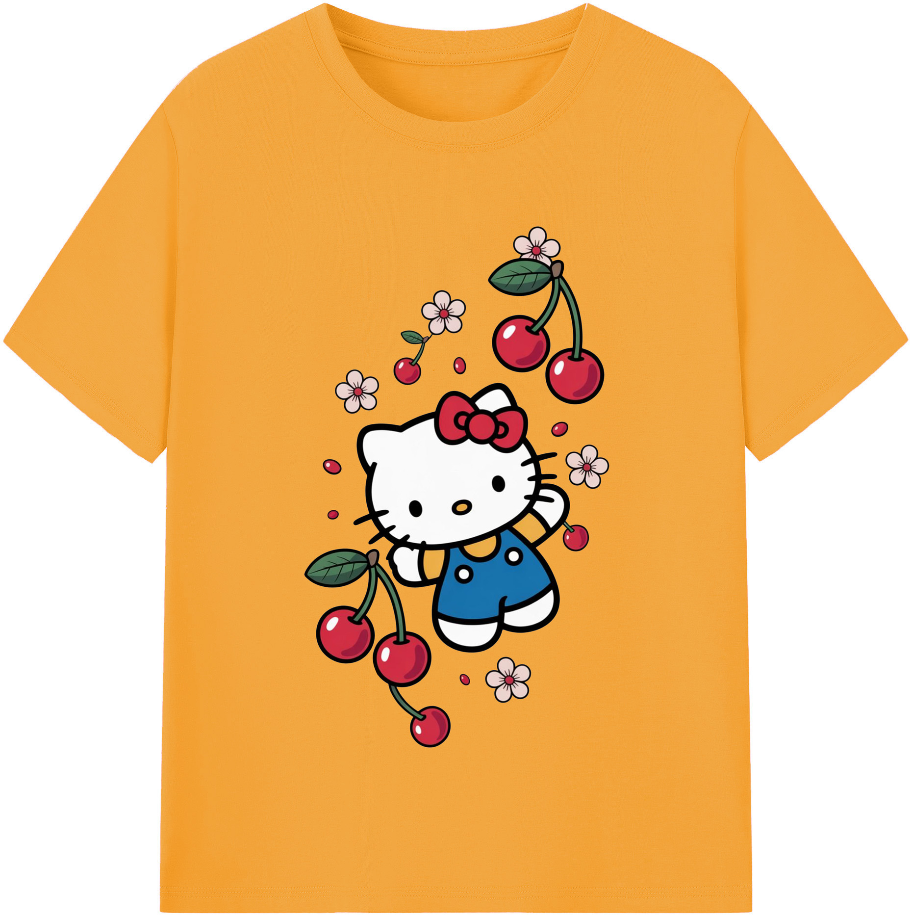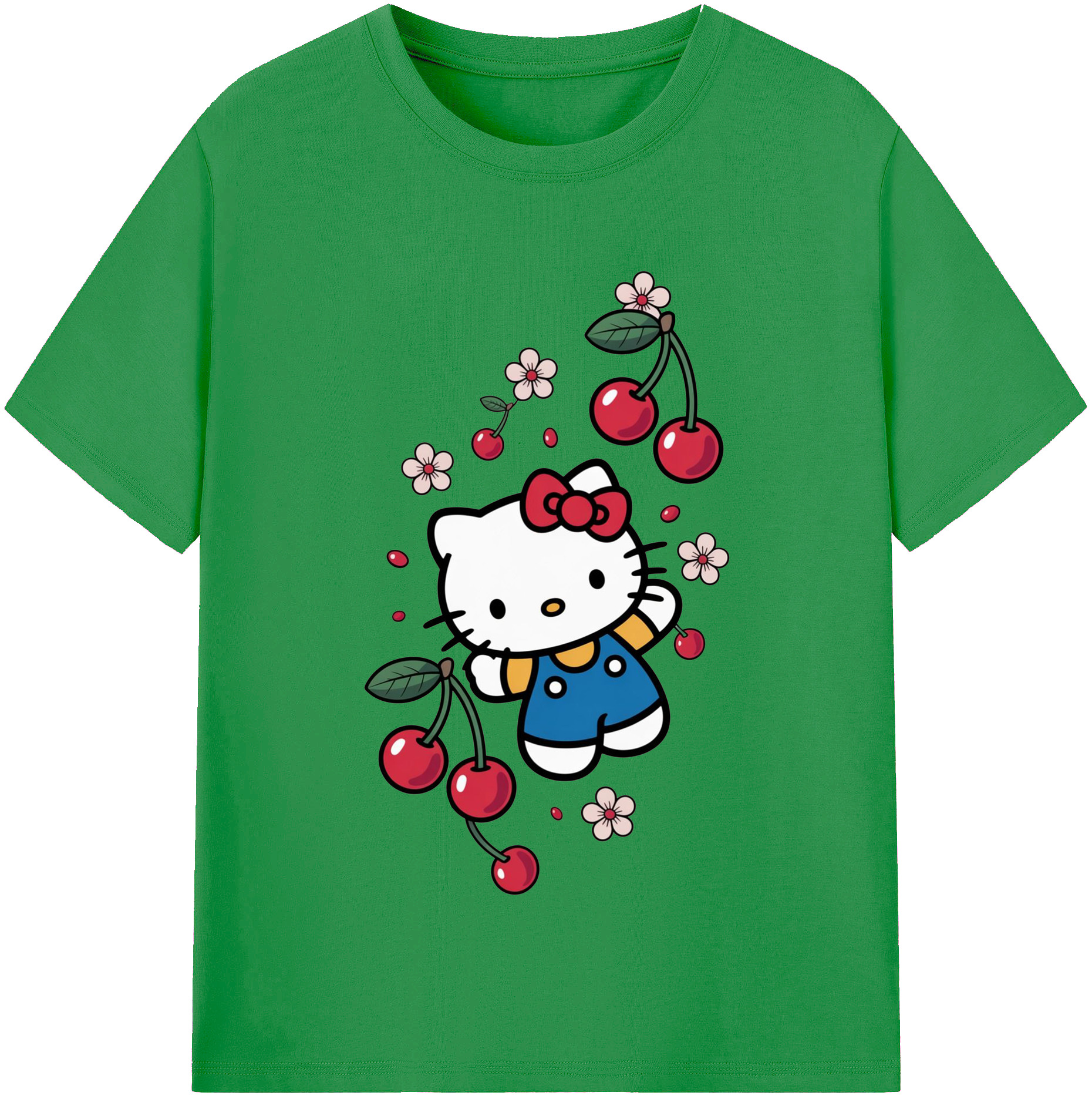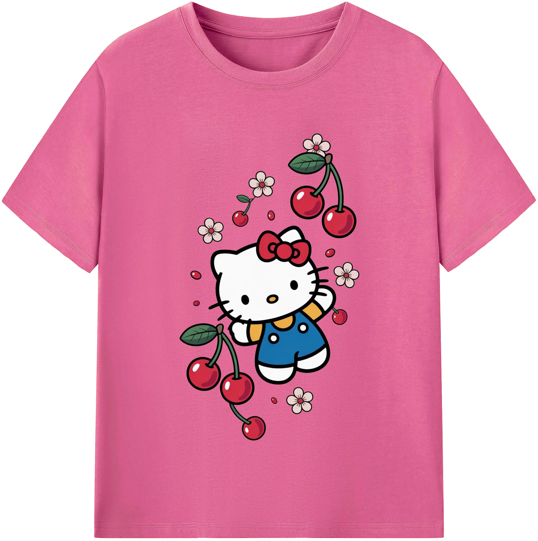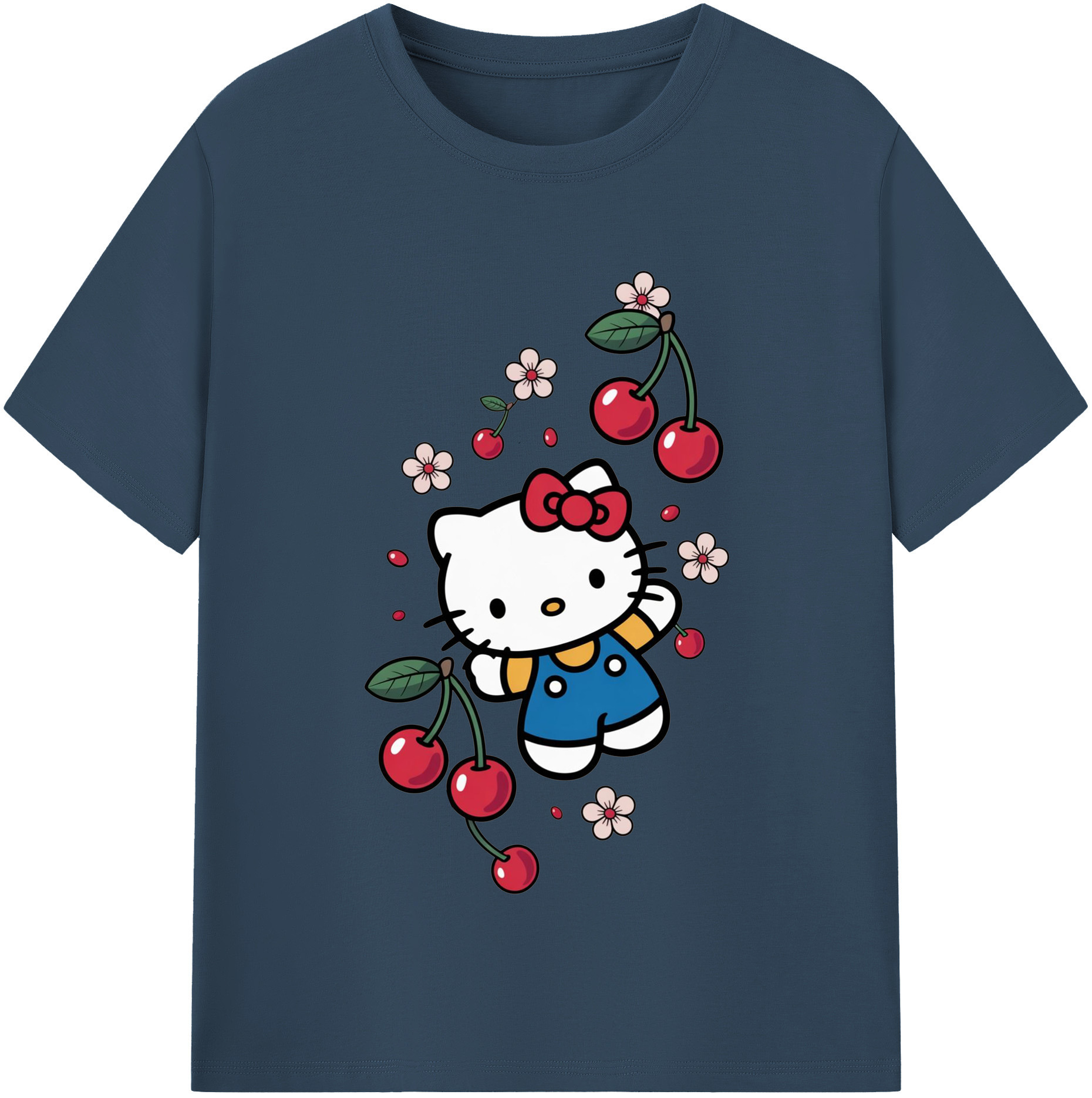 さくらんぼモチーフのハローキティ - レディースカジュアルプリントTシャツ ・ 綿100% ・ クルーネック ・ フロントプリント ・ 柔らかく快適 ・ フィットネス カジュアル 旅行用