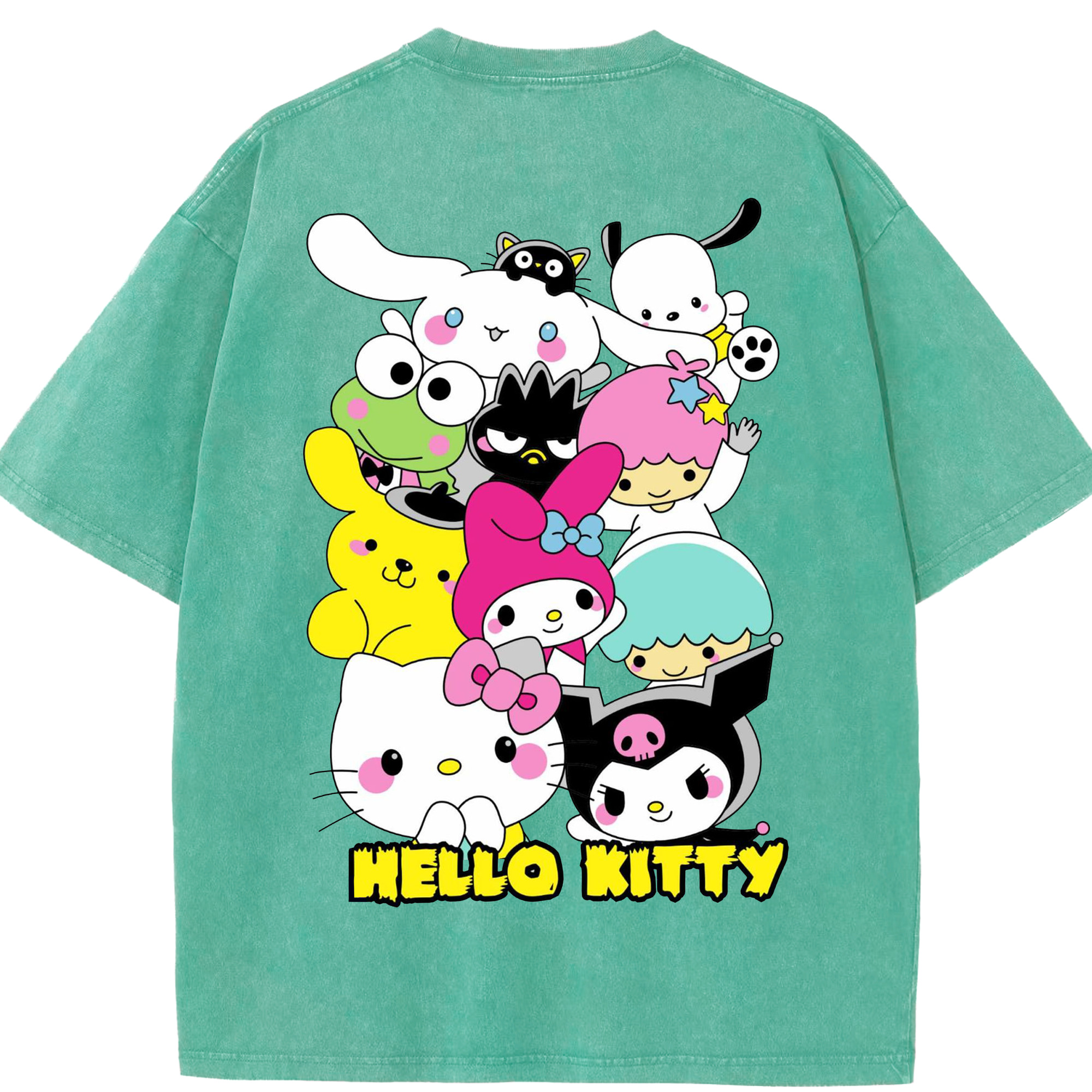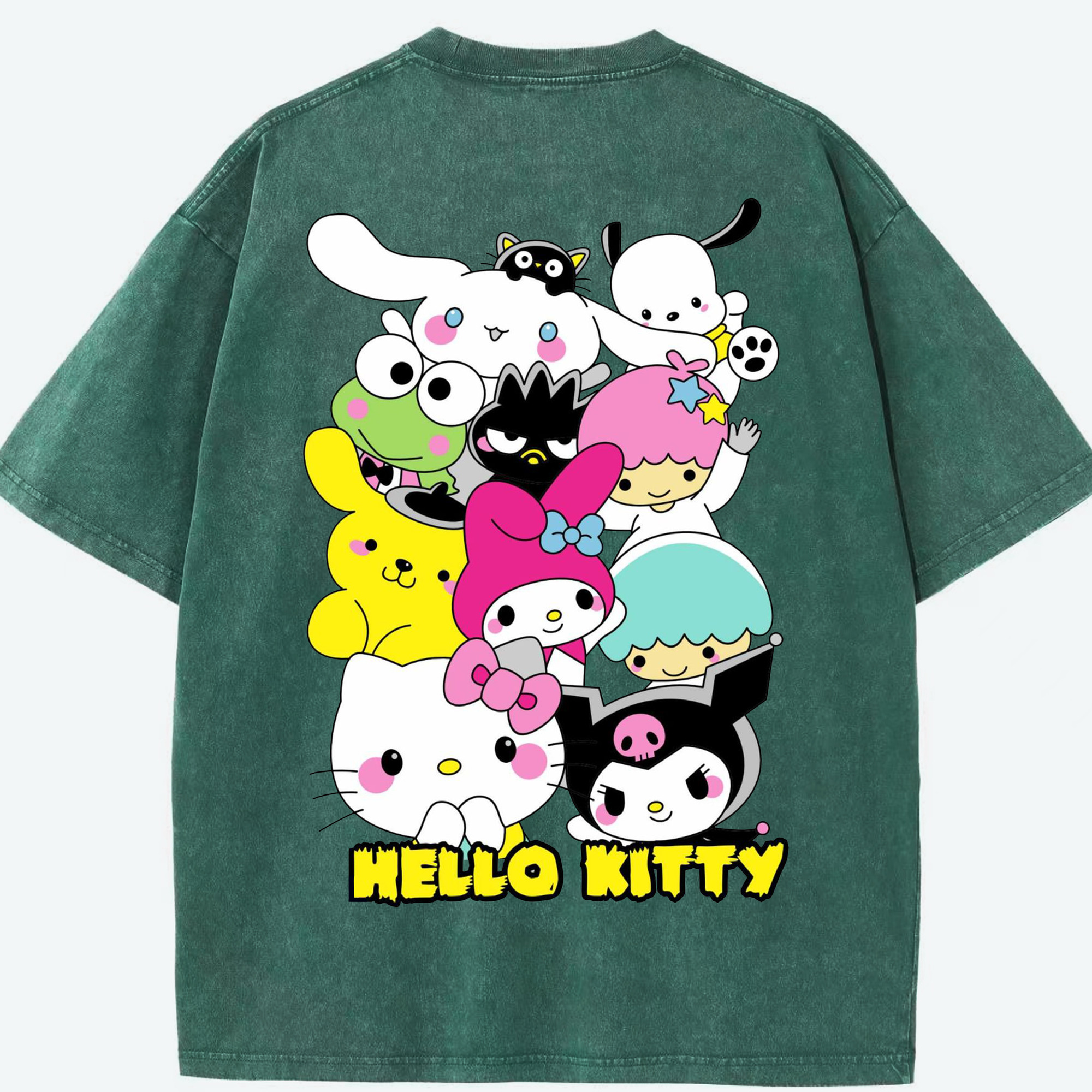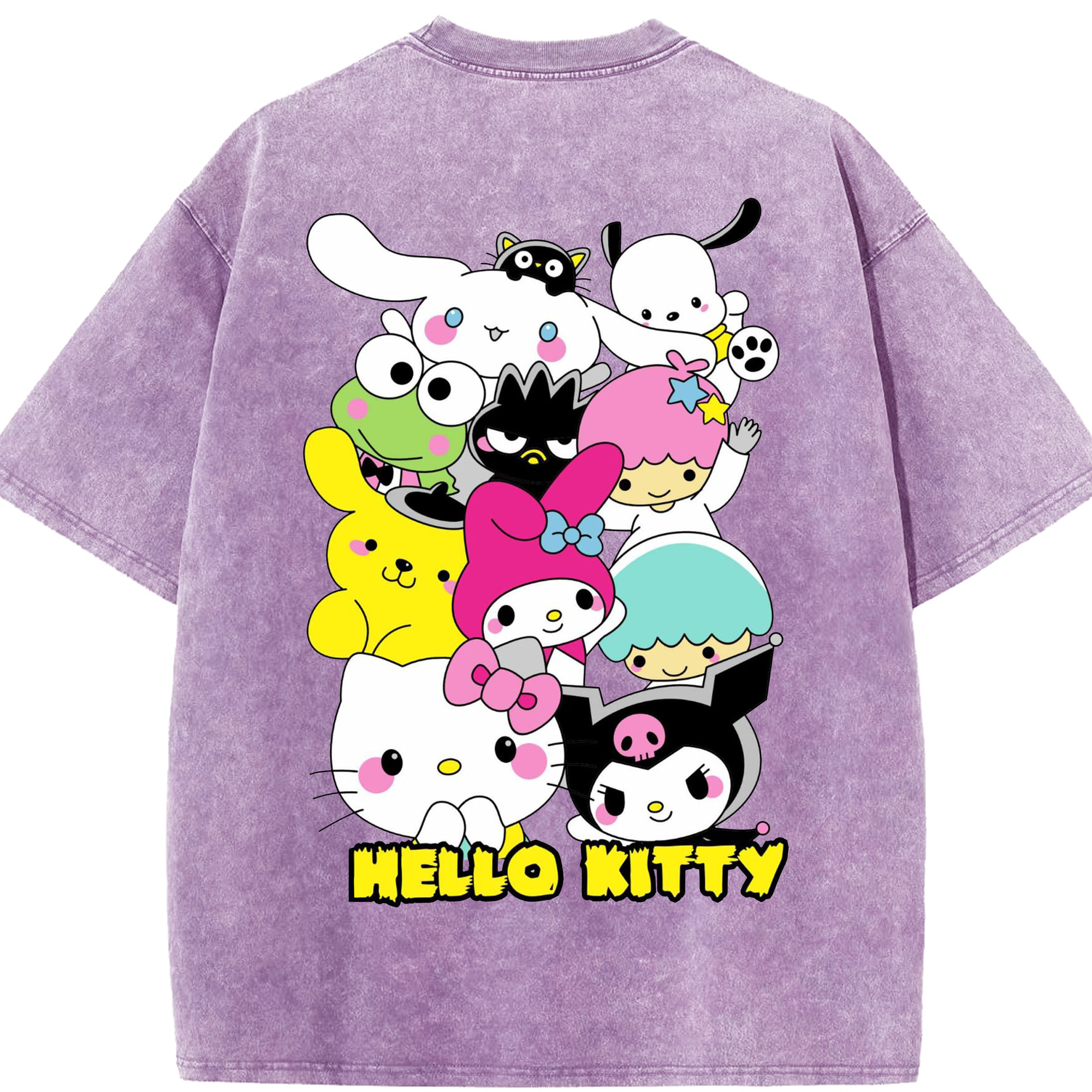 とってもかわいいサンリオファミリー - 綿100% ヴィンテージ風 半袖Tシャツ ・ 背面プリント ・ 柔らか肌触り ・ 通気性 快適 ・ スポーツ カジュアル 外出用