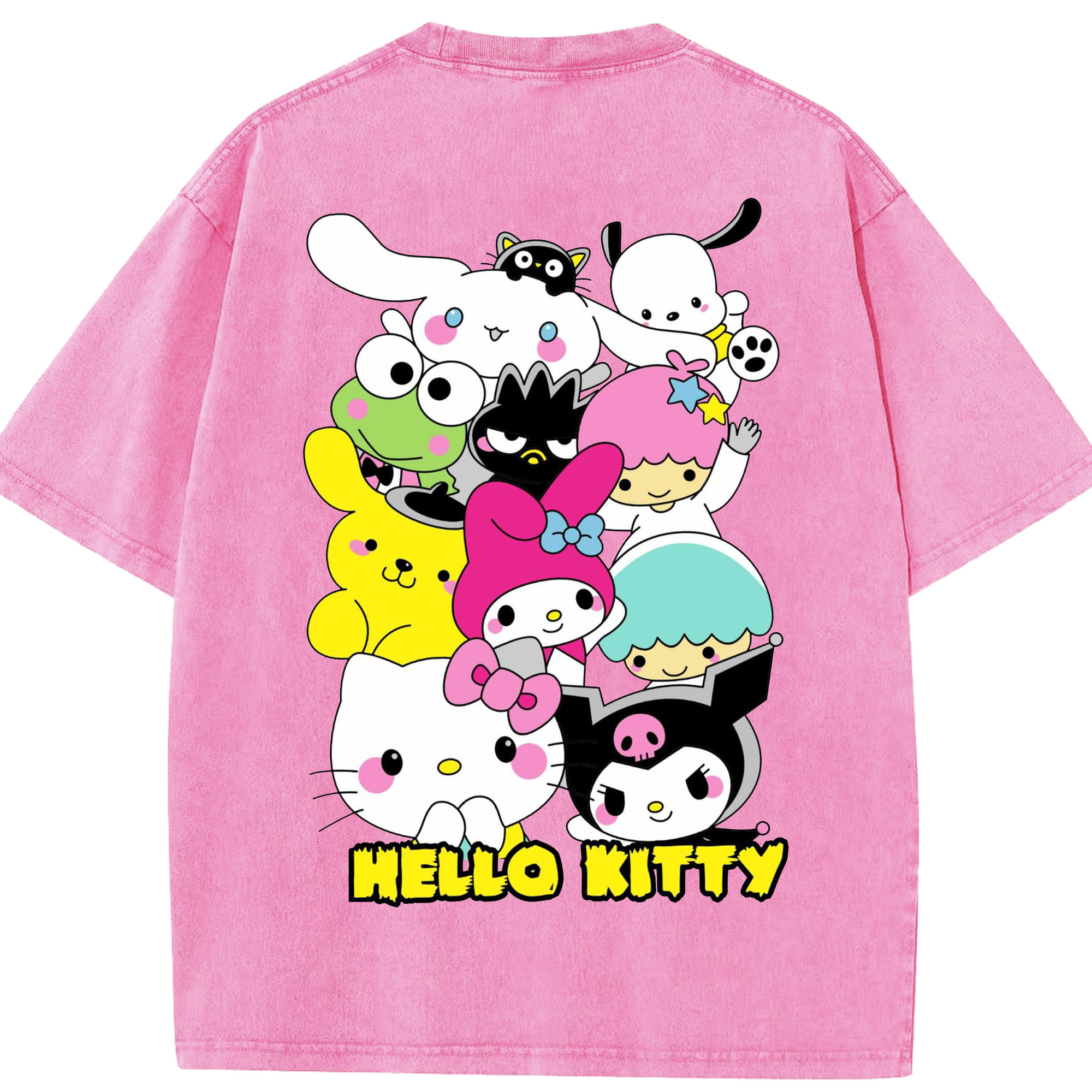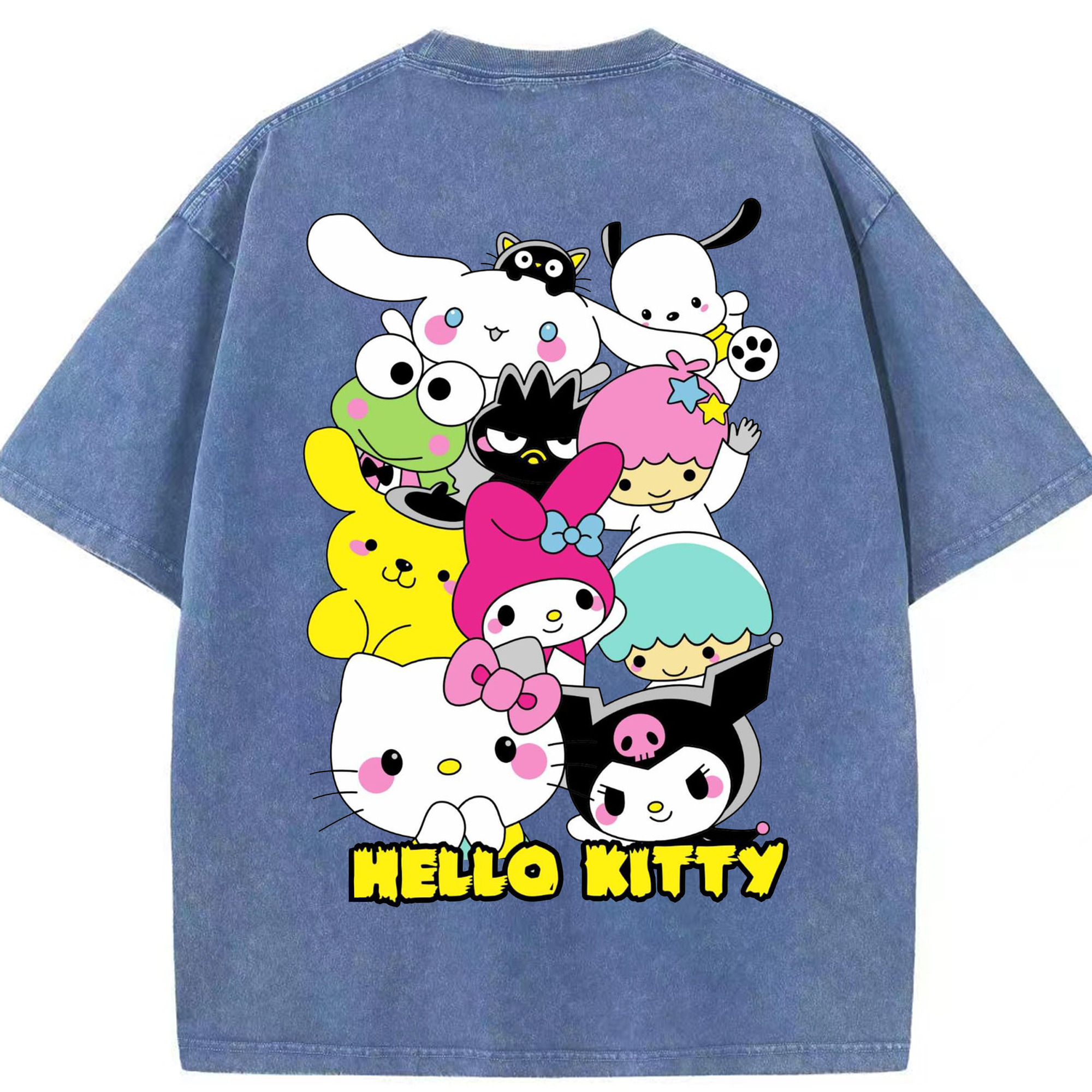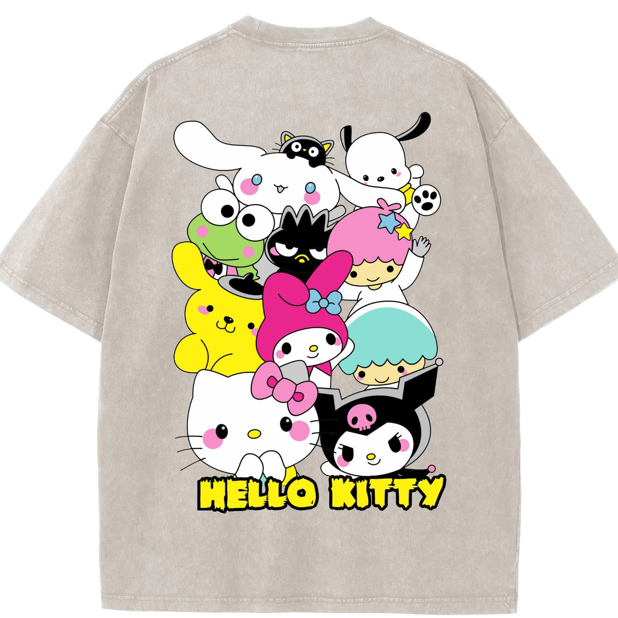 とってもかわいいサンリオファミリー - 綿100% ヴィンテージ風 半袖Tシャツ ・ 背面プリント ・ 柔らか肌触り ・ 通気性 快適 ・ スポーツ カジュアル 外出用
