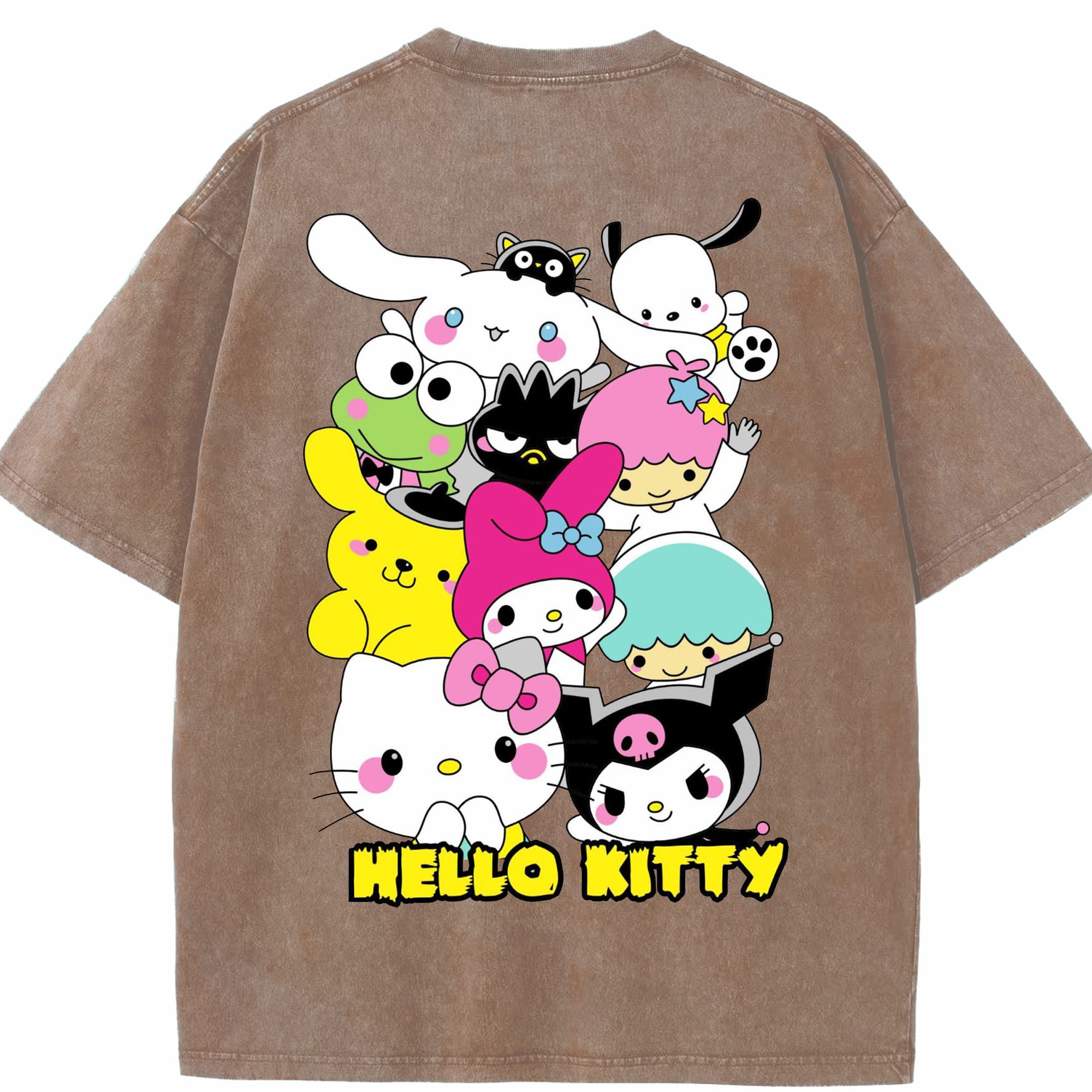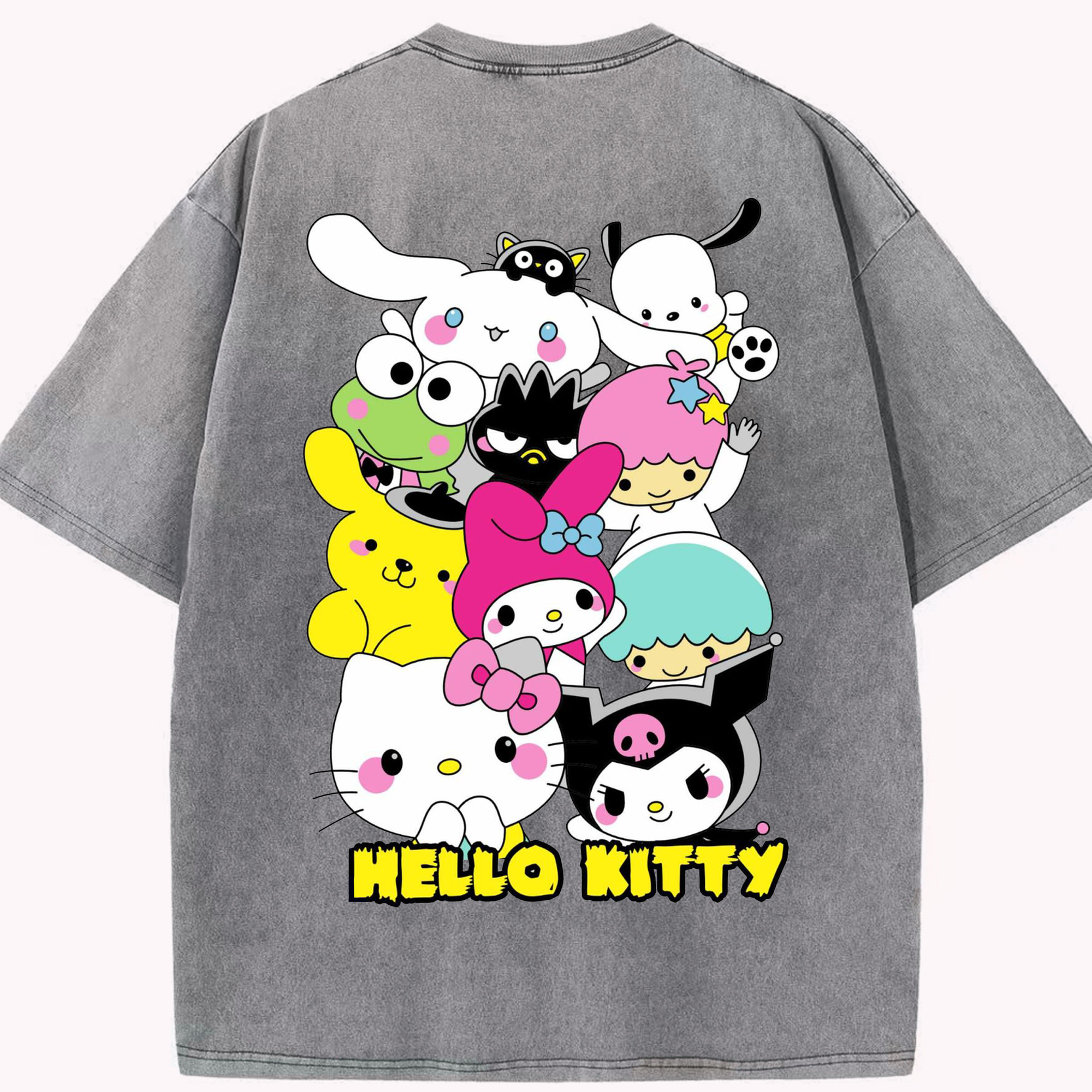 サンリオファミリー 2025年新作 - 綿100% ヴィンテージ風 半袖Tシャツ ・ 背面プリント ・ 柔らか肌触り ・ 通気性 快適 ・ スポーツ カジュアル 外出用