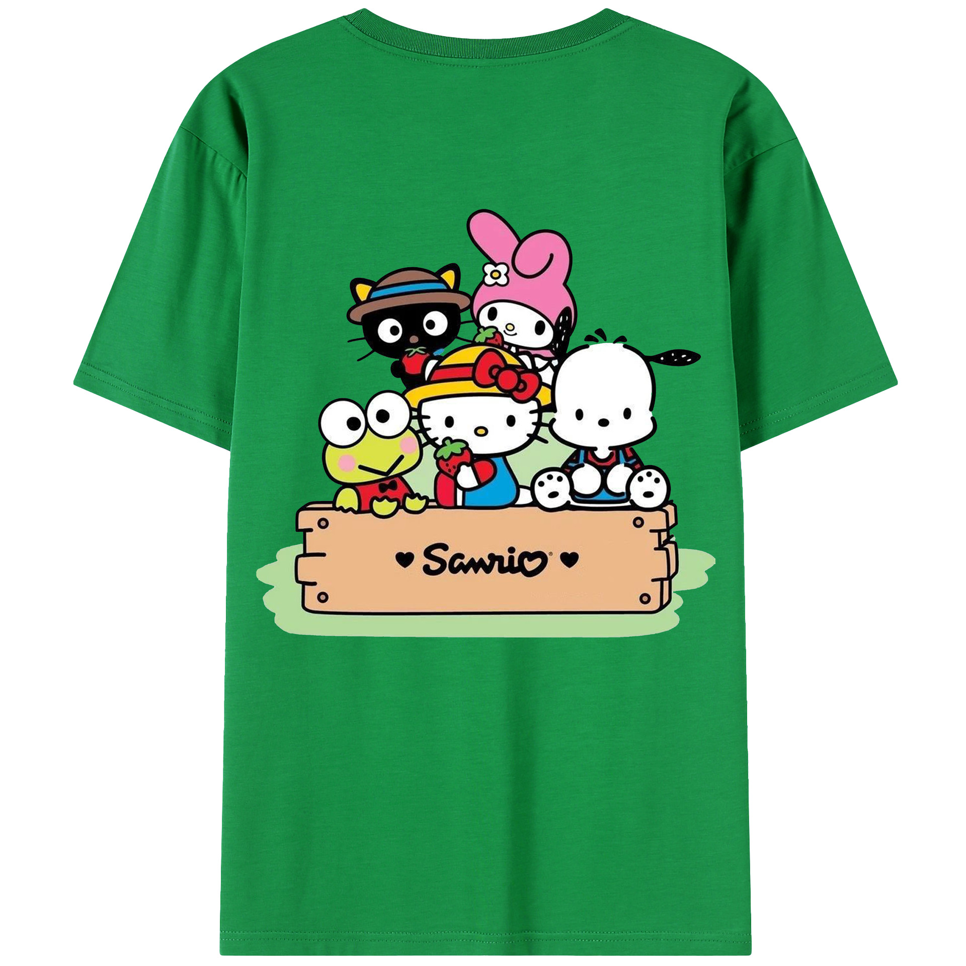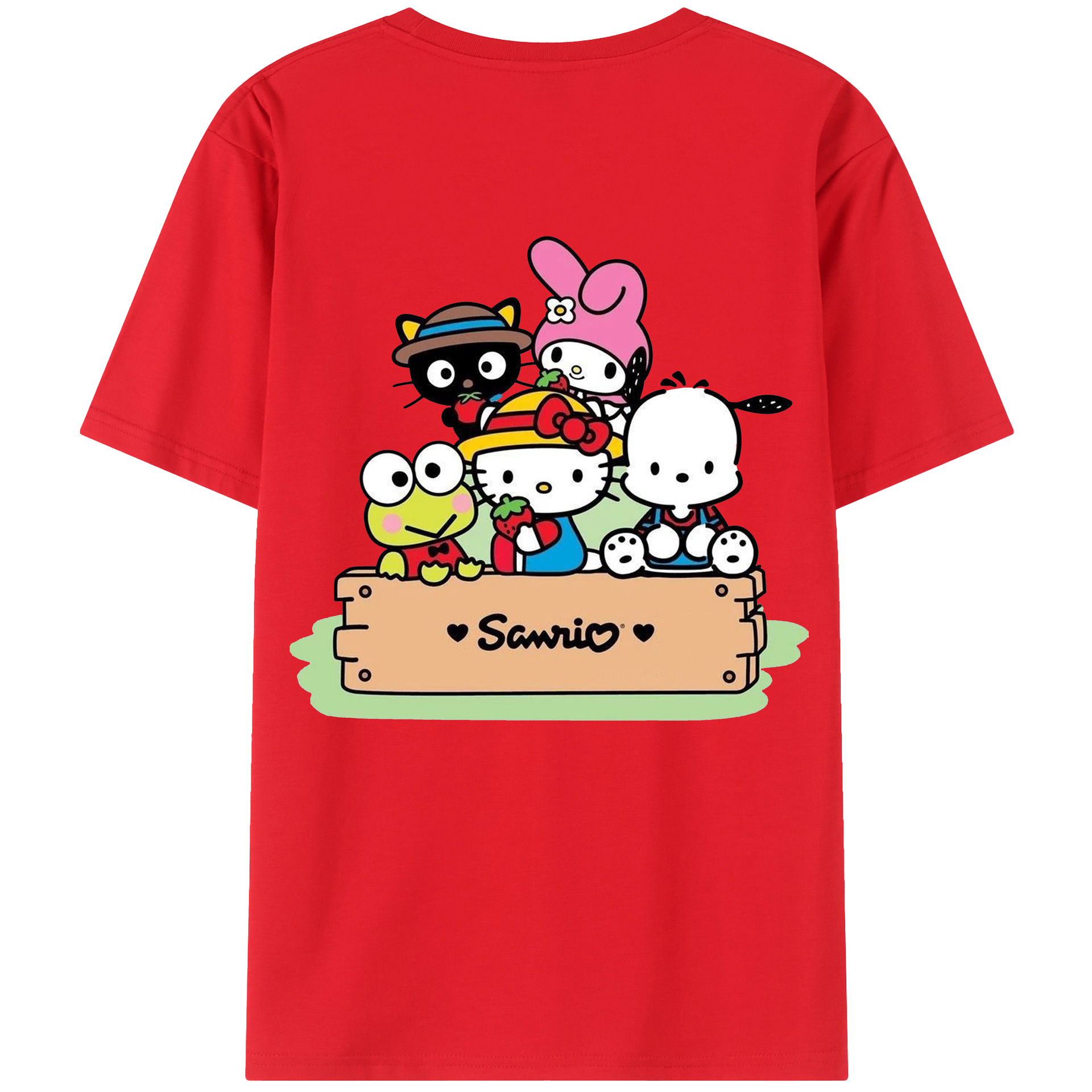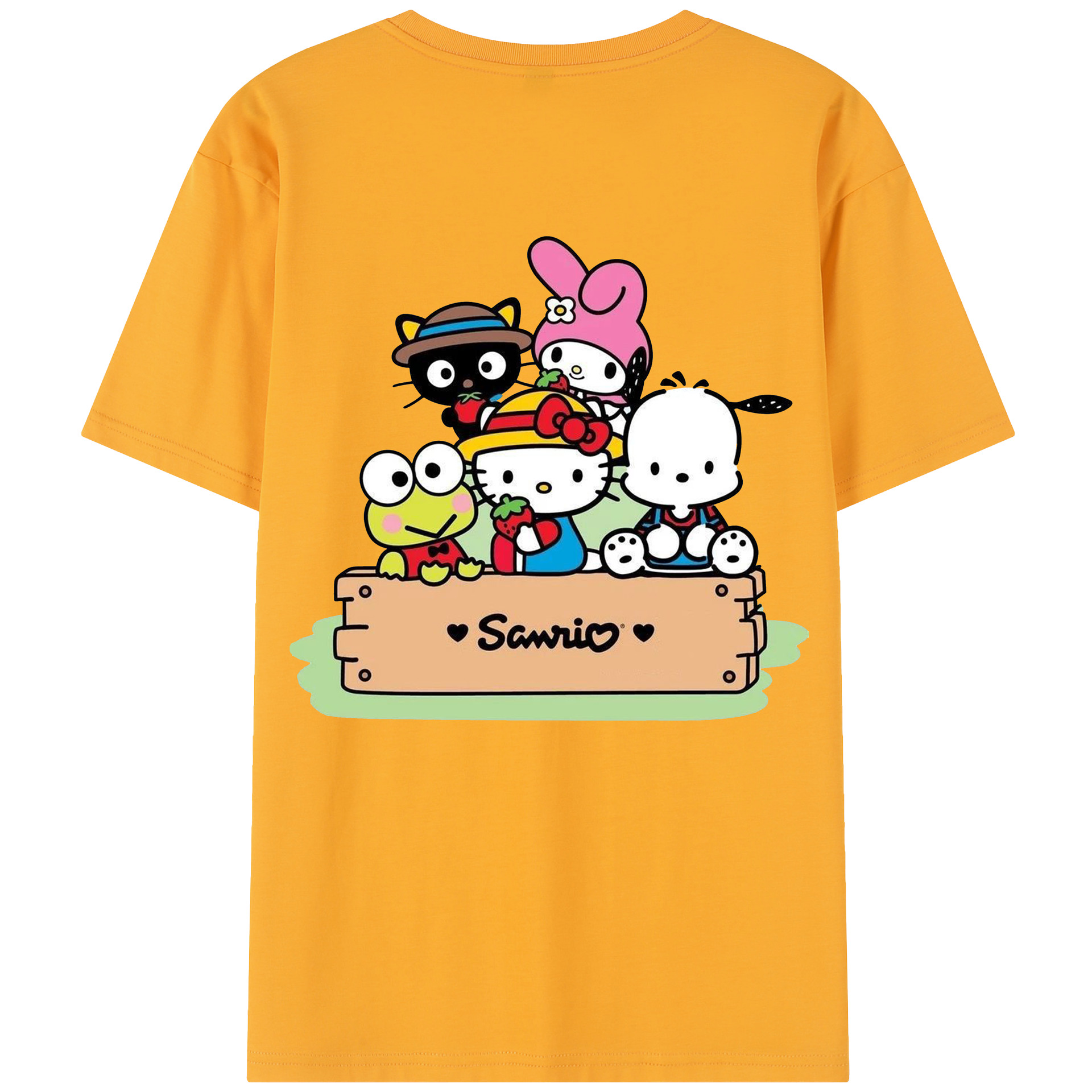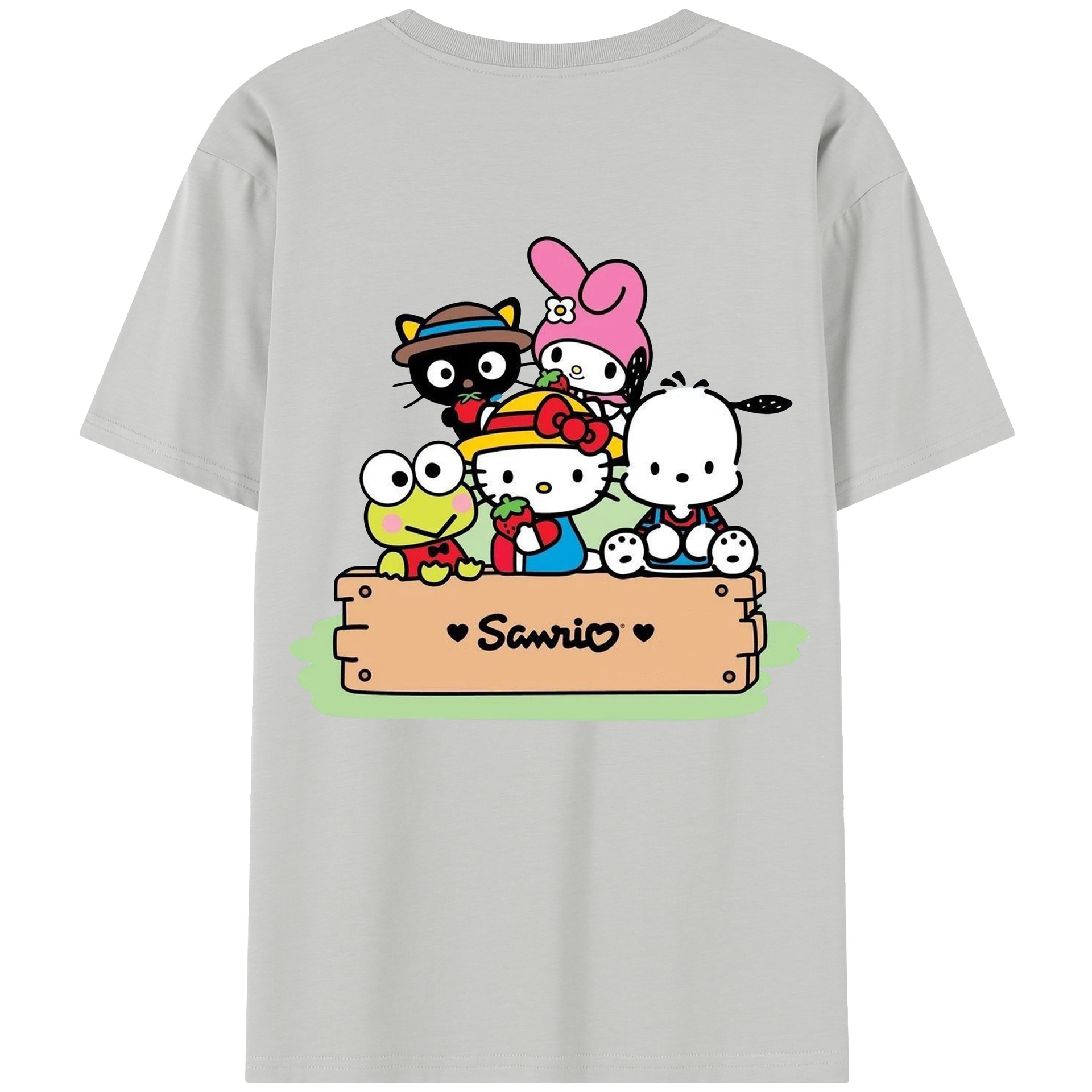 とってもかわいいサンリオファミリー - 綿100% ヴィンテージ風 半袖Tシャツ ・ 背面プリント ・ 柔らか肌触り ・ 通気性 快適 ・ スポーツ カジュアル 外出用