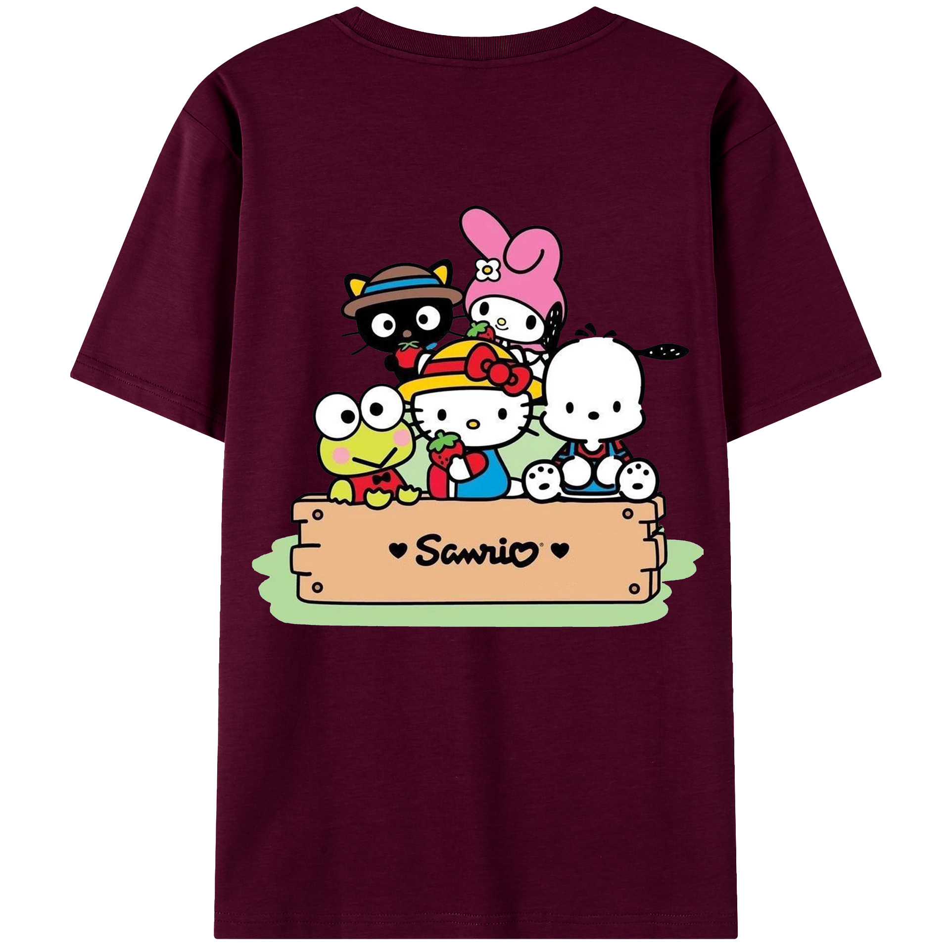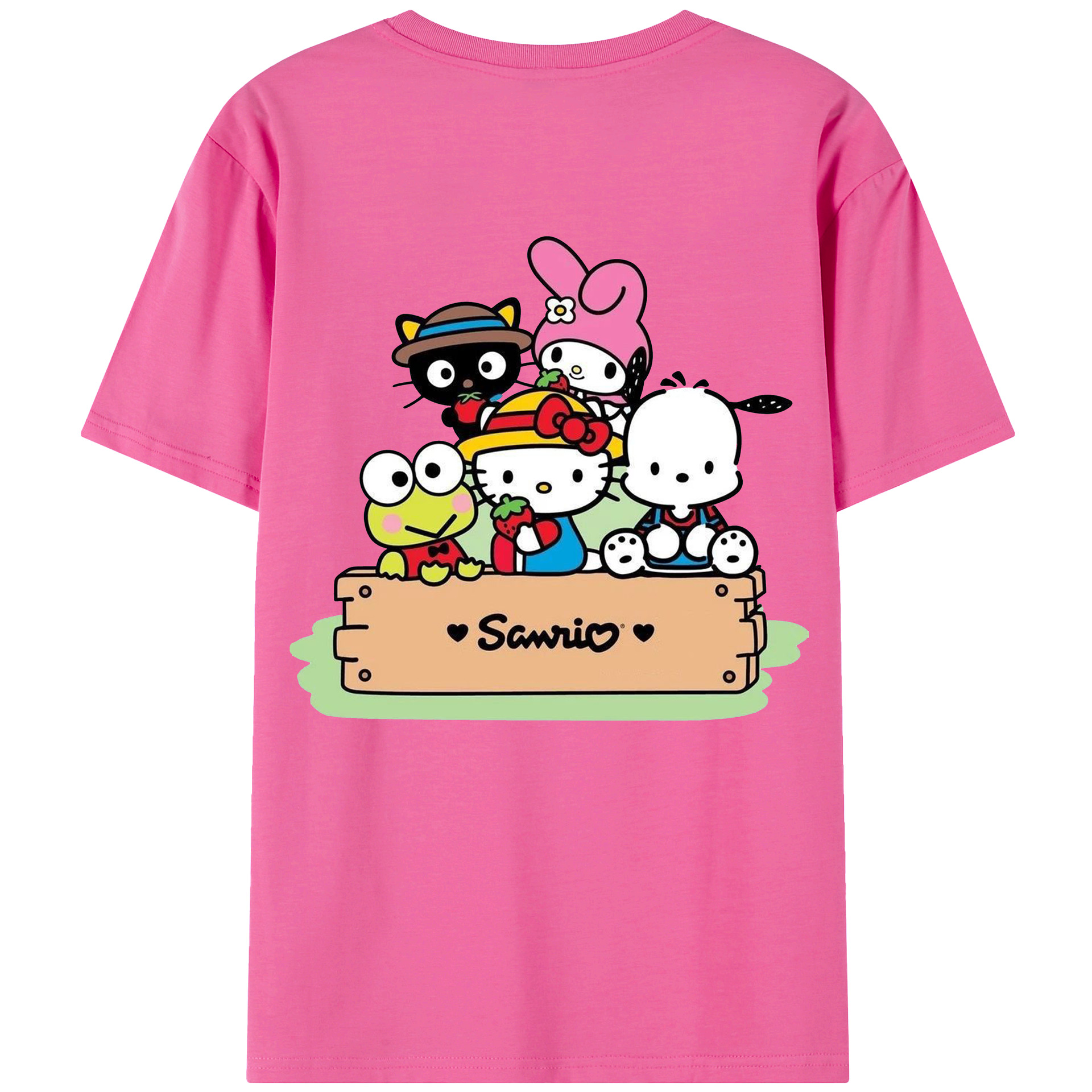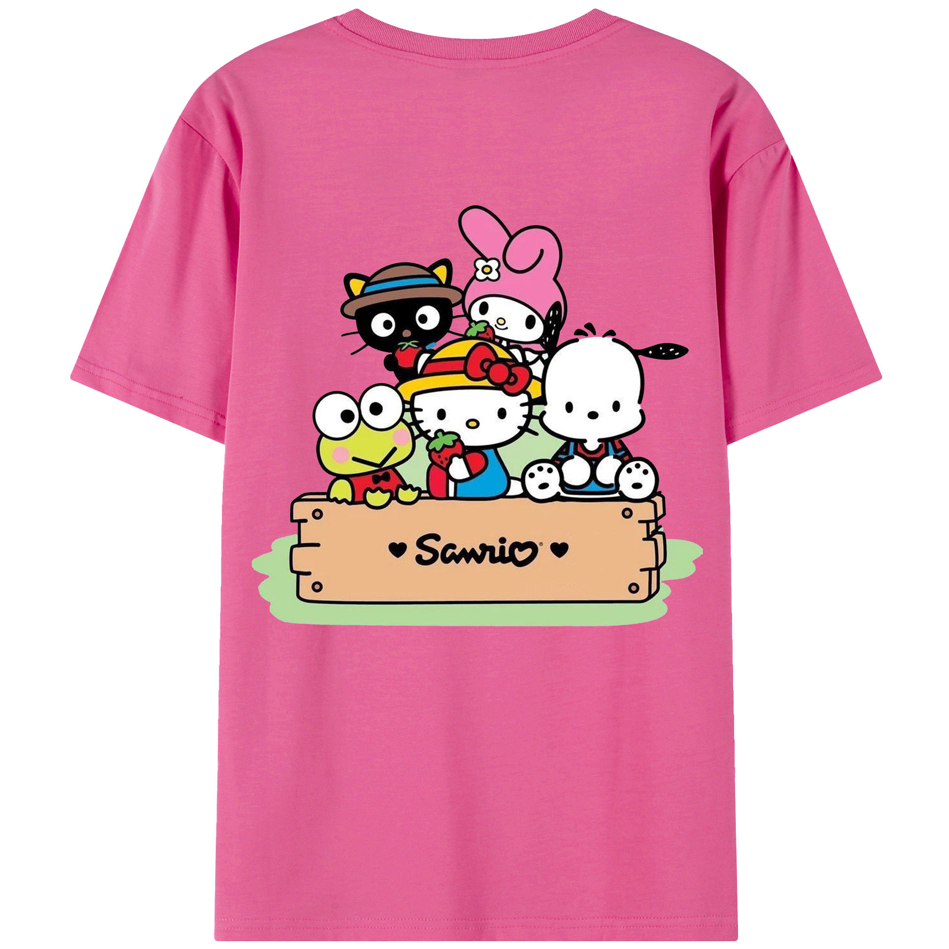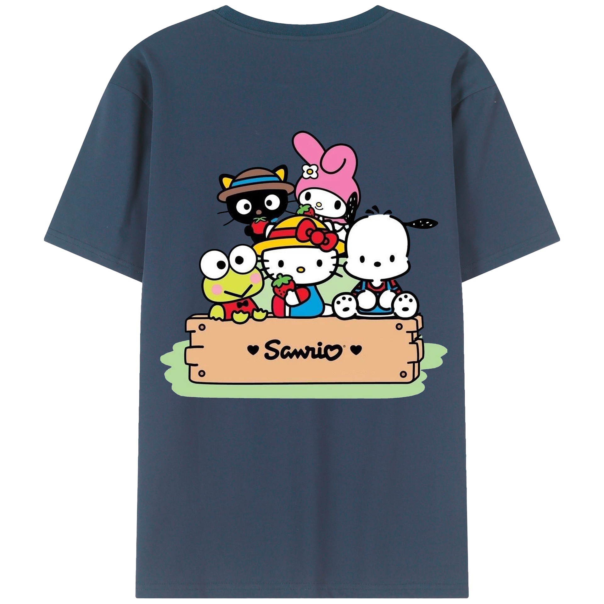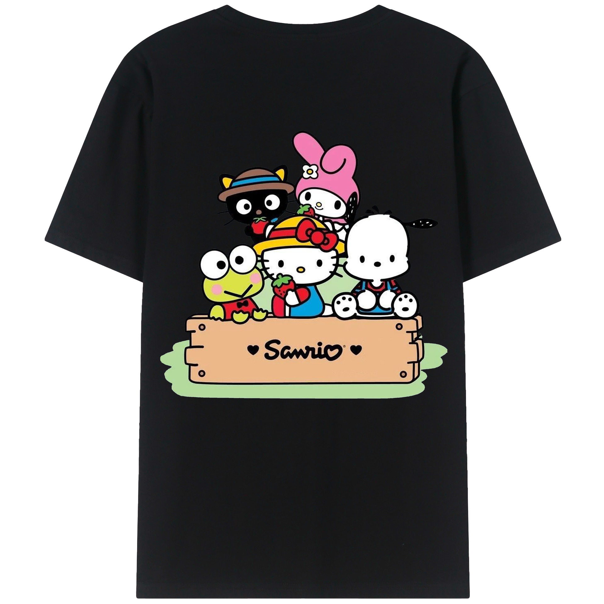とってもかわいいサンリオファミリー - 綿100% ヴィンテージ風 半袖Tシャツ ・ 背面プリント ・ 柔らか肌触り ・ 通気性 快適 ・ スポーツ カジュアル 外出用