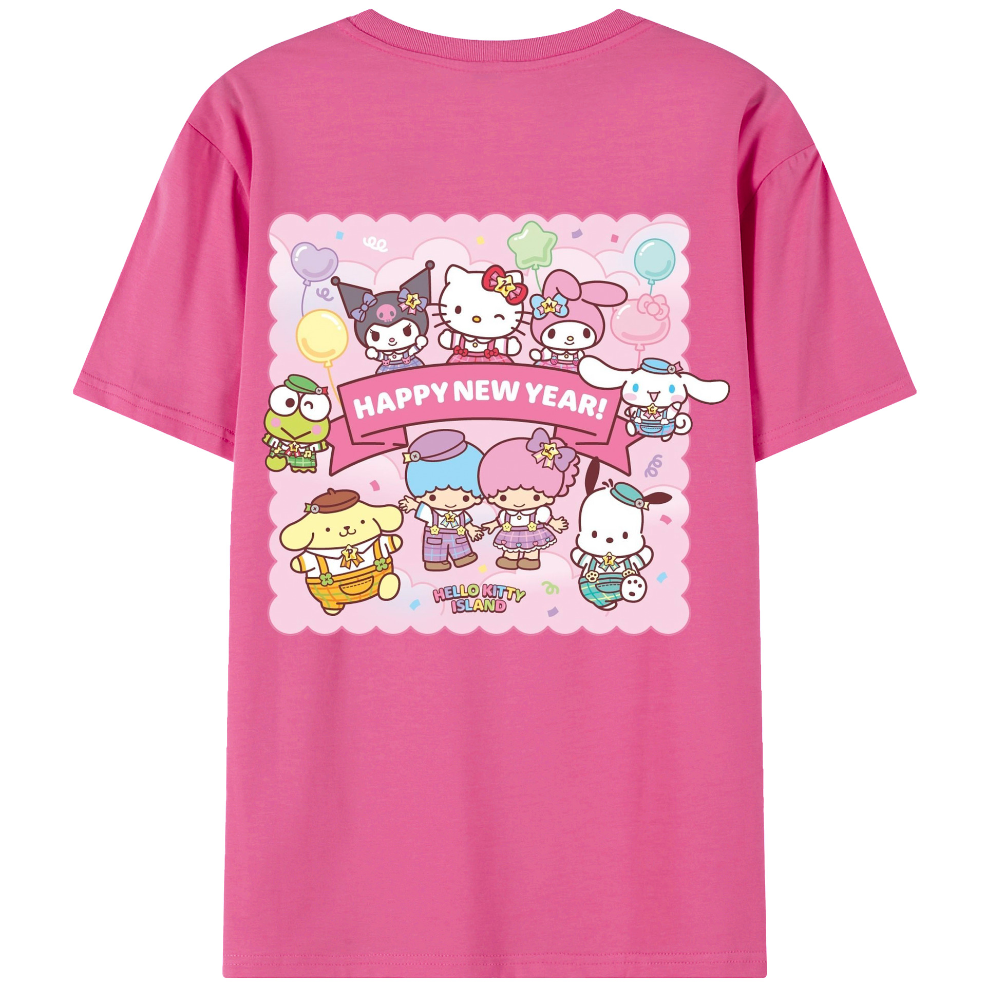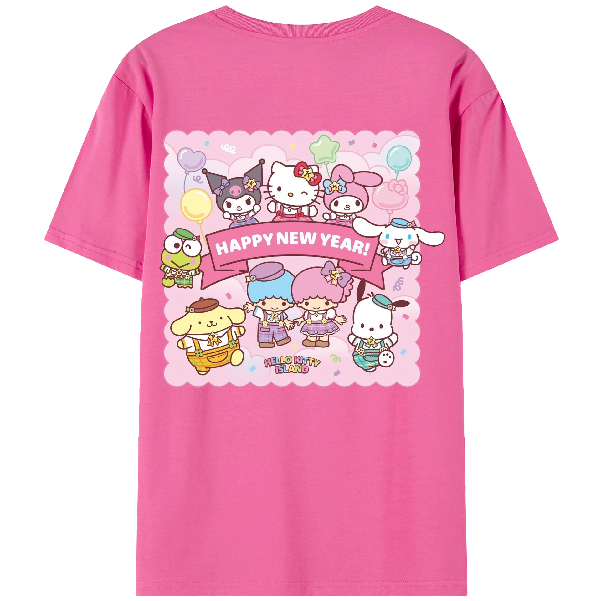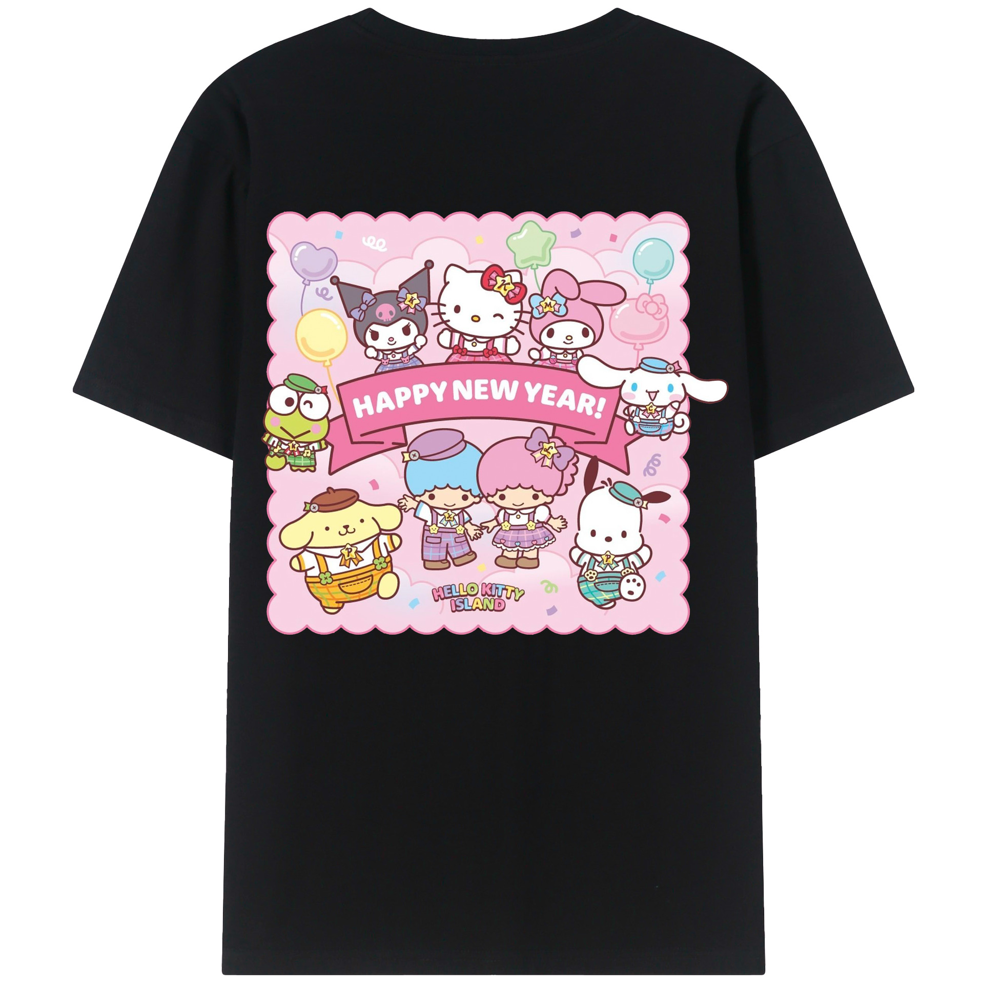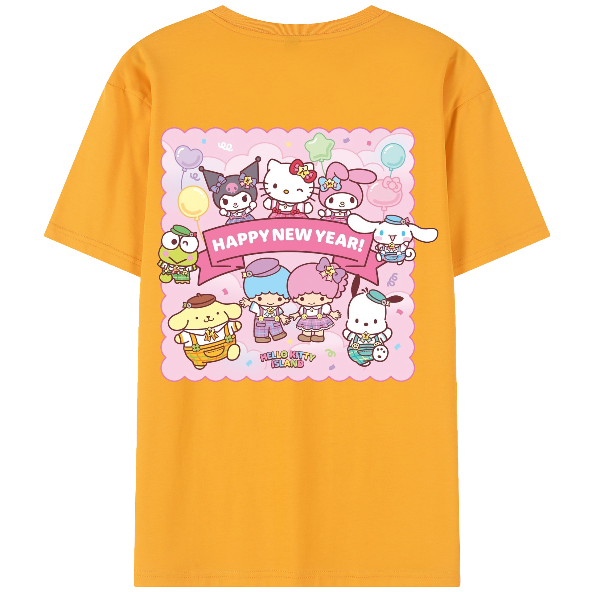 とってもかわいいサンリオファミリー - 綿100% ヴィンテージ風 半袖Tシャツ ・ 背面プリント ・ 柔らか肌触り ・ 通気性 快適 ・ スポーツ カジュアル 外出用