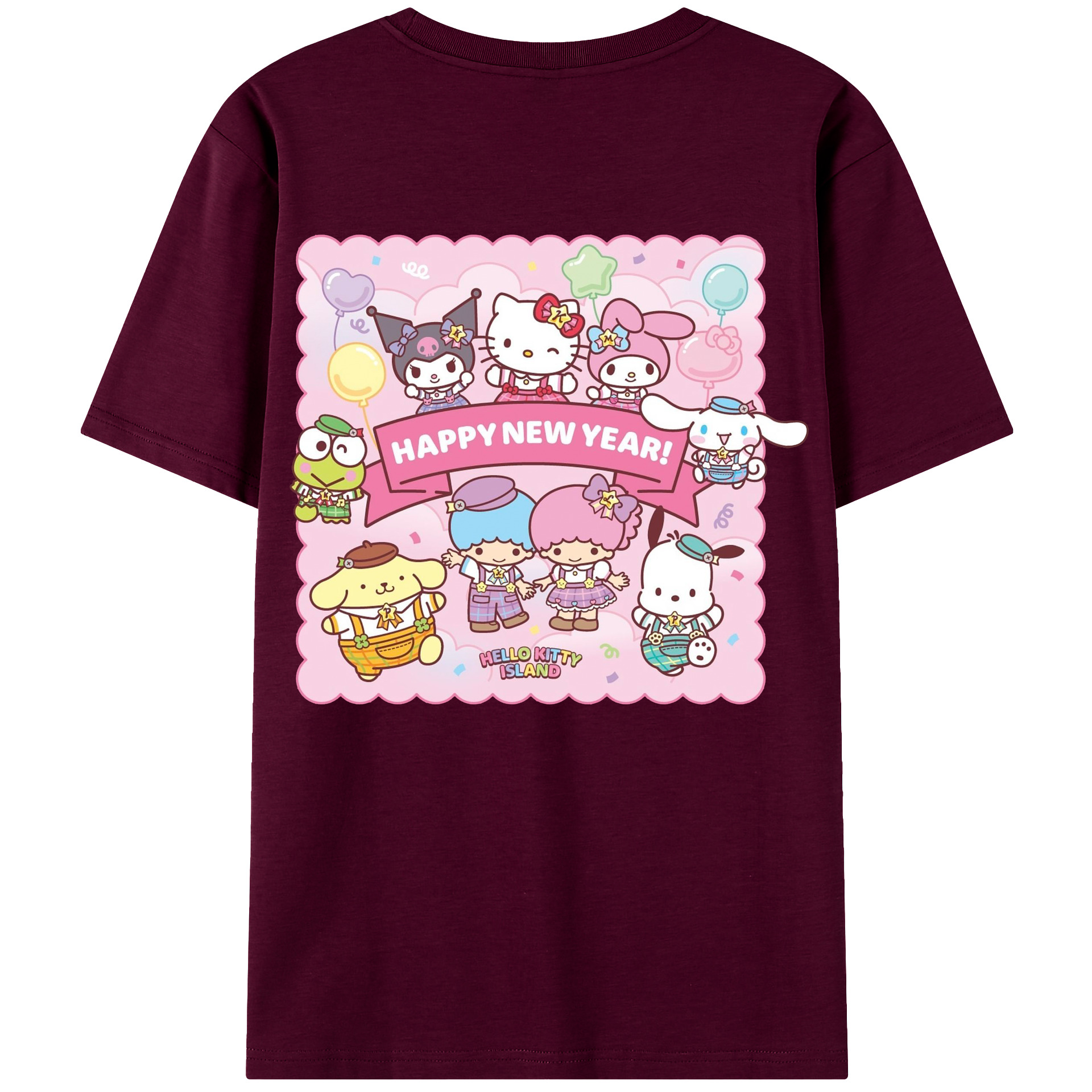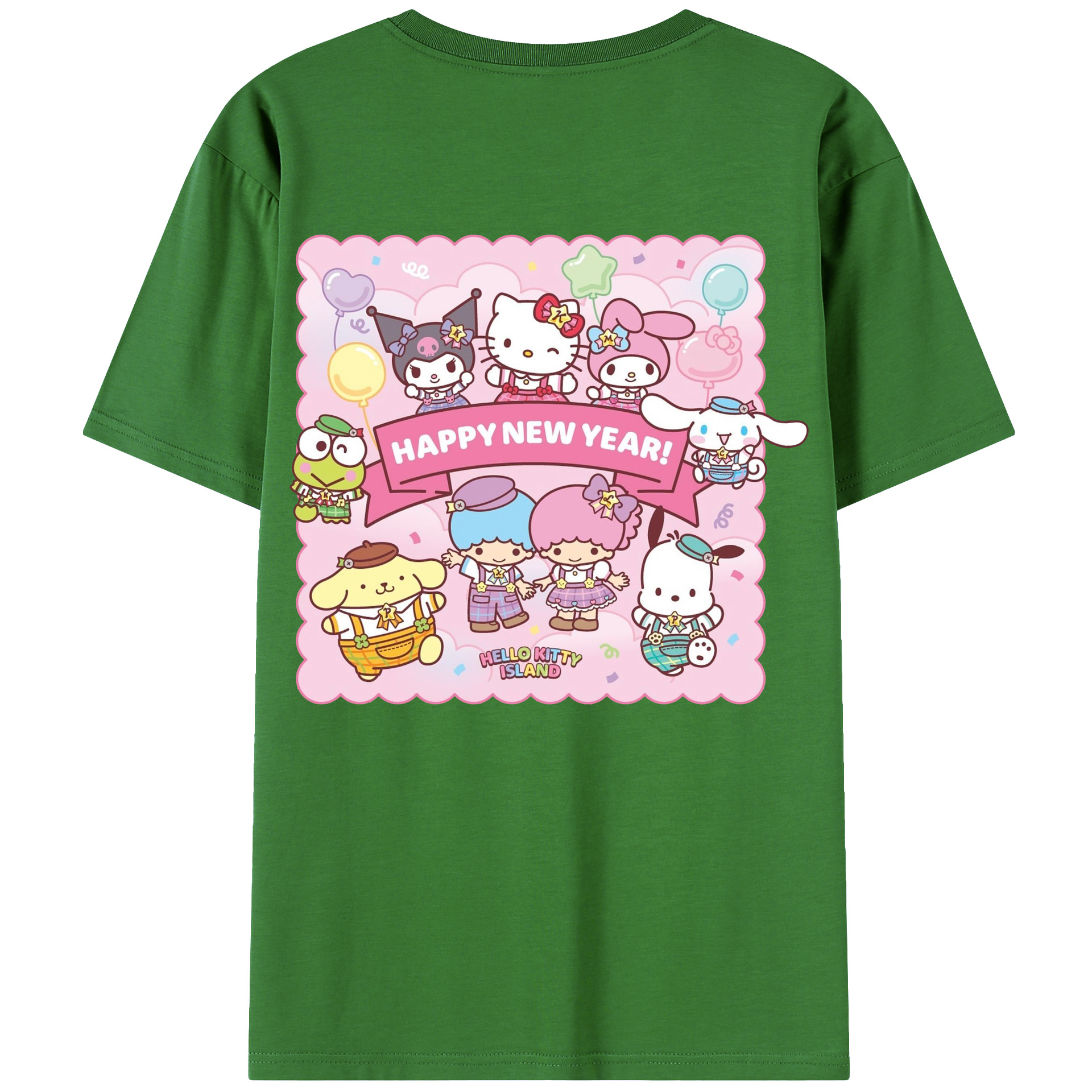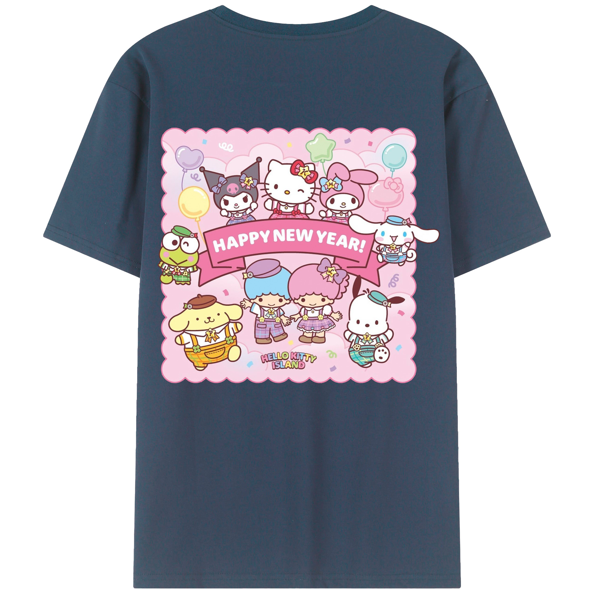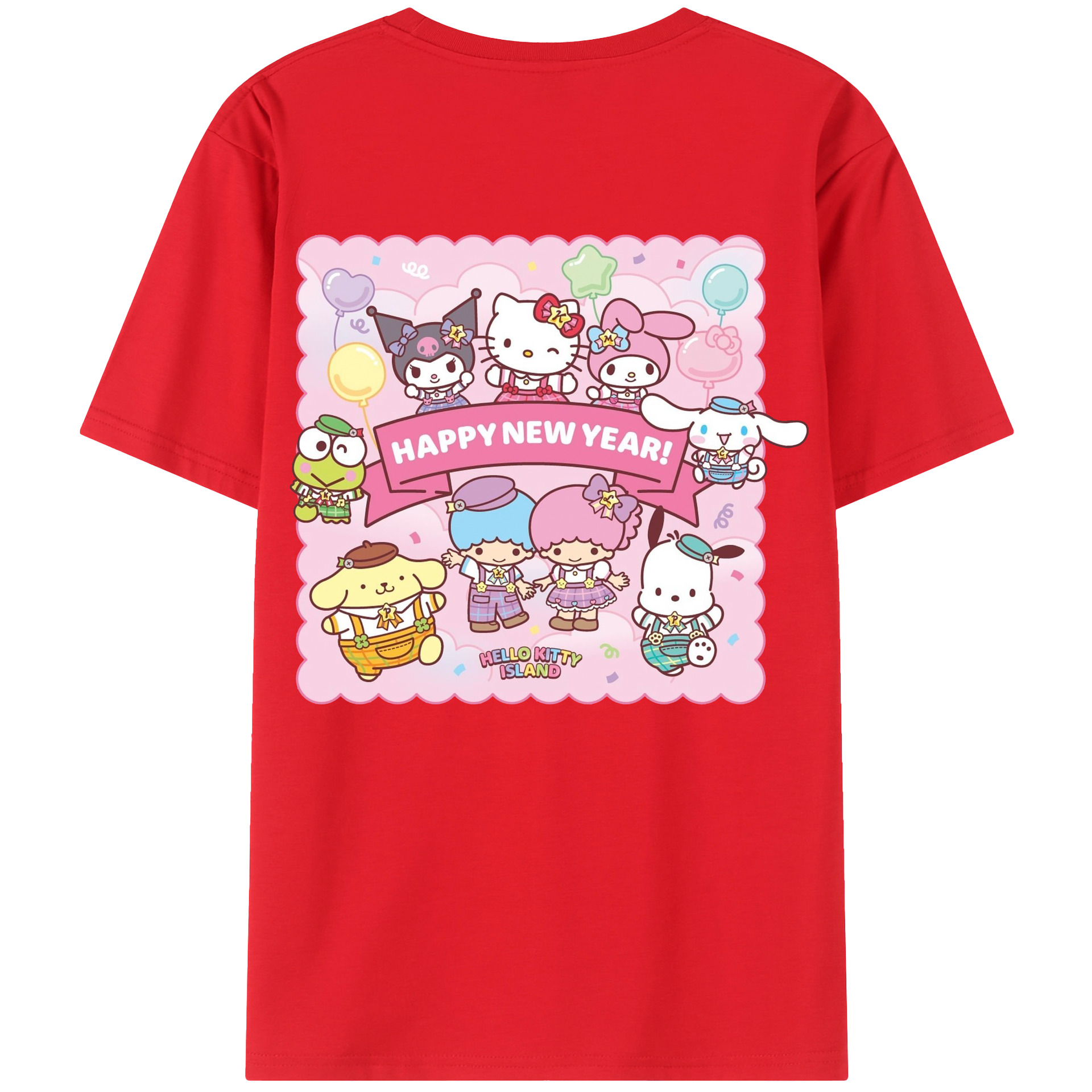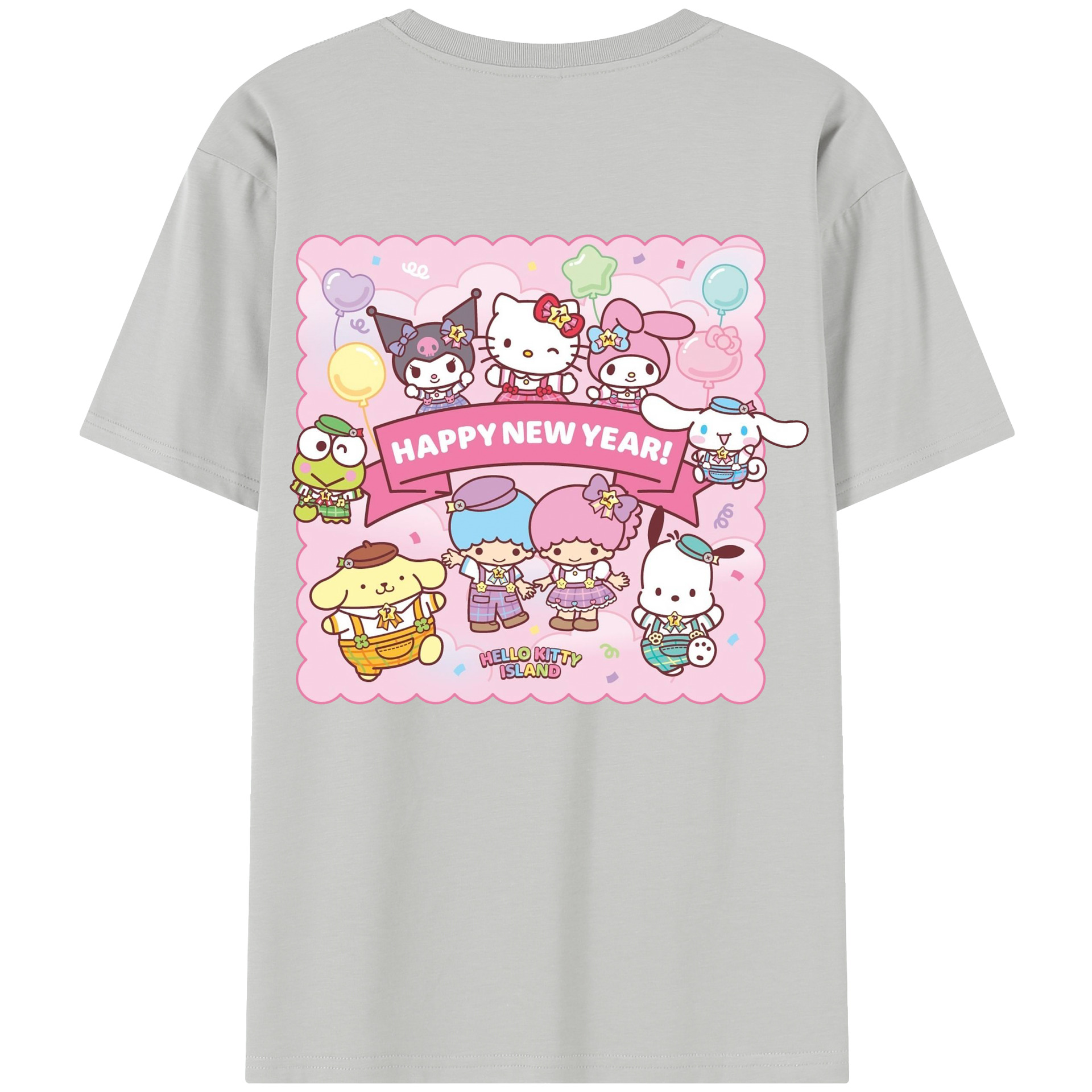 とってもかわいいサンリオファミリー - 綿100% ヴィンテージ風 半袖Tシャツ ・ 背面プリント ・ 柔らか肌触り ・ 通気性 快適 ・ スポーツ カジュアル 外出用
