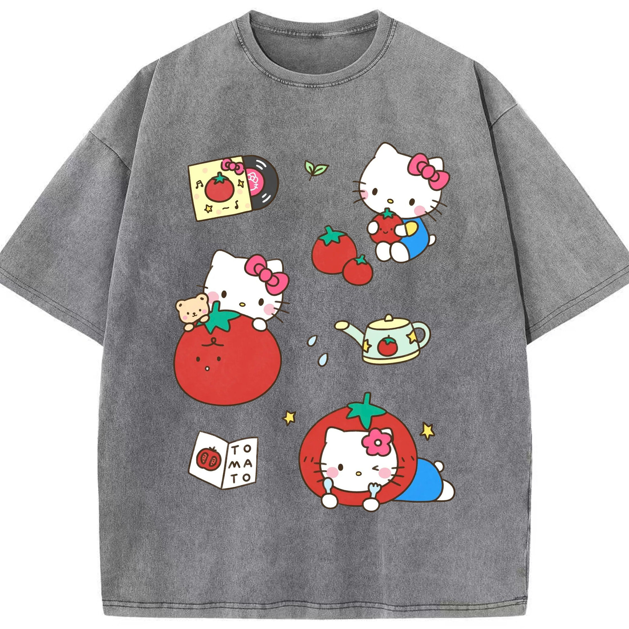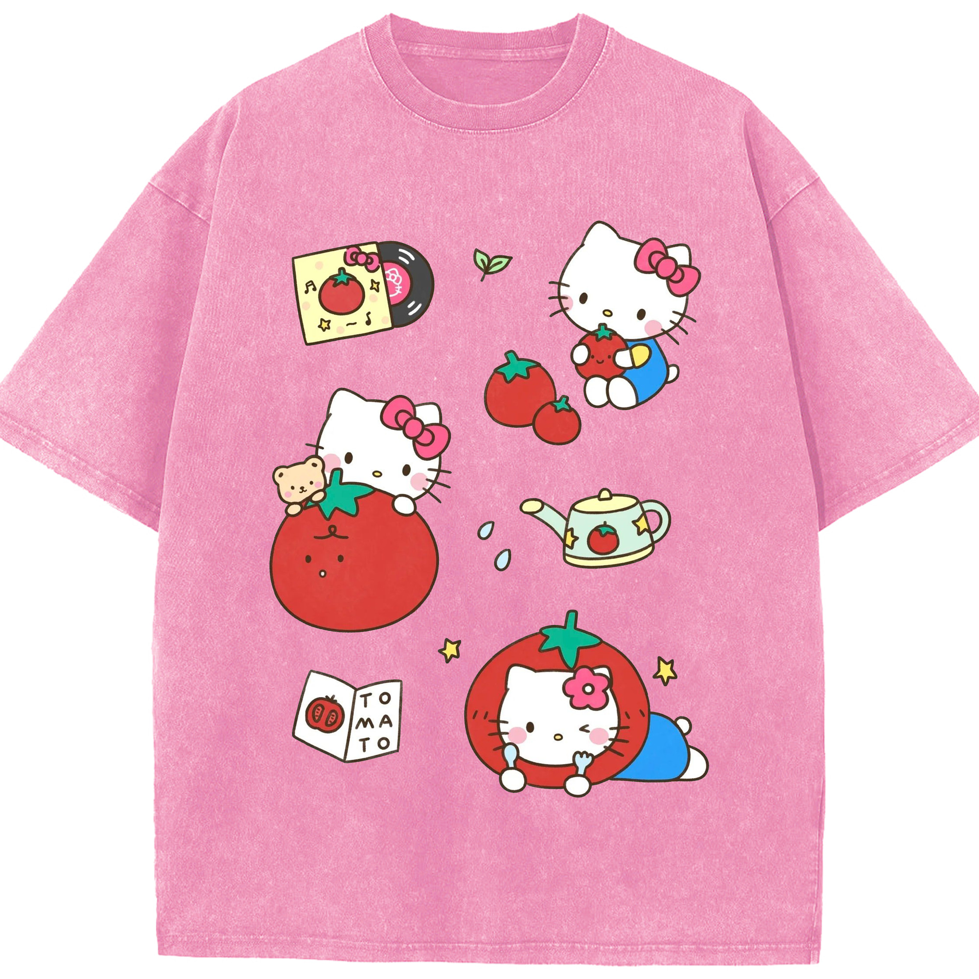 とびきりキュートなハローキティ - 綿100% ヴィンテージ風 半袖Tシャツ ・ 背面プリント ・ 柔らか肌触り ・ 通気性 快適 ・ スポーツ カジュアル 外出用
