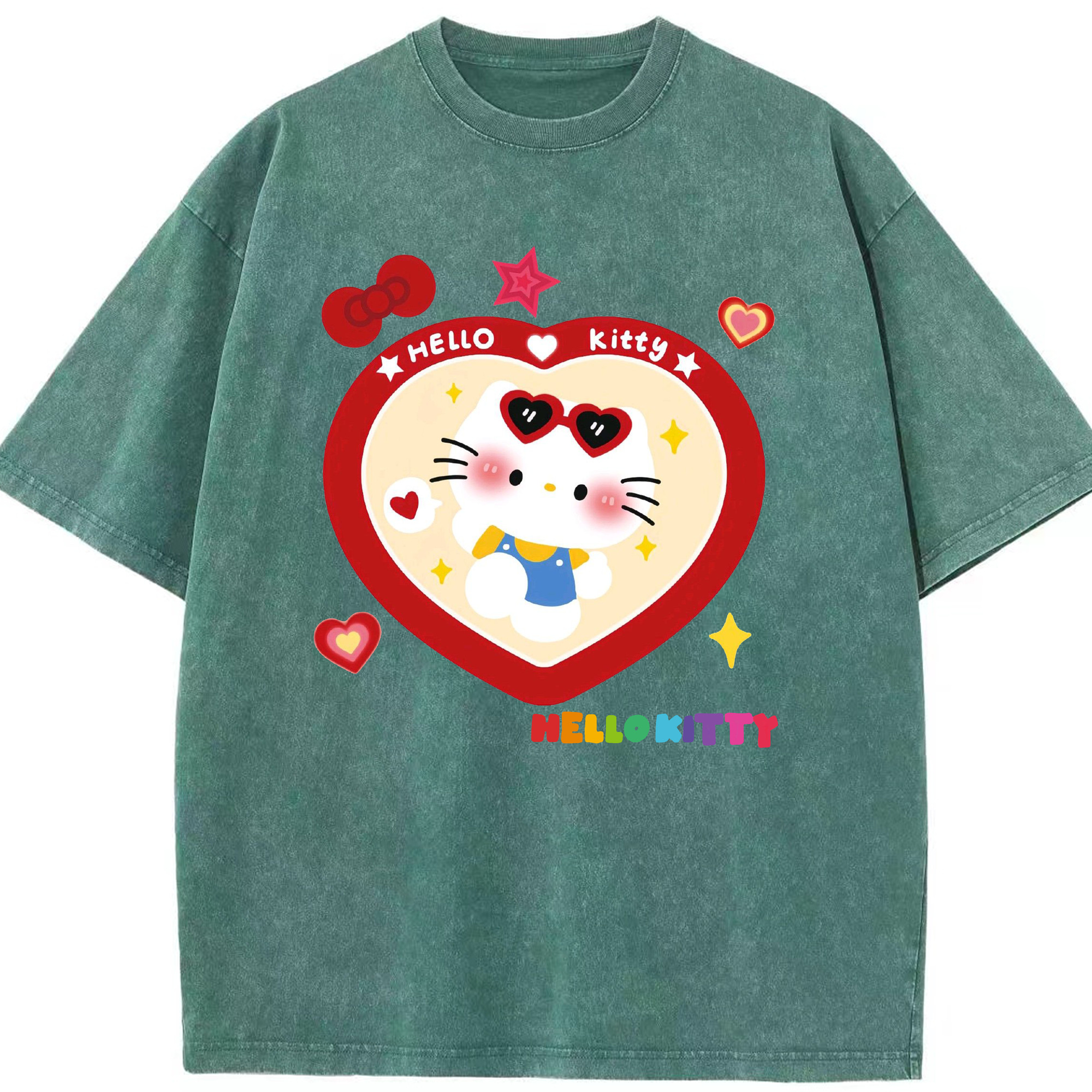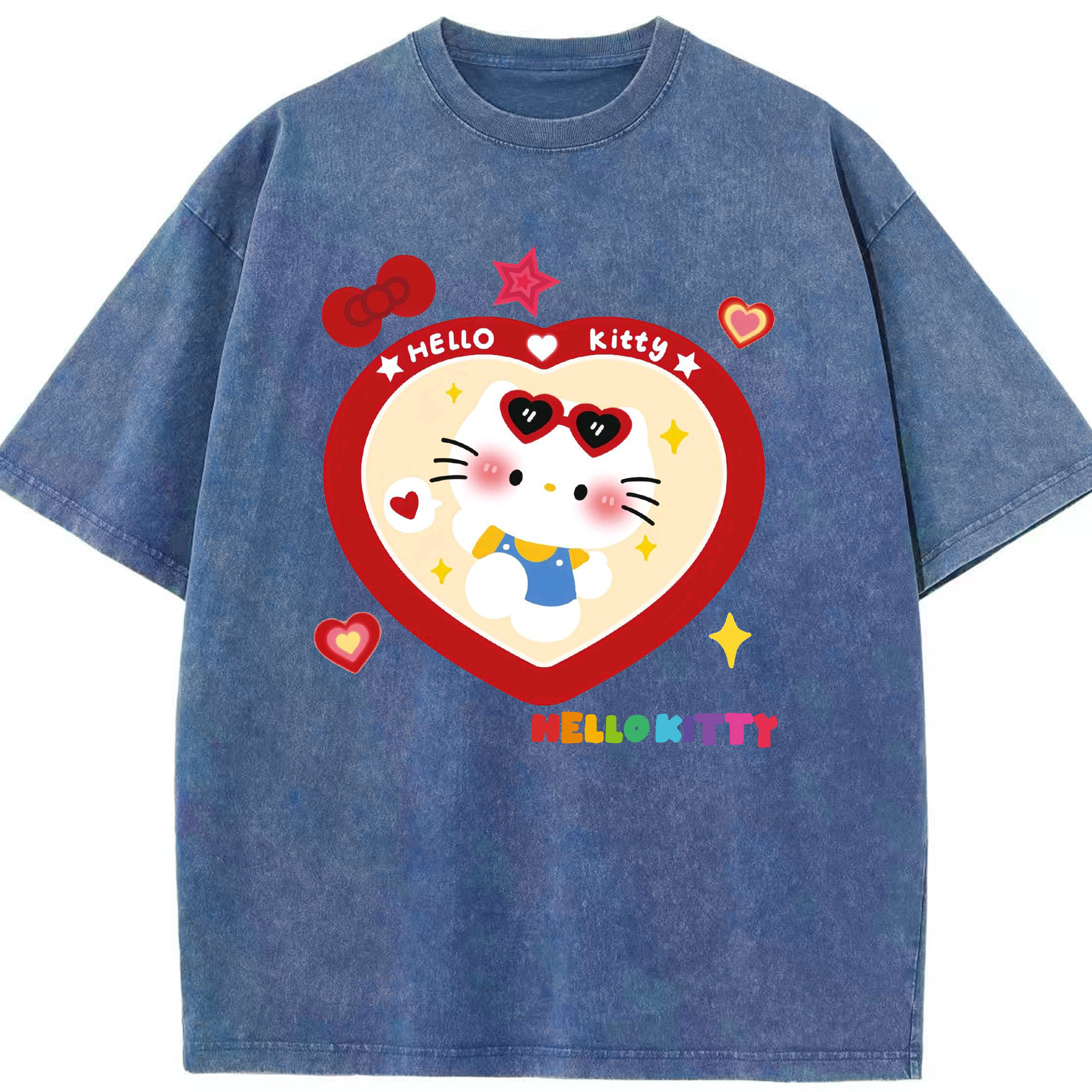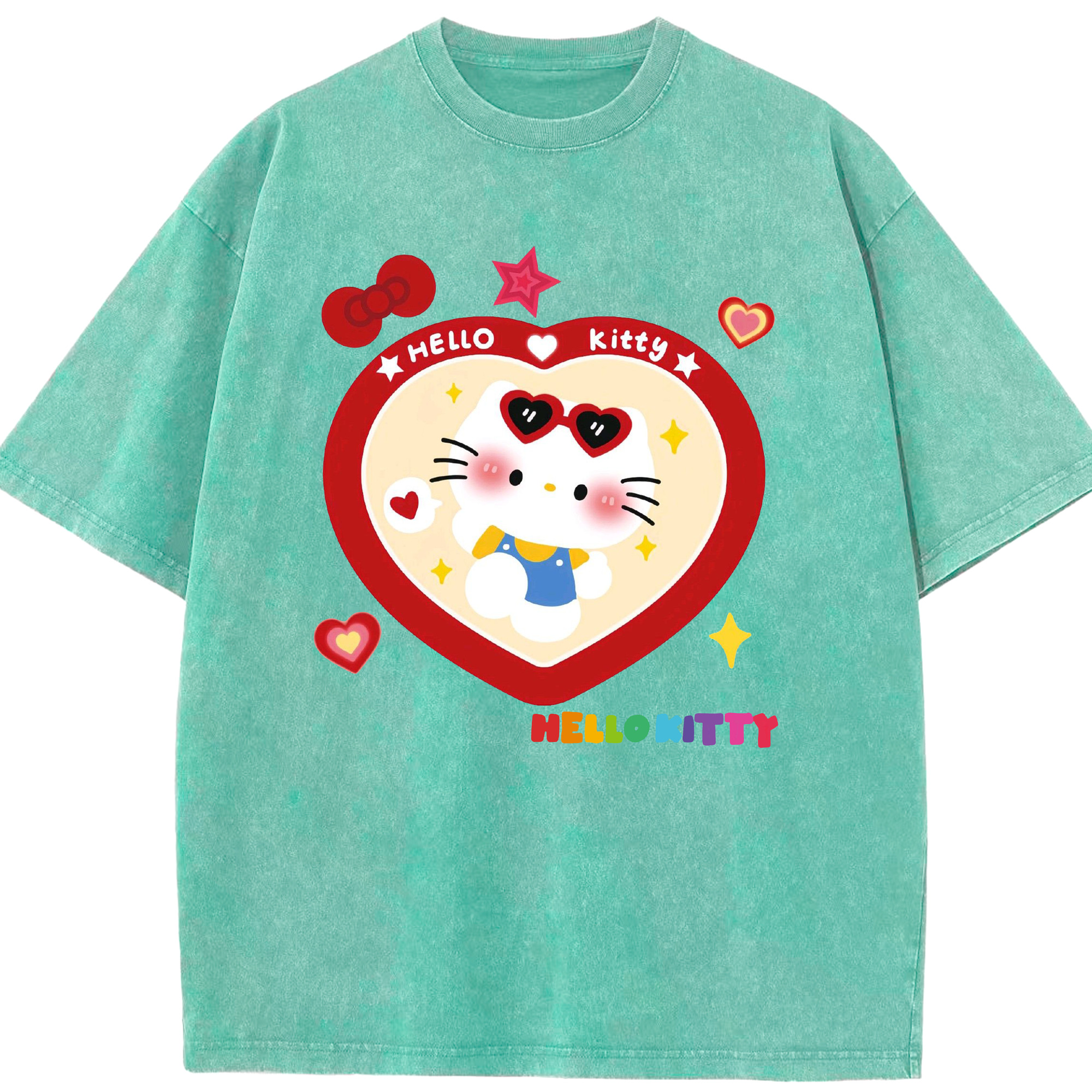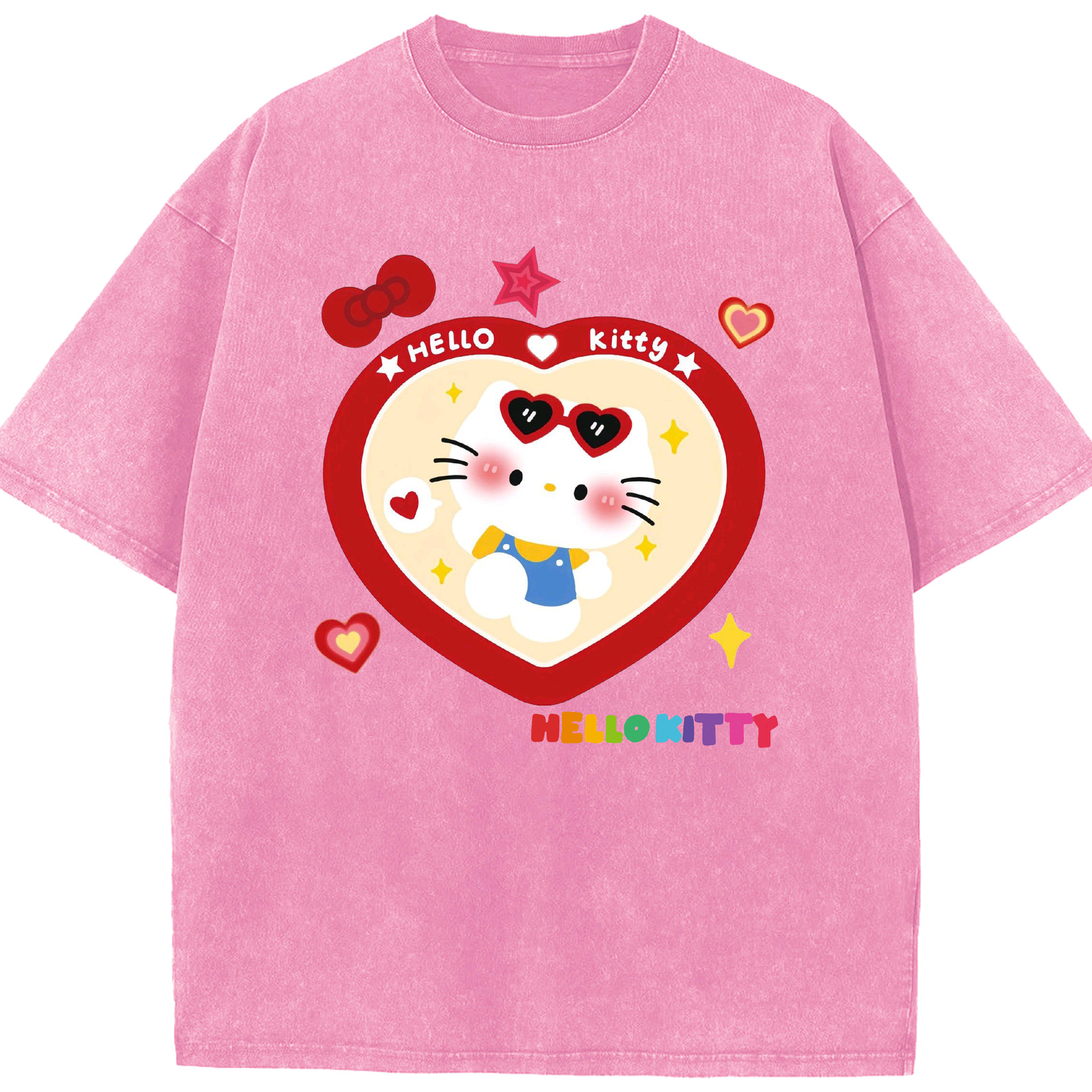 とびきりキュートなハローキティ - 綿100% ヴィンテージ風 半袖Tシャツ ・ フロントプリント ・ 柔らか肌触り ・ 通気性 快適 ・ スポーツ カジュアル 外出用