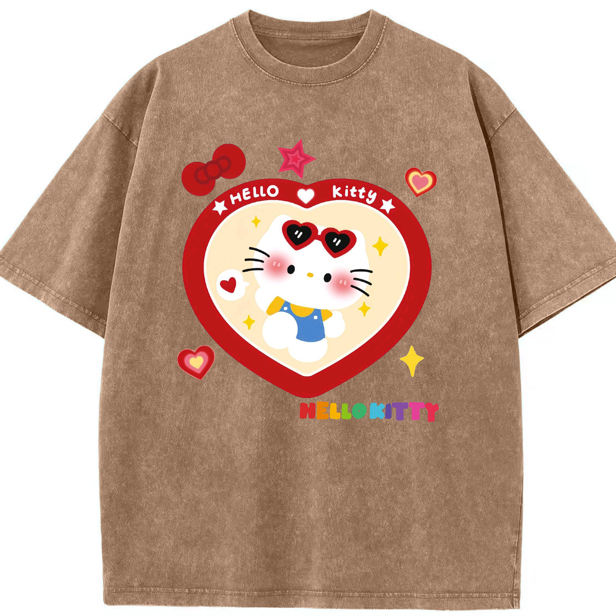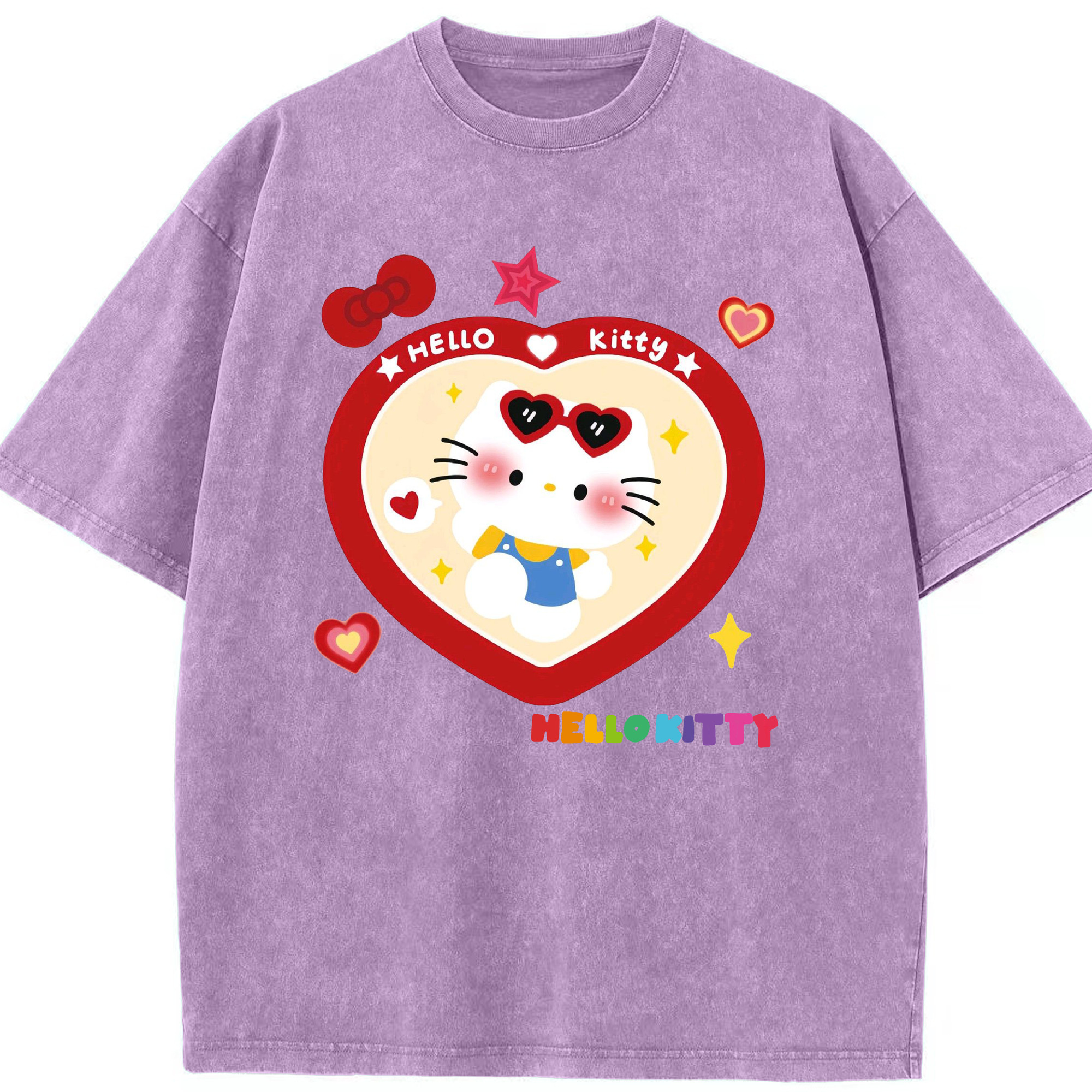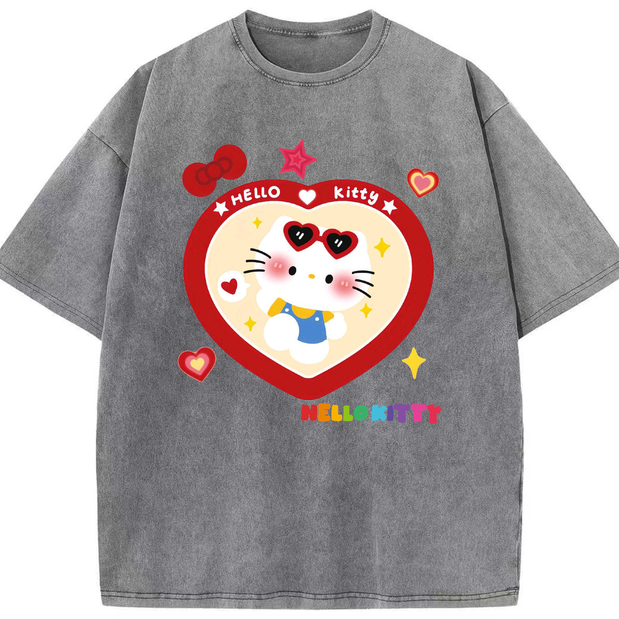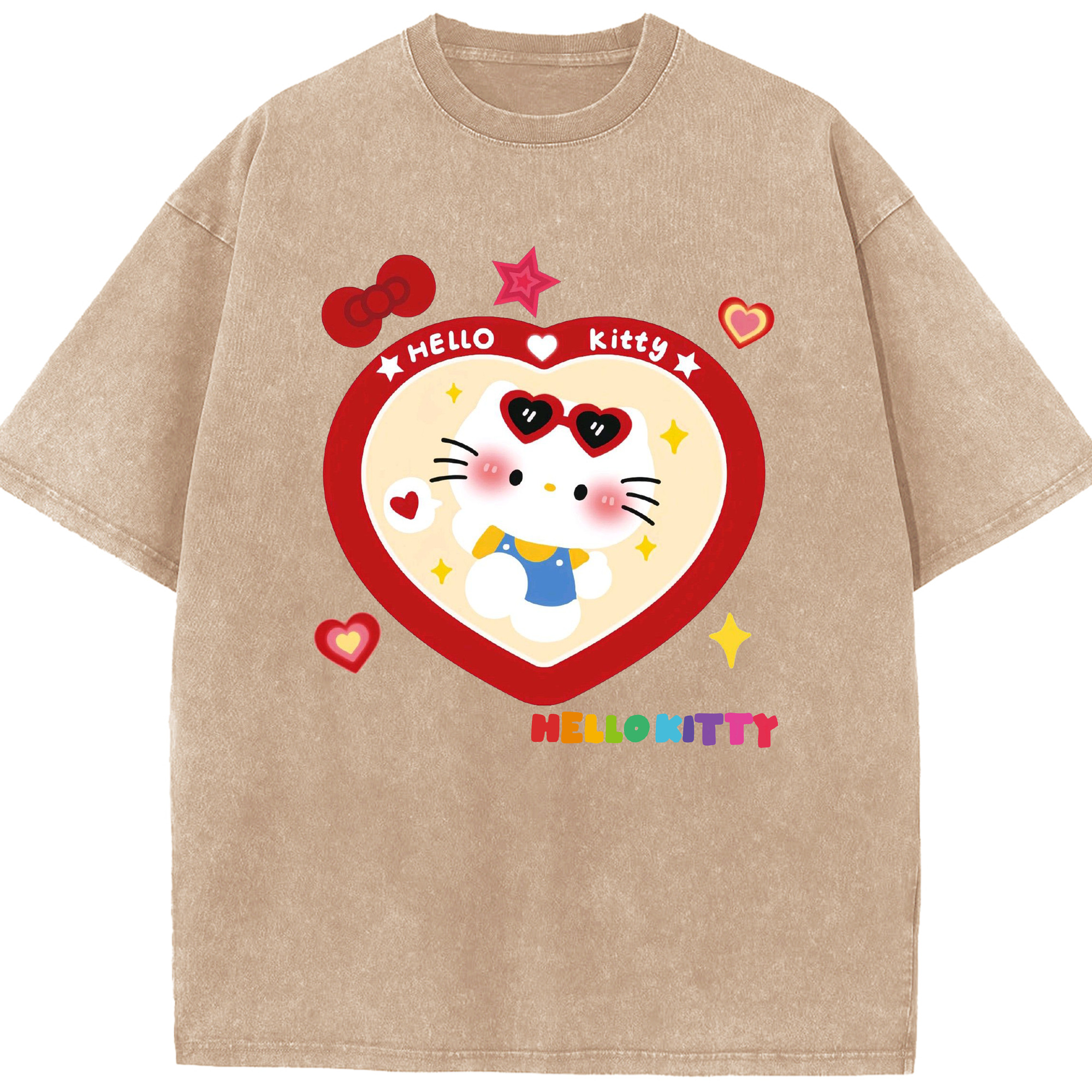 遊び心満載のハローキティ - 綿100% ヴィンテージ風 半袖Tシャツ ・ フロントプリント ・ 柔らか肌触り ・ 通気性 快適 ・ スポーツ カジュアル 外出用