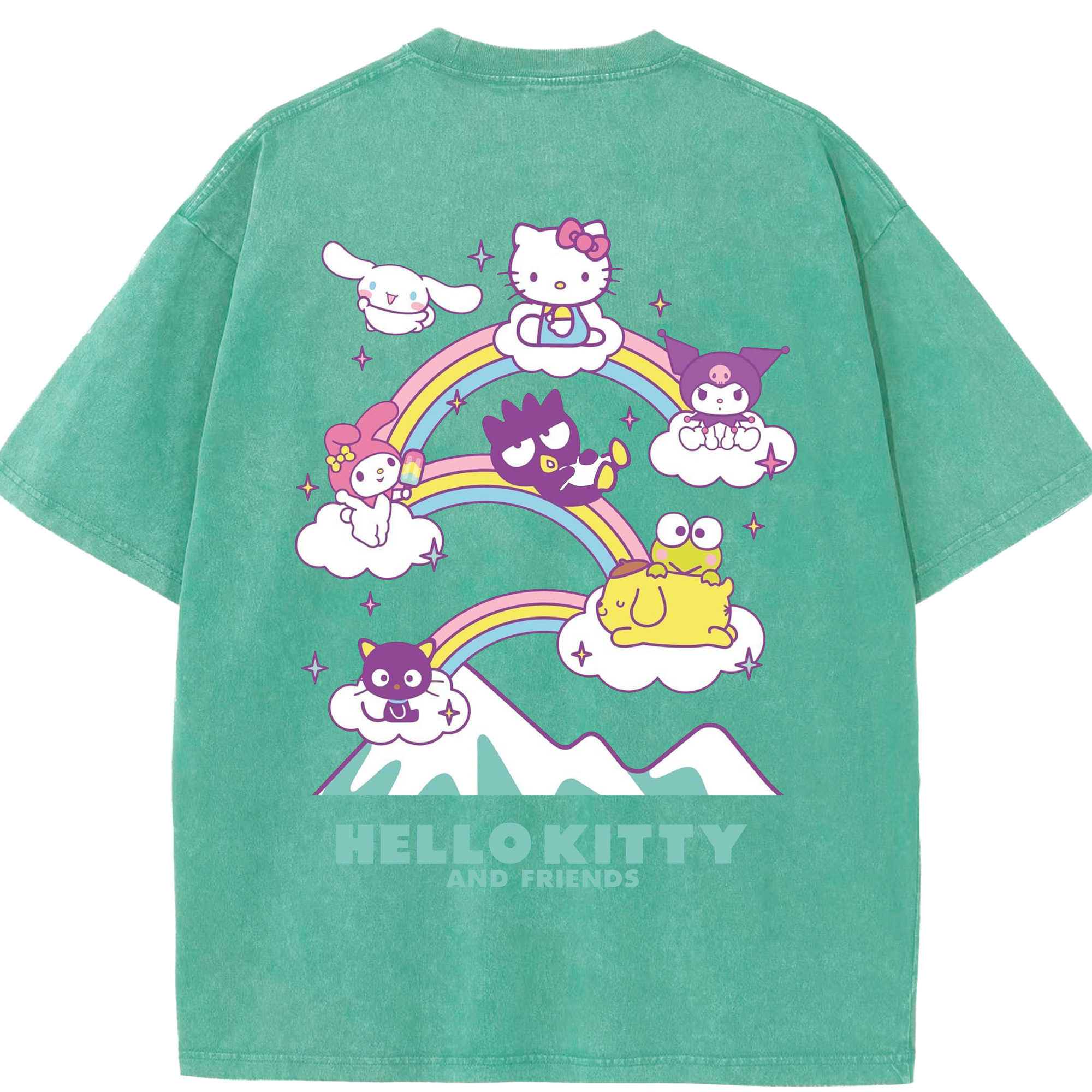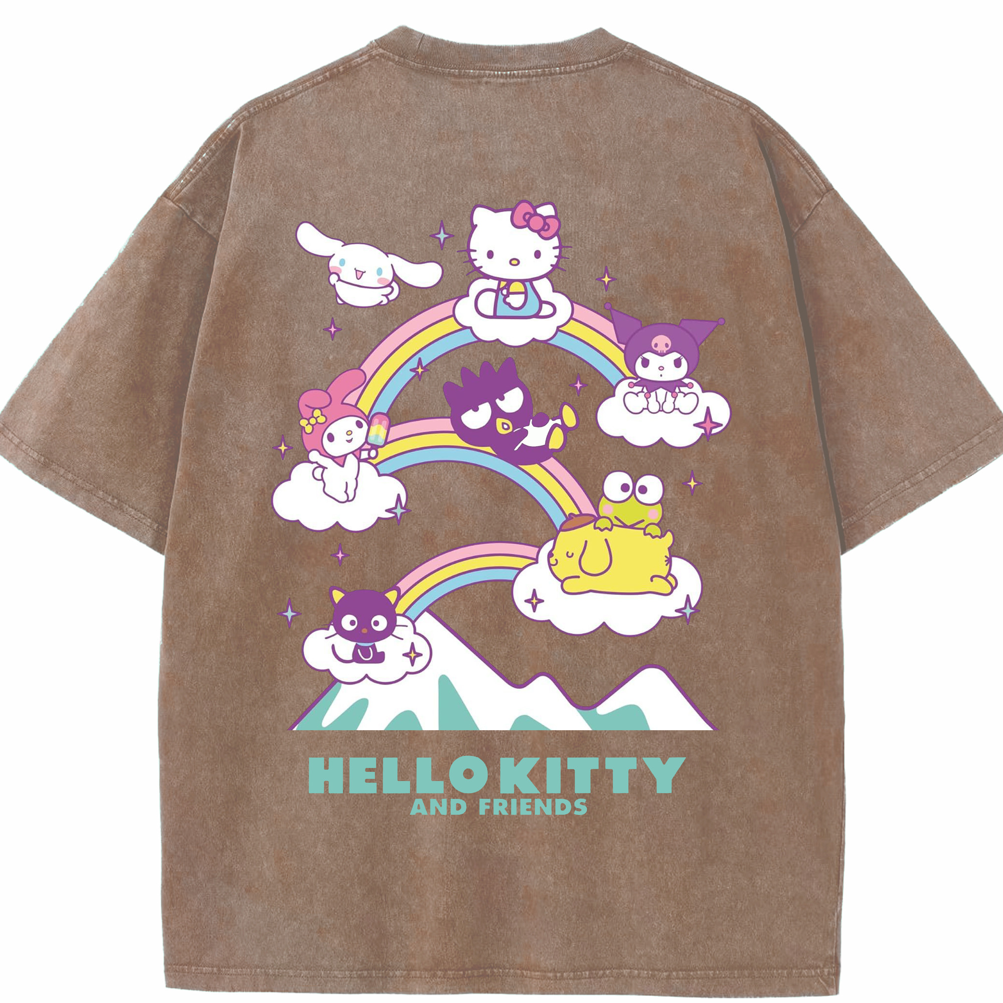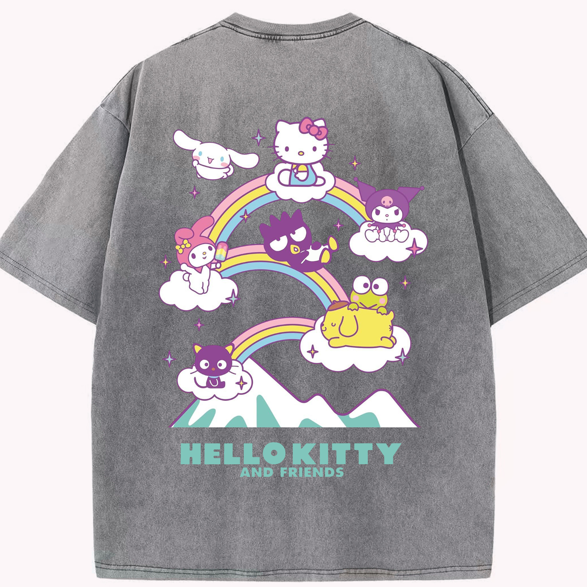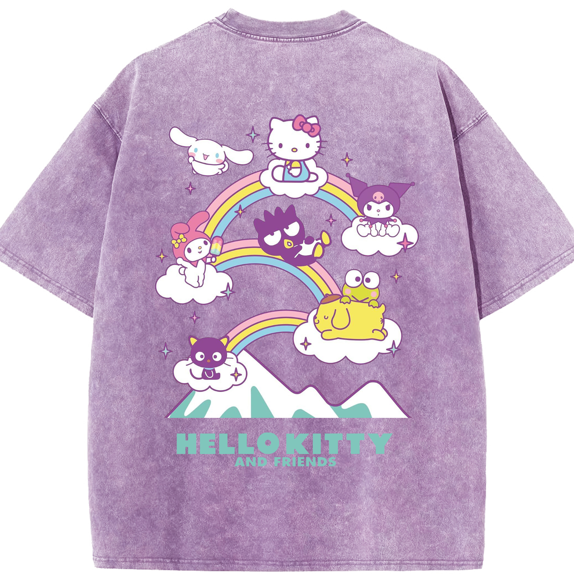 カラフルでポップ!レインボーサンリオ - 綿100% ヴィンテージ風 半袖Tシャツ ・ フロントプリント ・ 柔らか肌触り ・ 通気性 快適 ・ スポーツ カジュアル 外出用