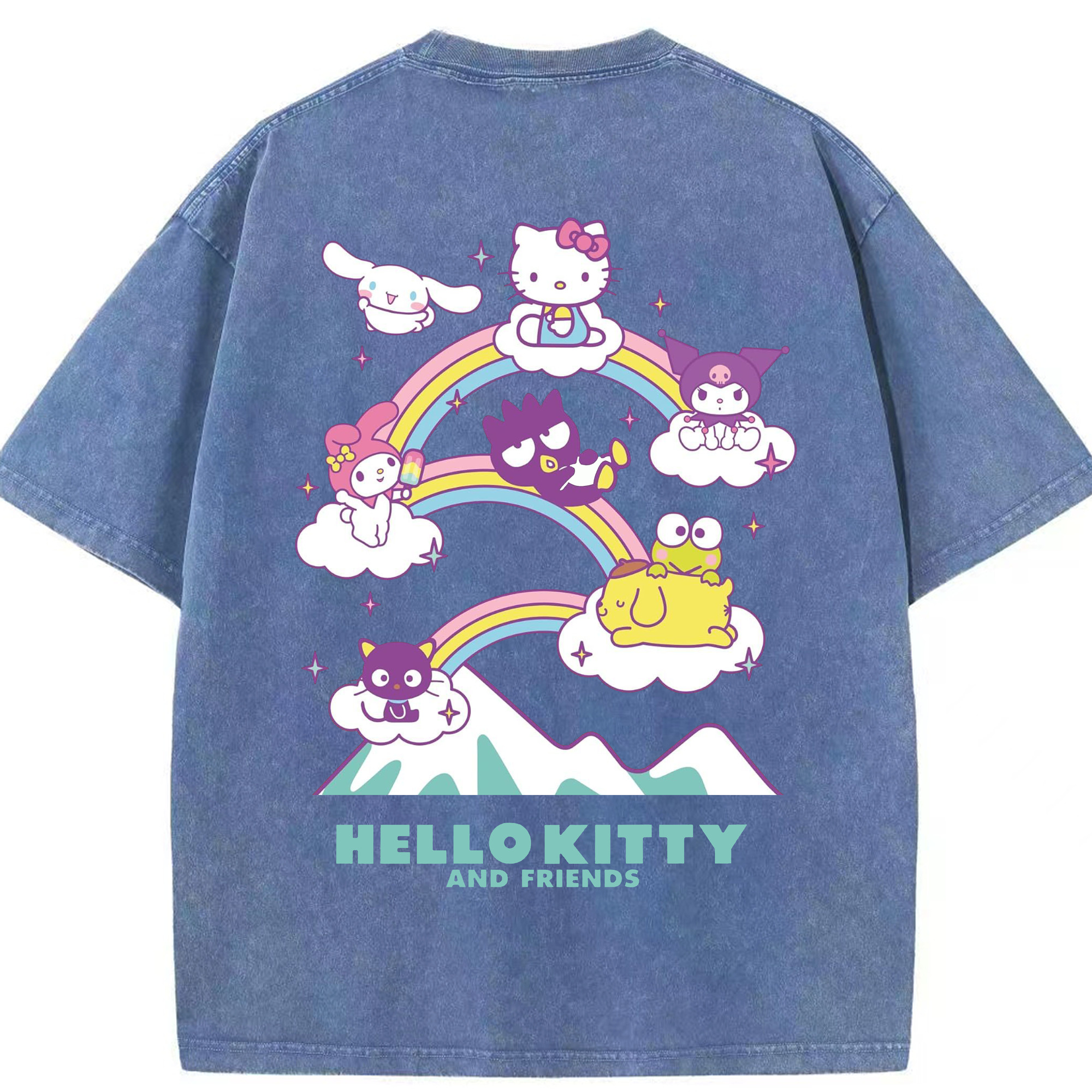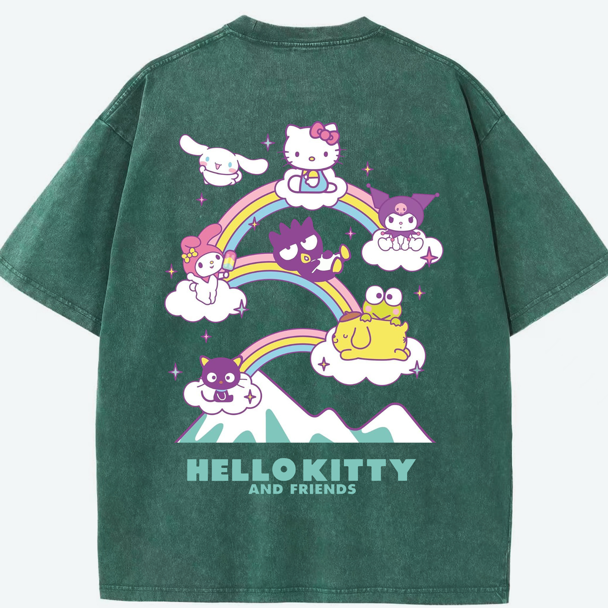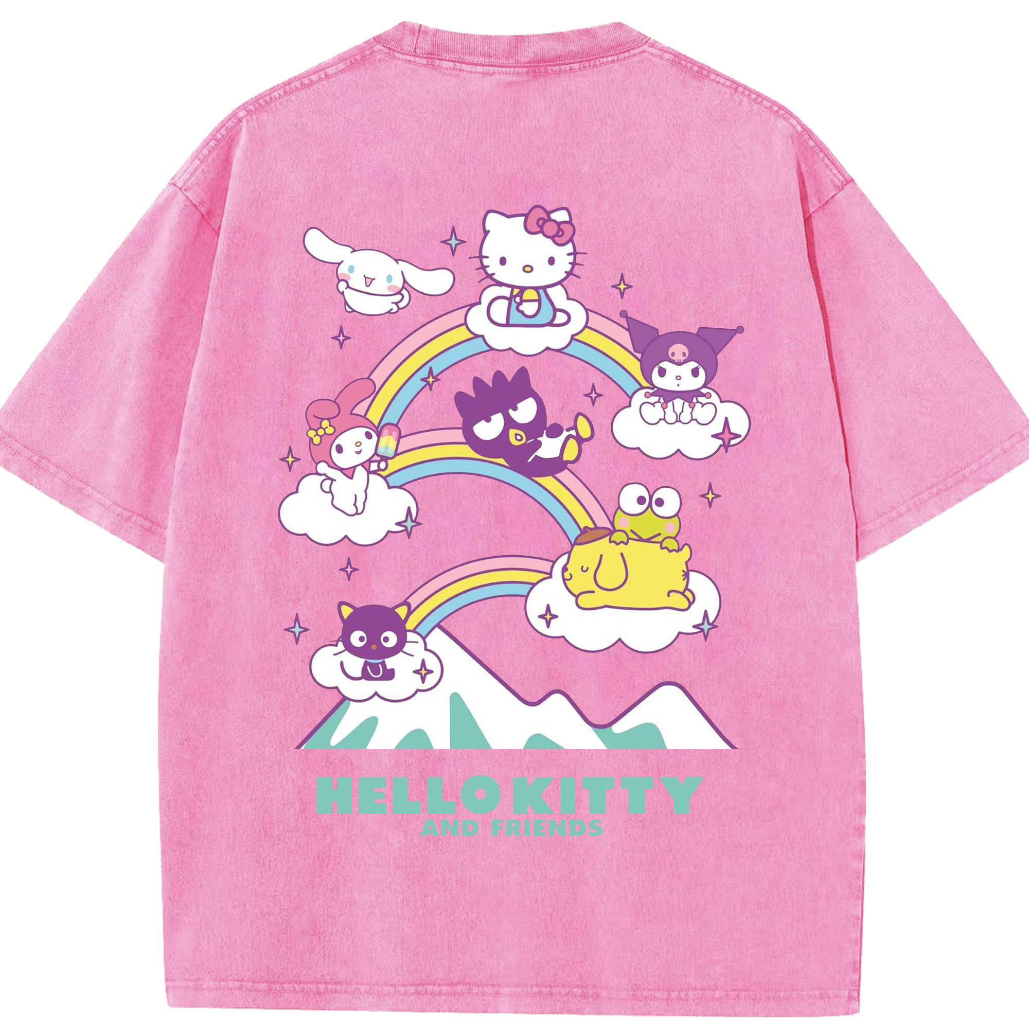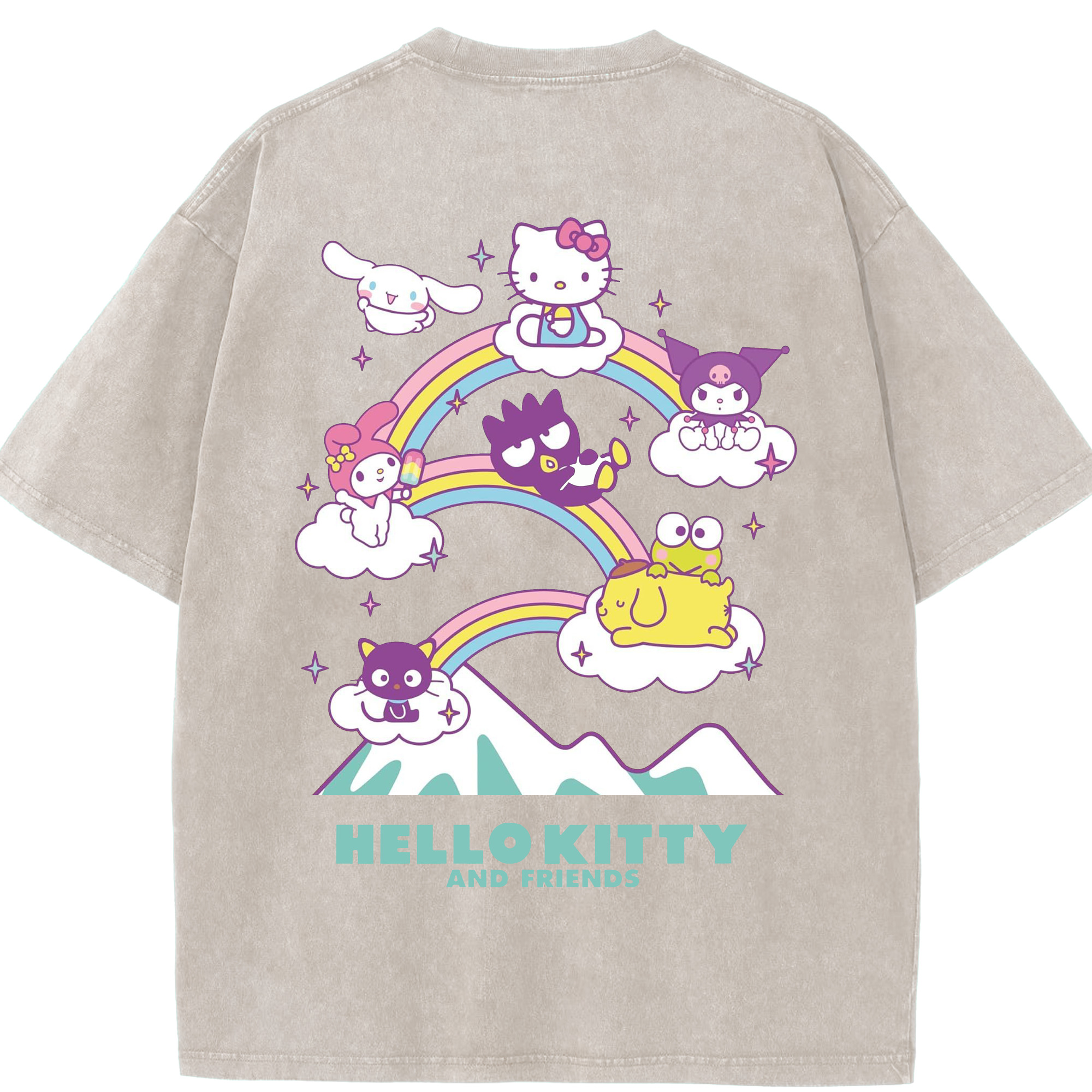 カラフルでポップ!レインボーサンリオ - 綿100% ヴィンテージ風 半袖Tシャツ ・ フロントプリント ・ 柔らか肌触り ・ 通気性 快適 ・ スポーツ カジュアル 外出用
