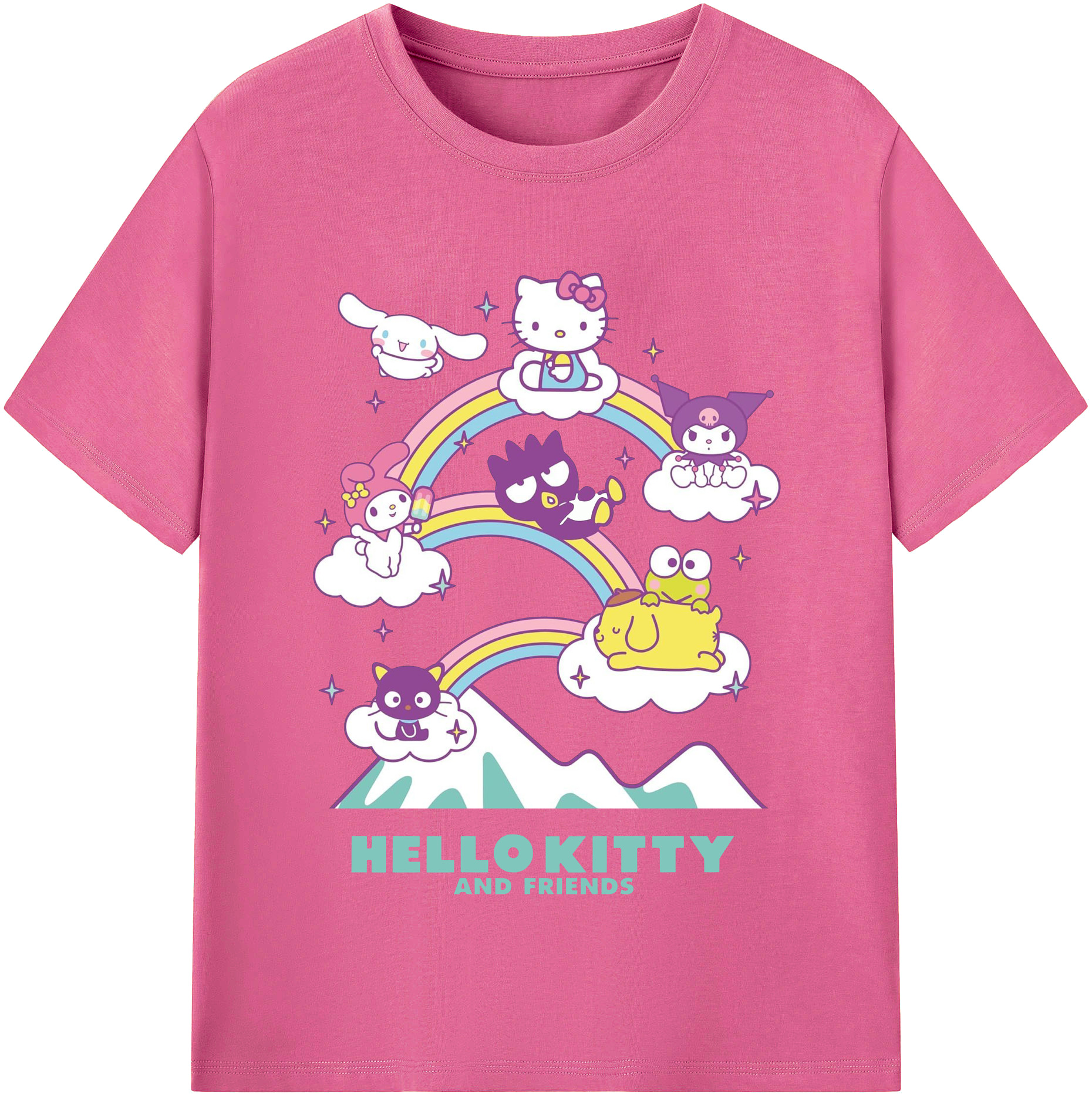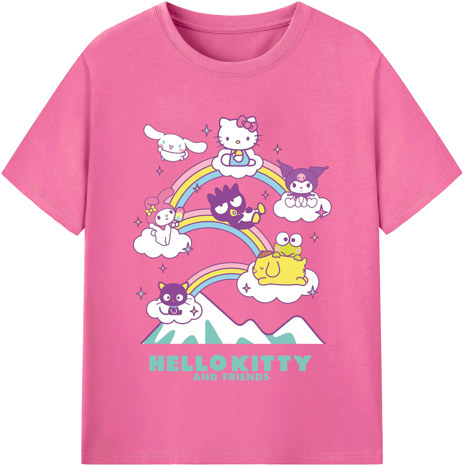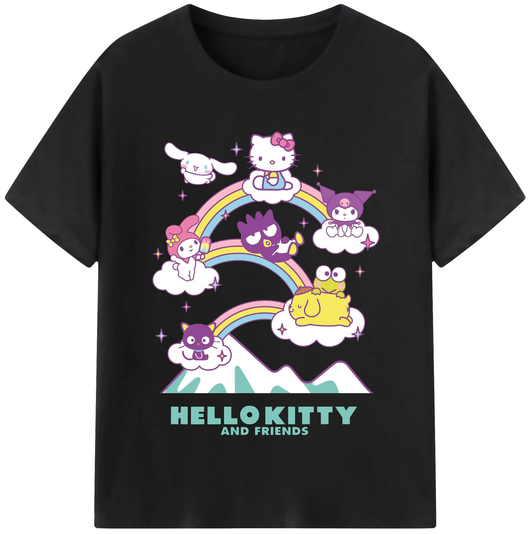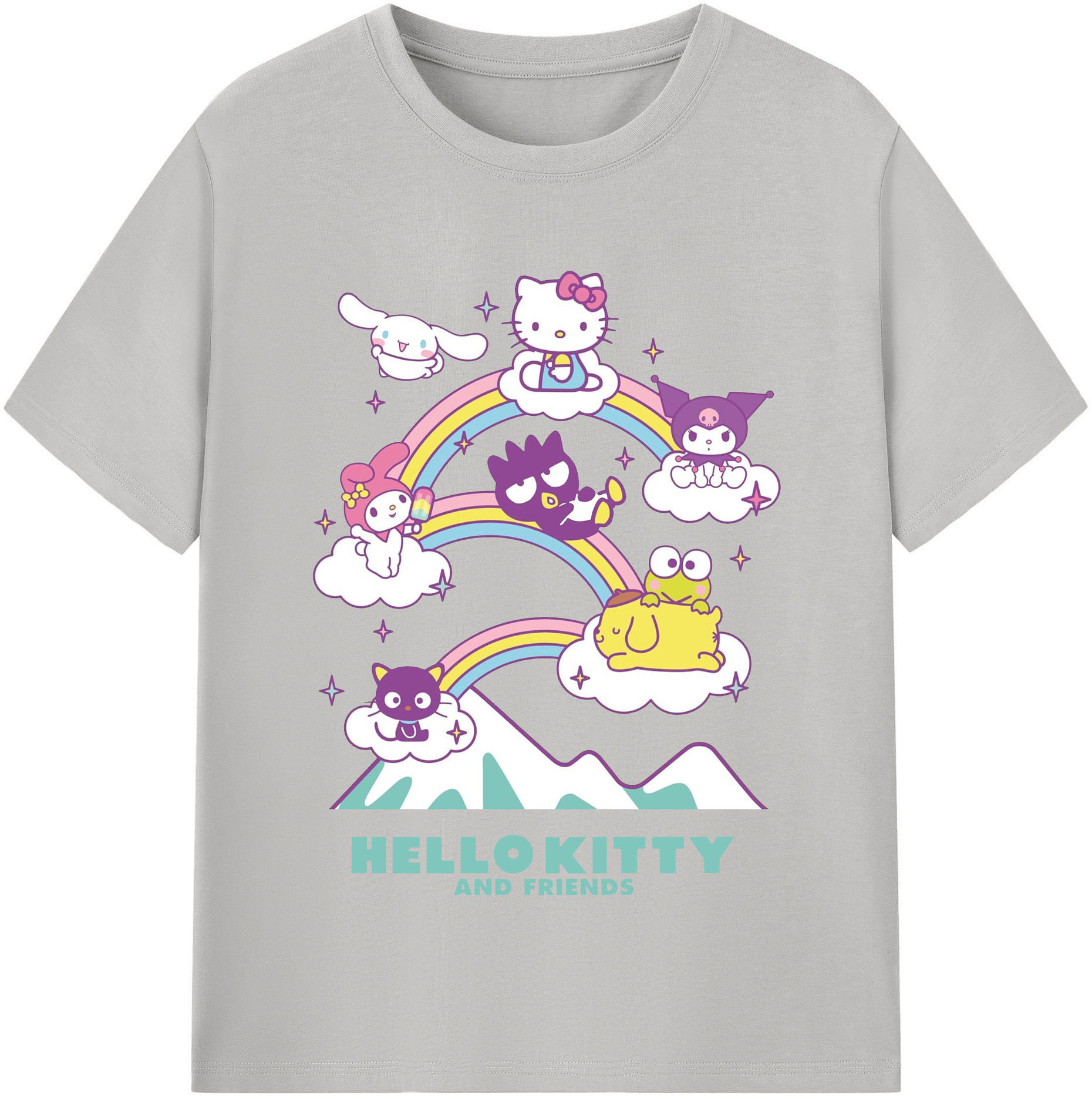 カラフルでポップ!レインボーサンリオ - レディースカジュアルプリントTシャツ ・ 綿100% ・ クルーネック ・ フロントプリント ・ 柔らかく快適 ・ フィットネス カジュアル 旅行用