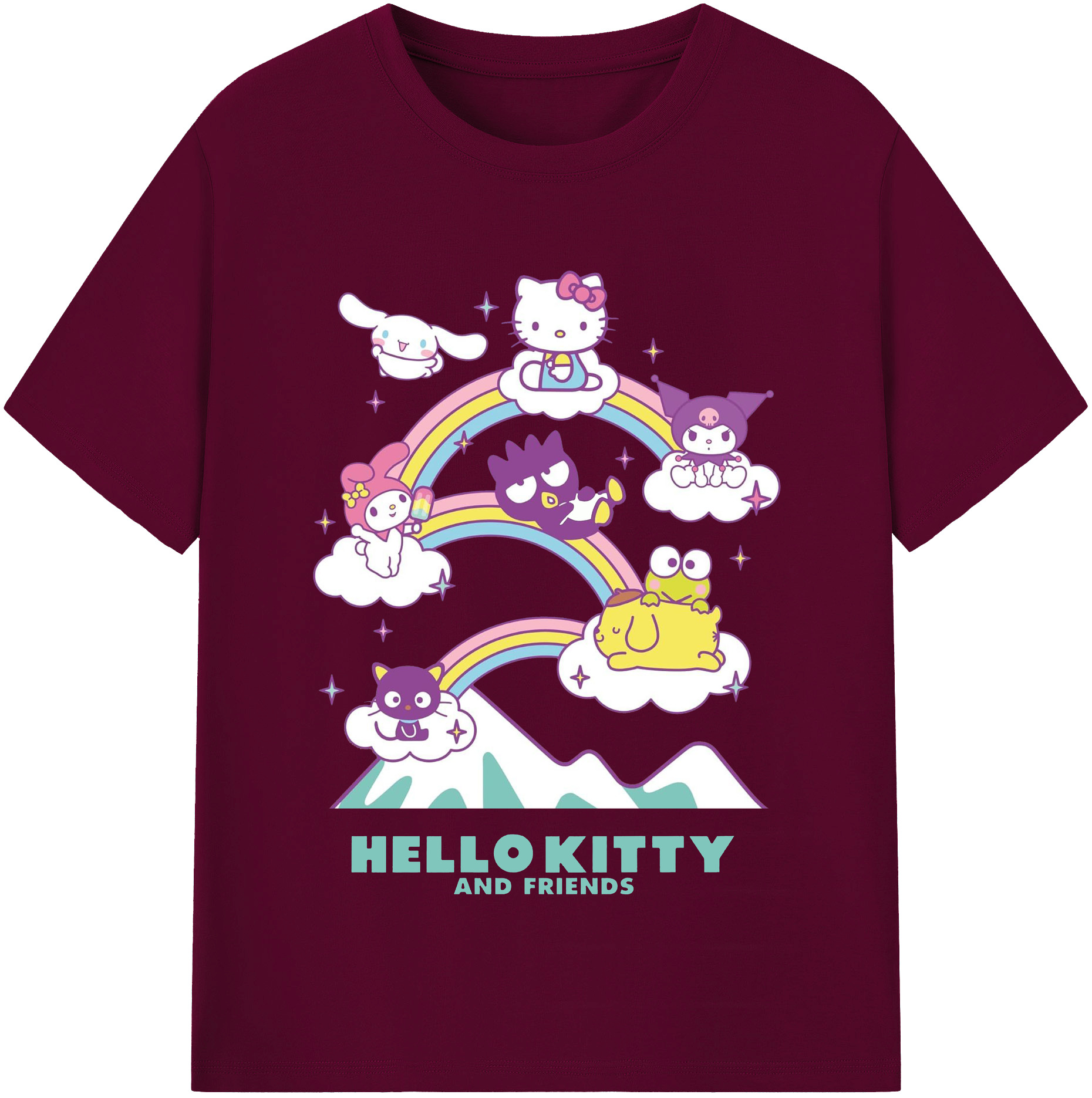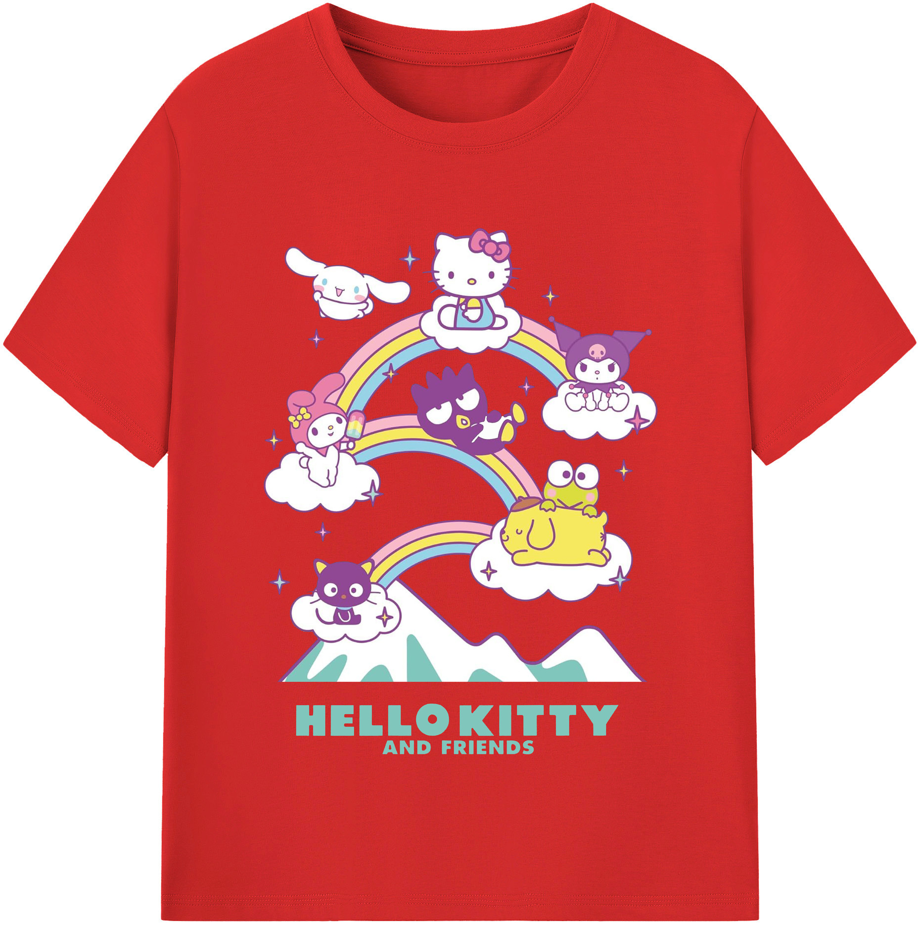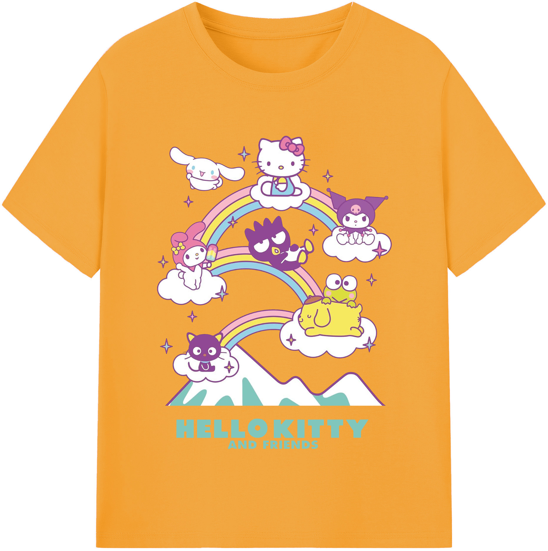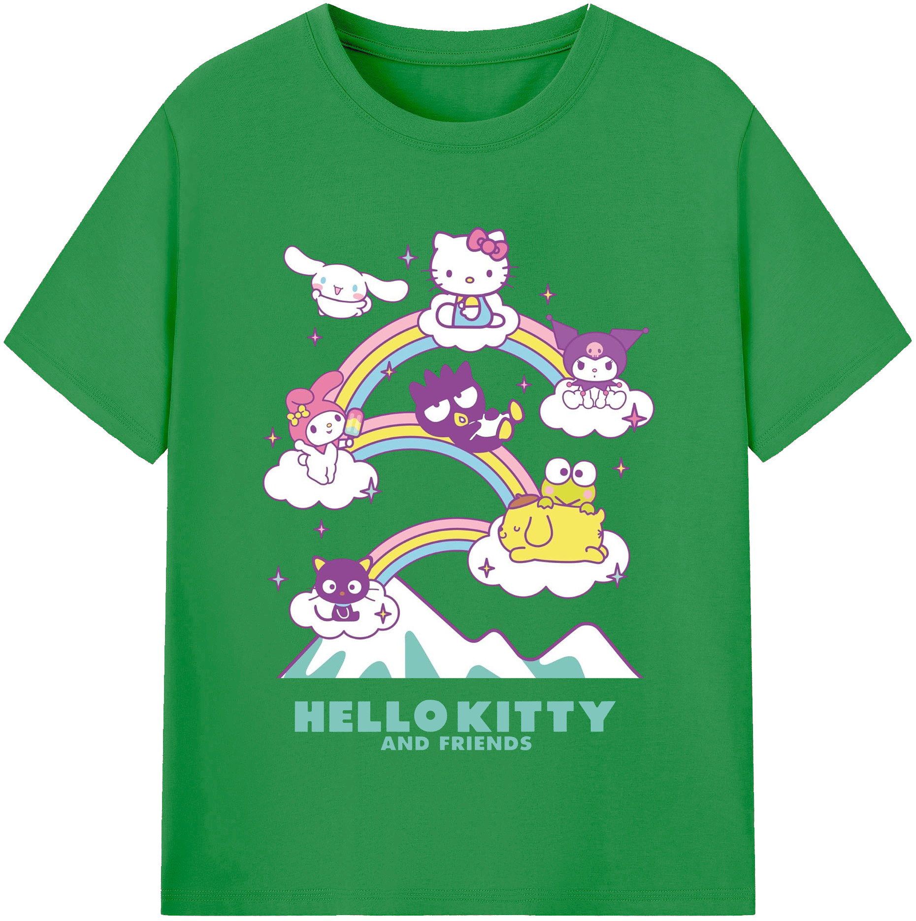 カラフルでポップ!レインボーサンリオ - レディースカジュアルプリントTシャツ ・ 綿100% ・ クルーネック ・ フロントプリント ・ 柔らかく快適 ・ フィットネス カジュアル 旅行用