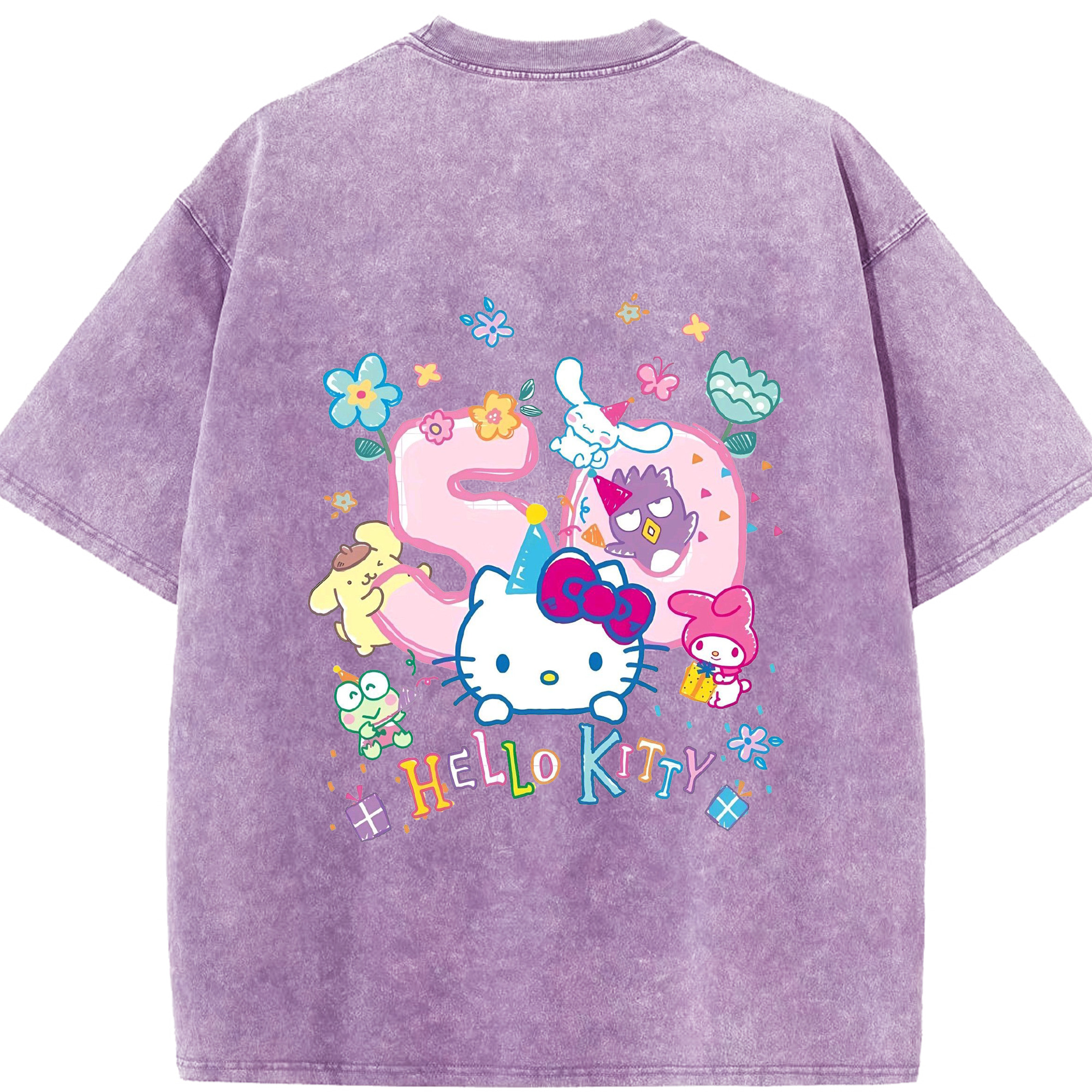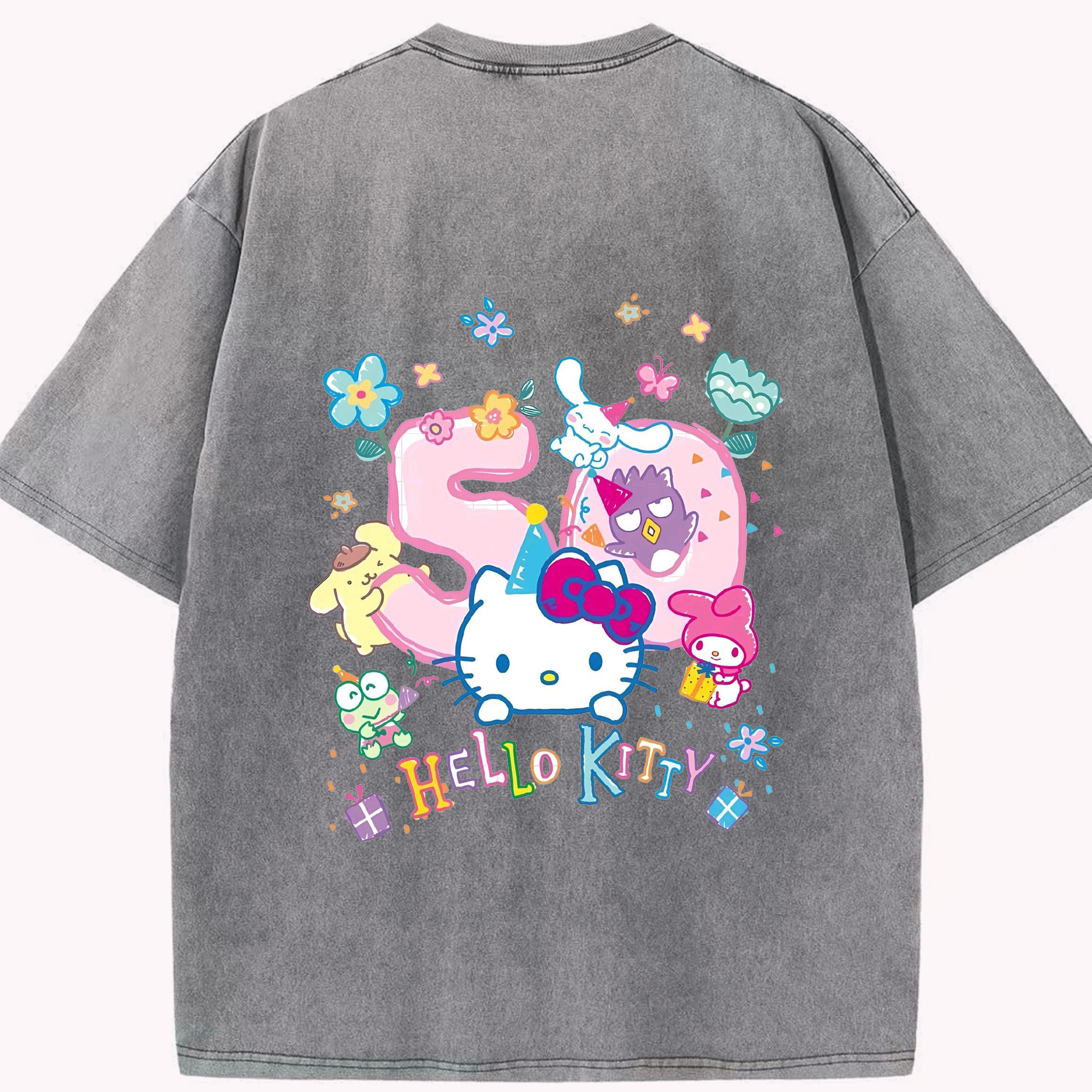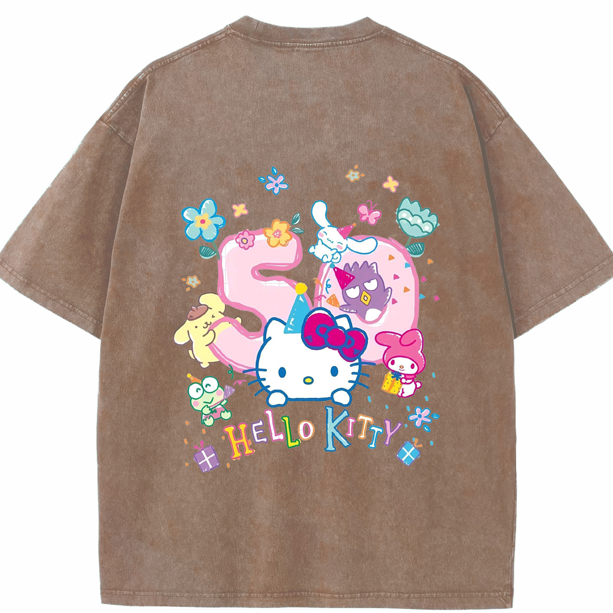 サンリオファミリー 2025年新作 - 綿100% ヴィンテージ風 半袖Tシャツ ・ 背面プリント ・ 柔らか肌触り ・ 通気性 快適 ・ スポーツ カジュアル 外出用