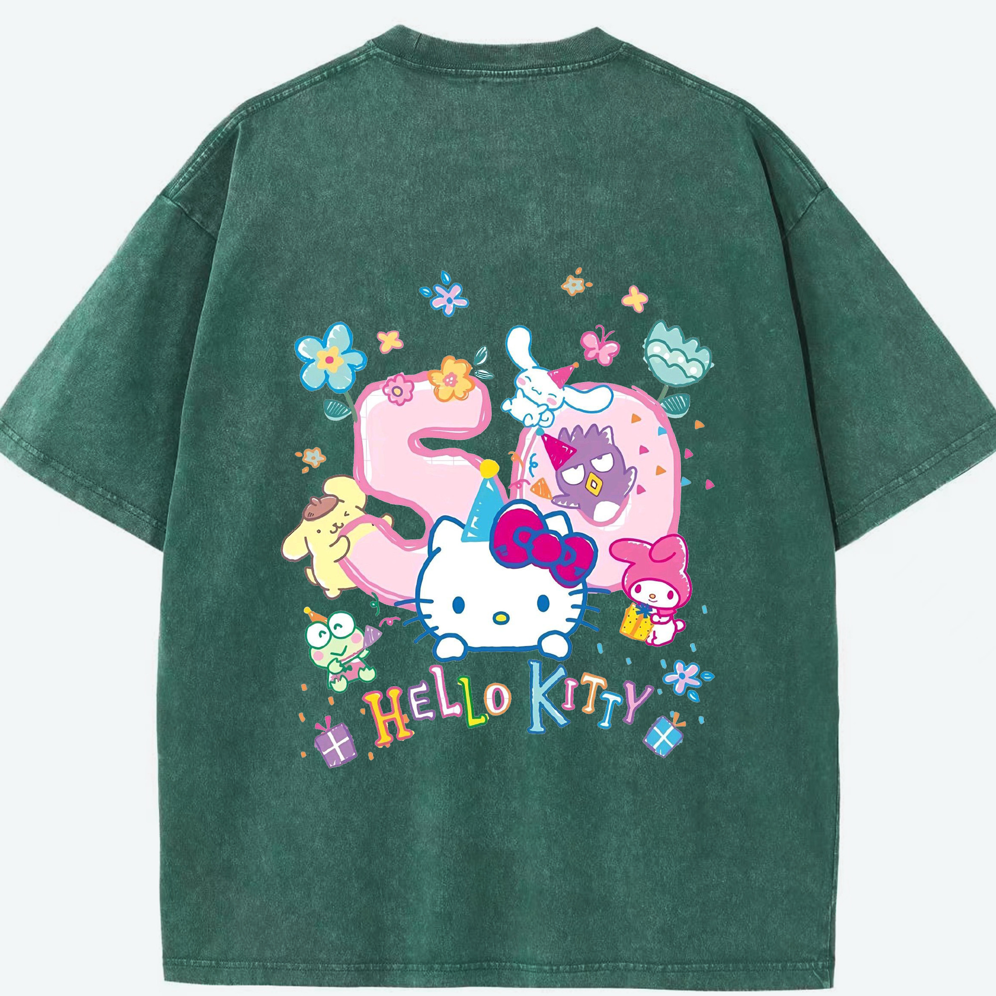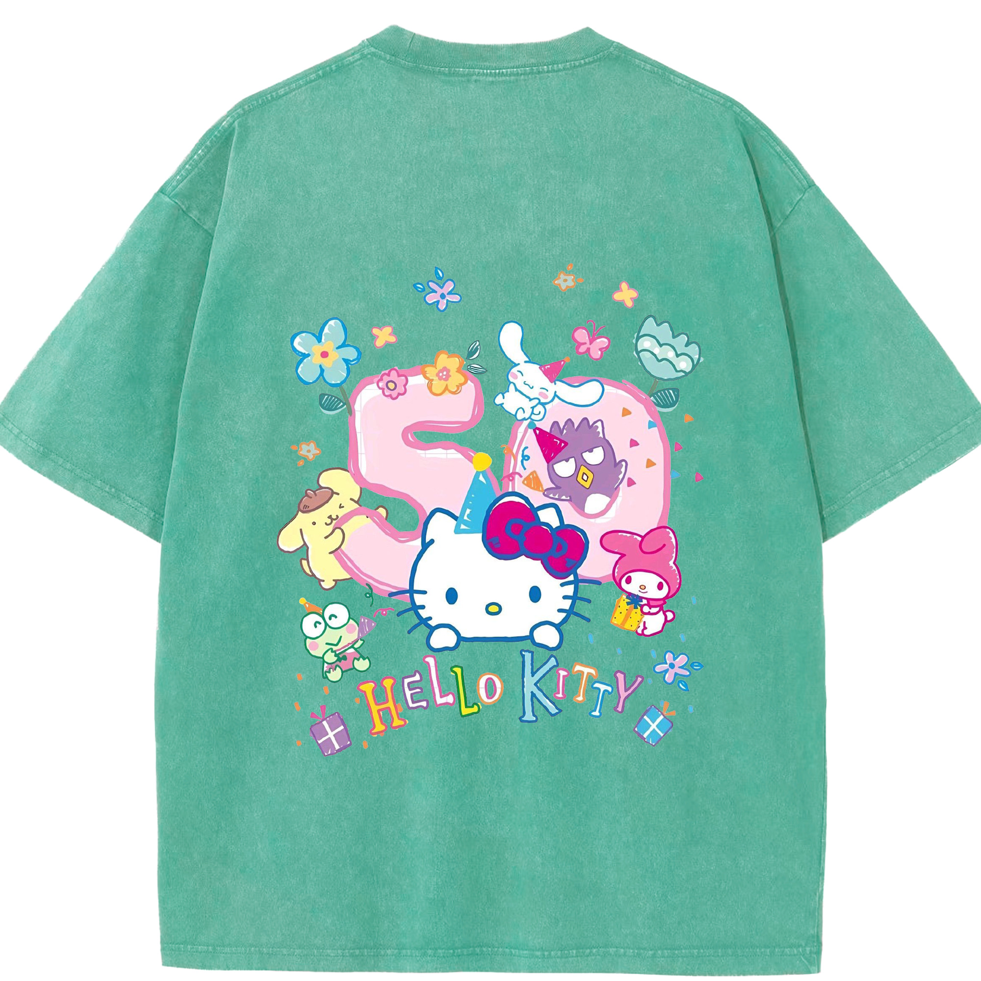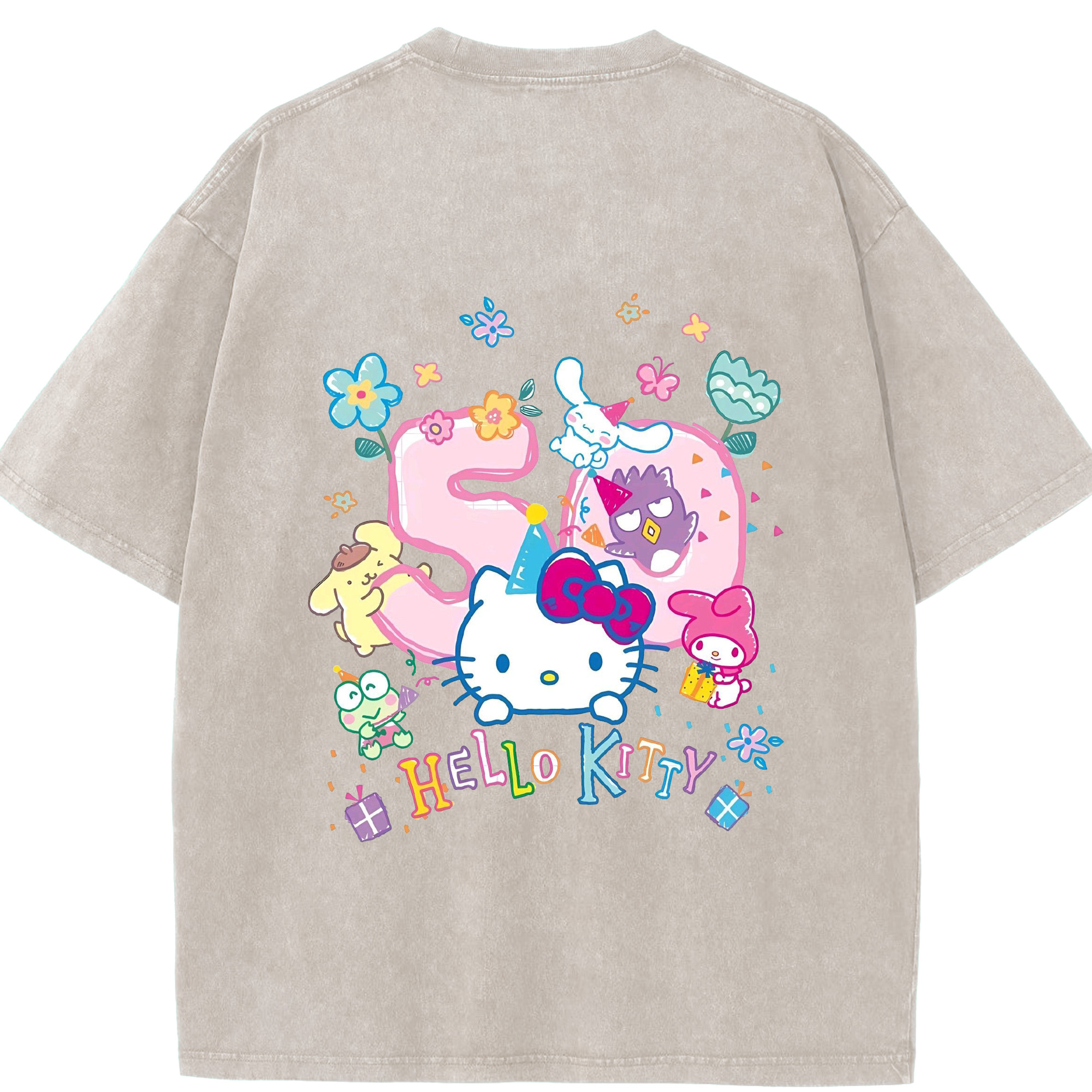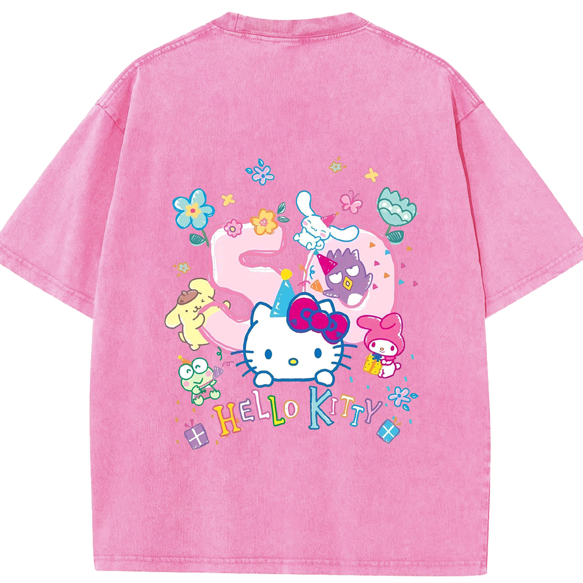 サンリオファミリー 2025年新作 - 綿100% ヴィンテージ風 半袖Tシャツ ・ 背面プリント ・ 柔らか肌触り ・ 通気性 快適 ・ スポーツ カジュアル 外出用