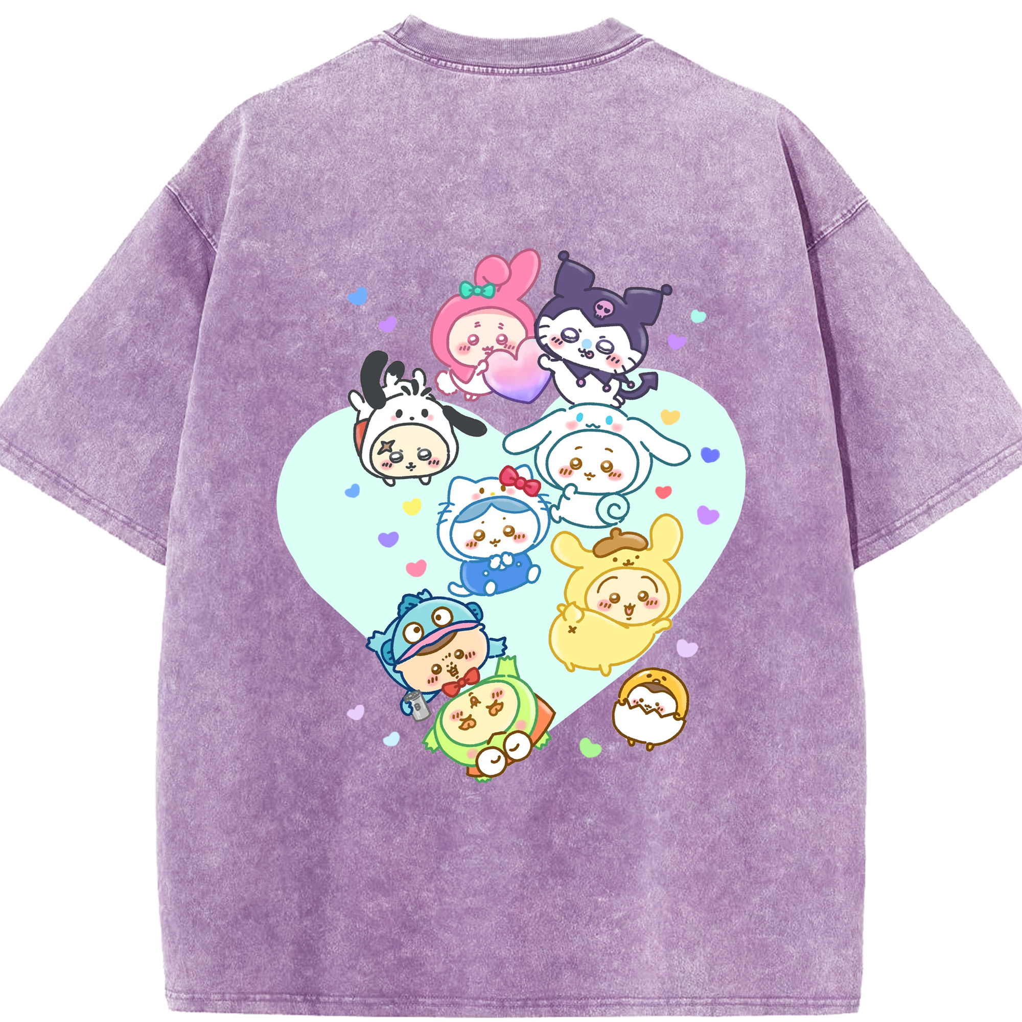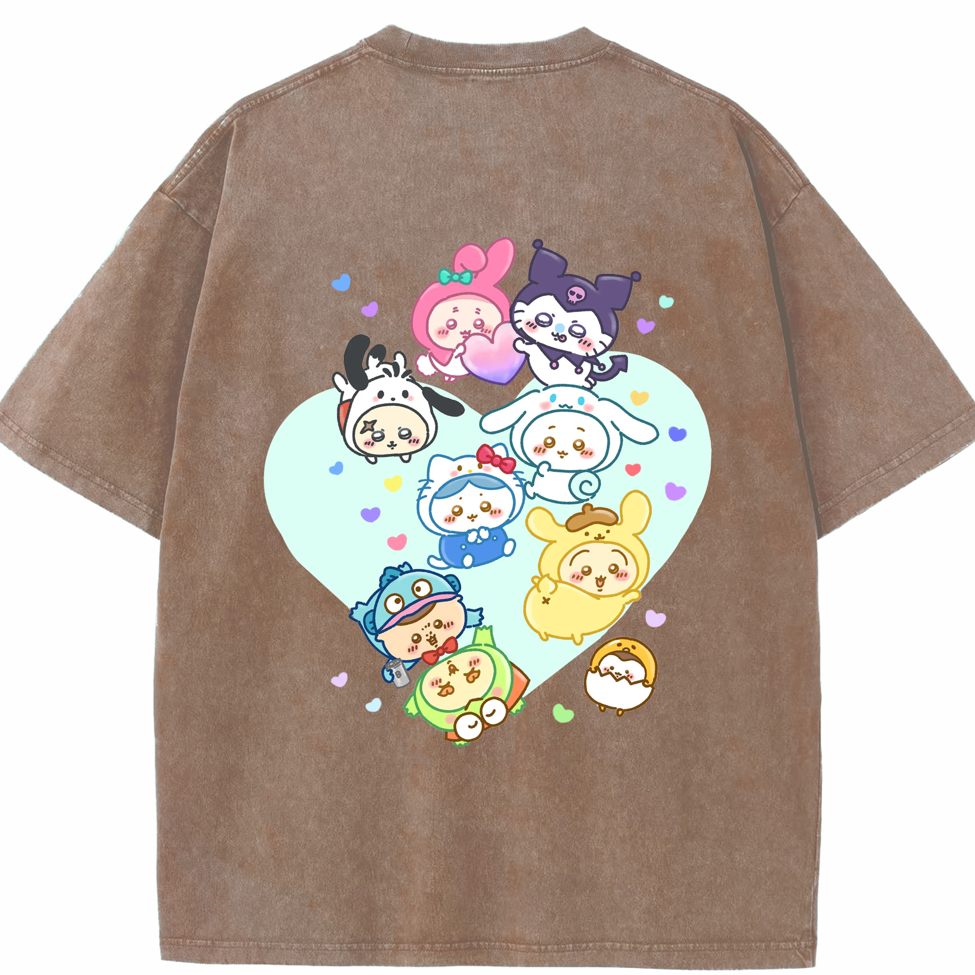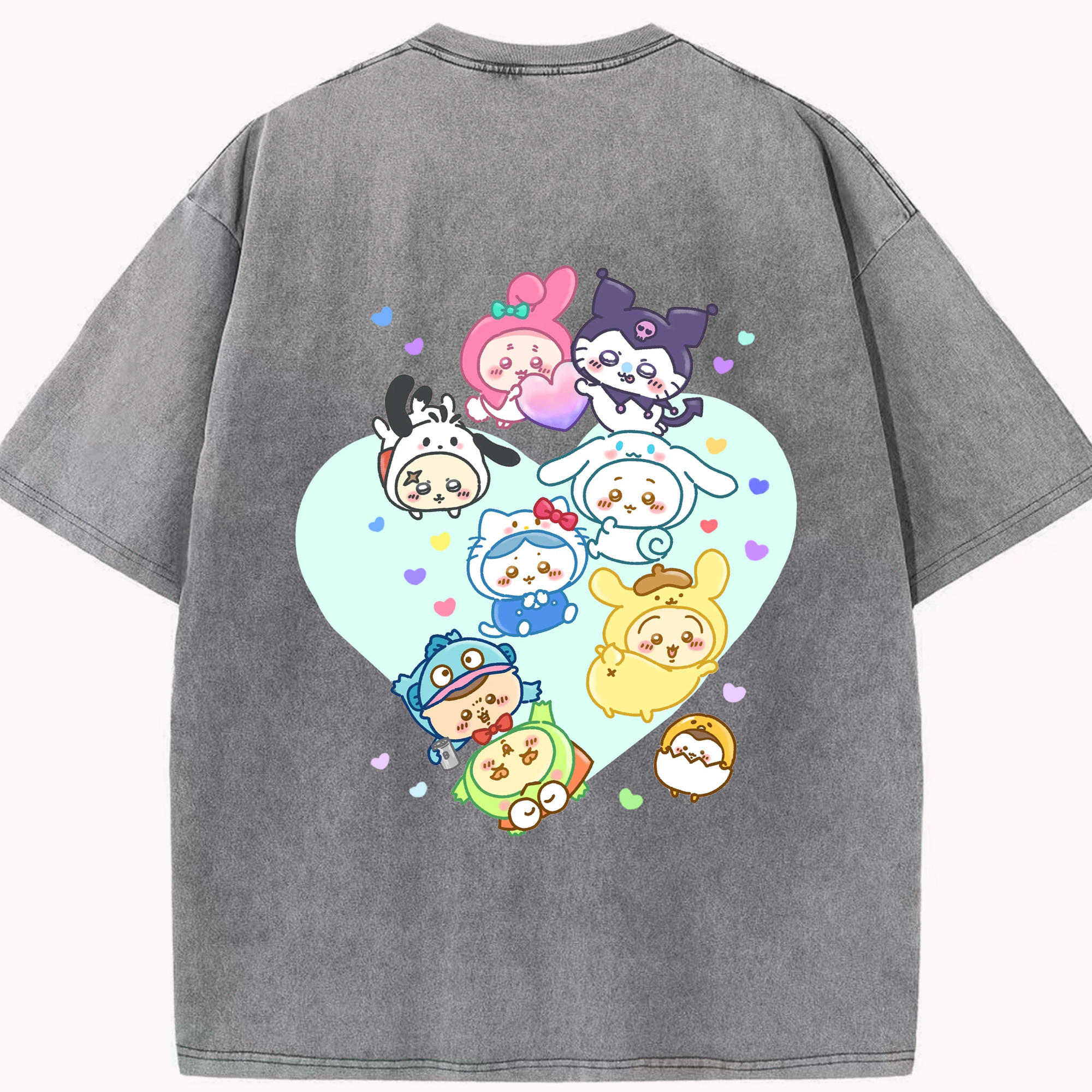 サンリオ&ちいかわ - 綿100% ヴィンテージ風 半袖Tシャツ ・ フロントプリント ・ 柔らか肌触り ・ 通気性 快適 ・ スポーツ カジュアル 外出用