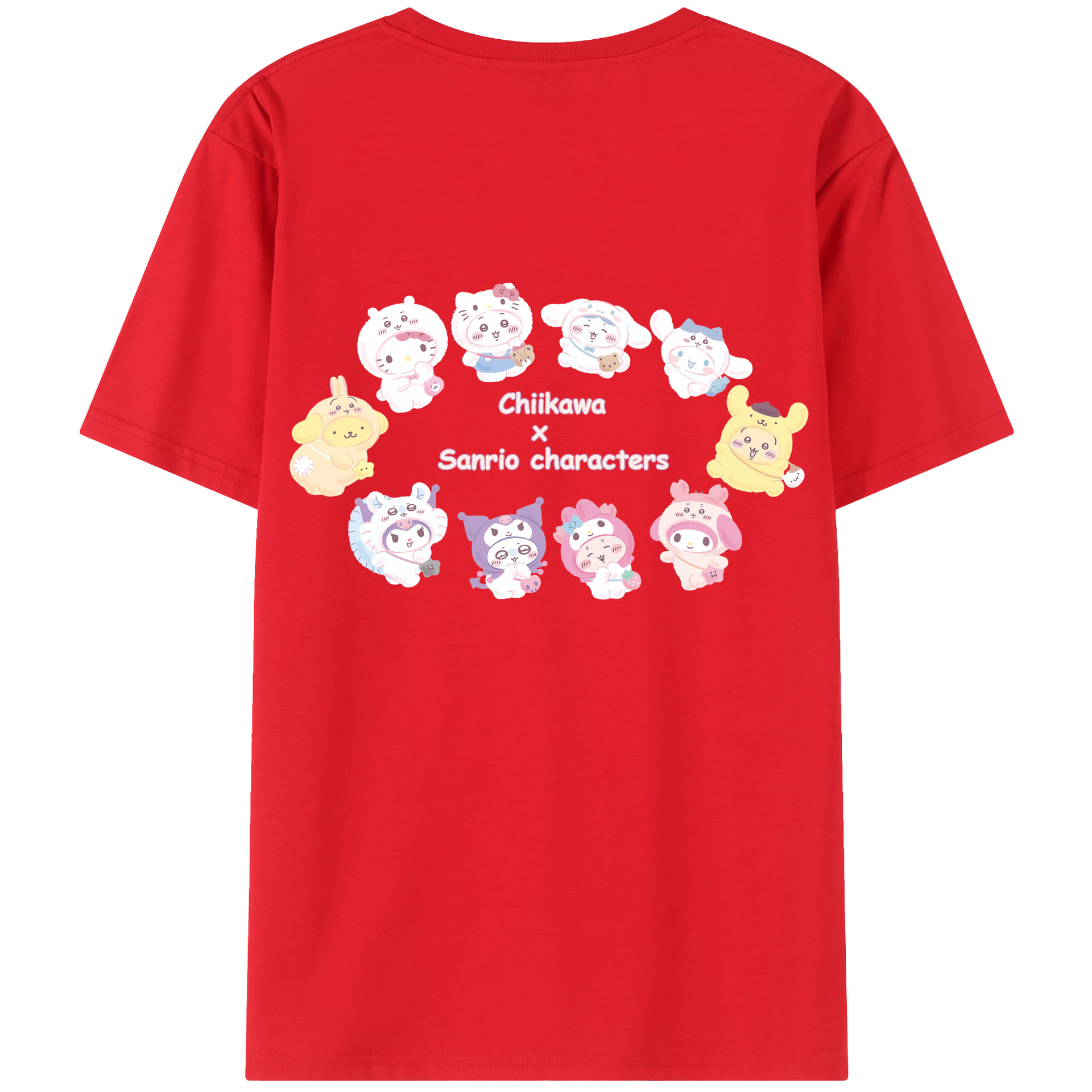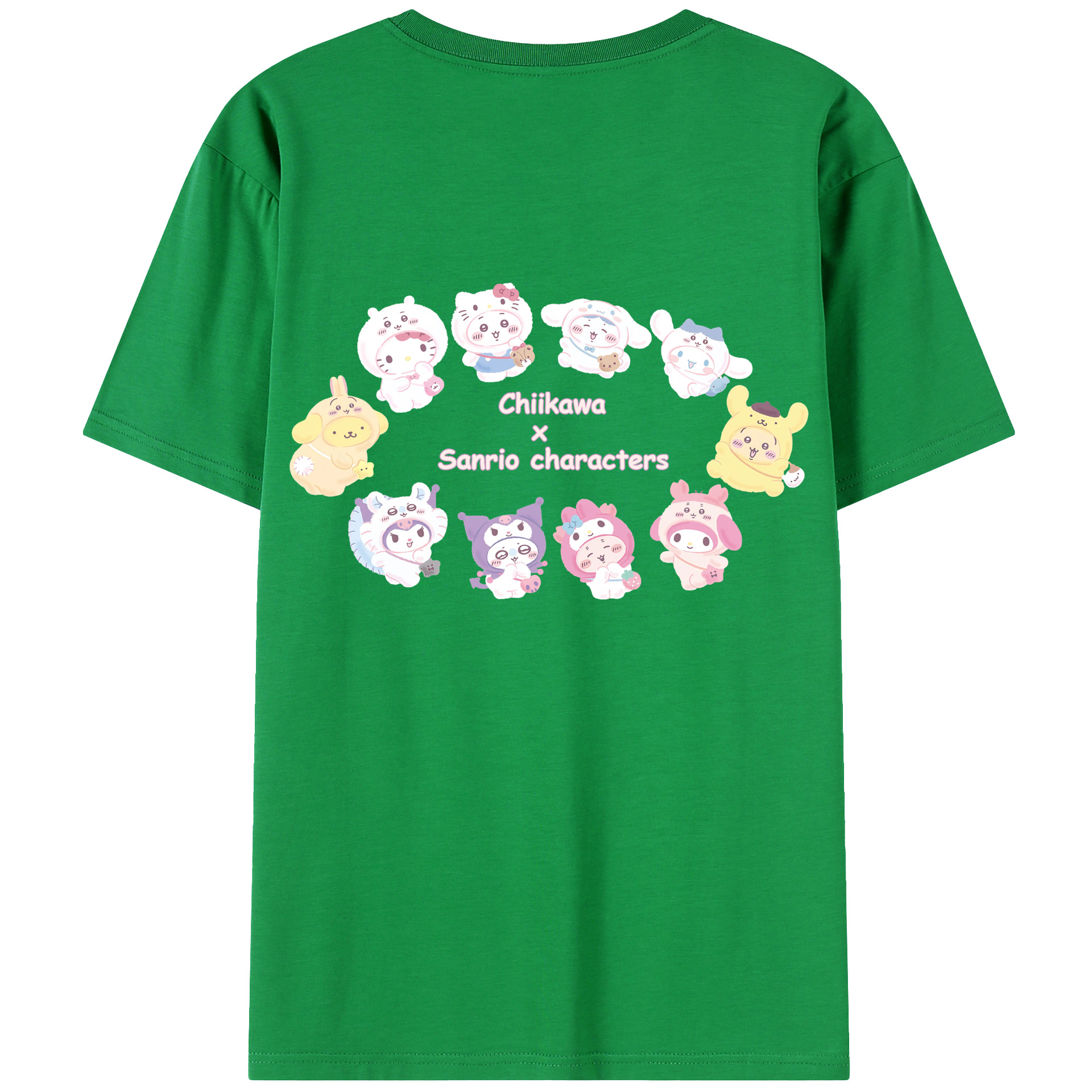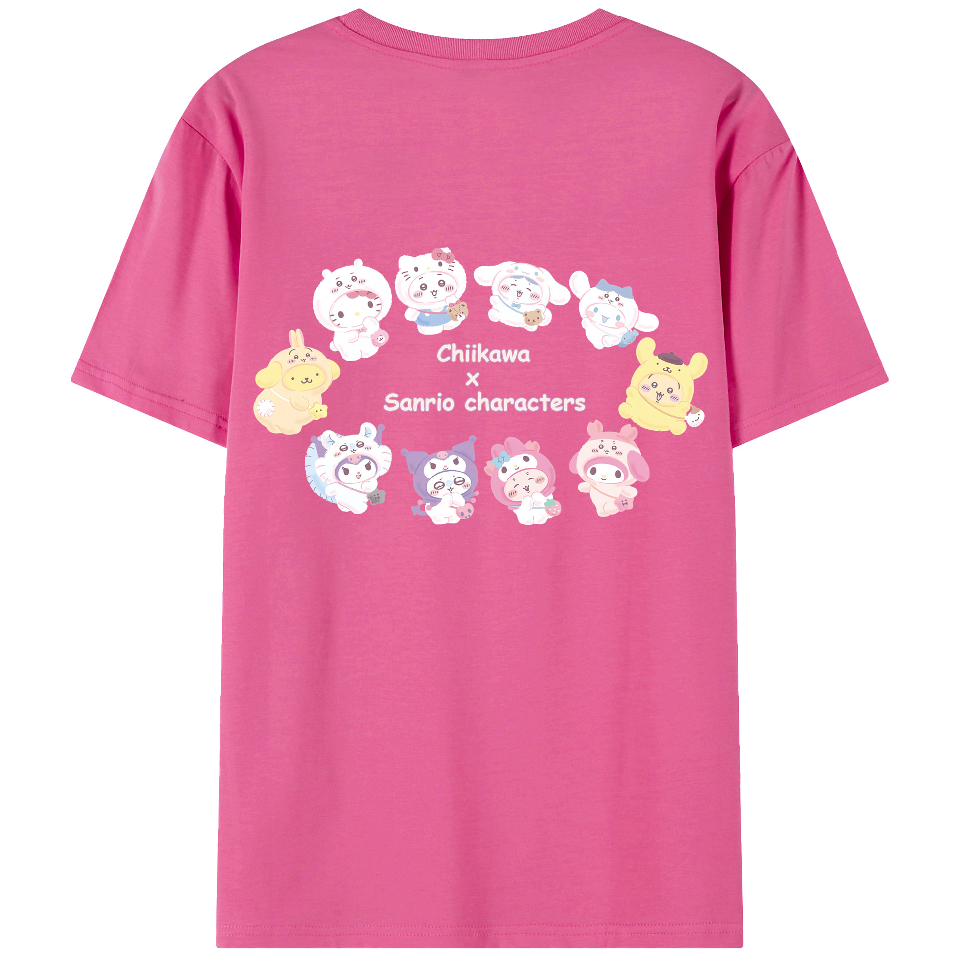 サンリオ&ちいかわ - レディース半袖Tシャツ ・ 綿100% ・ バックプリント ・ 強化クルーネック ・ 二重折り袖口 ・ 快適 通気性 ・ フィットネス カジュアル 旅行用