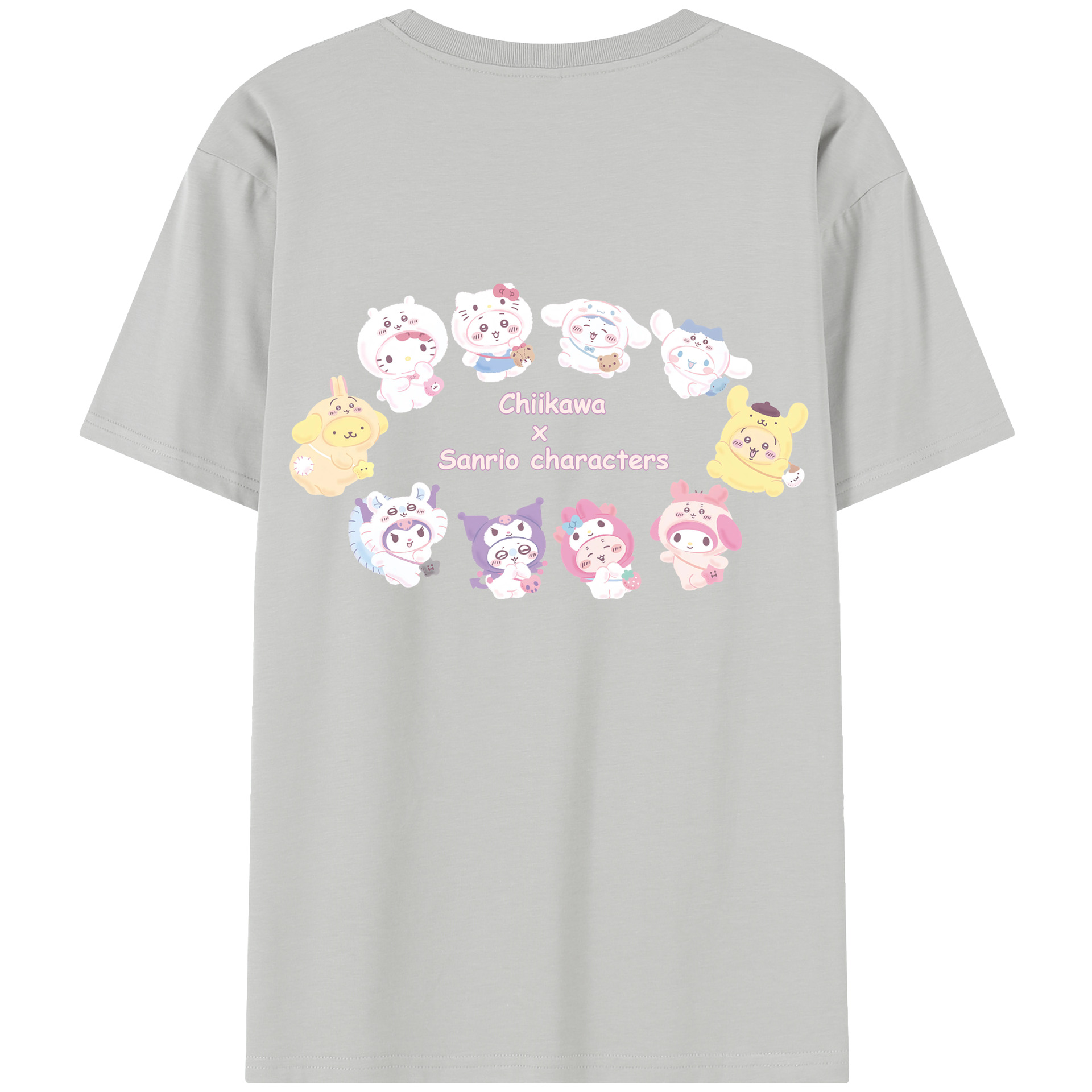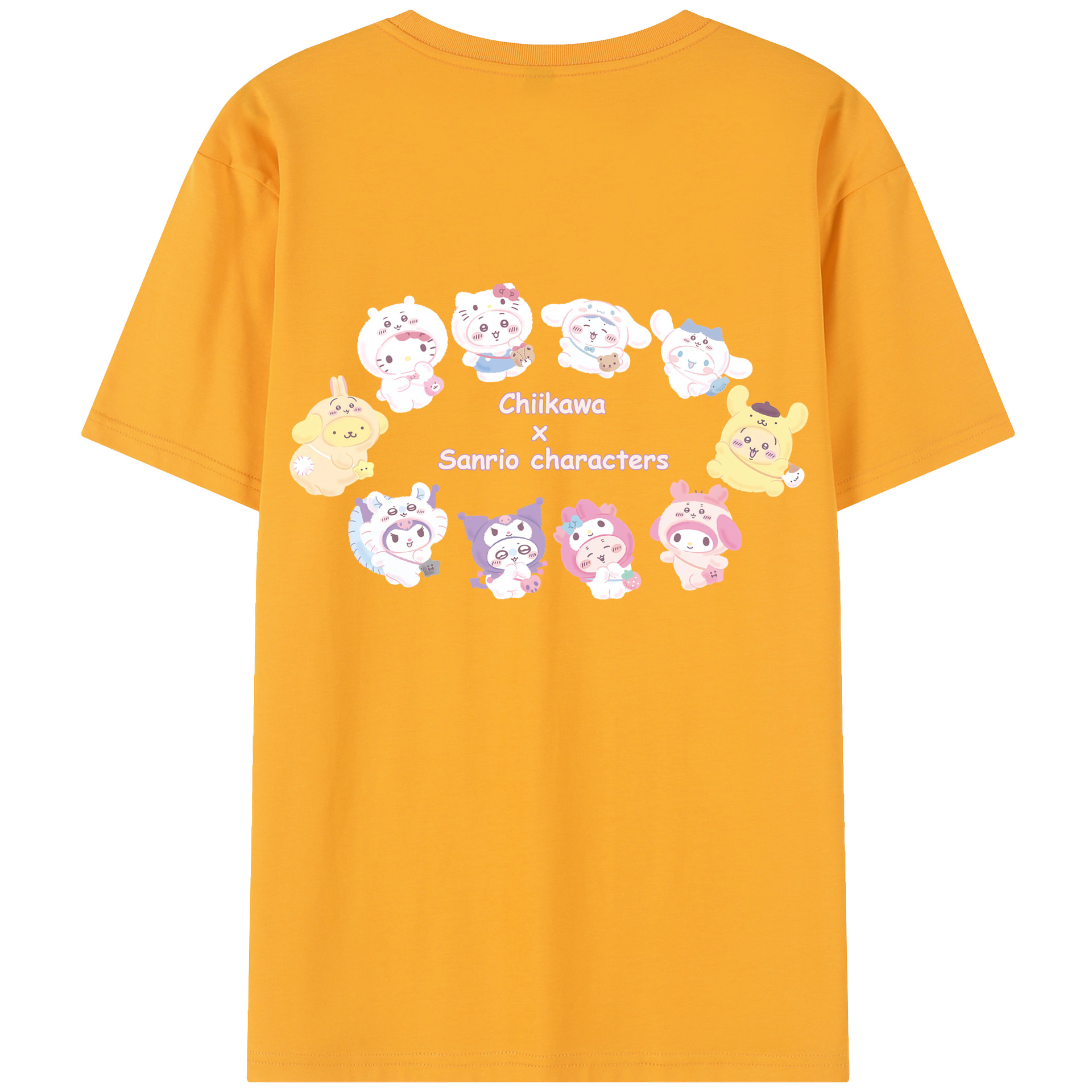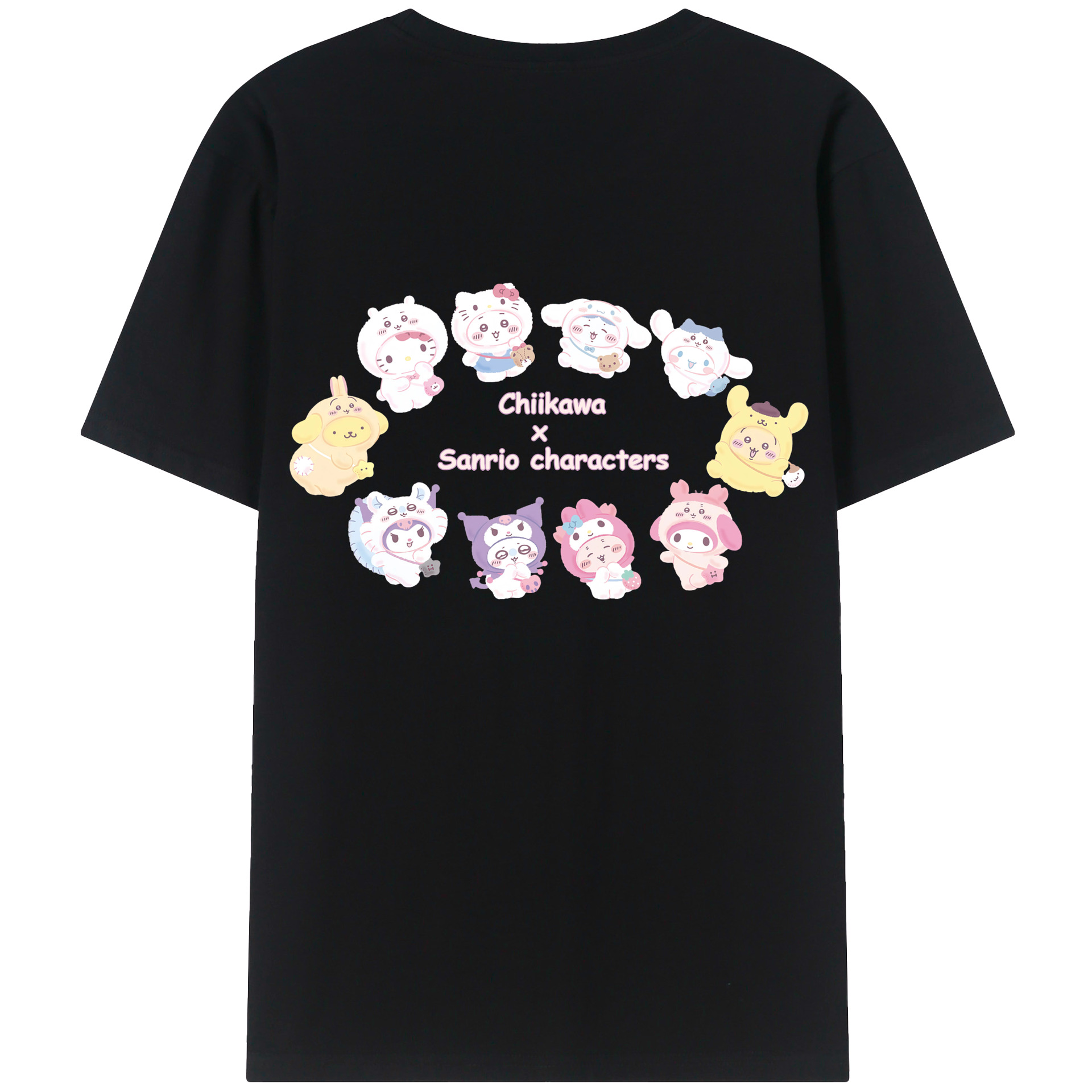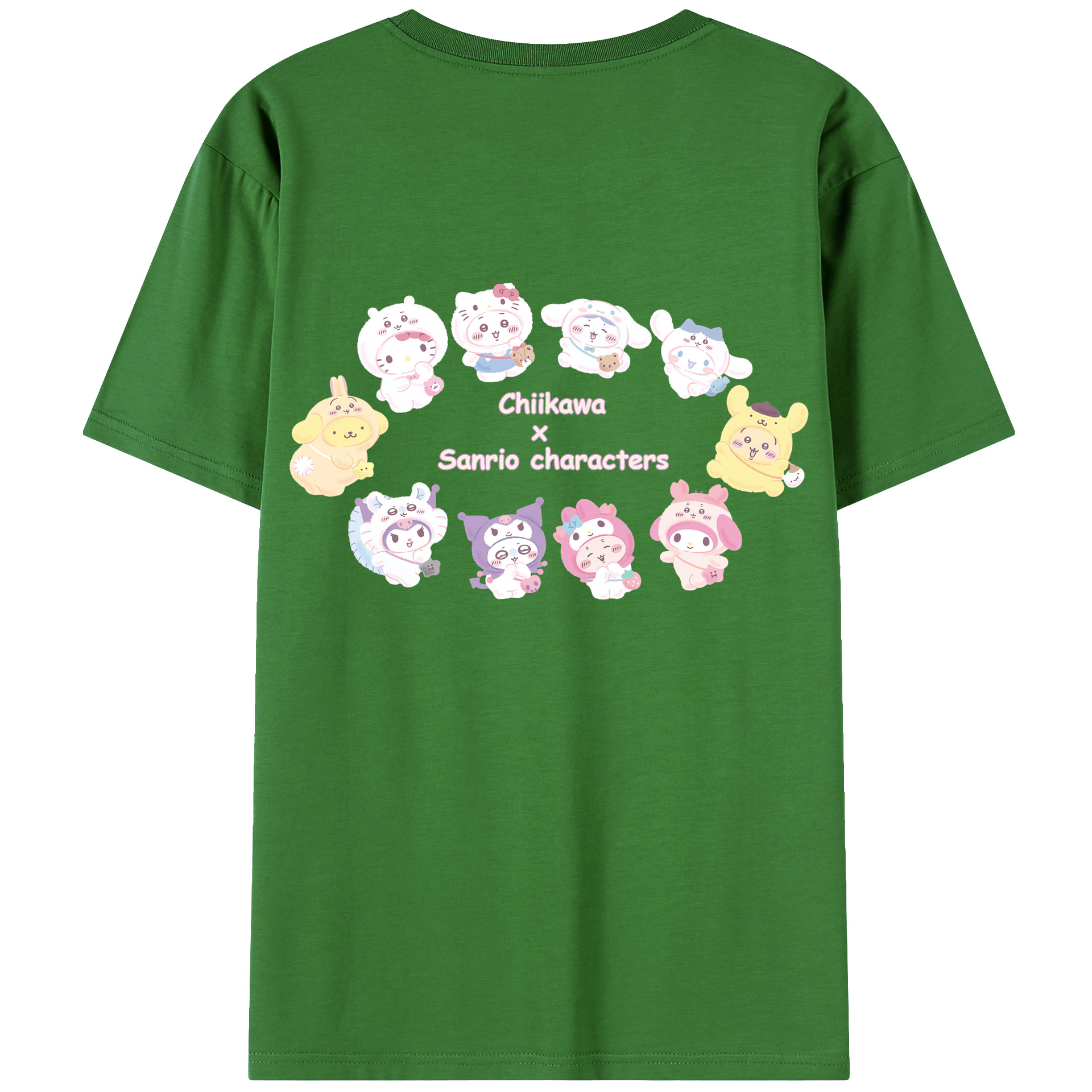 サンリオ&ちいかわ - レディース半袖Tシャツ ・ 綿100% ・ バックプリント ・ 強化クルーネック ・ 二重折り袖口 ・ 快適 通気性 ・ フィットネス カジュアル 旅行用