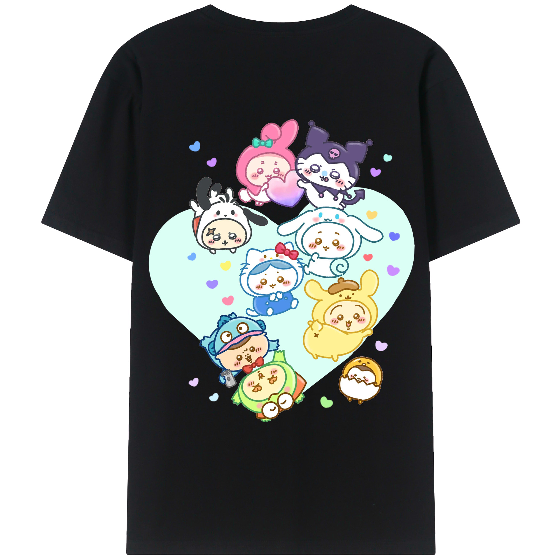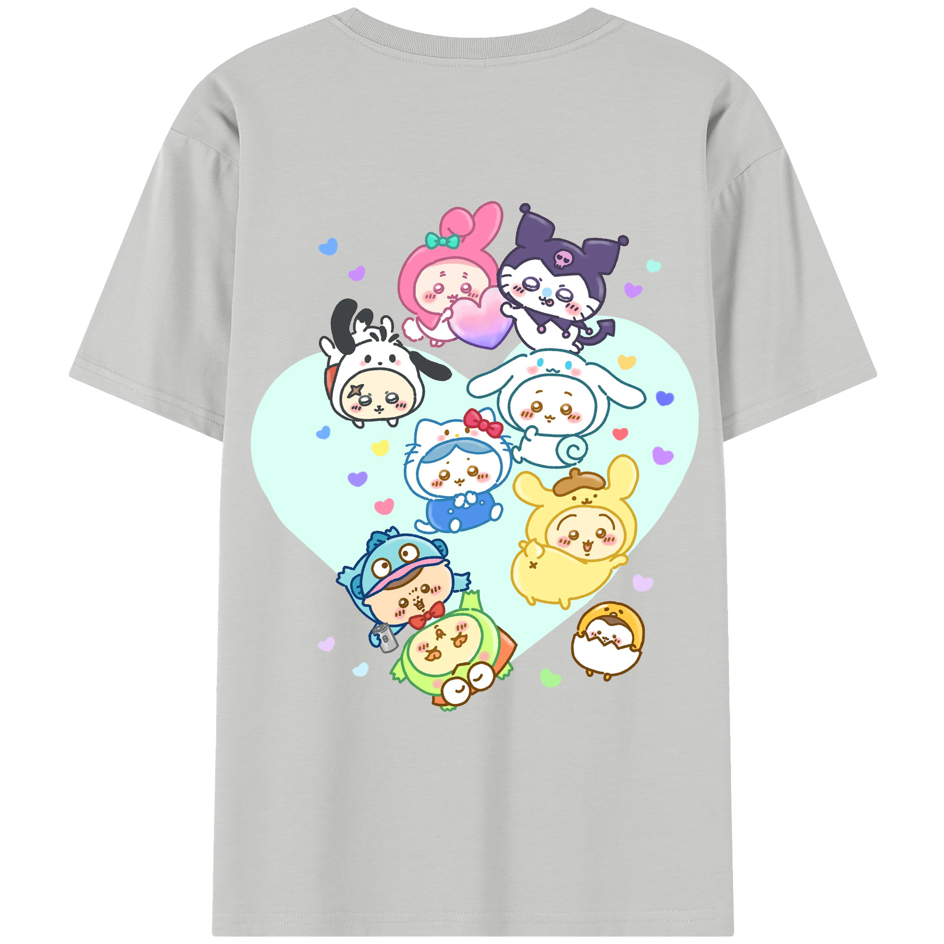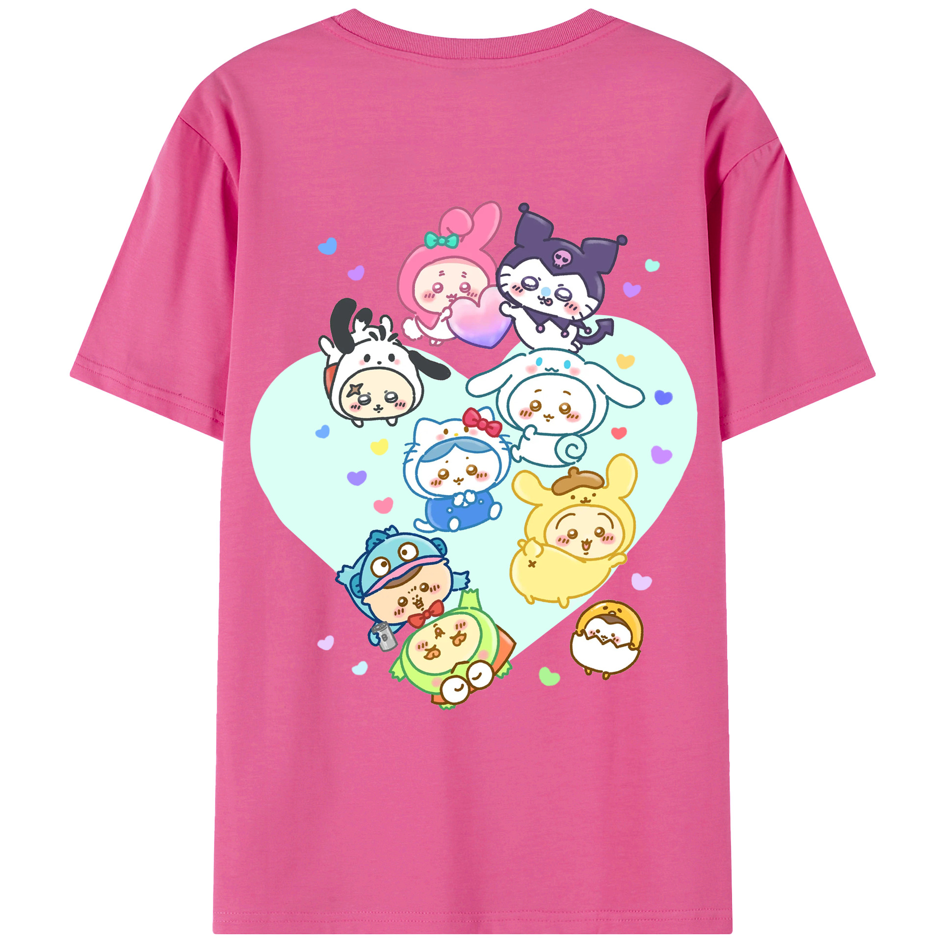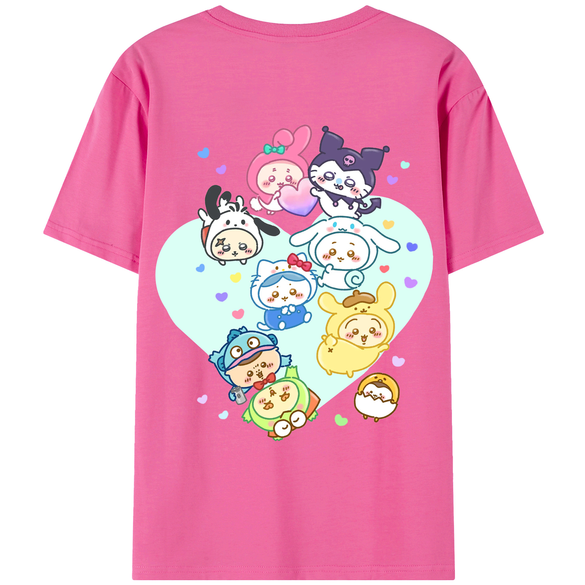 サンリオ&ちいかわ - レディース半袖Tシャツ ・ 綿100% ・ バックプリント ・ 強化クルーネック ・ 二重折り袖口 ・ 快適 通気性 ・ フィットネス カジュアル 旅行用