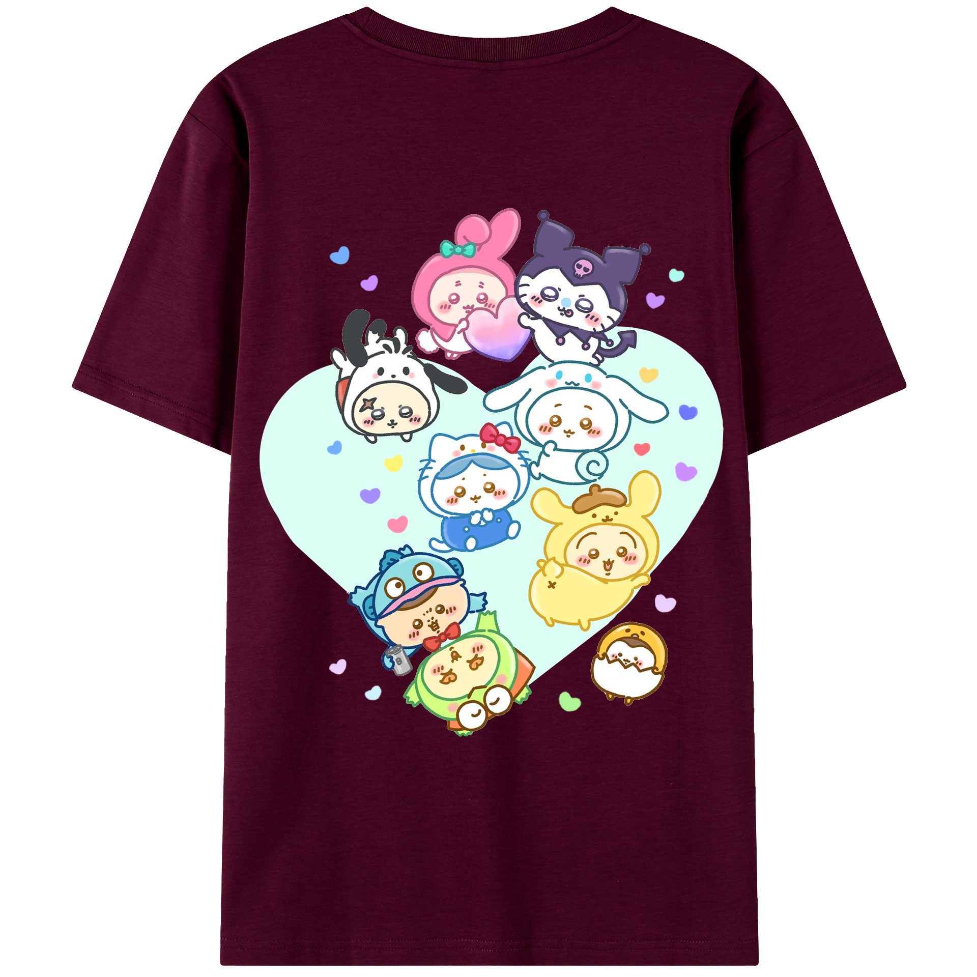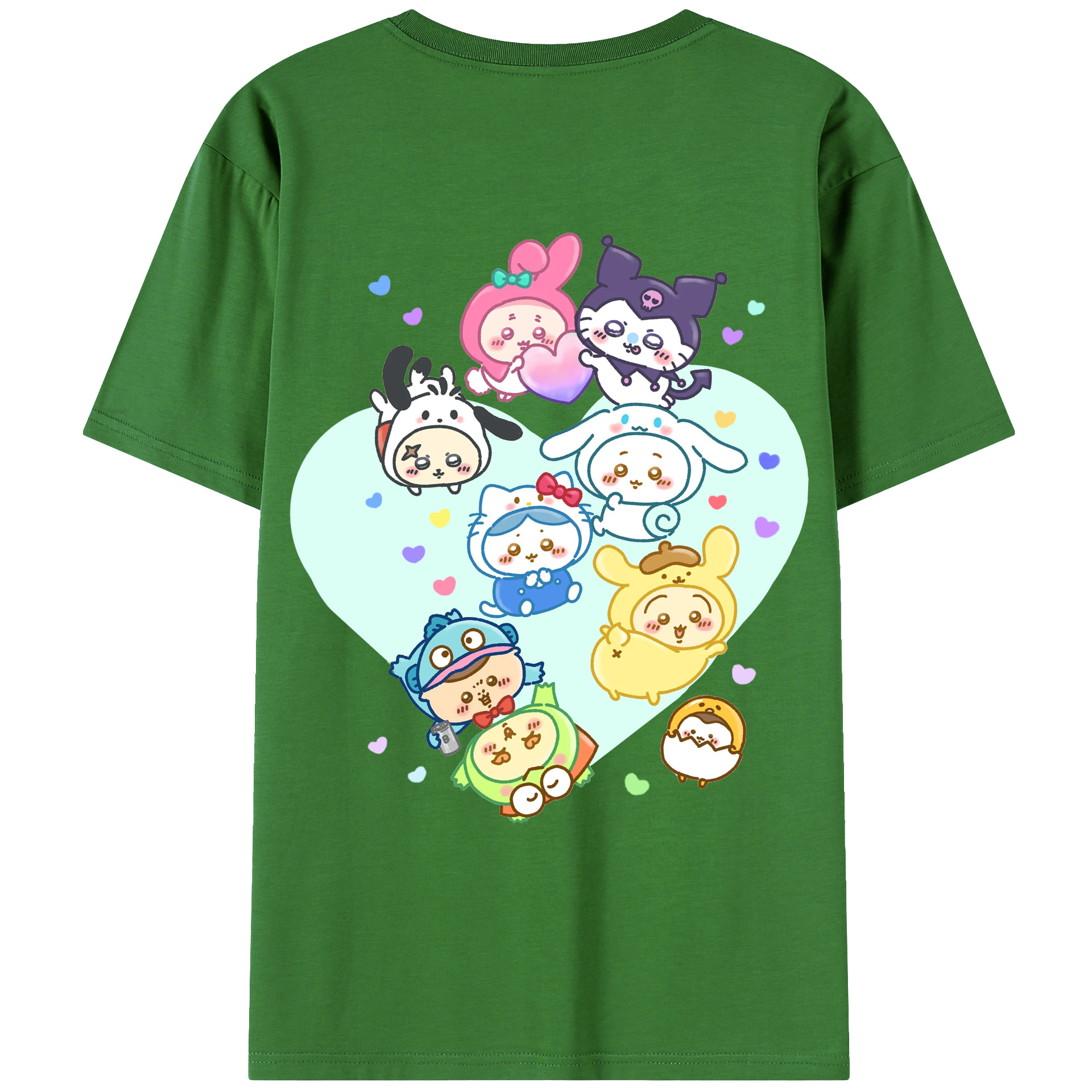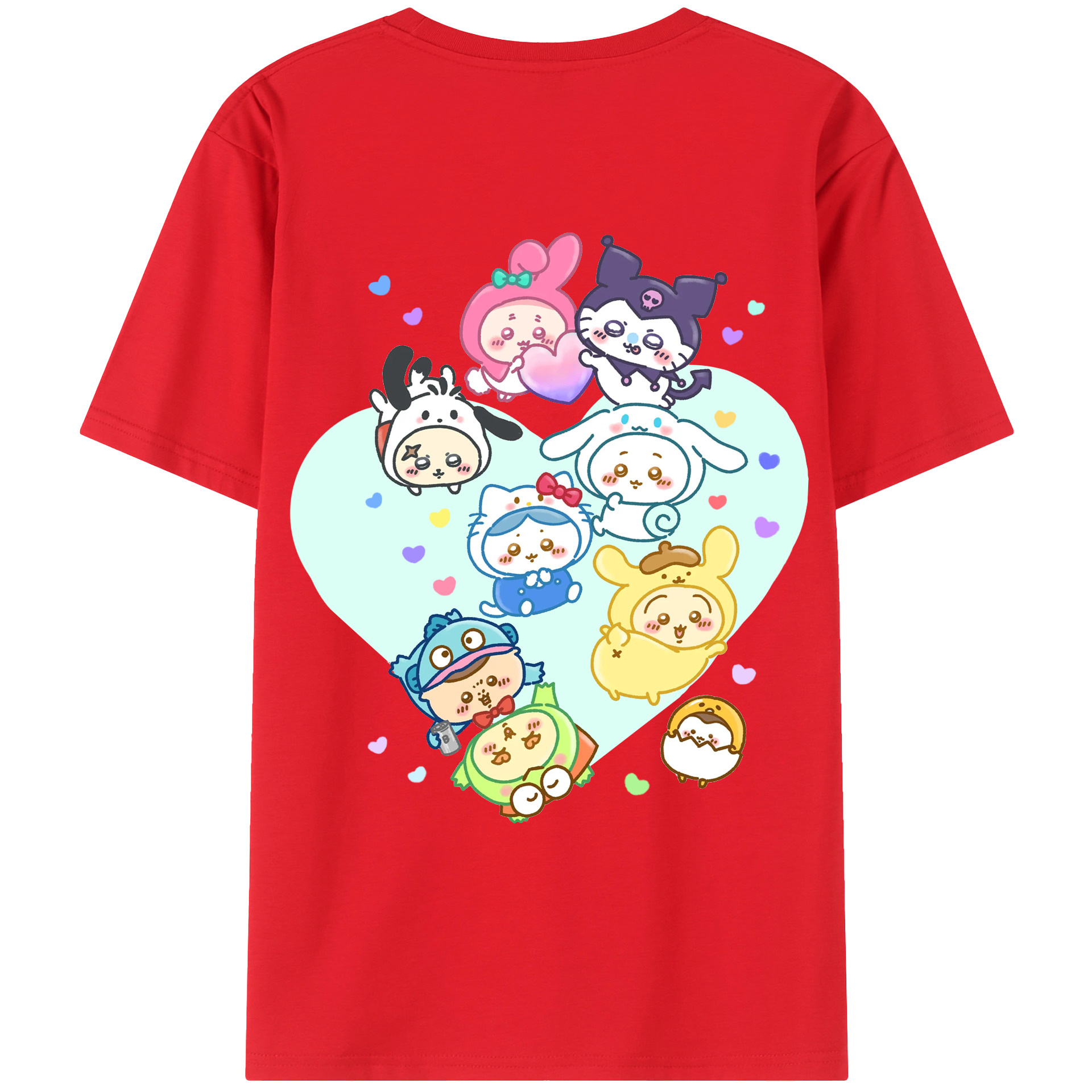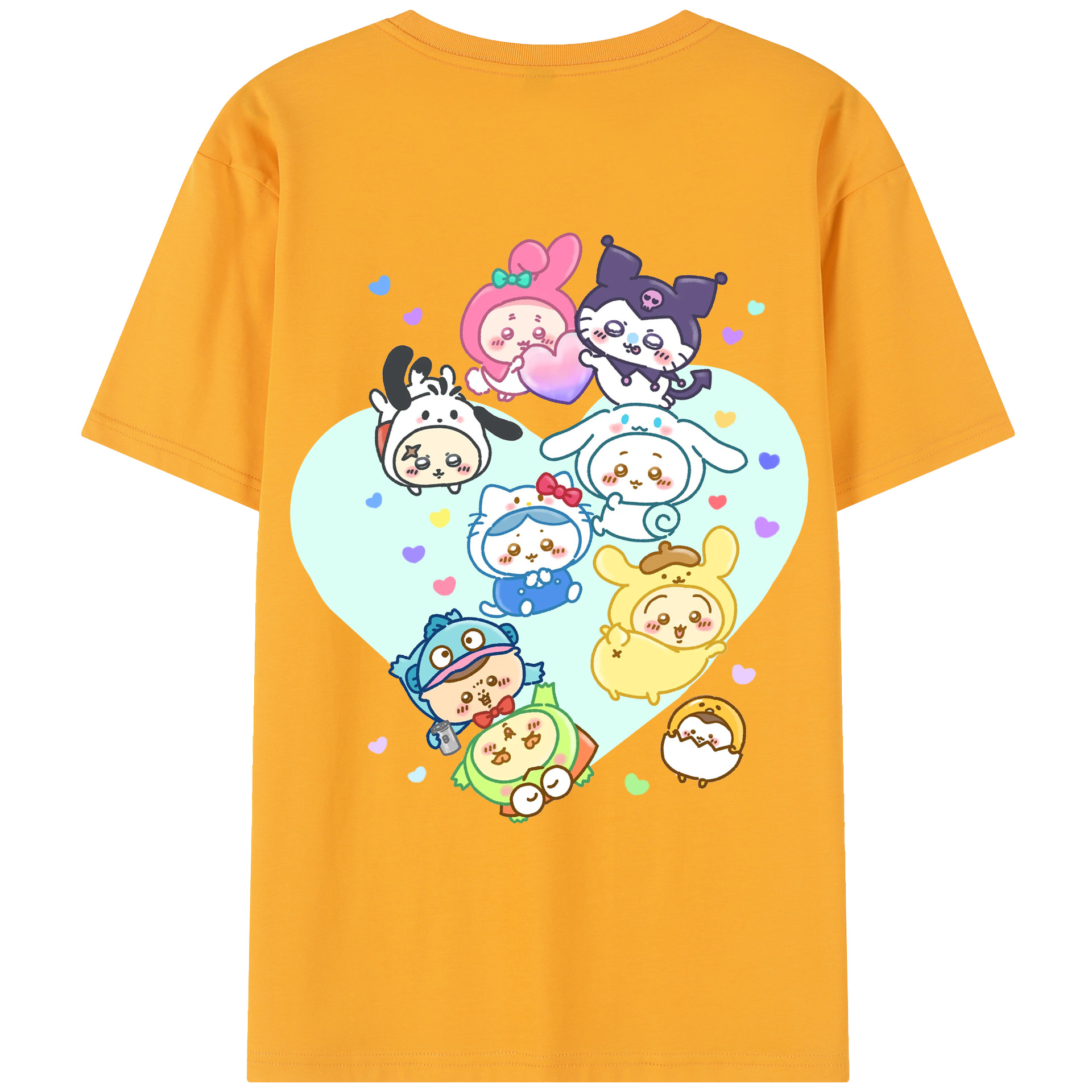 サンリオ&ちいかわ - レディース半袖Tシャツ ・ 綿100% ・ バックプリント ・ 強化クルーネック ・ 二重折り袖口 ・ 快適 通気性 ・ フィットネス カジュアル 旅行用