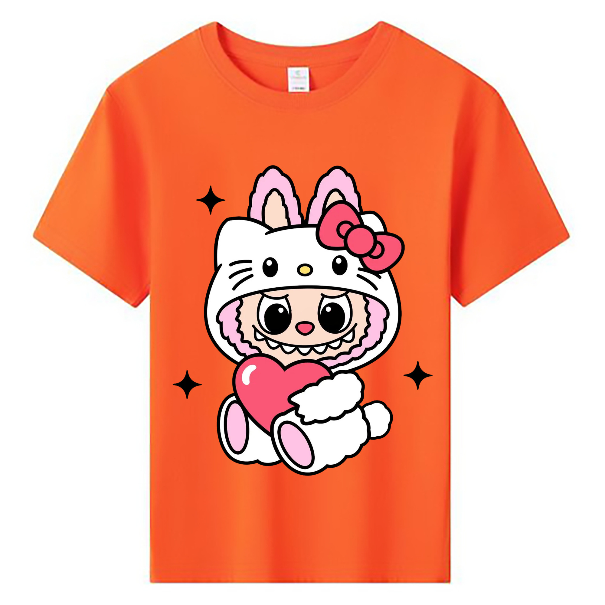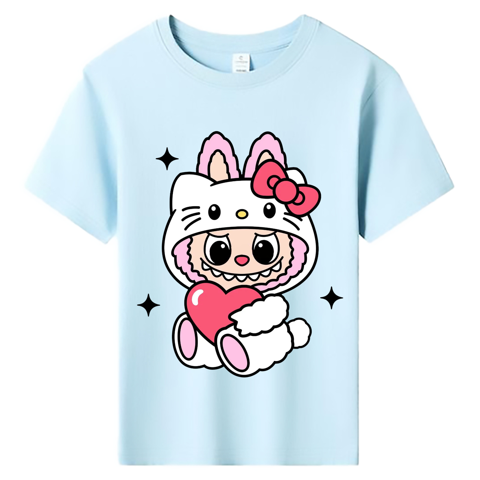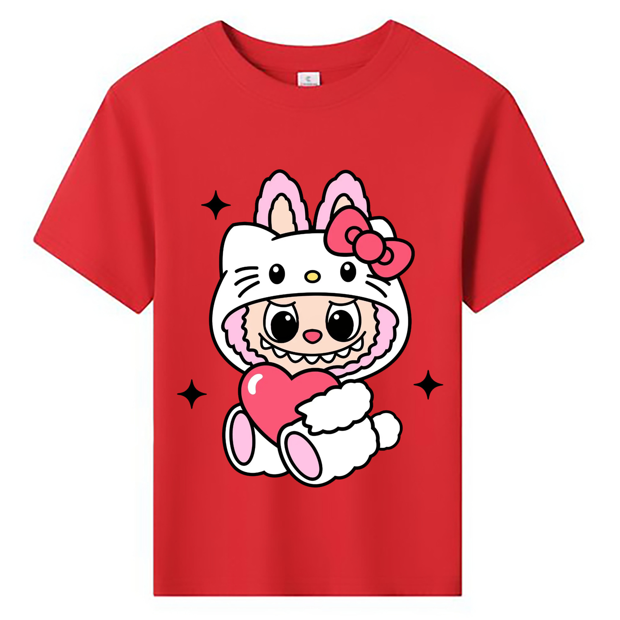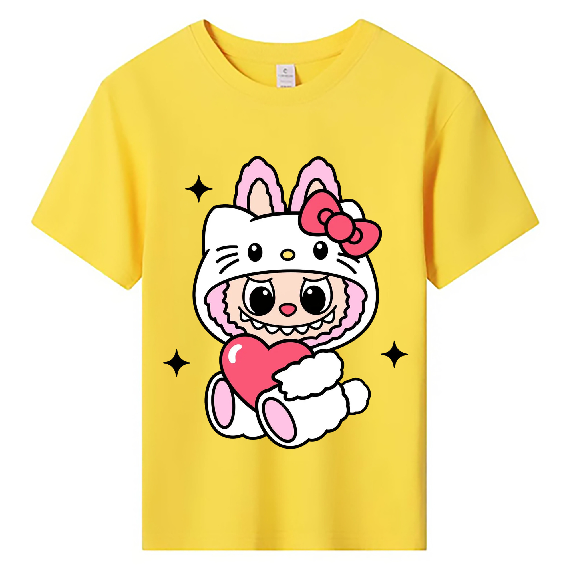 サンリオハローキティ&LABUBU ラブブ - 綿100% ヴィンテージ風 半袖Tシャツ ・ フロントプリント ・ 柔らか肌触り ・ 通気性 快適 ・ スポーツ カジュアル 外出用