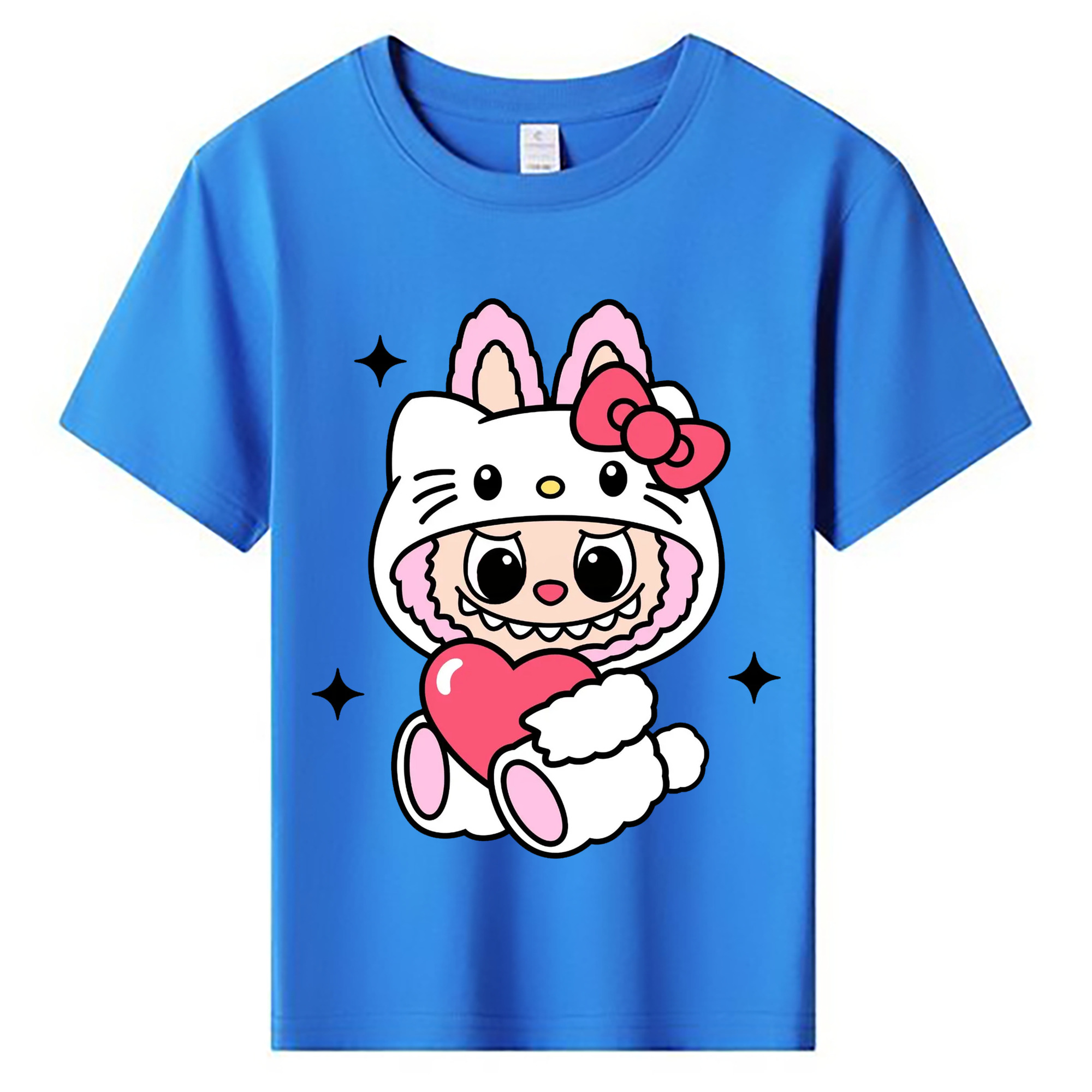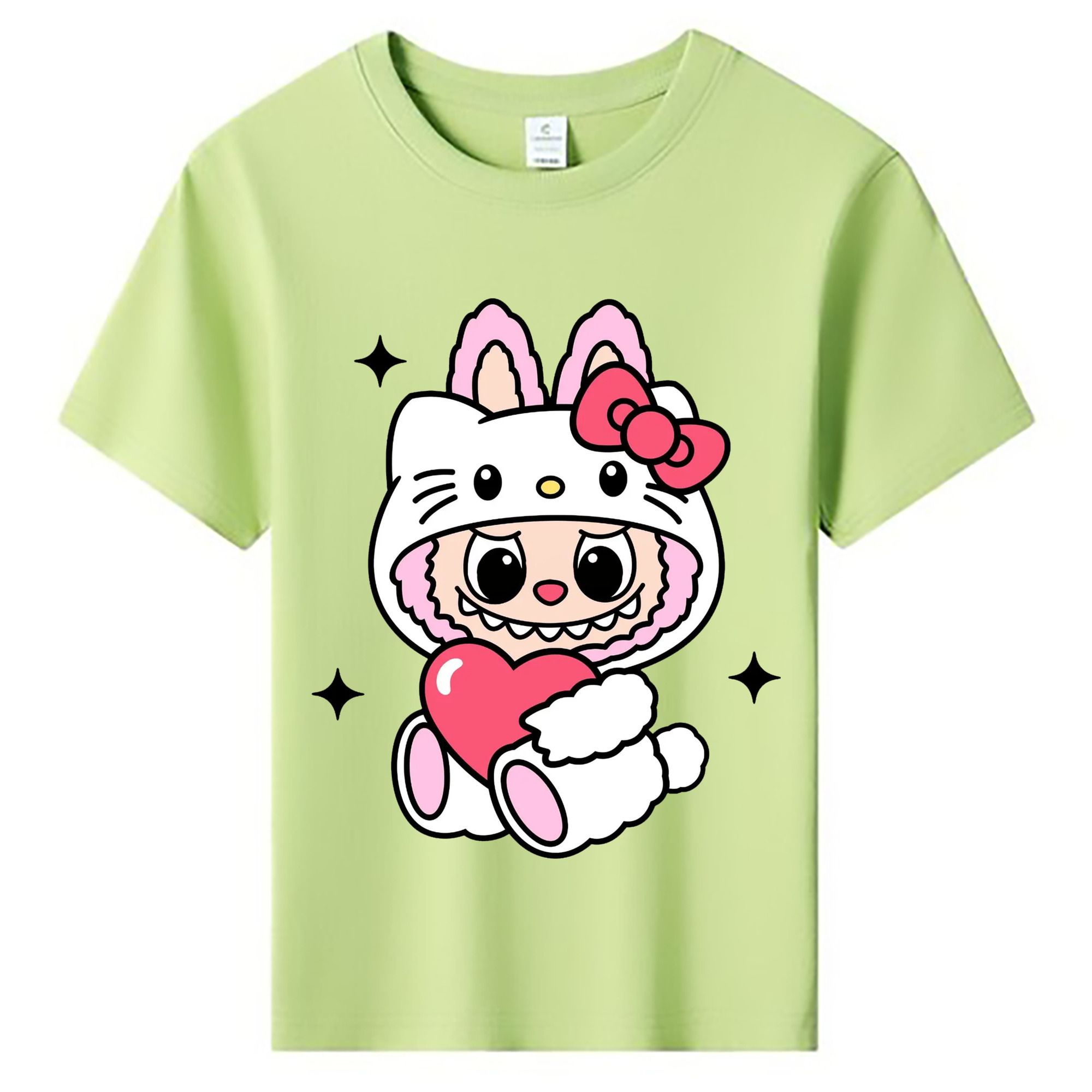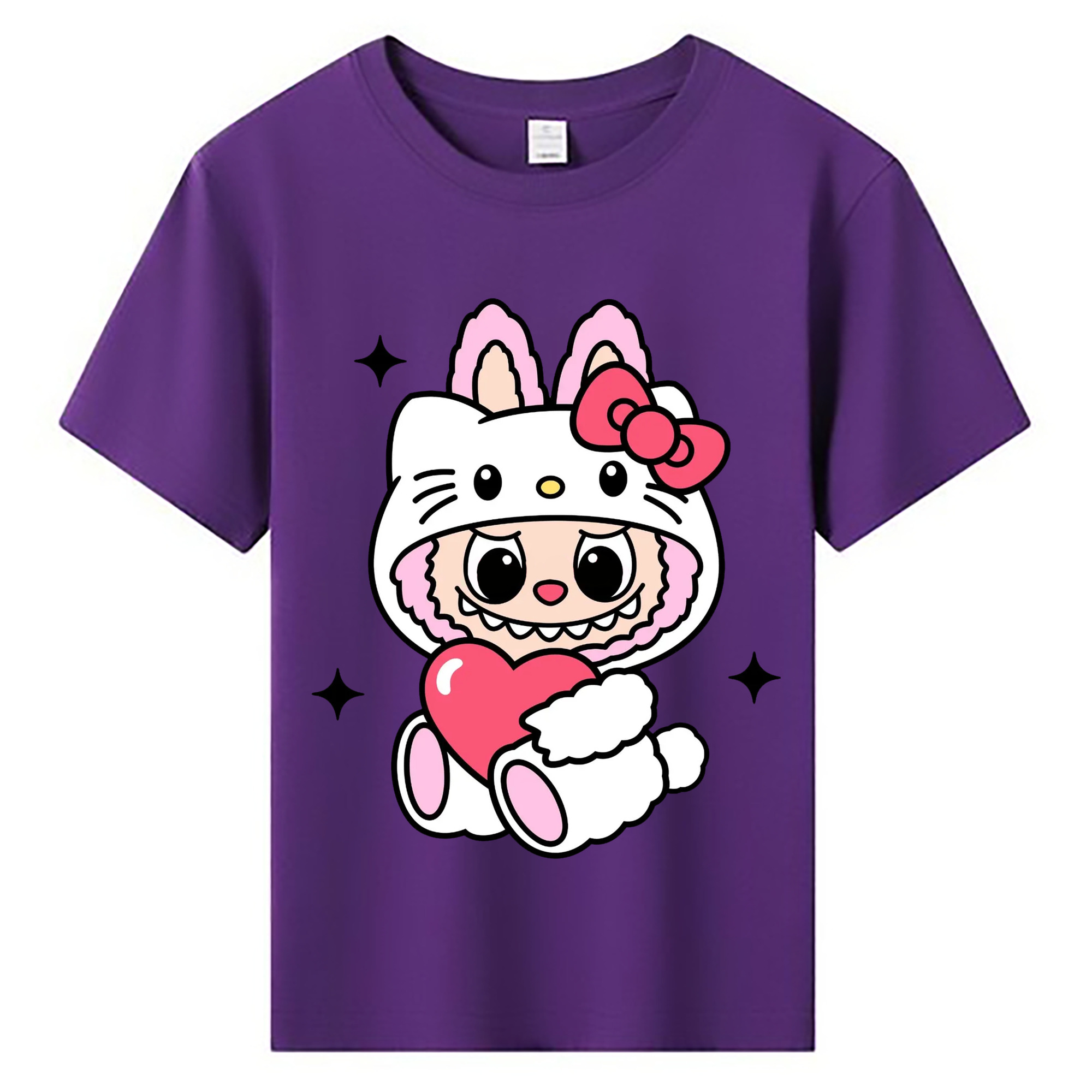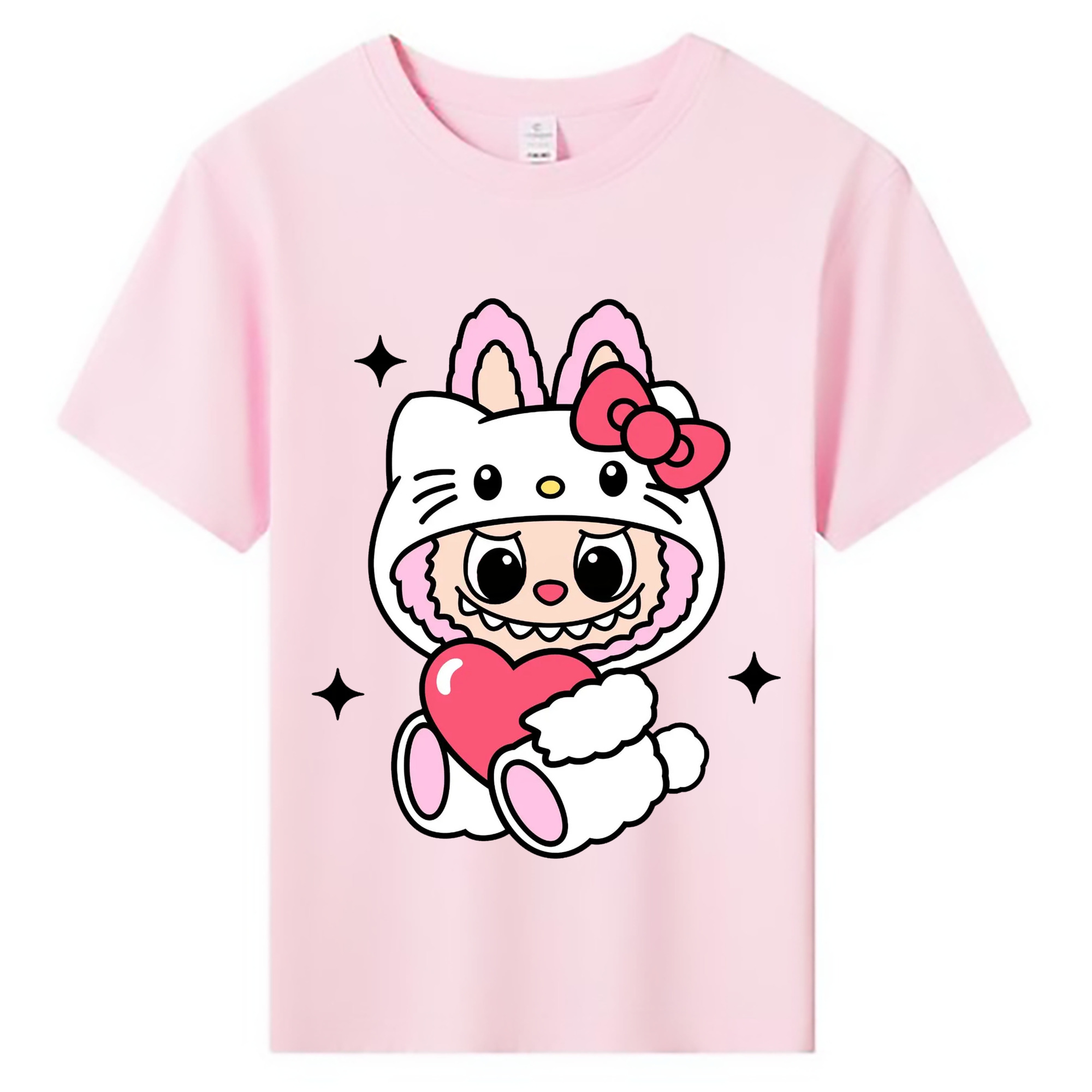 サンリオハローキティ&LABUBU ラブブ - 綿100% ヴィンテージ風 半袖Tシャツ ・ フロントプリント ・ 柔らか肌触り ・ 通気性 快適 ・ スポーツ カジュアル 外出用