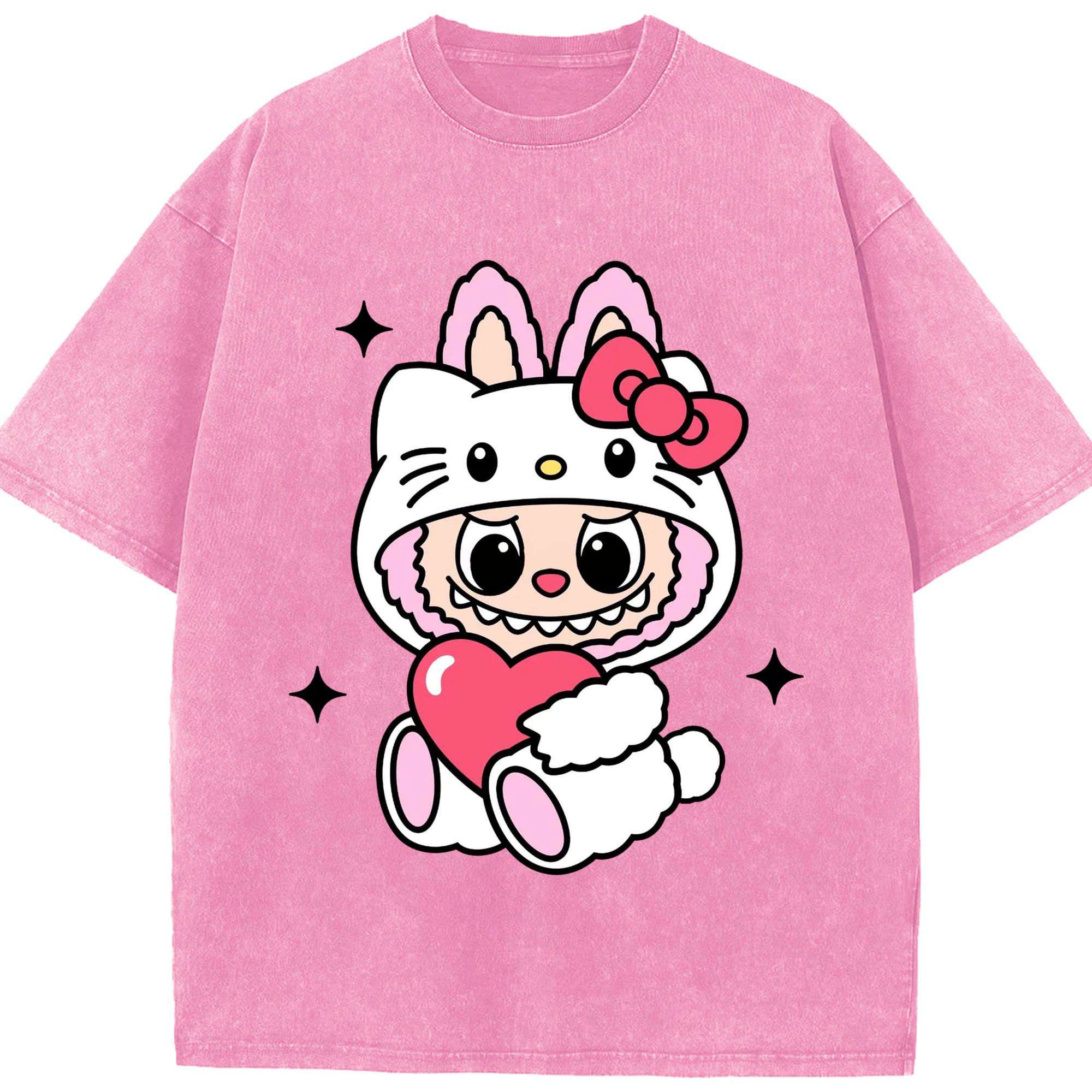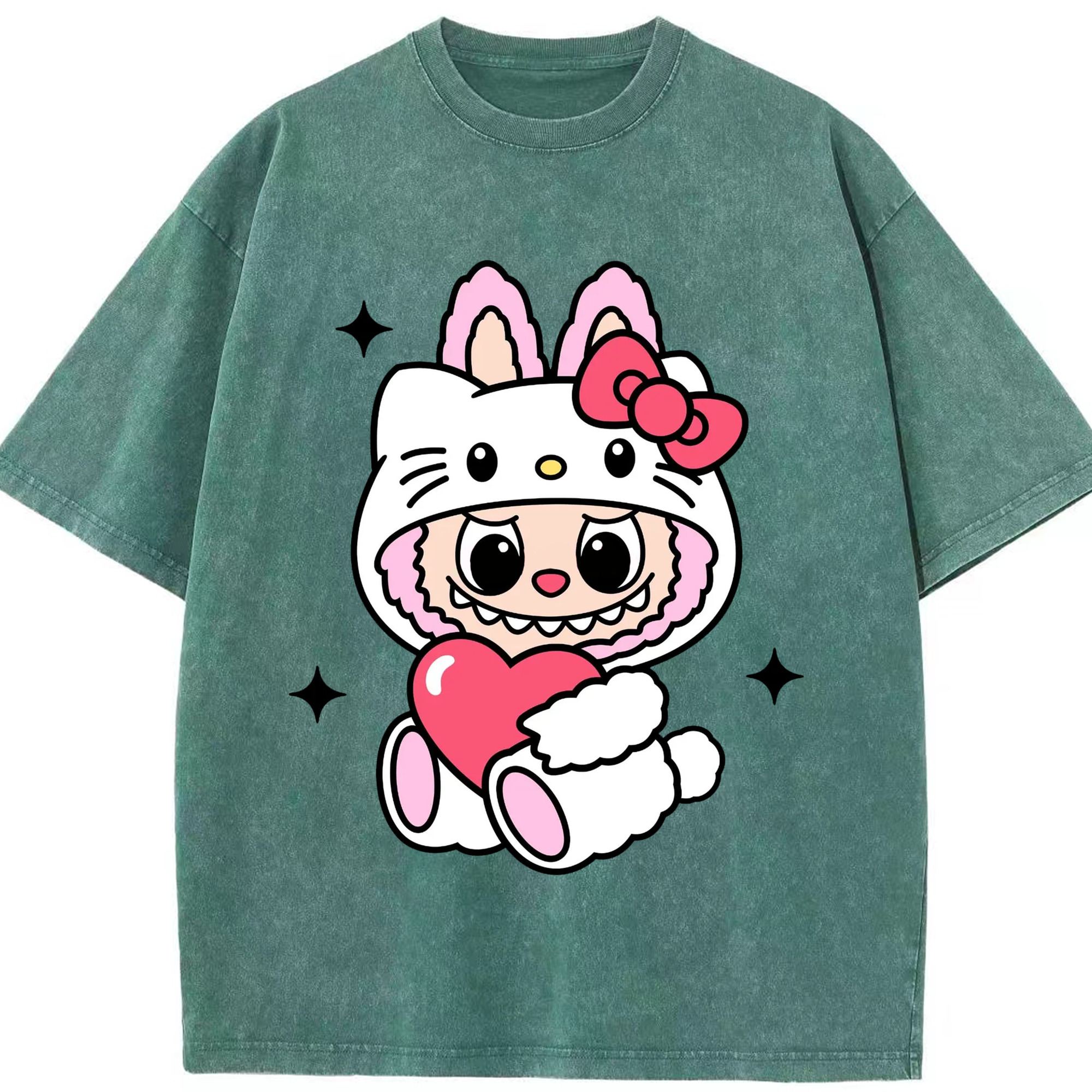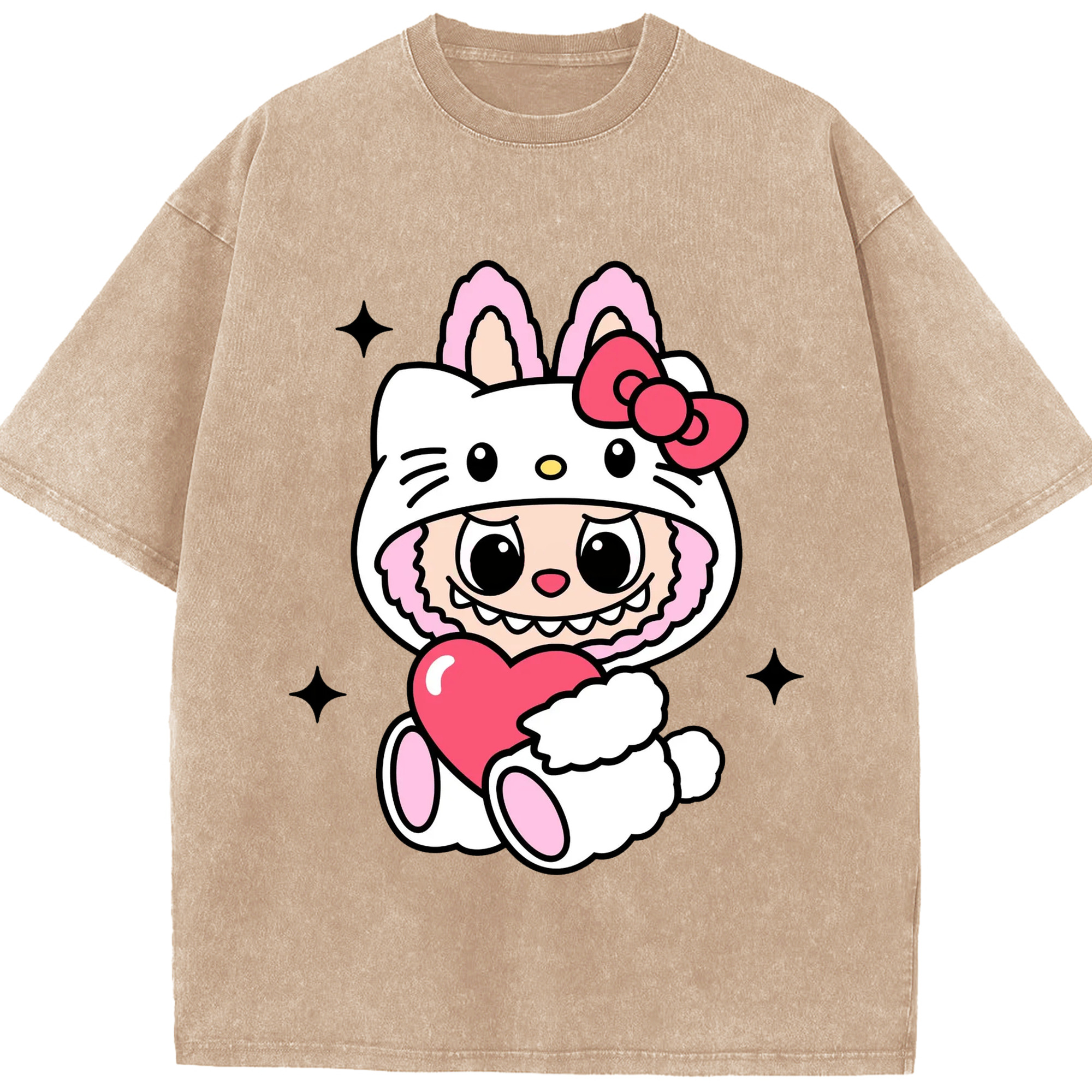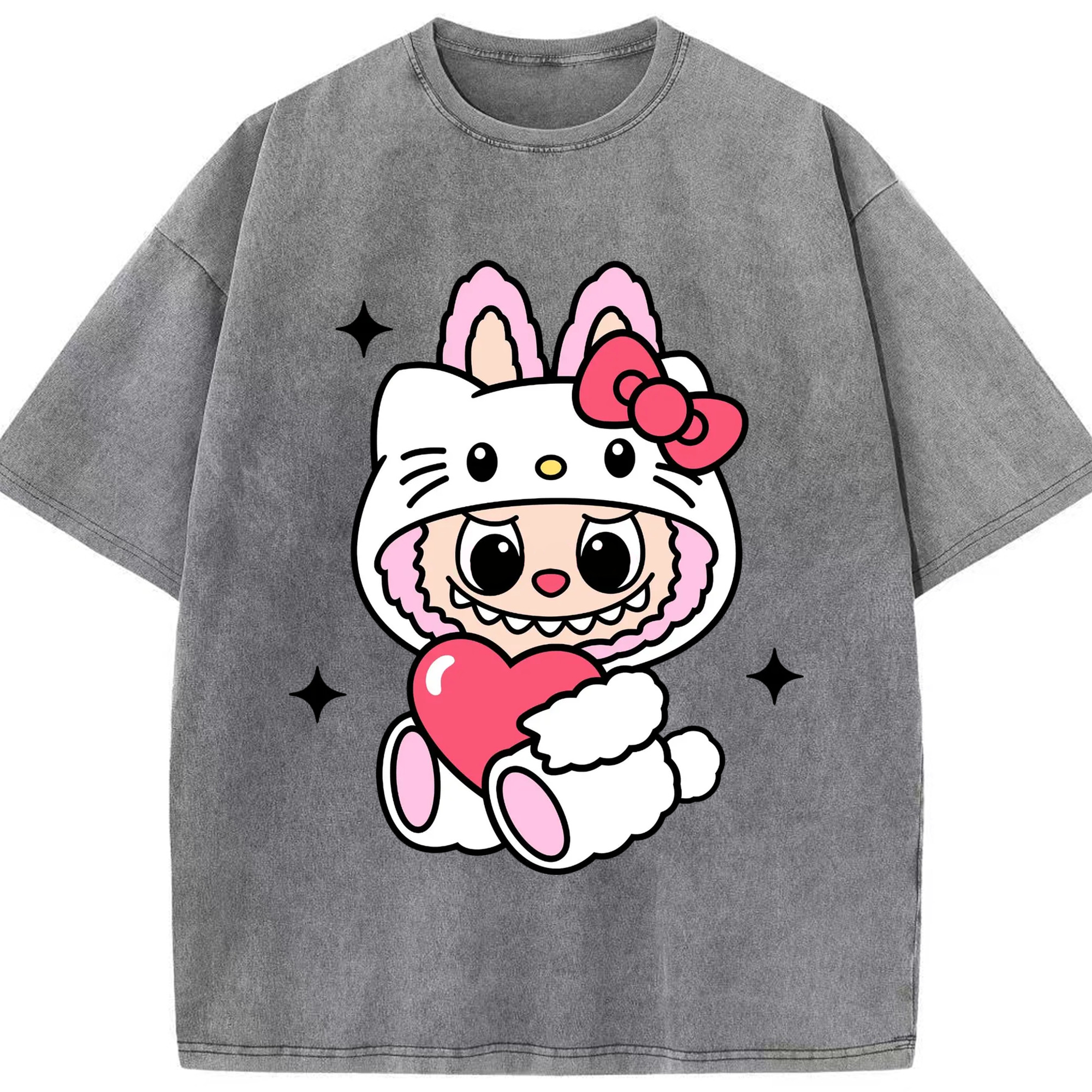 サンリオハローキティ&LABUBU ラブブ - 綿100% ヴィンテージ風 半袖Tシャツ ・ 背面プリント ・ 柔らか肌触り ・ 通気性 快適 ・ スポーツ カジュアル 外出用